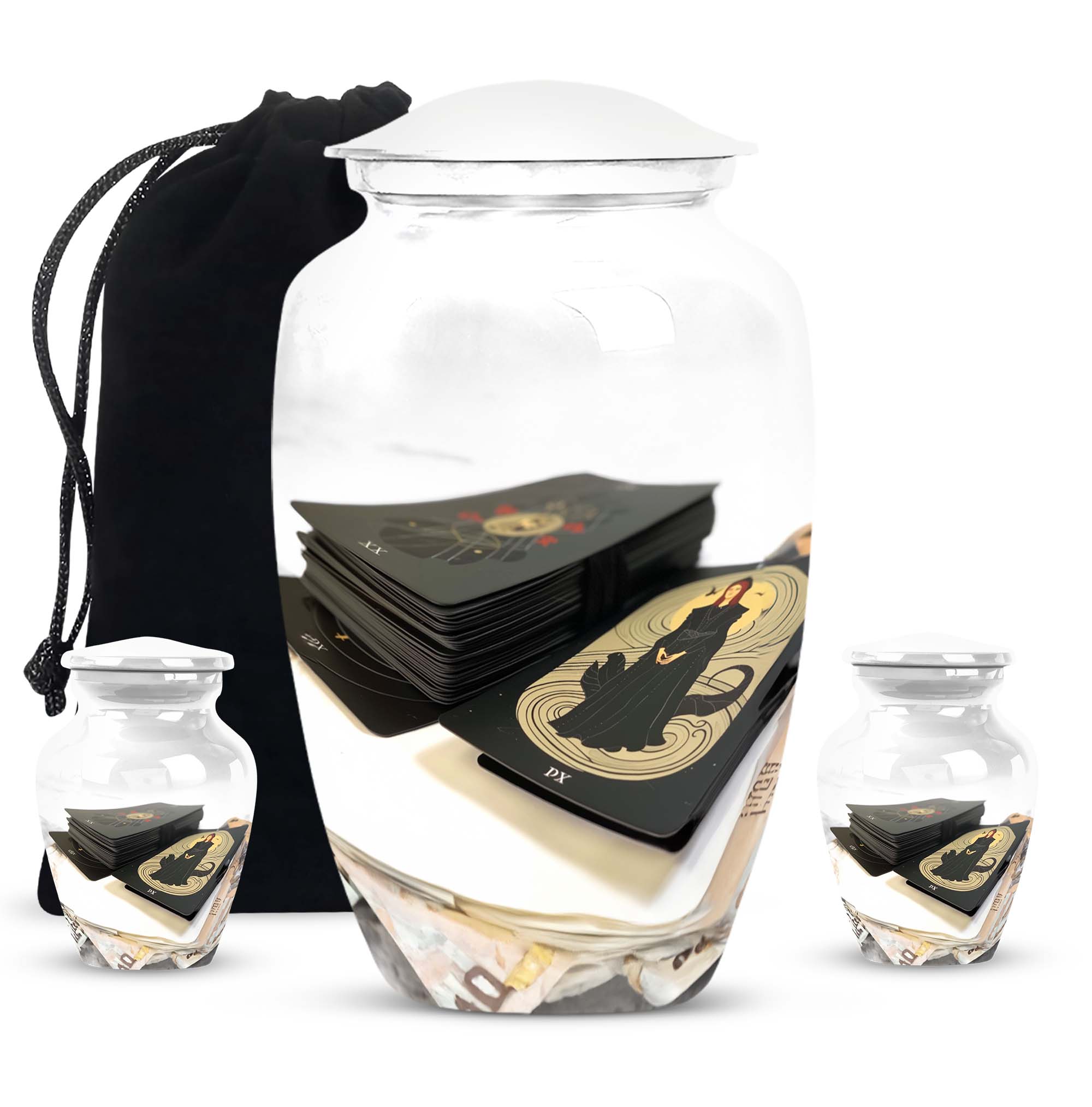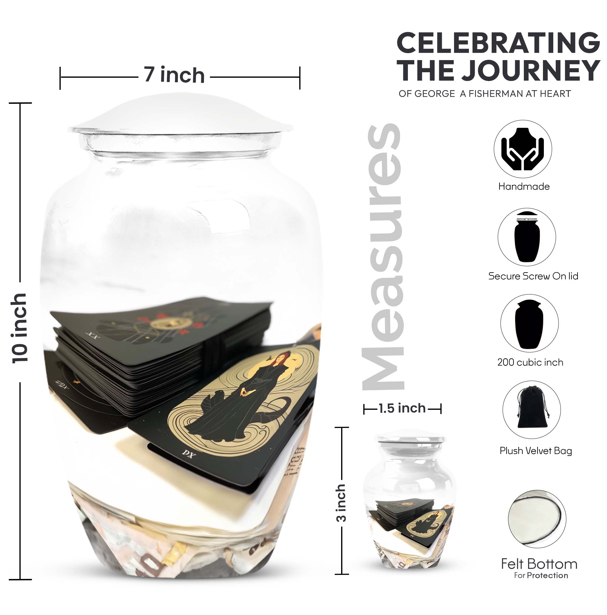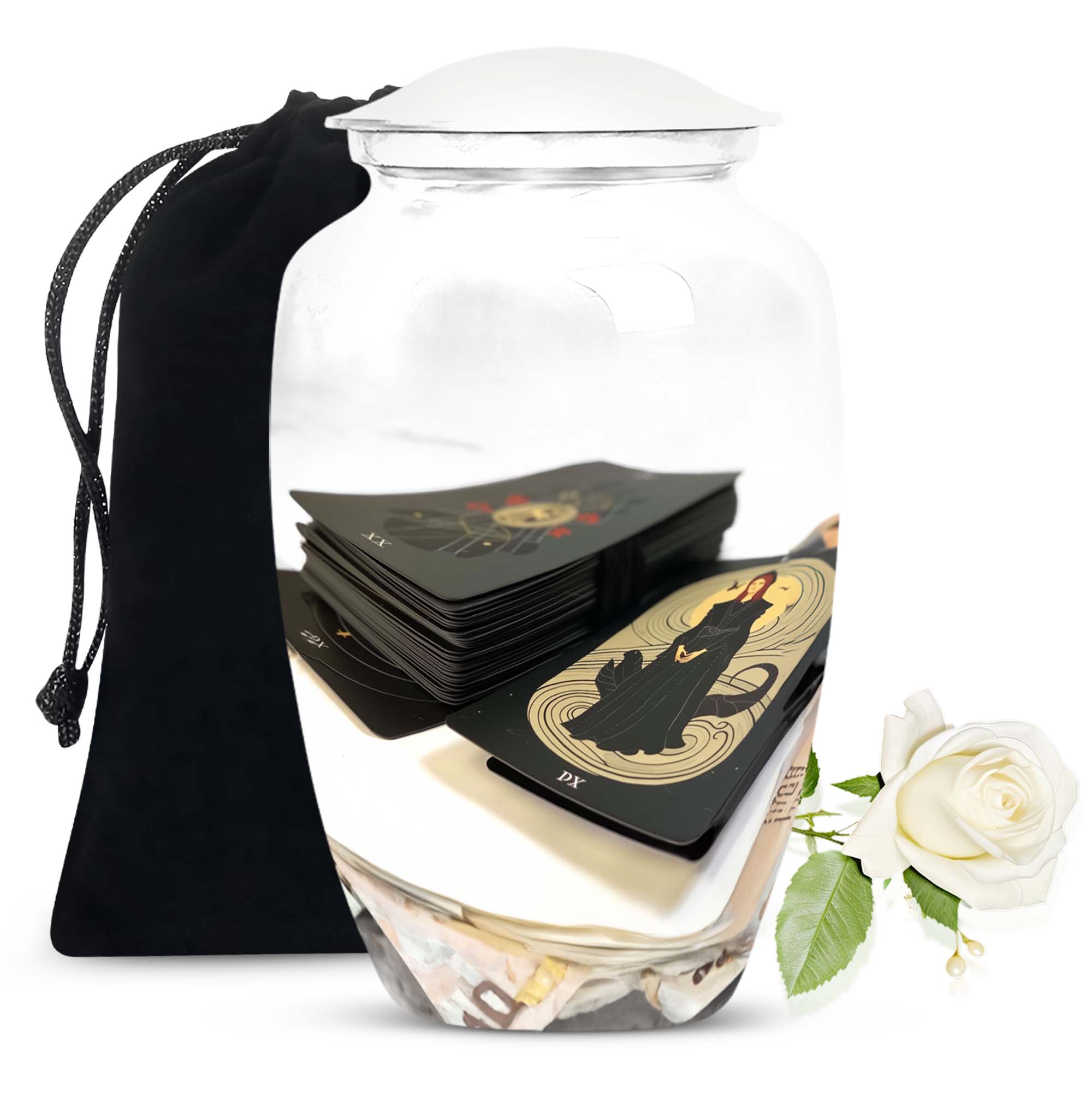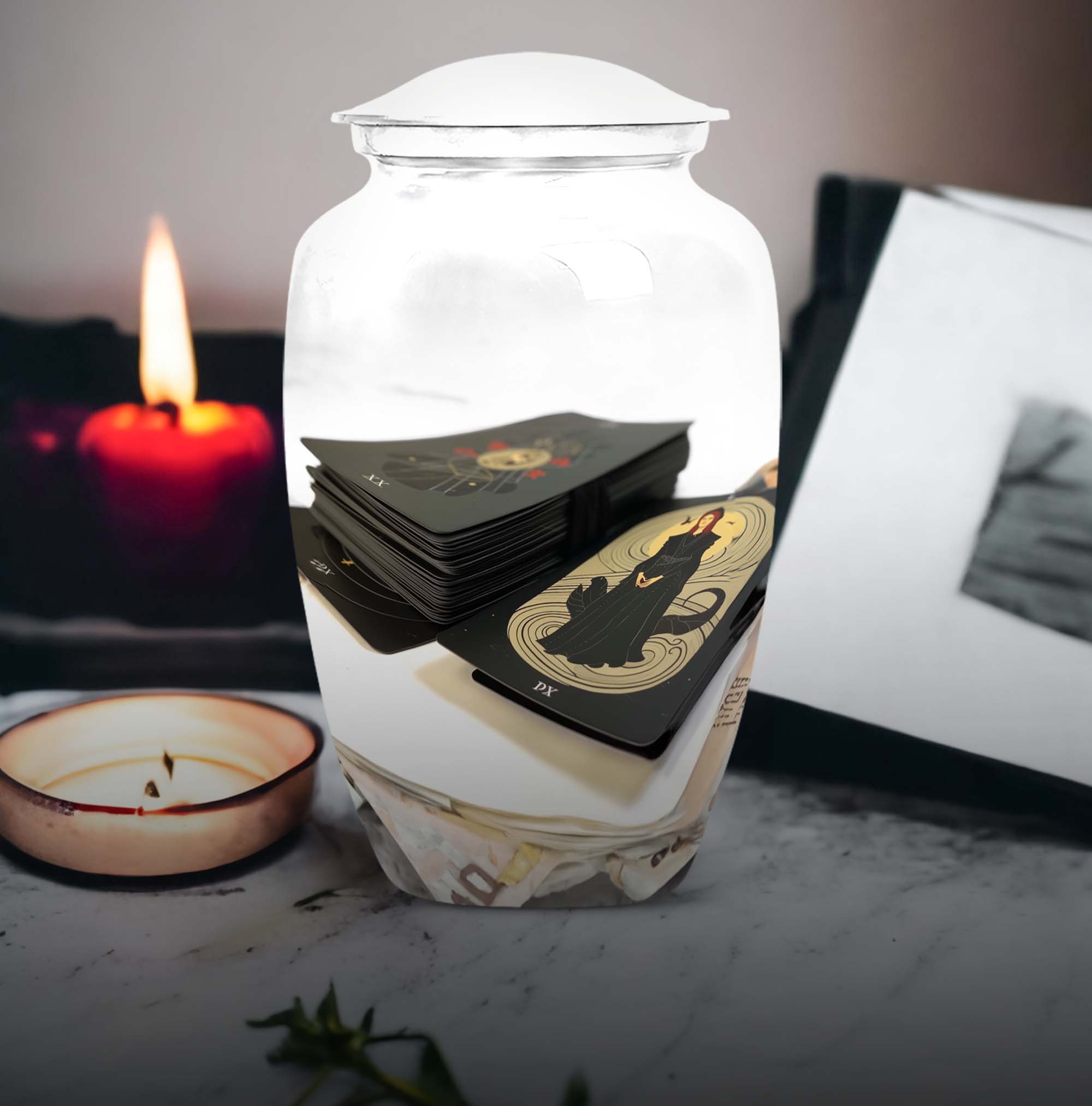 Step into a solemn and serene experience with this 10-inch Tarot Urn for adult cremation ashes. Crafted from robust Aluminium and crafted in a 'Classic Urn' style, this Urn represents a dignified tribute to your loved ones. It weighs just 3.3 pounds, making it easy to transport to your chosen memorial location. Its sleek dimensions comfortably accommodate up to 200 cubic inches of ash, making it suitable for all adult male cremations. The package also provides a soft velvet pouch to respectfully contain the ashes. This Large Urn catches one's eye with its intricate Abstract theme, adding an additional layer of spirituality. For a more personalized memorial, there is an option to customize the urn by engraving names upon it. Ideal for burial or it can grace your mantel with its unforgettable presence. Whether you're looking for 'burial medium size urns' or 'funeral urns for adult ashes women', this Tarot Urn gives reverence to the lives that enriched yours.