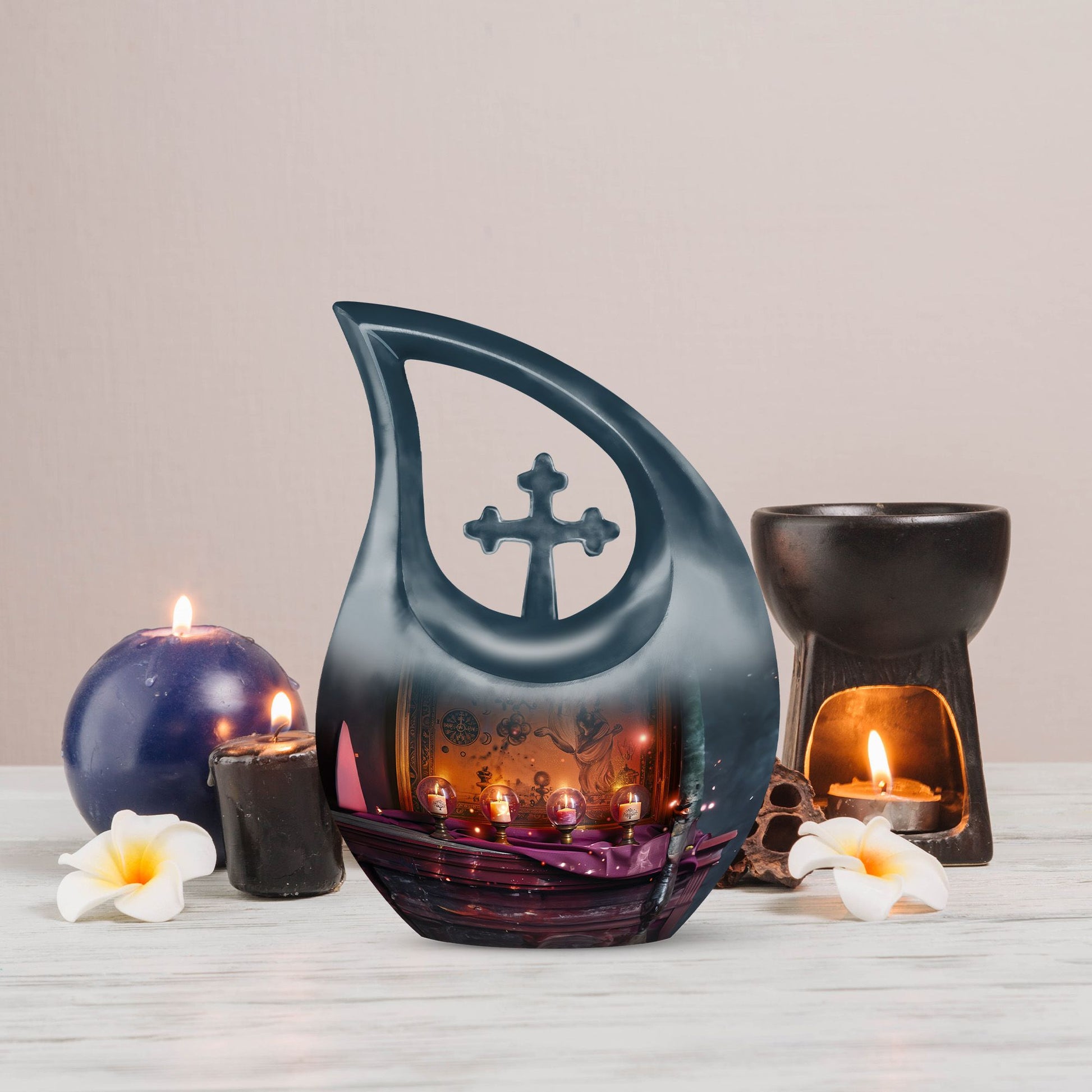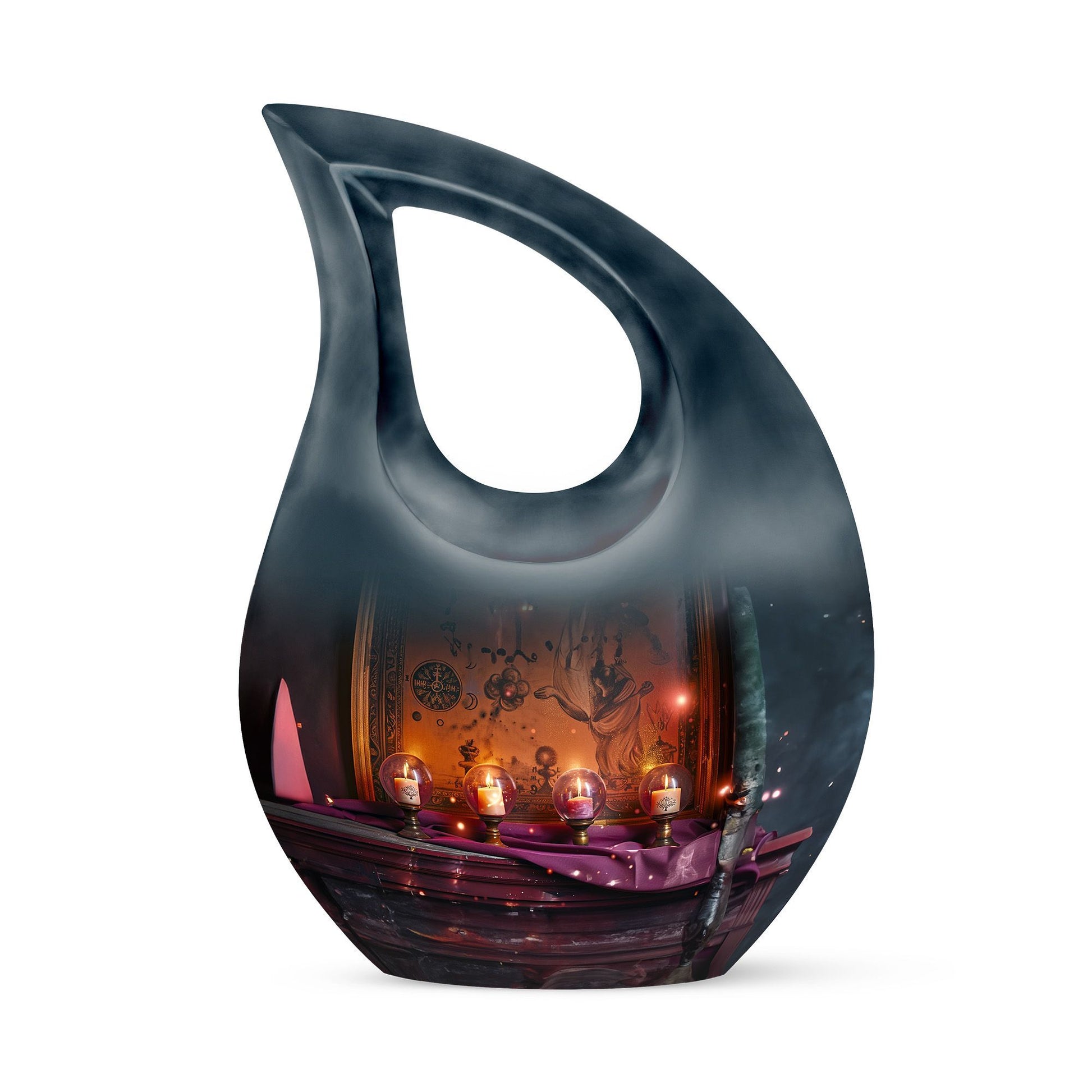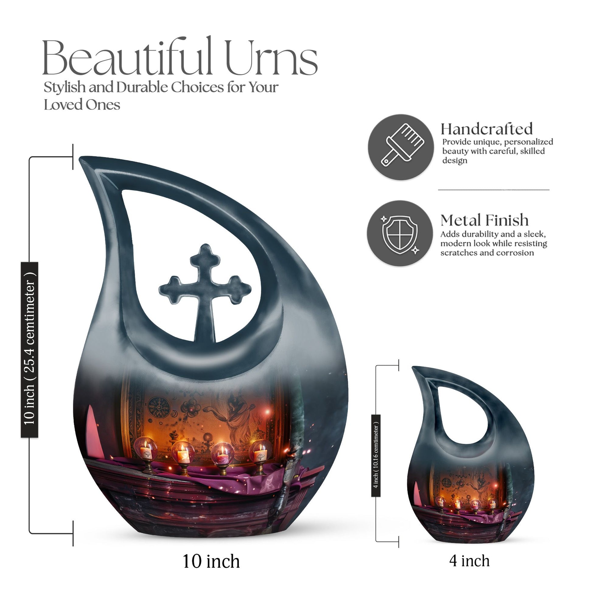 Honor the memory of a loved one with our meticulously crafted Tarot Urn, a significant piece from our memorial urns collection. This large 10-inch urn is embossed with a Cross Drop design, reflecting an emblematic integration of faith and remembrance. Made from solid aluminium, the urn is durable and has a weighty feel at 3.3 pounds. It can accommodate up to 200 cubic inches of ashes, making it an ideal piece among large urns for human ashes. We offer customization options, giving you the freedom to engrave names and blessing words for a personalized touch. What truly sets this urn apart is its Tarot theme, depicting mystique and strength. The urn comes with a velvet pouch, ensuring safe containment of ashes. Whether you want to use it as a keepsake cremation urn in your home or as a garden urn to infuse a serene essence outdoors, this Tarot urn is an apt choice. Engage in a ritual of love and remembrance with our premium quality urn, designed to offer a warm space for your loved one's memories.