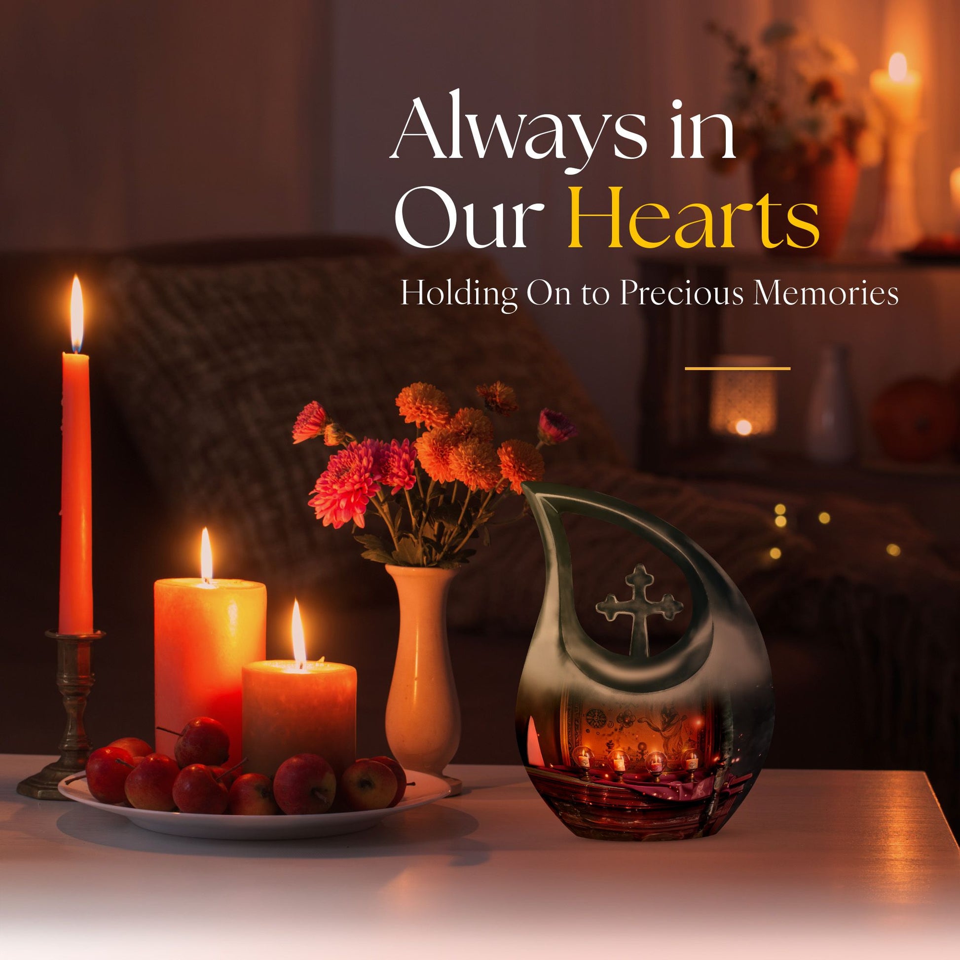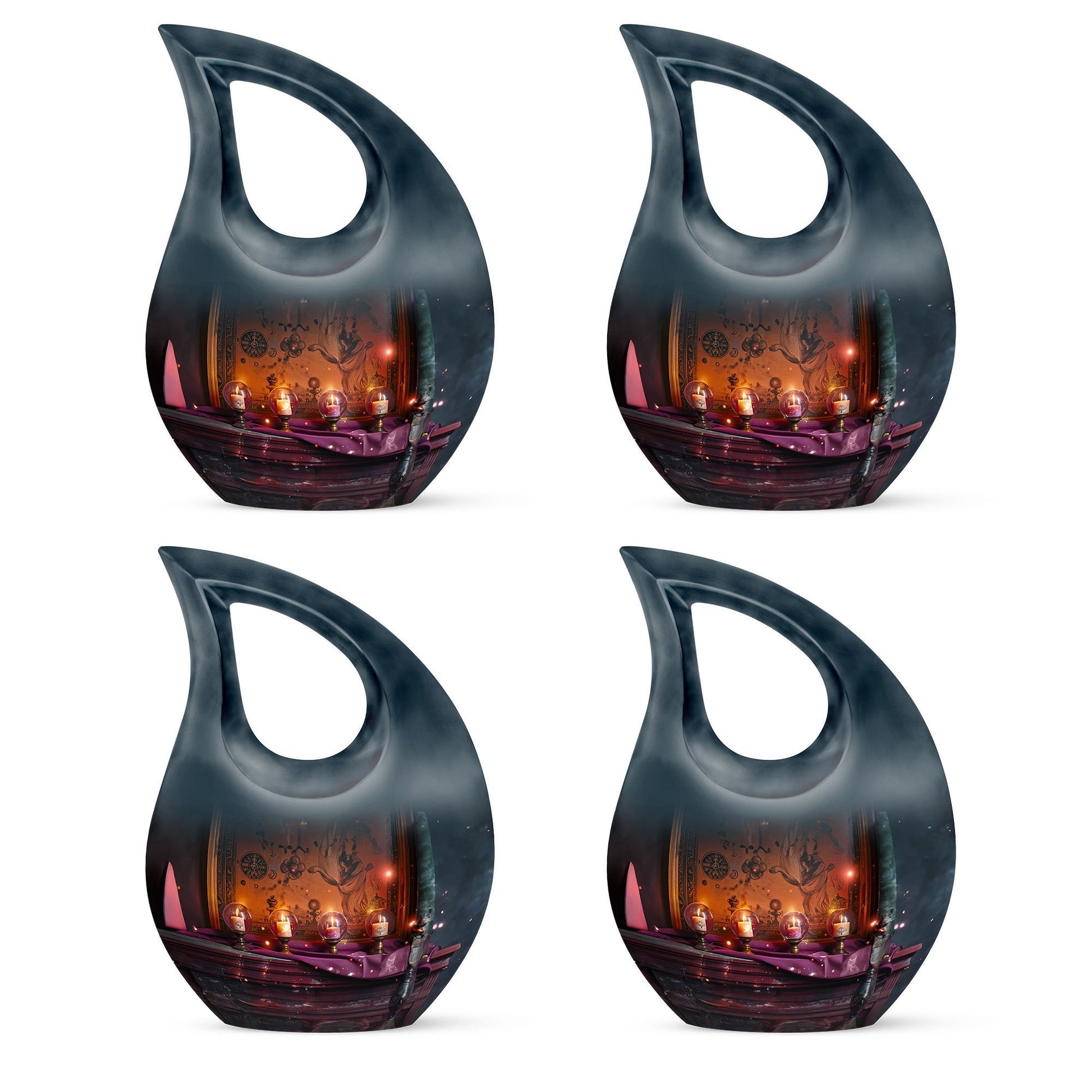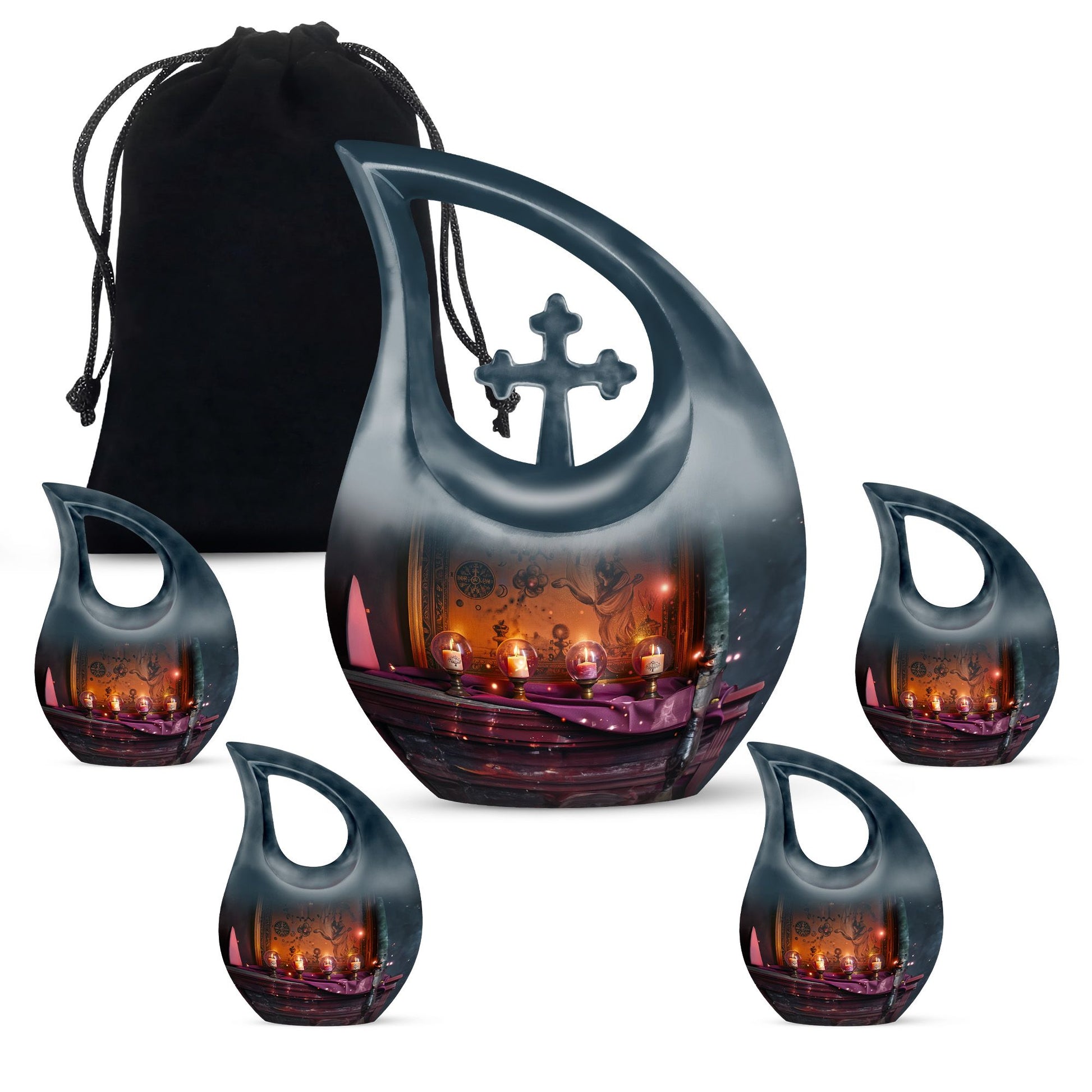Honor the memory of a loved one with our meticulously crafted Tarot Urn, a significant piece from our memorial urns collection. This large 10-inch urn is embossed with a Cross Drop design, reflecting an emblematic integration of faith and remembrance. Made from solid aluminium, the urn is durable and has a weighty feel at 3.3 pounds. It can accommodate up to 200 cubic inches of ashes, making it an ideal piece among large urns for human ashes. We offer customization options, giving you the freedom to engrave names and blessing words for a personalized touch. What truly sets this urn apart is its Tarot theme, depicting mystique and strength. The urn comes with a velvet pouch, ensuring safe containment of ashes. Whether you want to use it as a keepsake cremation urn in your home or as a garden urn to infuse a serene essence outdoors, this Tarot urn is an apt choice. Engage in a ritual of love and remembrance with our premium quality urn, designed to offer a warm space for your loved one's memories.
