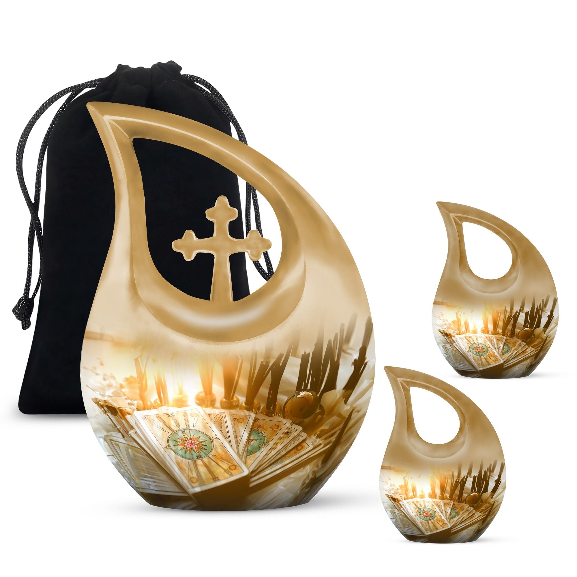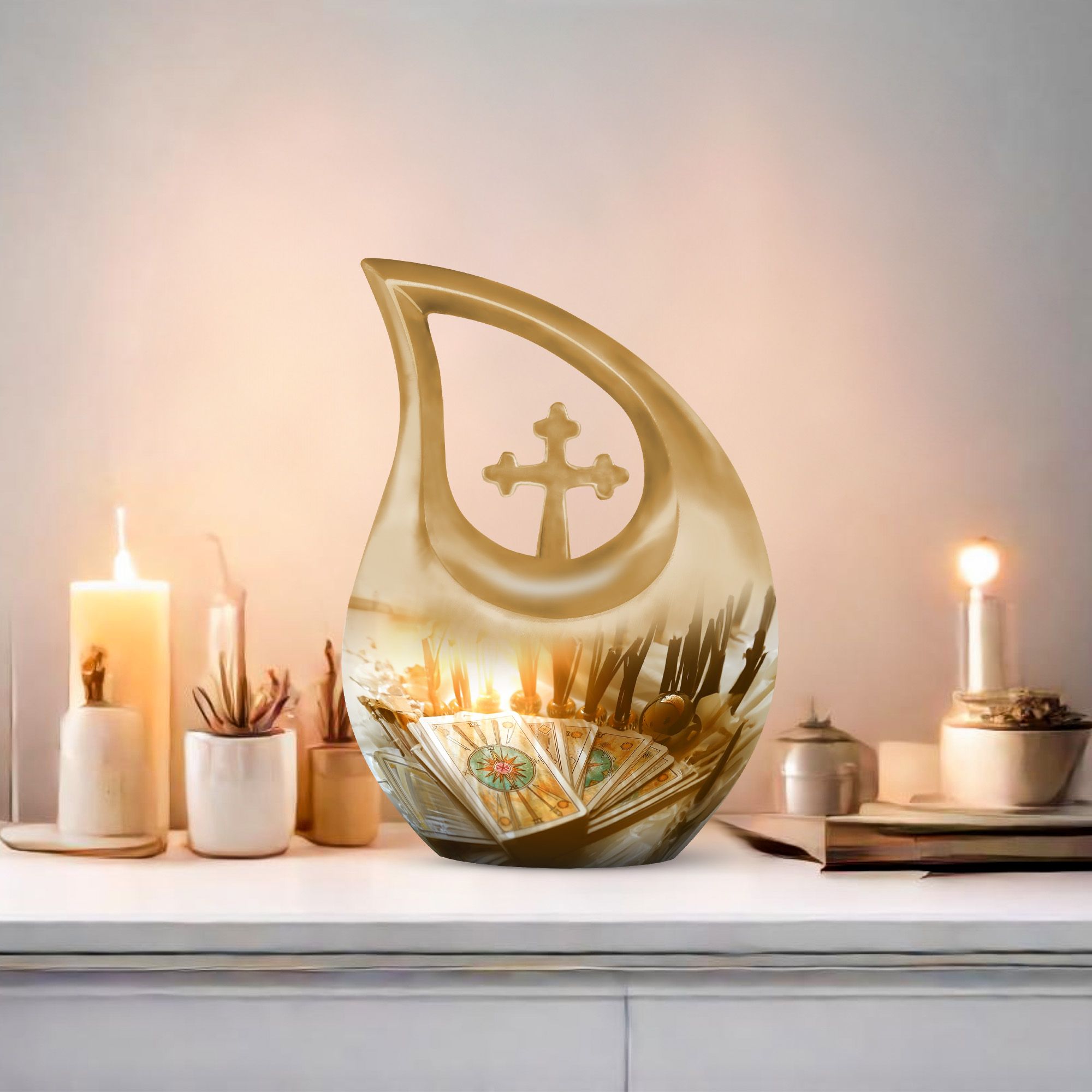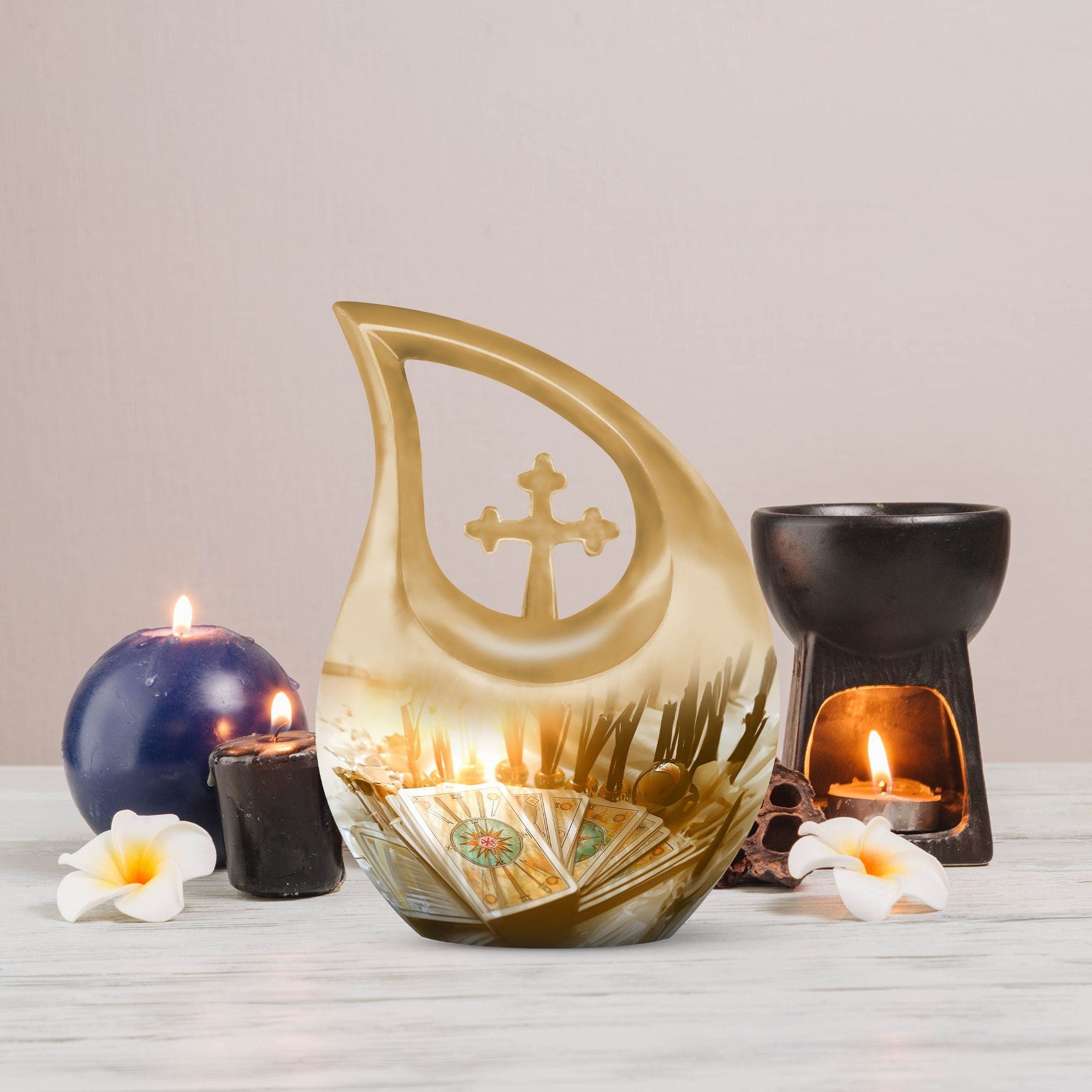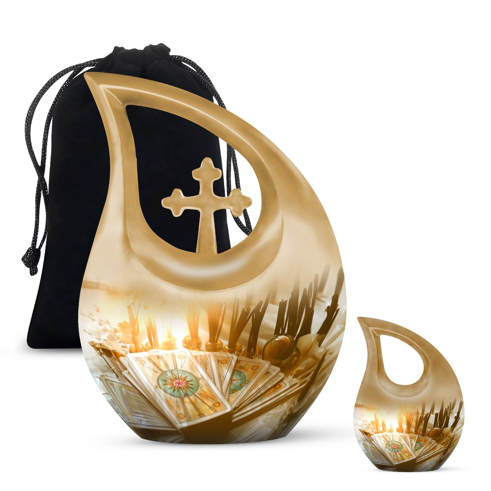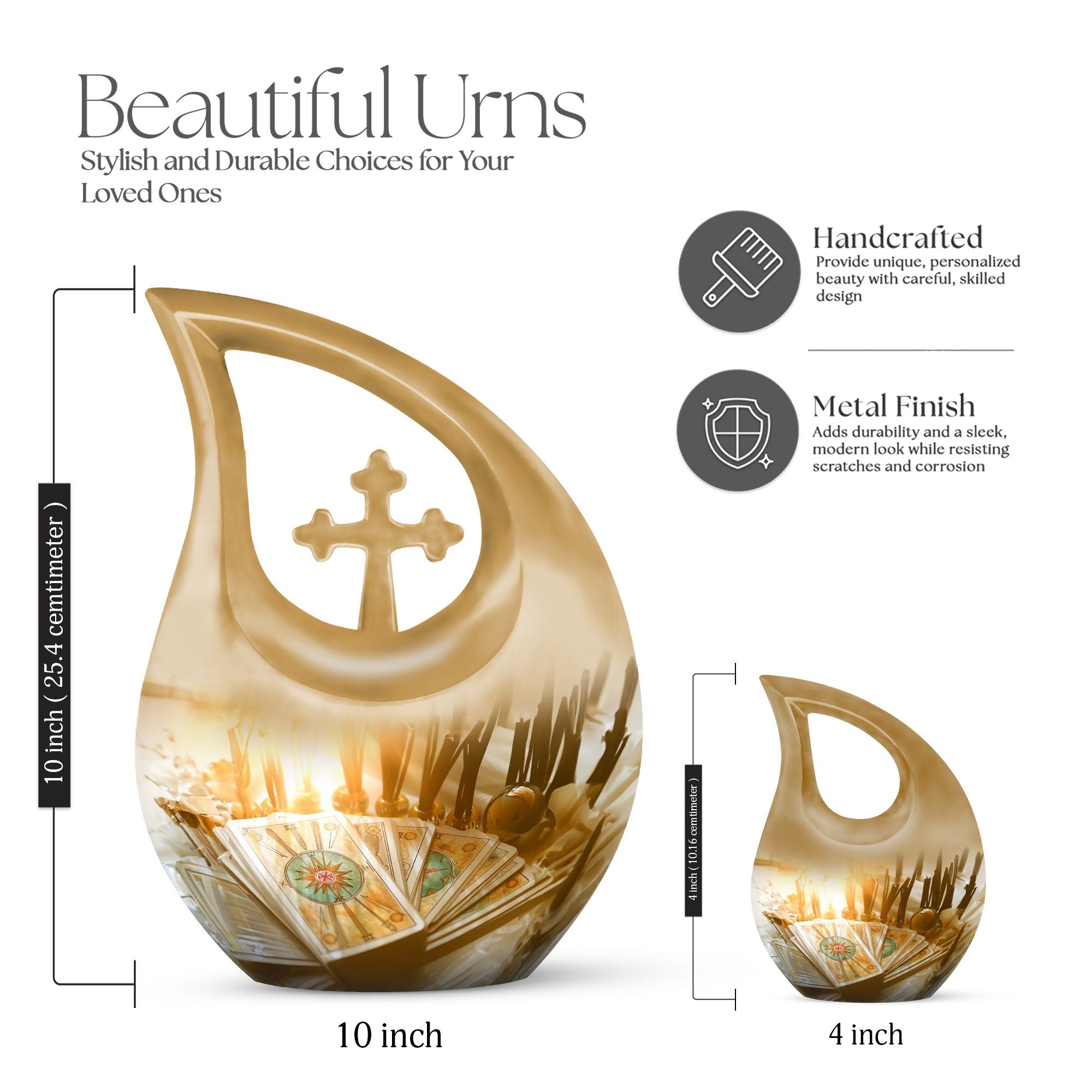 Introducing our unique and meticulously crafted Tarot Urn, a truly heartfelt way to commemorate your departed loved ones. Not just an ashes container, but an embodiment of cherishable memories, our Tarot urn is specifically made for mom, featuring an exquisite Cross Drop design. Size is an important factor when honoring a departed soul and therefore, our urn measures a sizable 10 inches in height. Designed from robust aluminium, this urn weighs a substantial 3.3 pounds, rendering it durable yet portable. The urn has a substantial capacity of 200 cubic inches, accommodating the ashes with respect and dignity. We understand the need for a personal touch, which is why our urns can be customized with engraved names, creating a lasting, personal tribute. The package comes complete with a luxurious velvet pouch, ensuring proper containment of ashes. Stay reassured with our large urns, crafted with love and ethereal Tarot theme. Ideal for those seeking cremation vaults or urns exuding love and warmth.