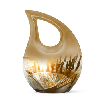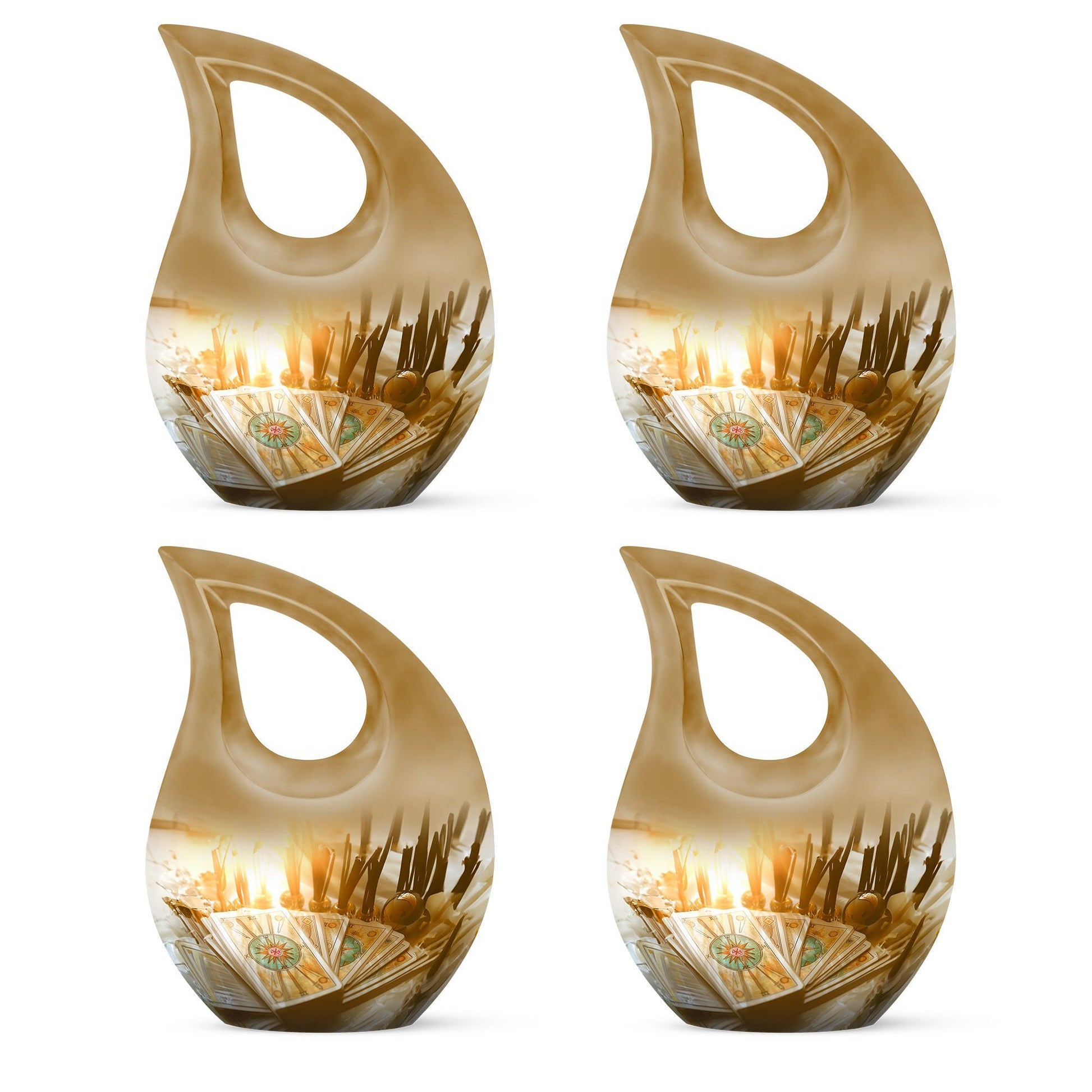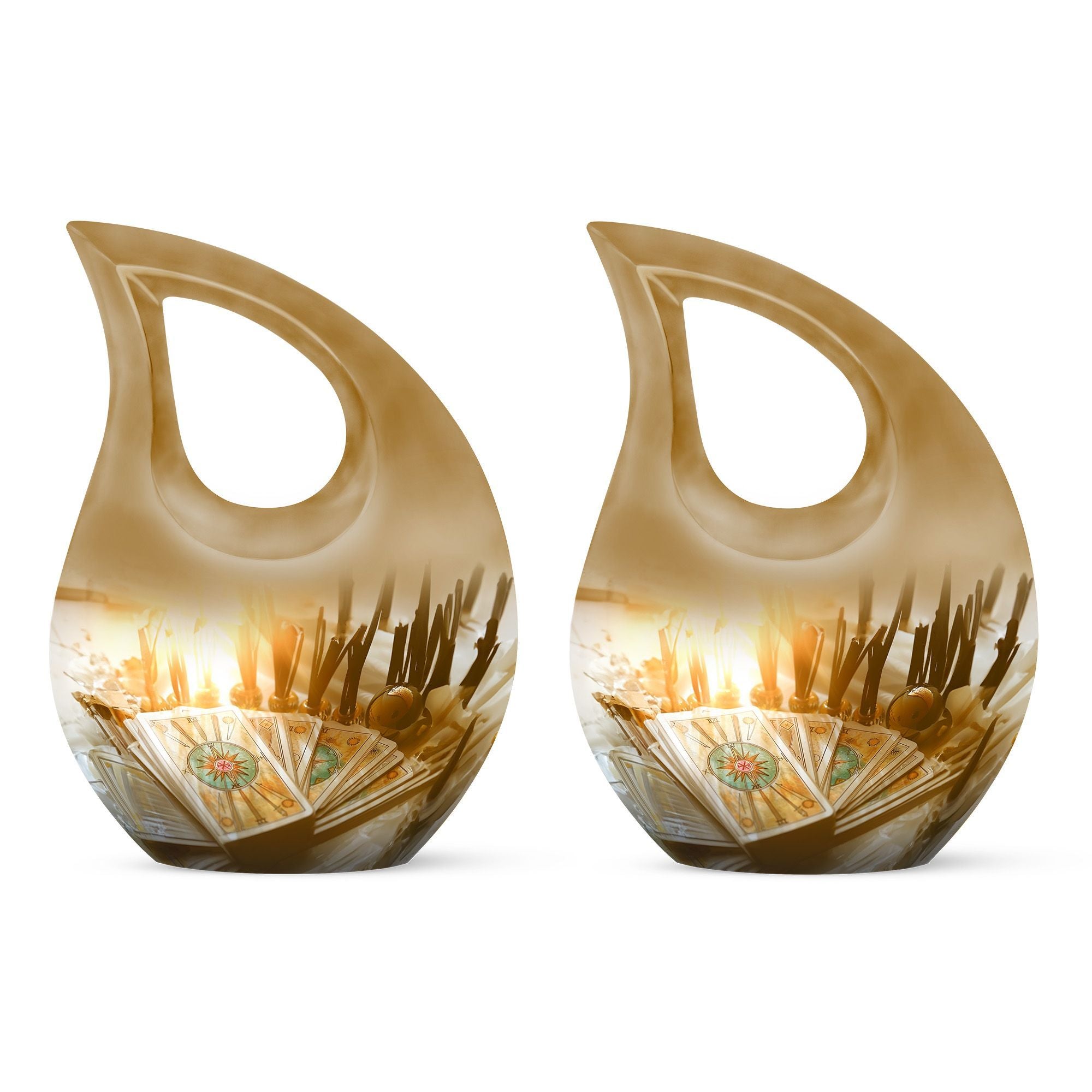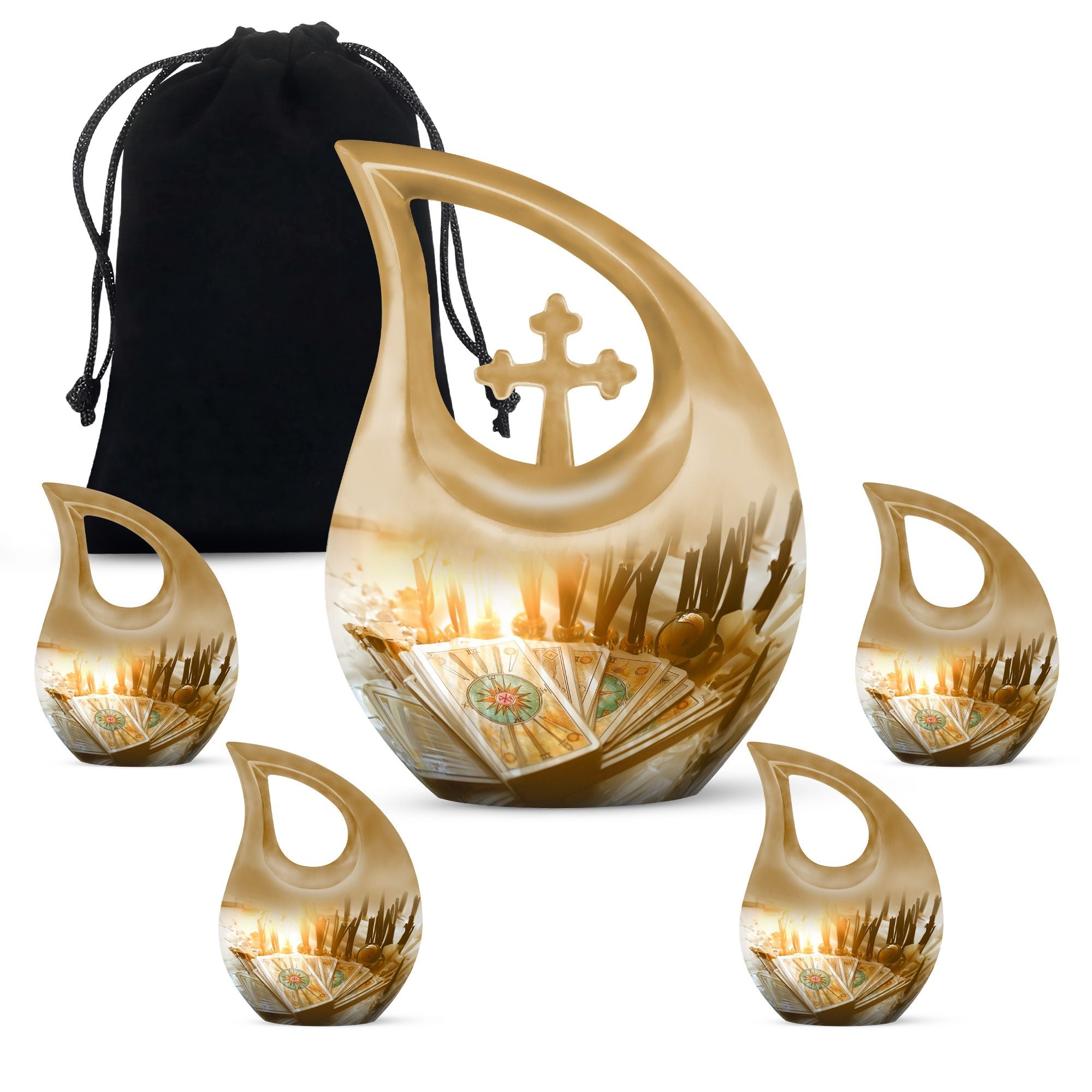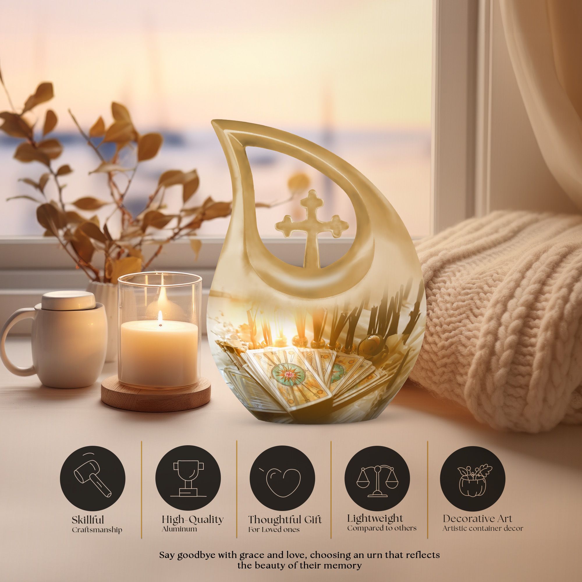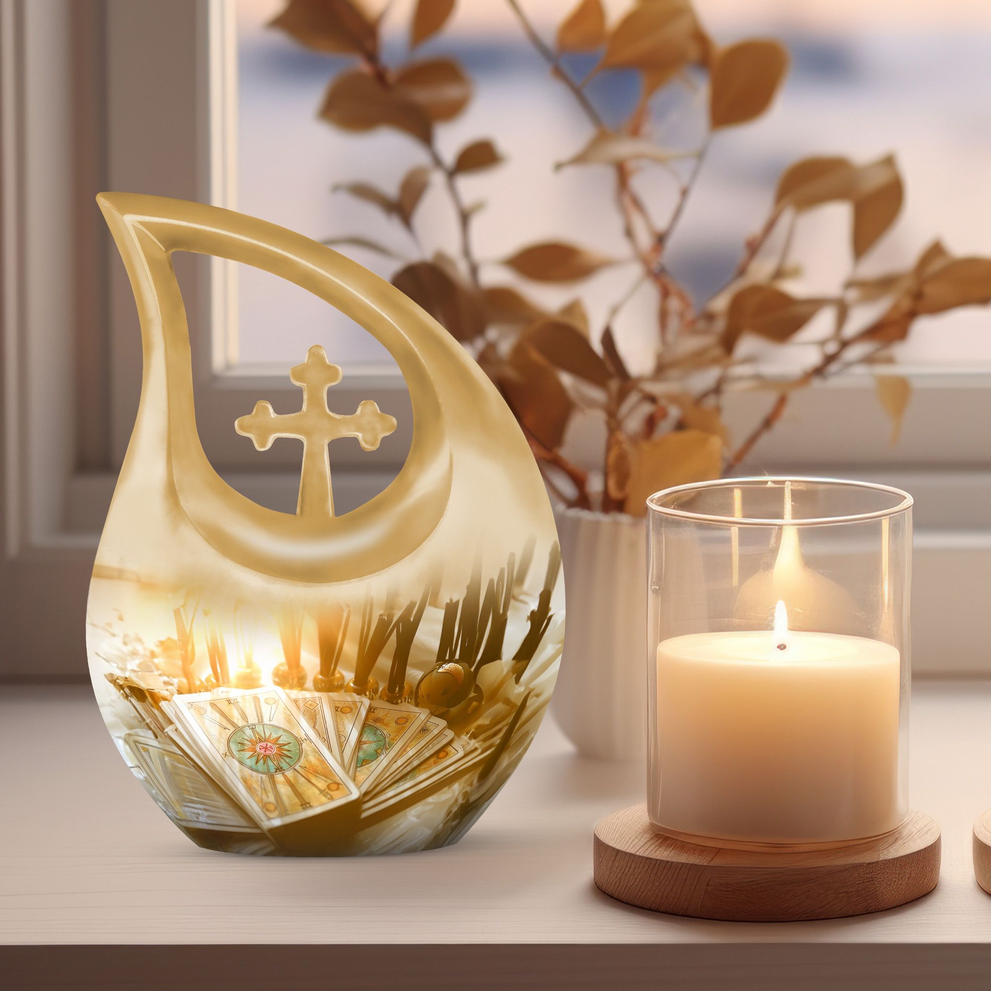 Introducing our unique and meticulously crafted Tarot Urn, a truly heartfelt way to commemorate your departed loved ones. Not just an ashes container, but an embodiment of cherishable memories, our Tarot urn is specifically made for mom, featuring an exquisite Cross Drop design. Size is an important factor when honoring a departed soul and therefore, our urn measures a sizable 10 inches in height. Designed from robust aluminium, this urn weighs a substantial 3.3 pounds, rendering it durable yet portable. The urn has a substantial capacity of 200 cubic inches, accommodating the ashes with respect and dignity. We understand the need for a personal touch, which is why our urns can be customized with engraved names, creating a lasting, personal tribute. The package comes complete with a luxurious velvet pouch, ensuring proper containment of ashes. Stay reassured with our large urns, crafted with love and ethereal Tarot theme. Ideal for those seeking cremation vaults or urns exuding love and warmth.