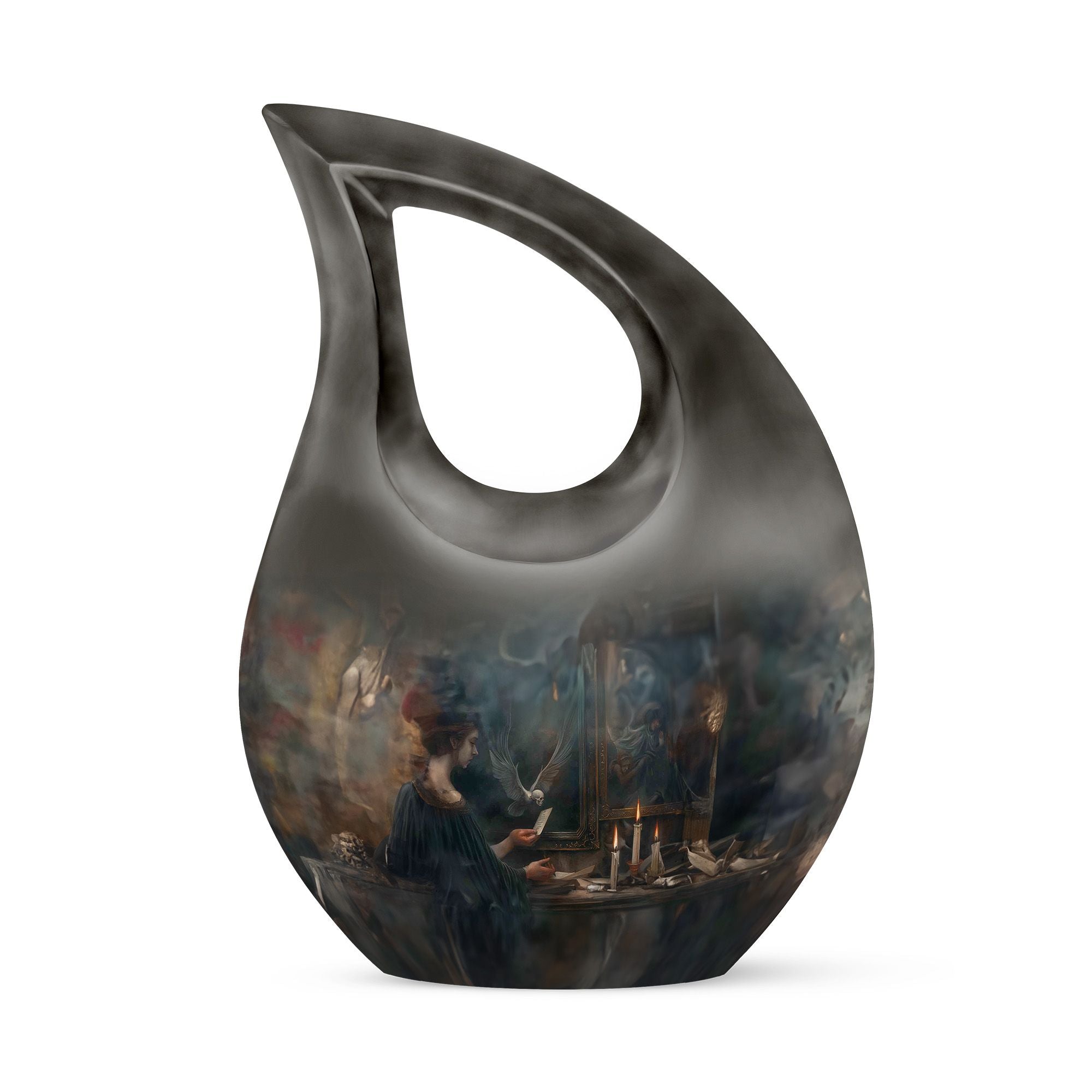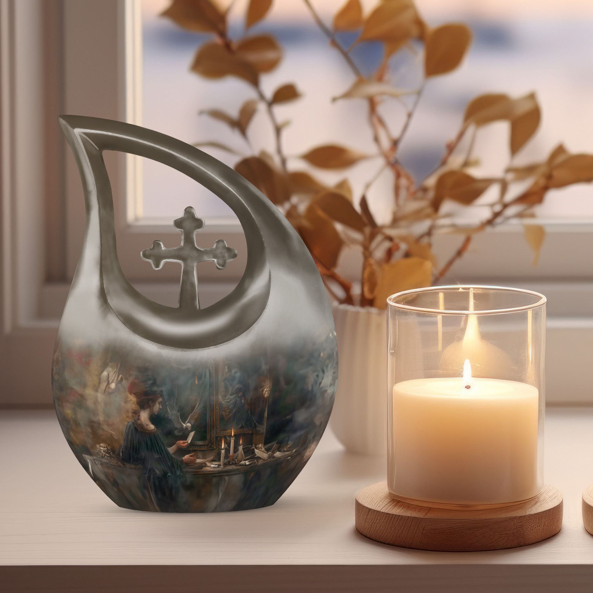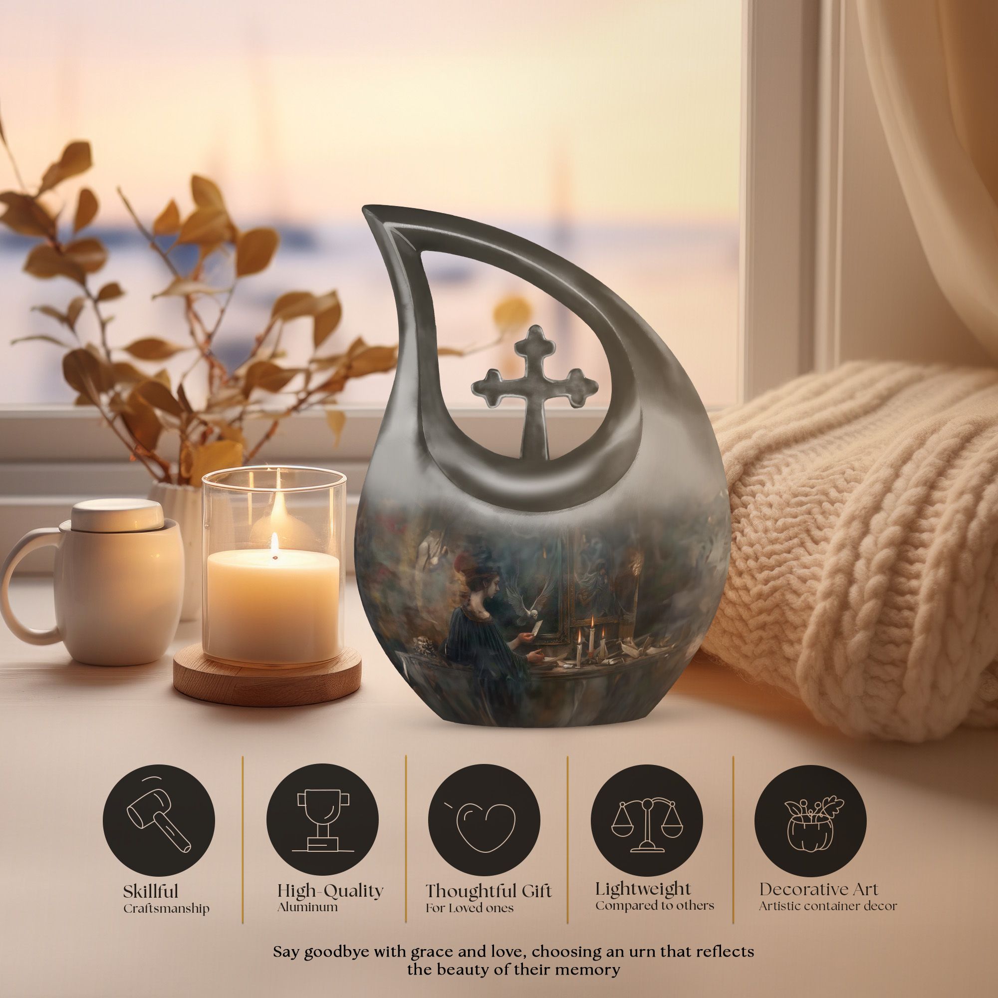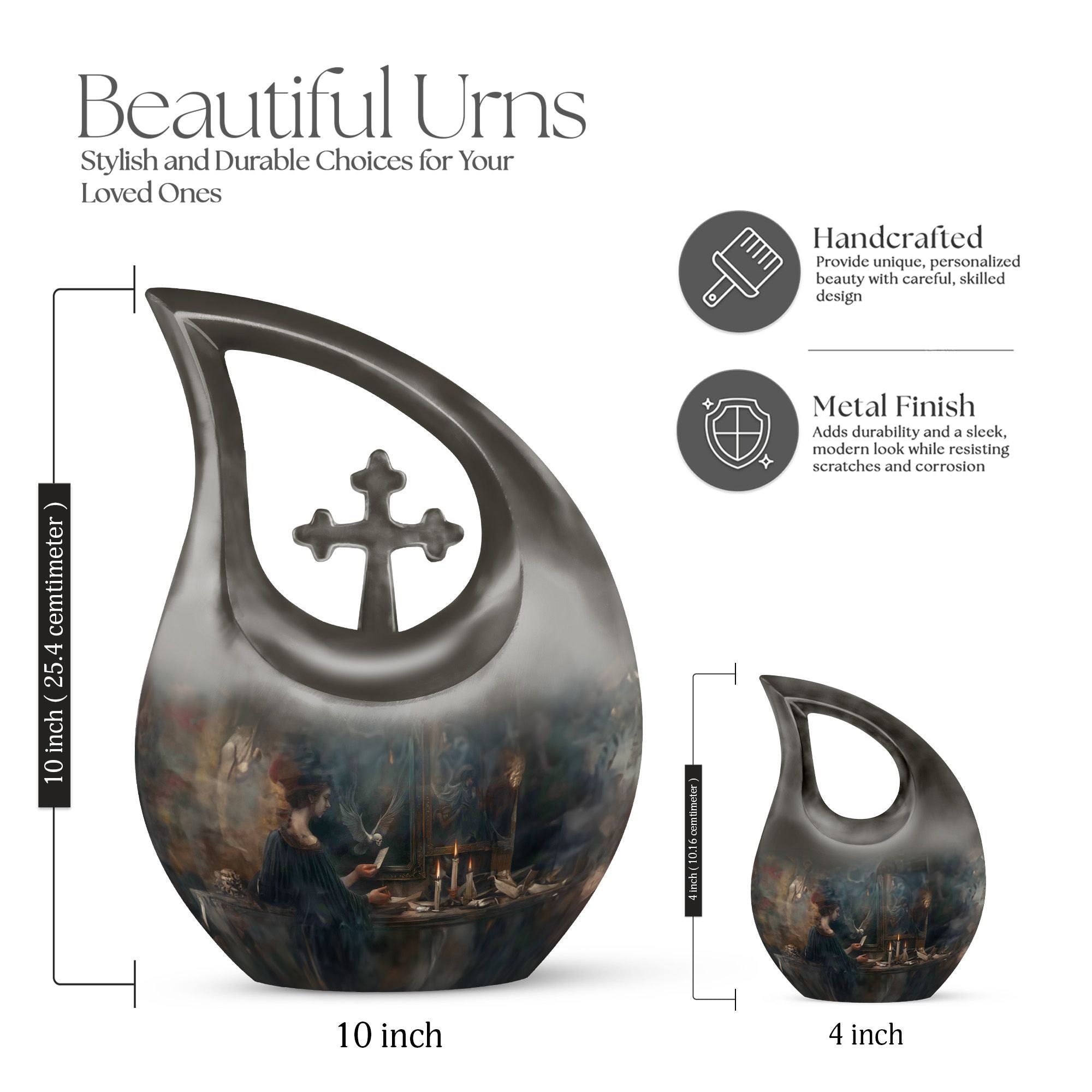 Discover the essence of peace and spiritual tranquility with our Tarot Urn, a grand memorial urn designed to cherish the memory of your loved ones. With a size of 10 inches and an ideal weight of 3.3 pounds, this Burial Urn for Adults presents itself as an emblem of remembrance in your living space. Provided with a velvet pouch for the containment of ashes, it ensures the enduring preservation of your sincere sentiments. Made from sturdy Aluminium, this Large urn carries an impressive capacity of 200 cubic inches, elegantly suitable for those seeking double urns for ashes or engraved urns that signify a heartfelt tribute. Personalize it with engraved names, reflecting a personal touch. The ever-popular tarot theme, combined with a surreal Cross Drop styling, this product stands as an authentic piece in the realm of Cremation Ashes Keepsakes. Note: Angel Urns For Ashes not included in the package.