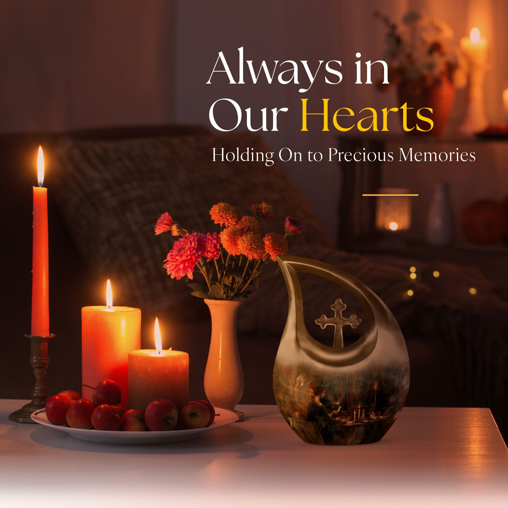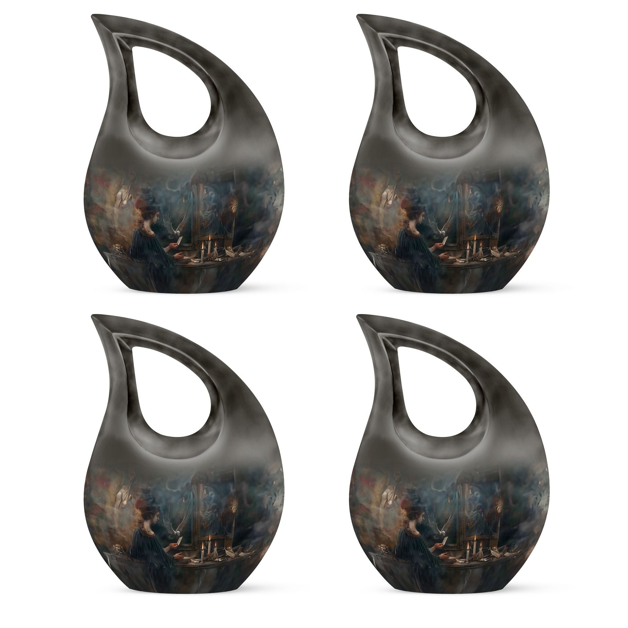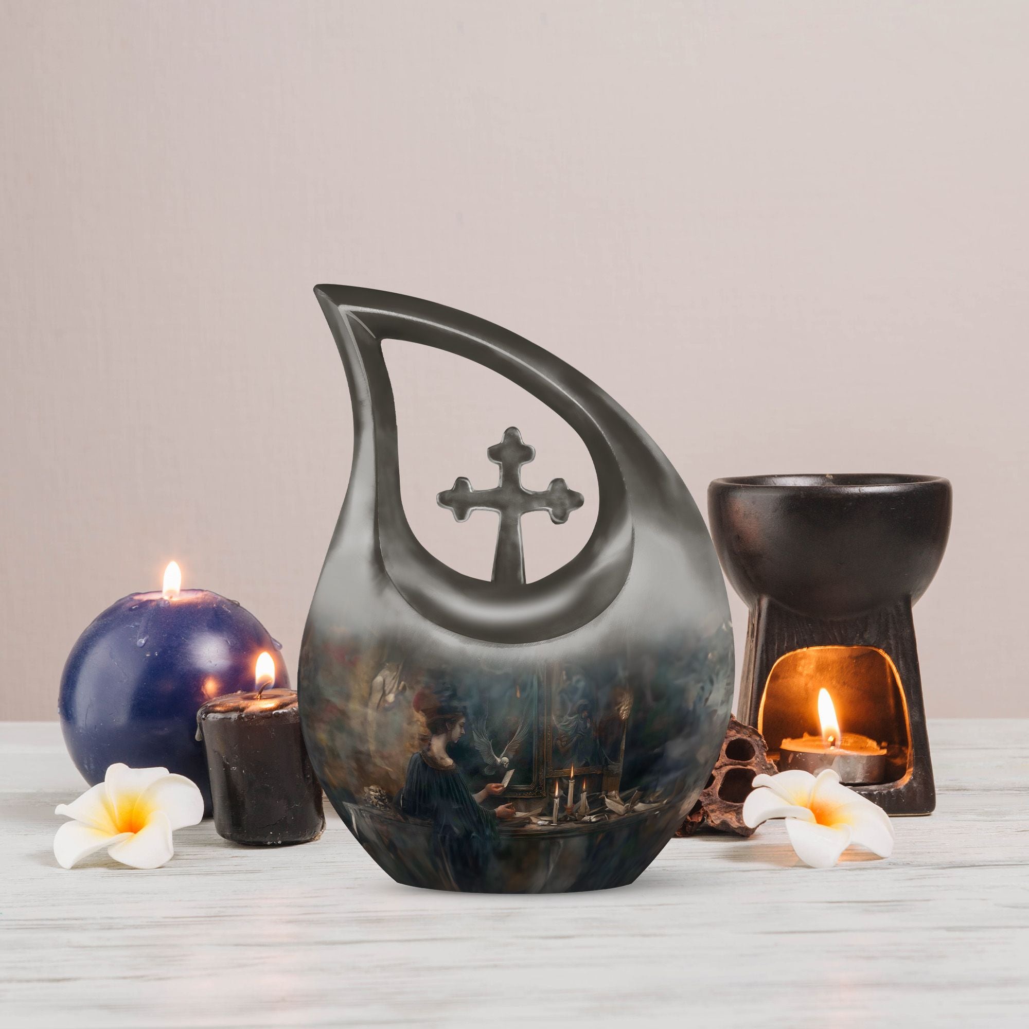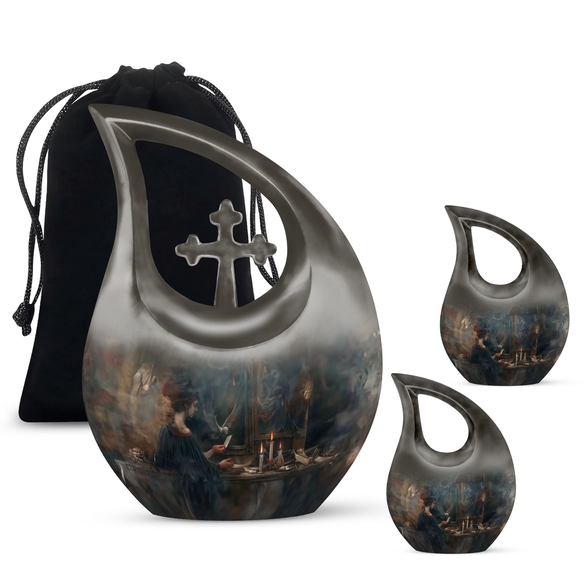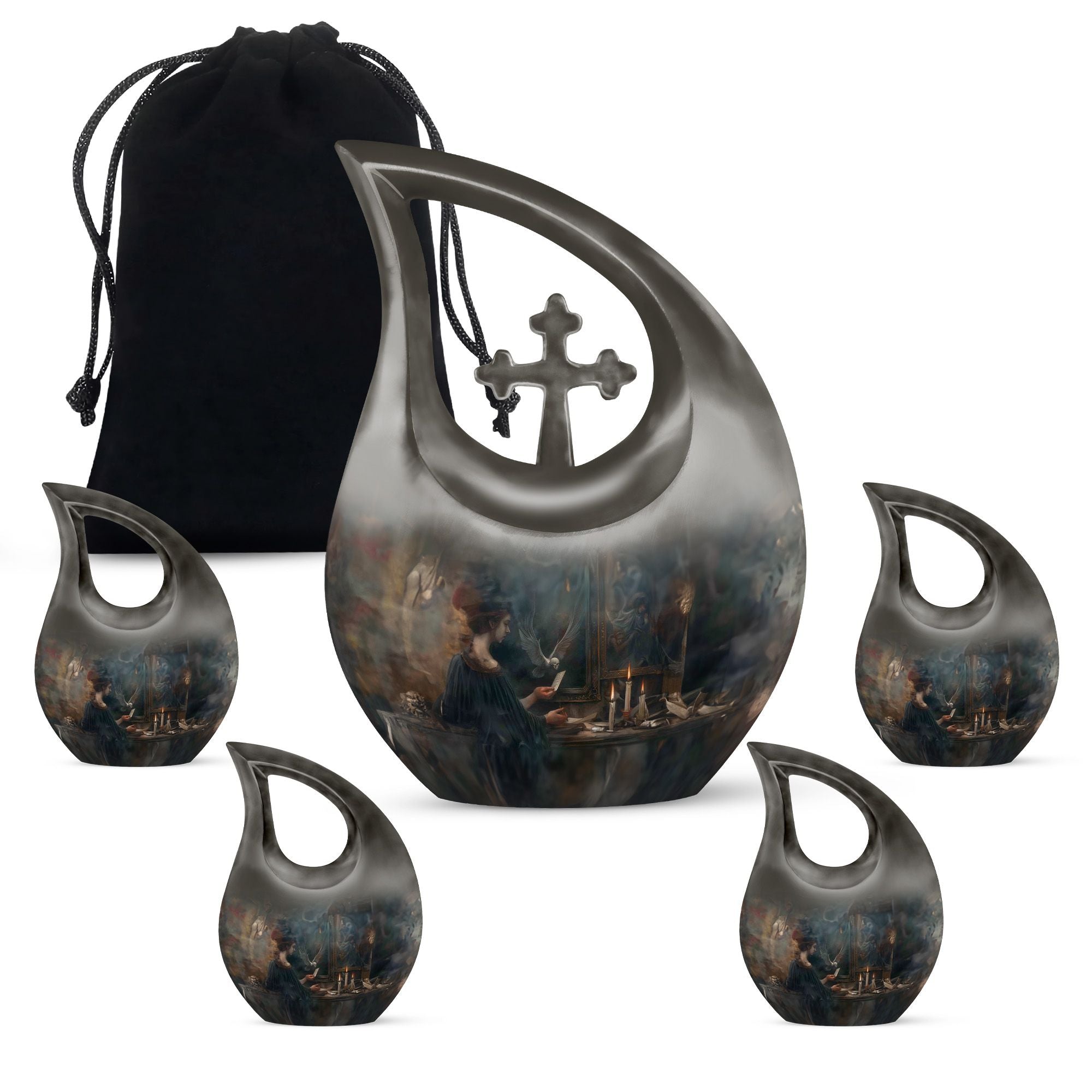 Discover the essence of peace and spiritual tranquility with our Tarot Urn, a grand memorial urn designed to cherish the memory of your loved ones. With a size of 10 inches and an ideal weight of 3.3 pounds, this Burial Urn for Adults presents itself as an emblem of remembrance in your living space. Provided with a velvet pouch for the containment of ashes, it ensures the enduring preservation of your sincere sentiments. Made from sturdy Aluminium, this Large urn carries an impressive capacity of 200 cubic inches, elegantly suitable for those seeking double urns for ashes or engraved urns that signify a heartfelt tribute. Personalize it with engraved names, reflecting a personal touch. The ever-popular tarot theme, combined with a surreal Cross Drop styling, this product stands as an authentic piece in the realm of Cremation Ashes Keepsakes. Note: Angel Urns For Ashes not included in the package.