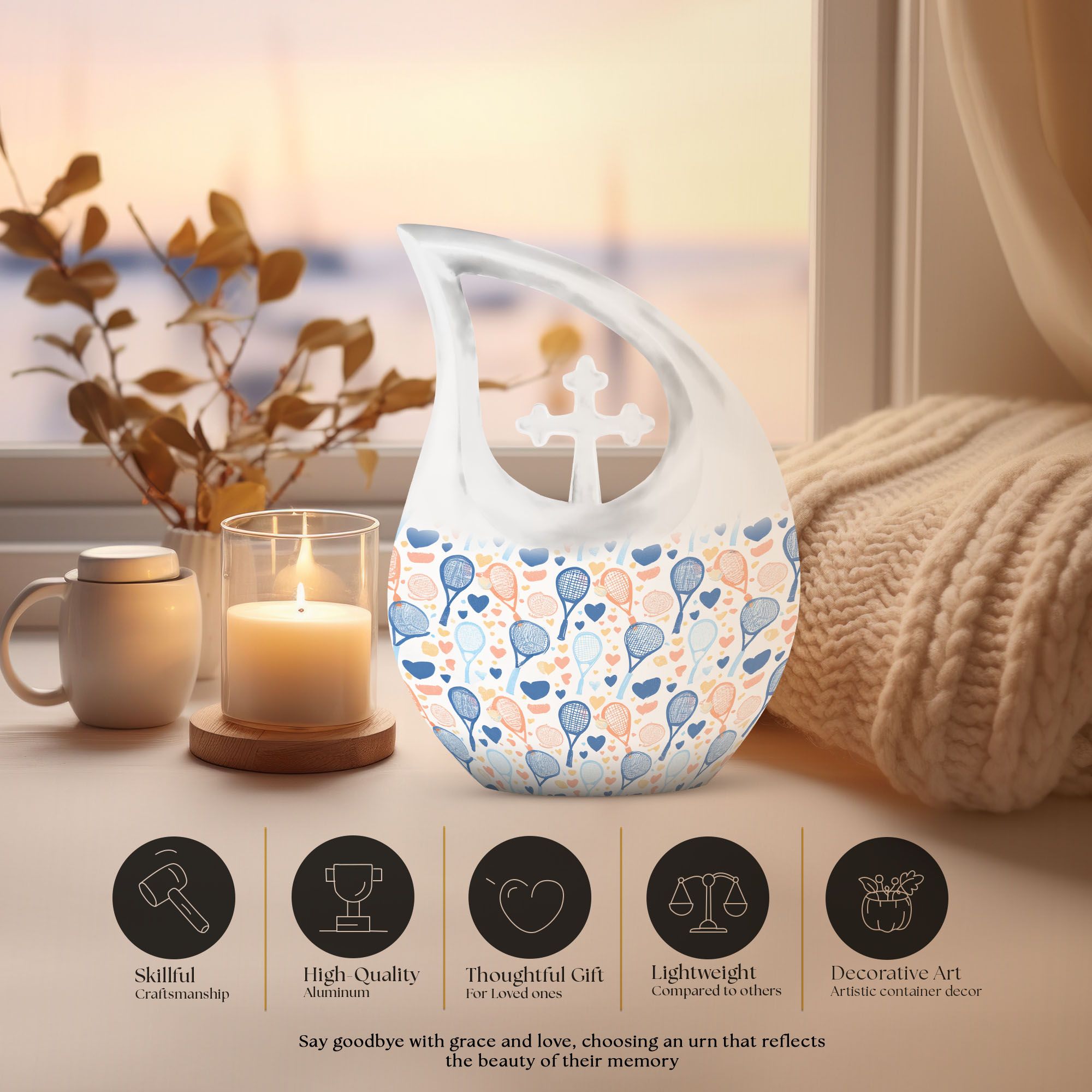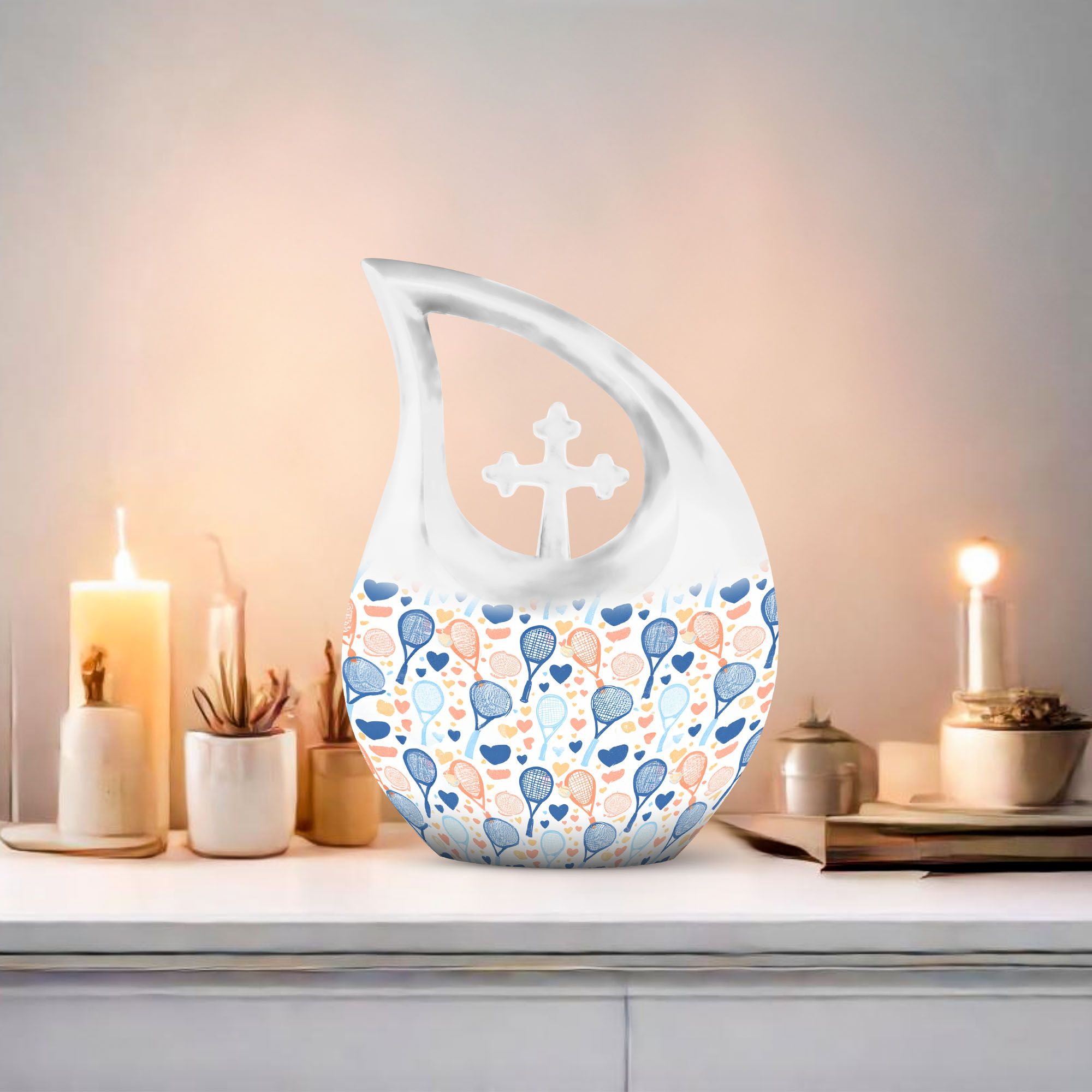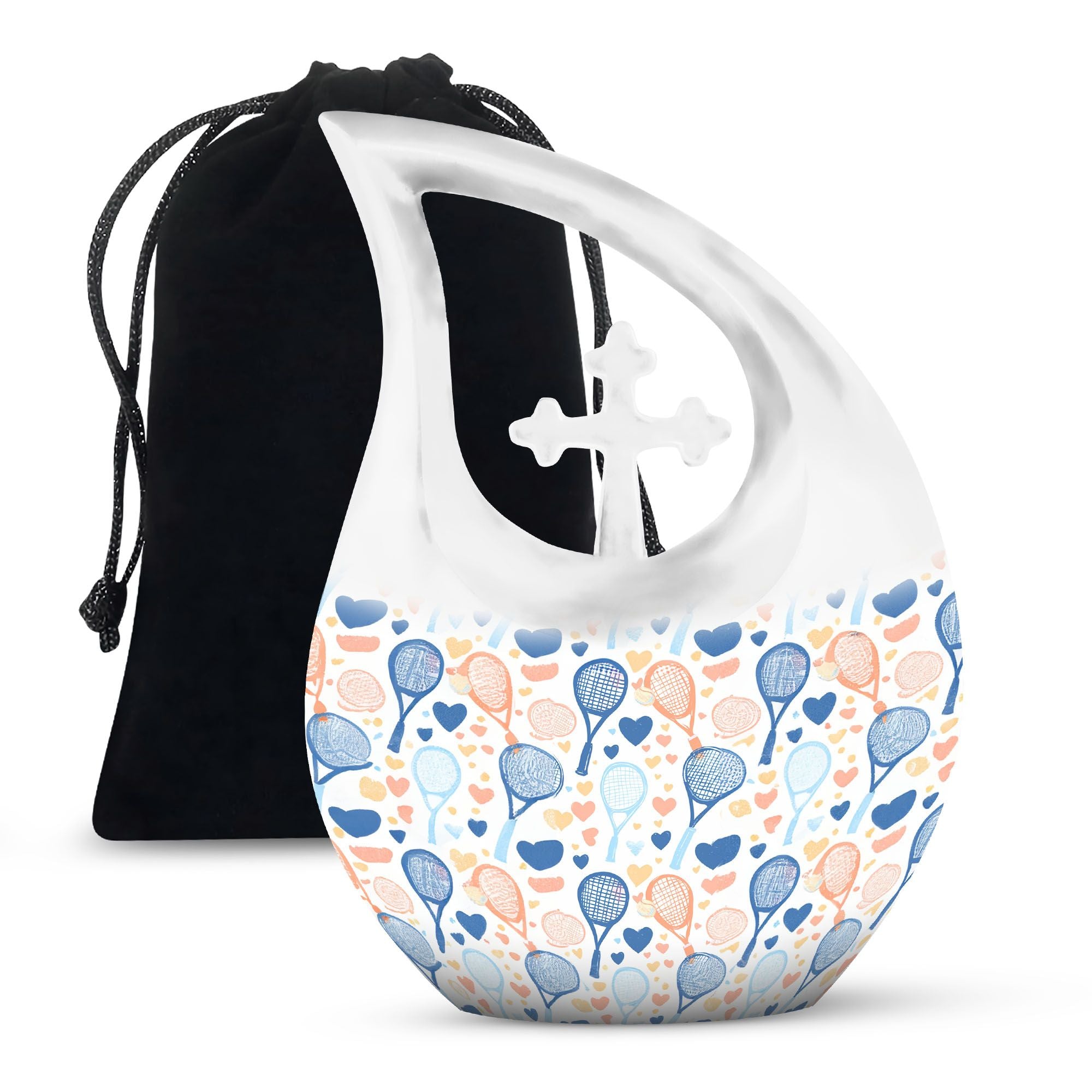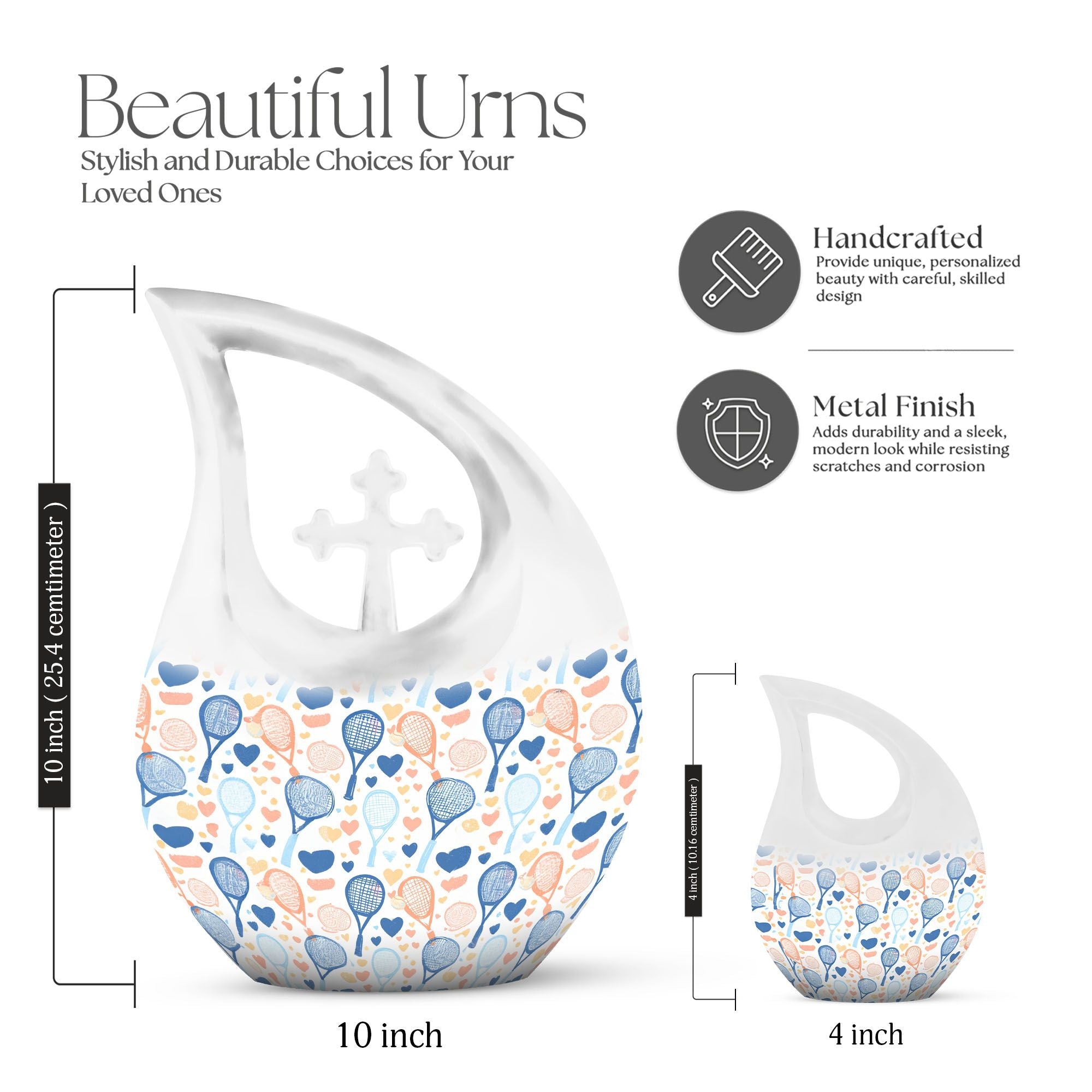 Celebrate and honor the memories of your loved ones with this thoughtfully curated Tennis Urn. Sized at a substantial 10 inches, this Memorial Urn for Ashes is large enough to hold up to 200 cubic inches of ashes. Crafted from high-quality, lightweight aluminum, it weighs a comfortable 3.3 pounds, easy to handle and transport. The urn features a beautifully conceived 'Cross Drop' theme, tying in closely with the sport of Tennis, making it an ideal tribute for enthusiasts or players of the game. The urn package includes a plush velvet pouch, offering a secure and dignified containment for the ashes. Personalization is also available, allowing you to engrave names that eternally embellish this resting place for your dear one. This urn seamlessly merges aesthetics with practicality, making it a fitting choice for memorials. Preferred search terminologies like Funeral Urns, Custom Urns for Ashes might lead you closer to this unique urn.