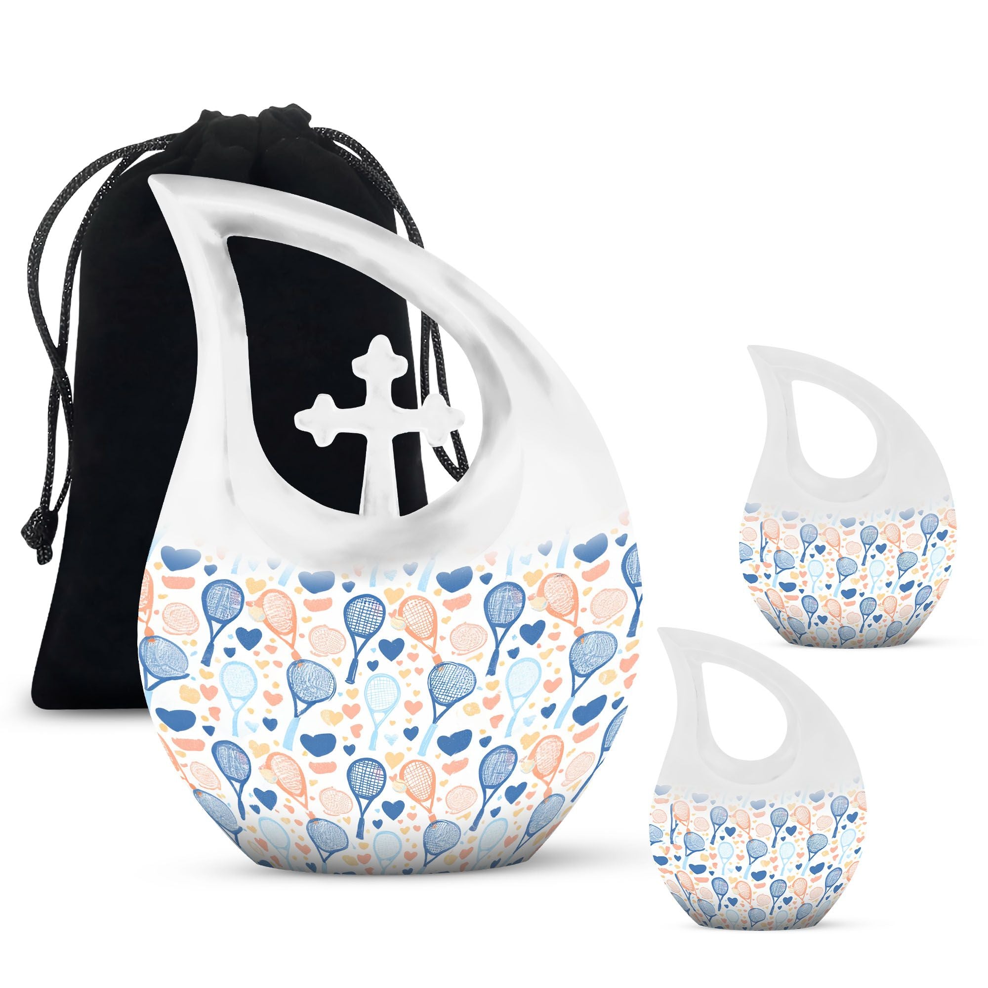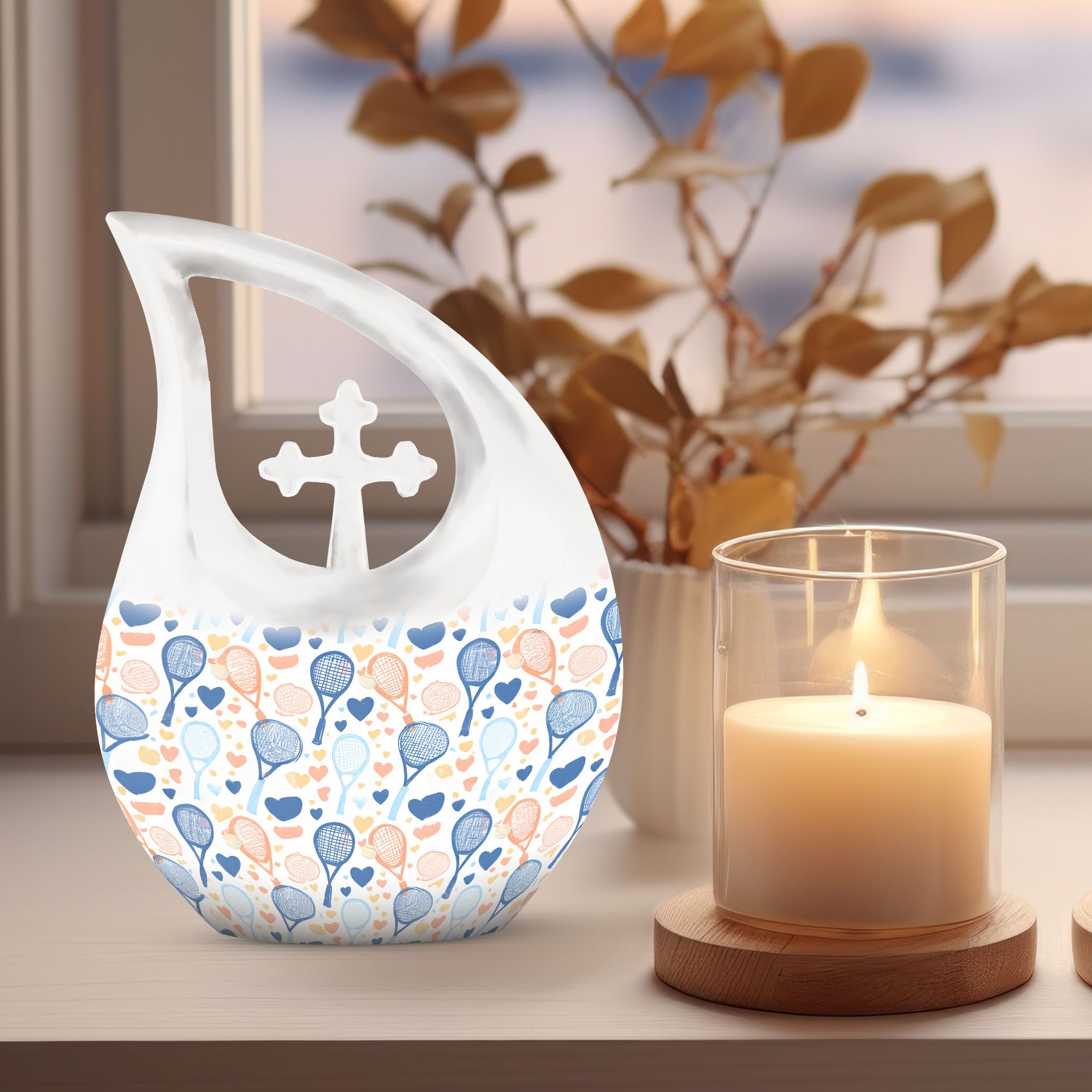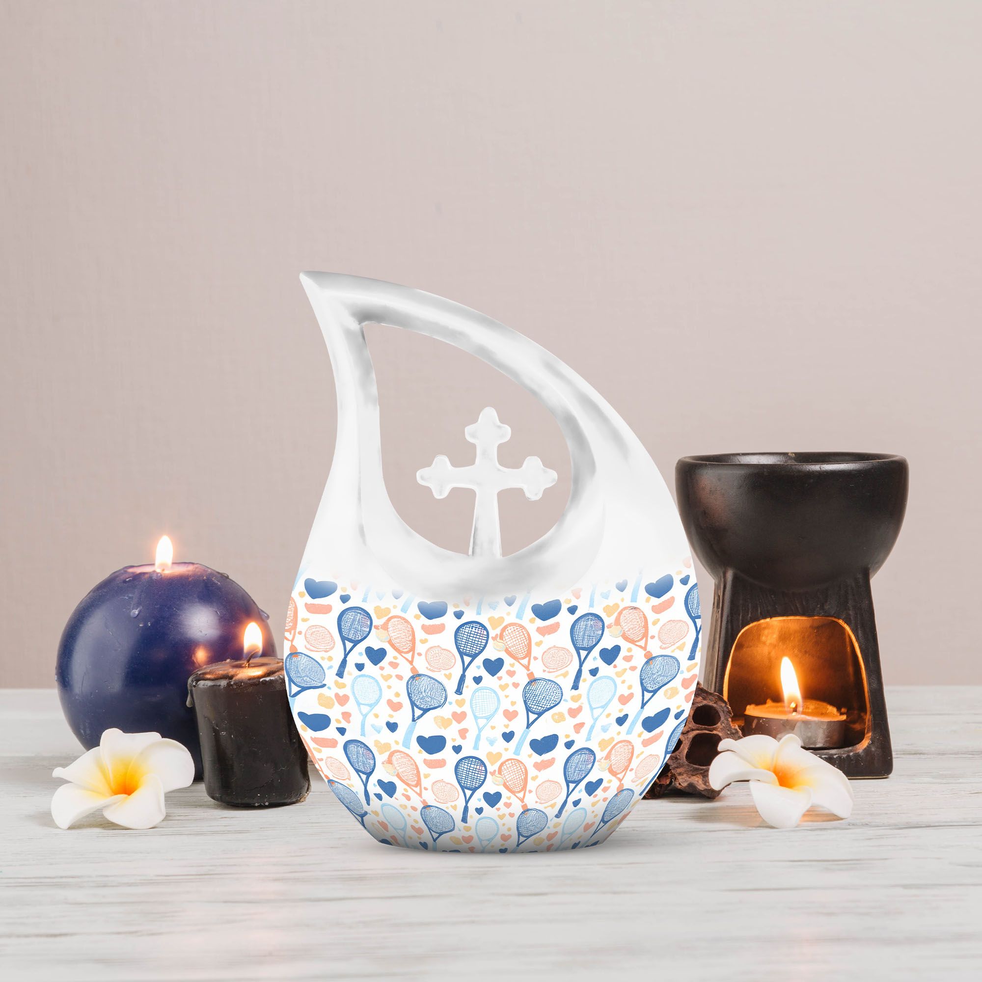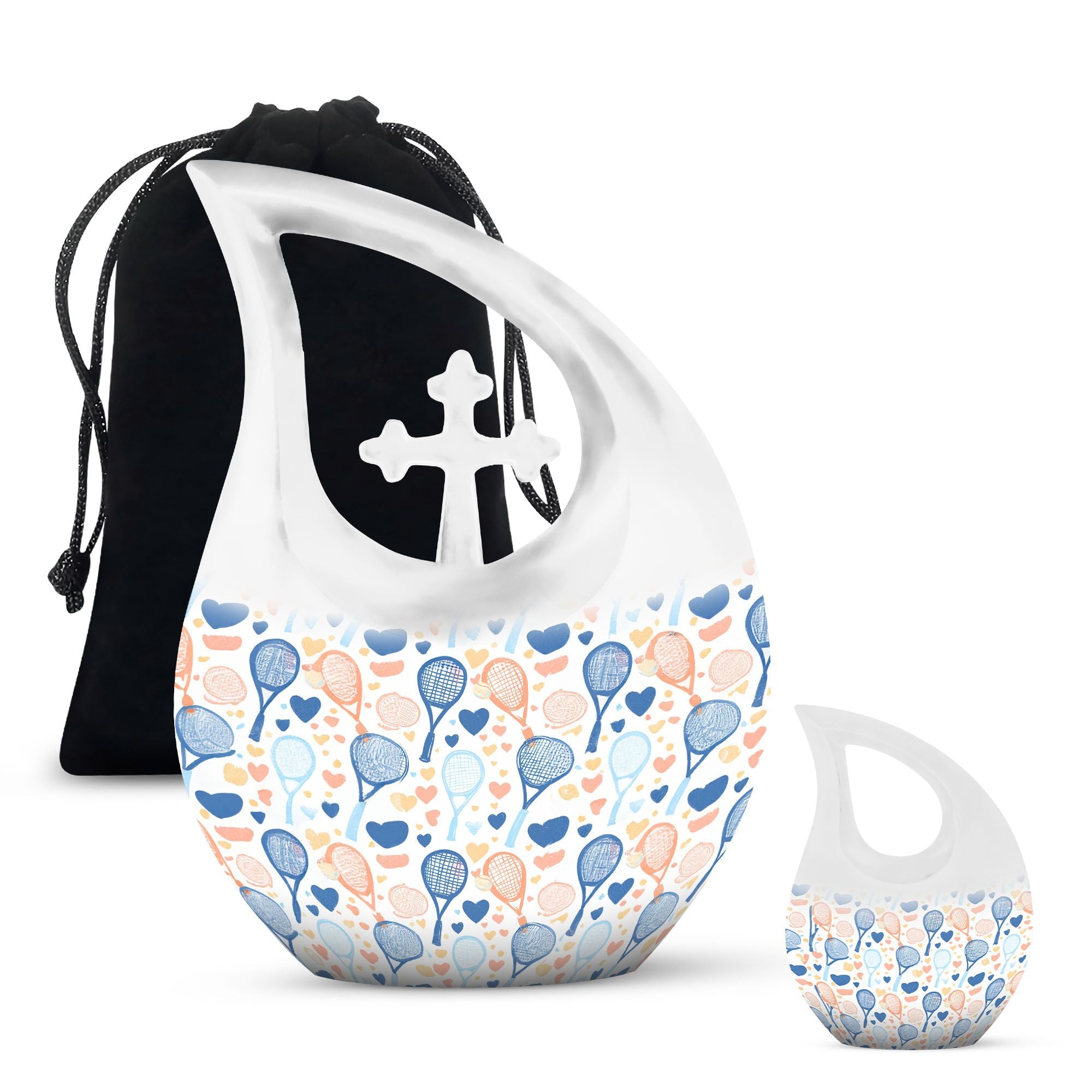 Celebrate and honor the memories of your loved ones with this thoughtfully curated Tennis Urn. Sized at a substantial 10 inches, this Memorial Urn for Ashes is large enough to hold up to 200 cubic inches of ashes. Crafted from high-quality, lightweight aluminum, it weighs a comfortable 3.3 pounds, easy to handle and transport. The urn features a beautifully conceived 'Cross Drop' theme, tying in closely with the sport of Tennis, making it an ideal tribute for enthusiasts or players of the game. The urn package includes a plush velvet pouch, offering a secure and dignified containment for the ashes. Personalization is also available, allowing you to engrave names that eternally embellish this resting place for your dear one. This urn seamlessly merges aesthetics with practicality, making it a fitting choice for memorials. Preferred search terminologies like Funeral Urns, Custom Urns for Ashes might lead you closer to this unique urn.