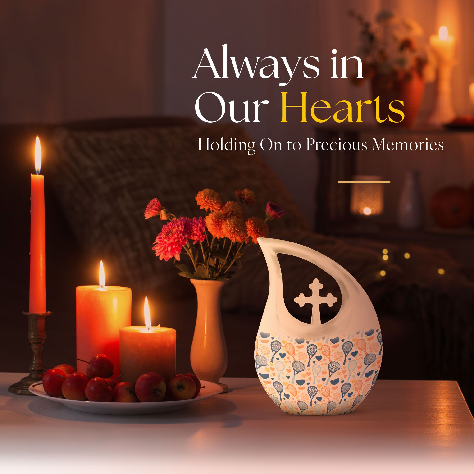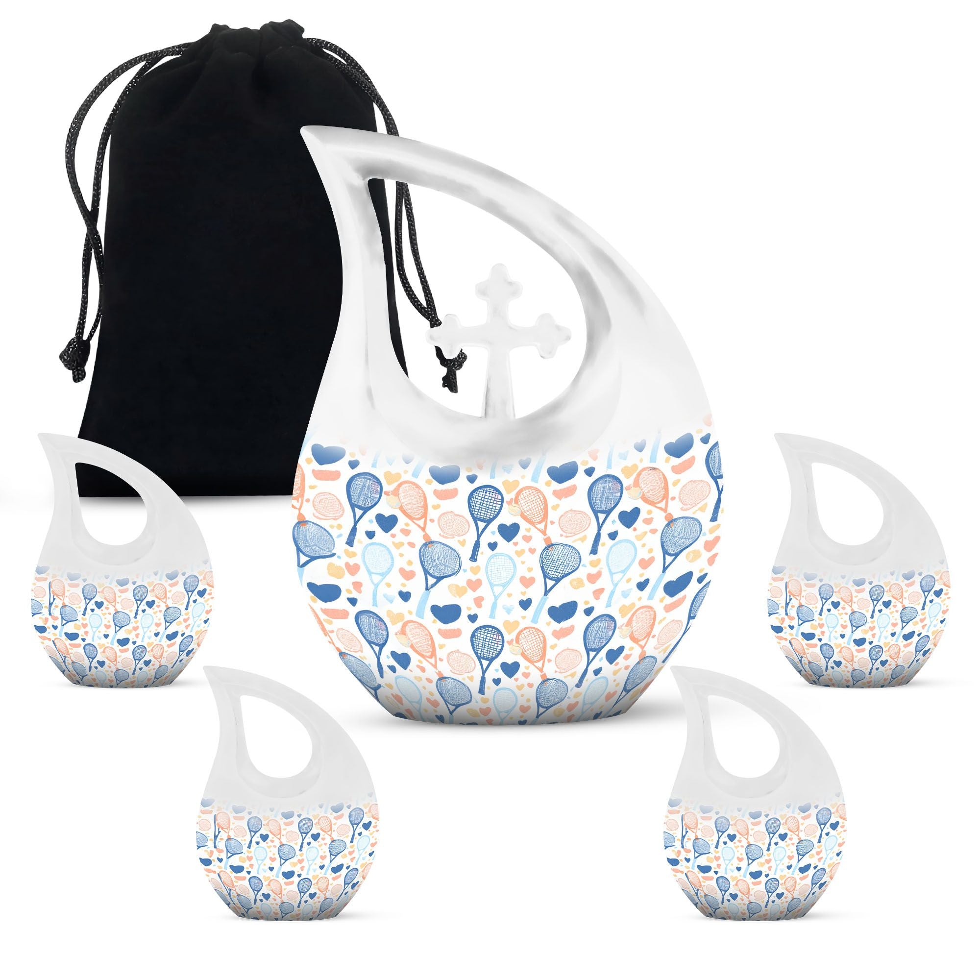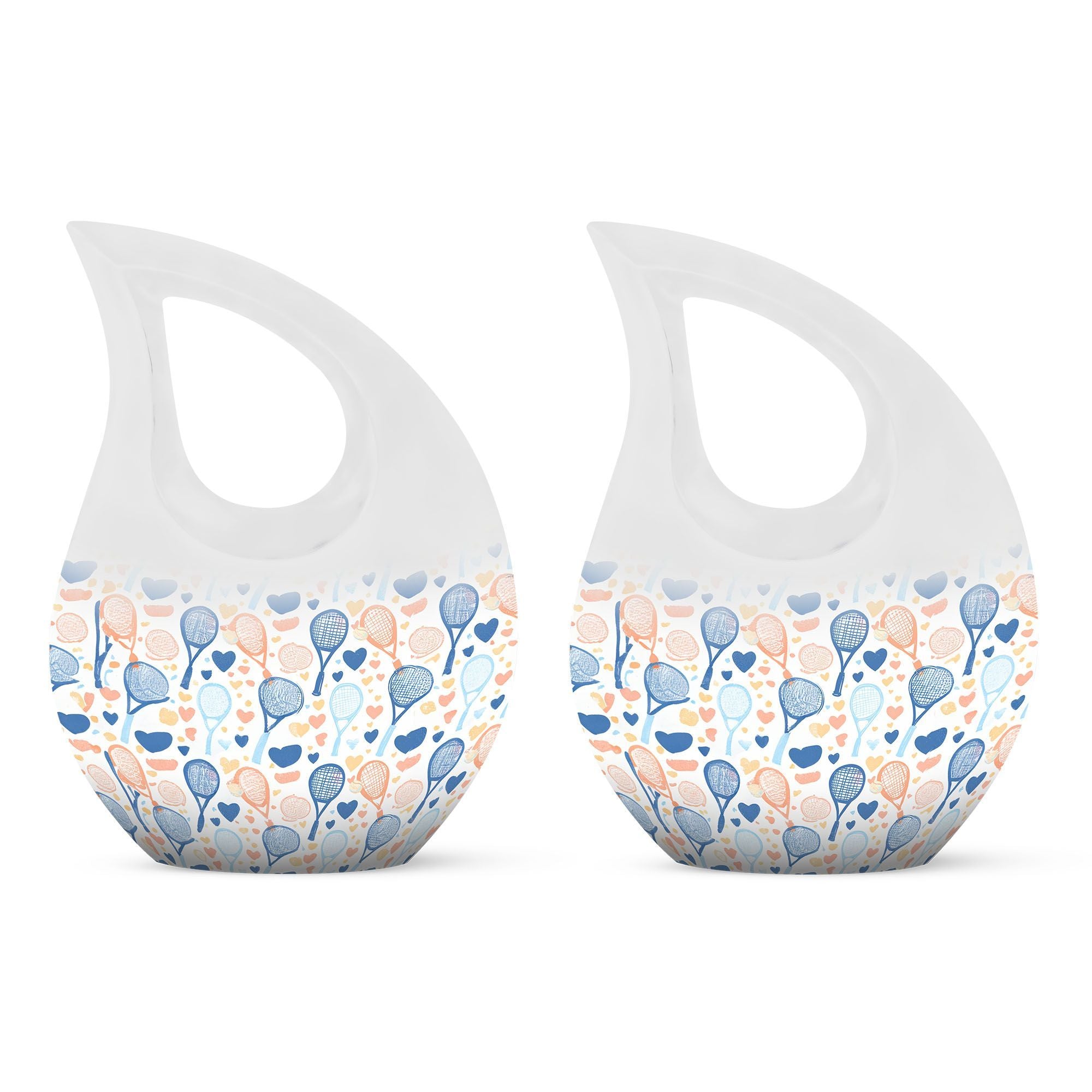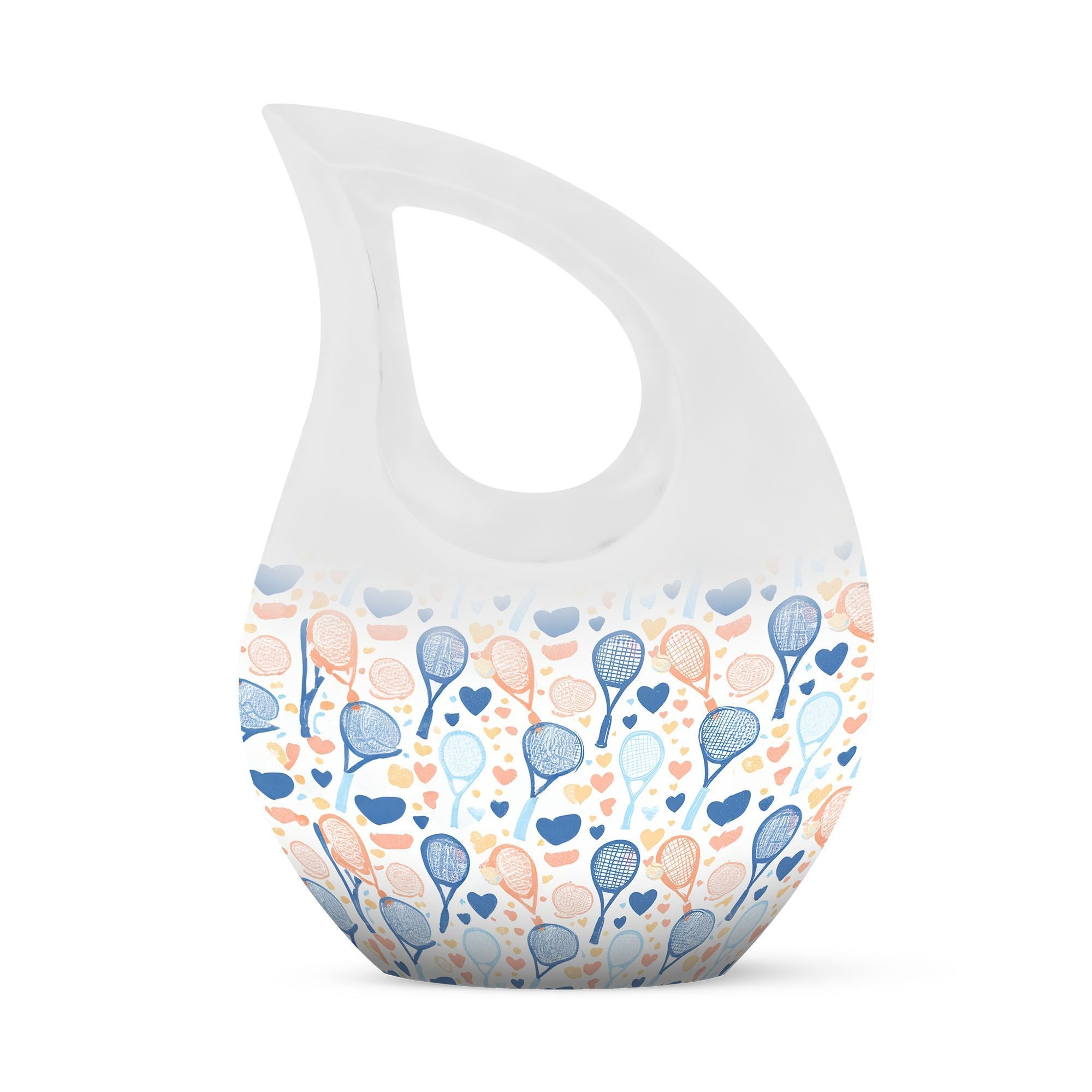 Celebrate and honor the memories of your loved ones with this thoughtfully curated Tennis Urn. Sized at a substantial 10 inches, this Memorial Urn for Ashes is large enough to hold up to 200 cubic inches of ashes. Crafted from high-quality, lightweight aluminum, it weighs a comfortable 3.3 pounds, easy to handle and transport. The urn features a beautifully conceived 'Cross Drop' theme, tying in closely with the sport of Tennis, making it an ideal tribute for enthusiasts or players of the game. The urn package includes a plush velvet pouch, offering a secure and dignified containment for the ashes. Personalization is also available, allowing you to engrave names that eternally embellish this resting place for your dear one. This urn seamlessly merges aesthetics with practicality, making it a fitting choice for memorials. Preferred search terminologies like Funeral Urns, Custom Urns for Ashes might lead you closer to this unique urn.