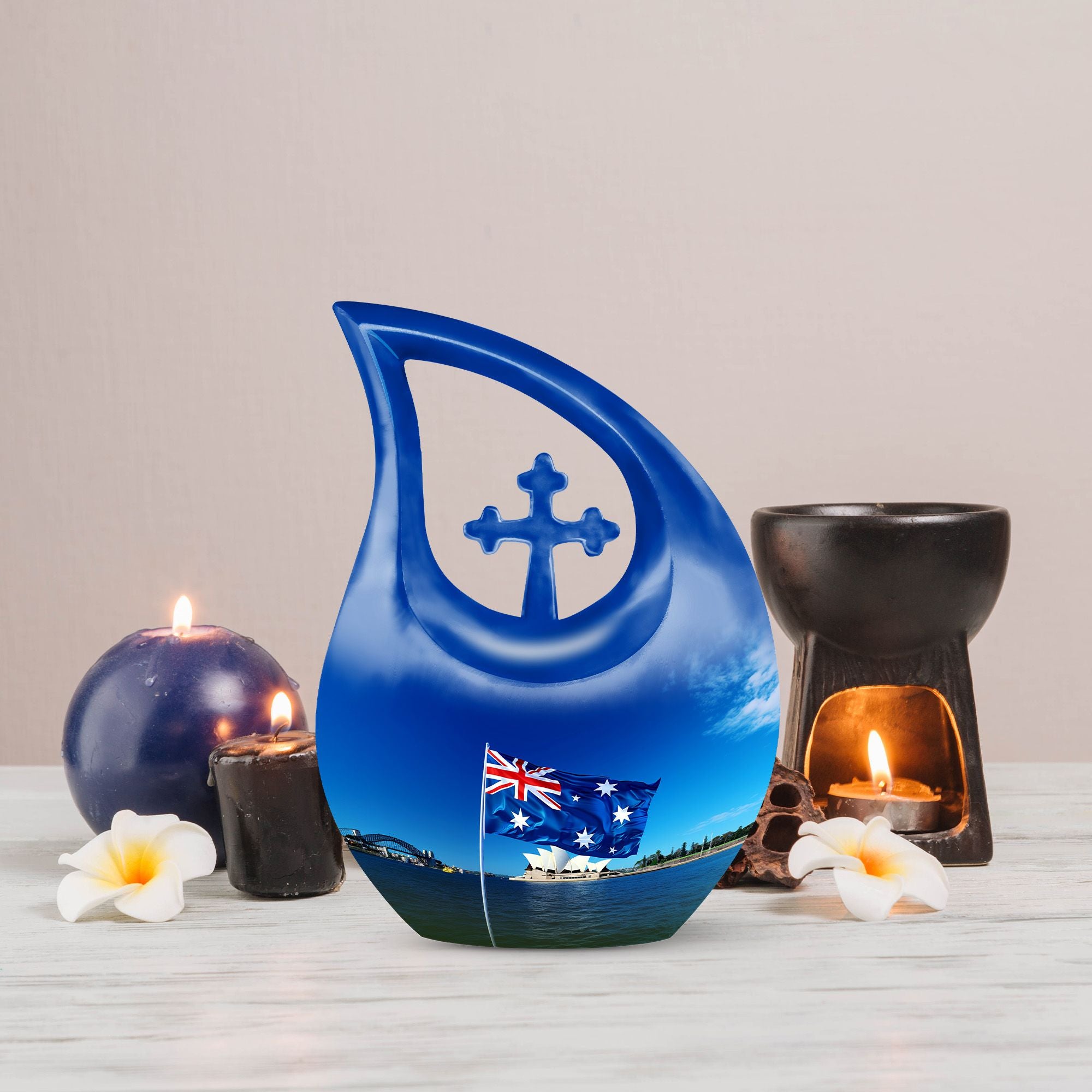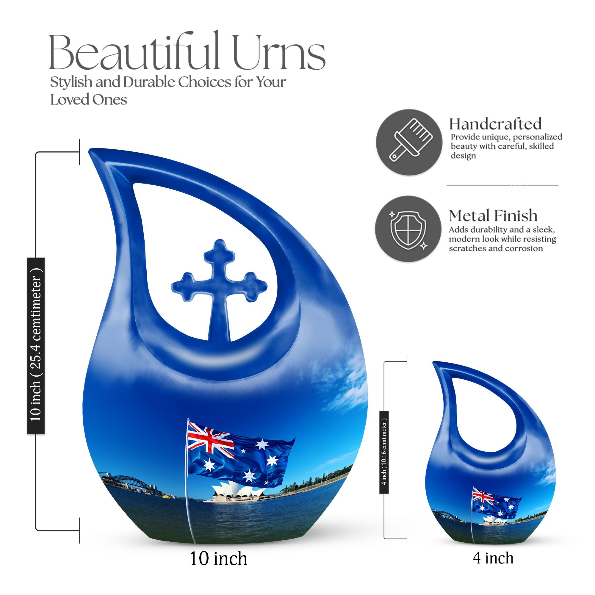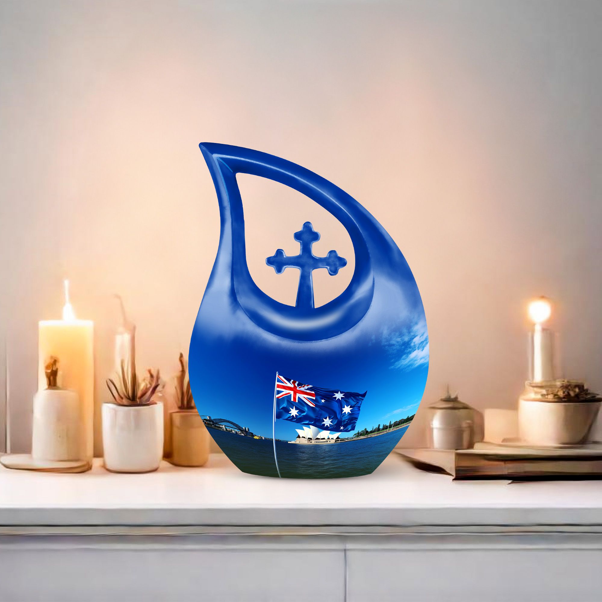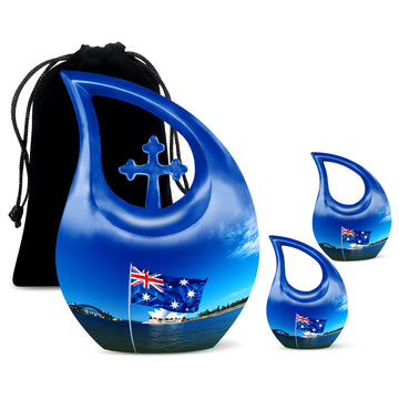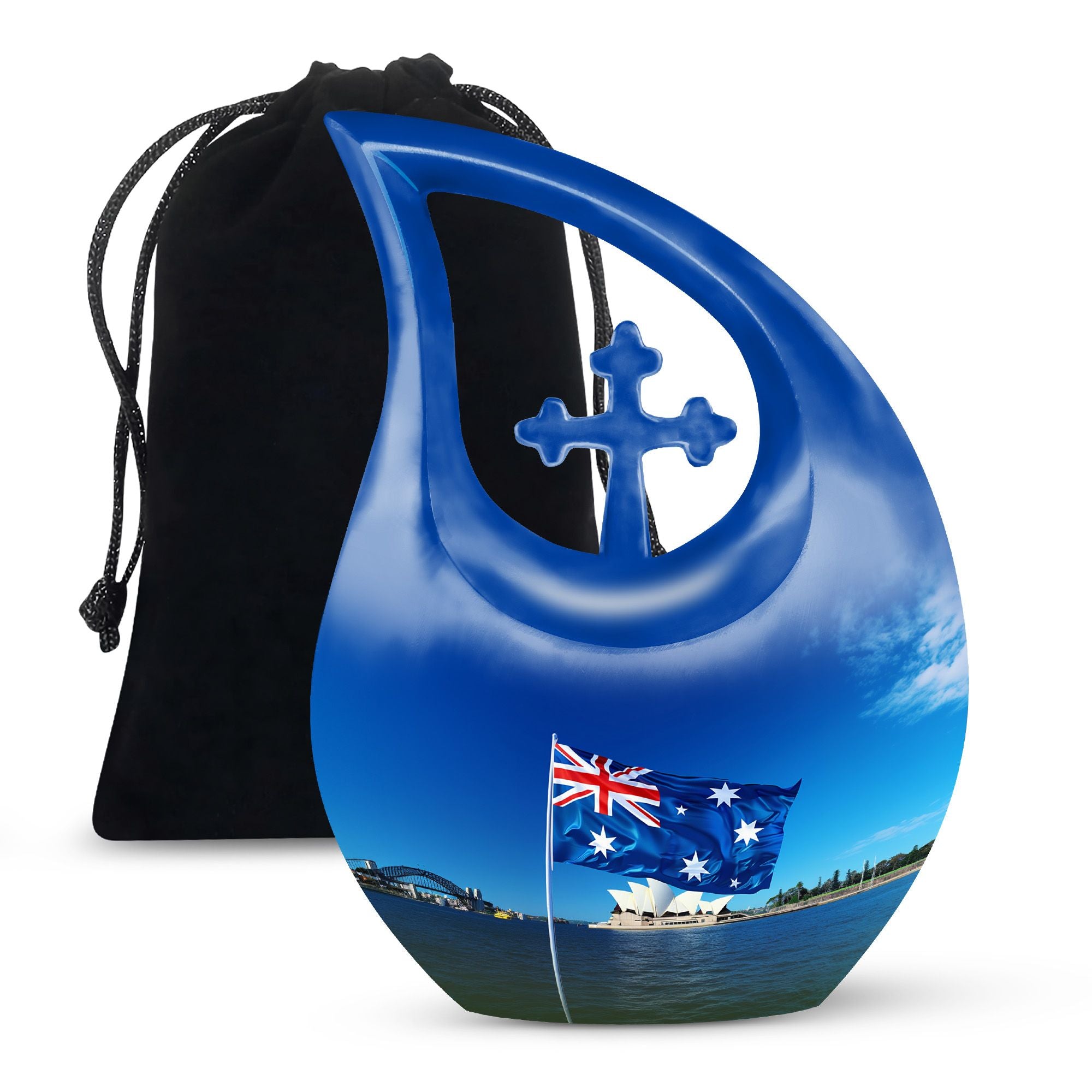 An exquisite tribute to your dearly departed loved ones, the Australian Flag Urn is a poignant, personal way to express your deep-felt reverence. Proudly showcasing the enduring 'Cross Drop' motif, this large 10-inch urn blends profound symbolism with the capacity to safely secure up to 200 cubic inches of precious ashes. For those seeking 'memorial urns' or 'mini urns for ashes,' the urn provides a lovely, intimate alternative. Cast from durable Aluminum, it weighs a respectable 3.3 pounds, ensuring stability and durability. Accented by the serene Australian Flag theme, the urn incorporates a heartfelt gesture of national pride. Enhancing the urn’s appeal is its personalization option, allowing you to engrave names, bestowing a deserving honor upon forgotten heroes. The urn is accessorized with a luxuriously soft velvet pouch, providing a discreet, dignified containment solution for the ashes. If you're pursuing options such as 'Little Urns For Ashes,' 'Urn Vaults,' 'Cheap Funeral Urns,' or 'Pretty Urns For Human Ashes,' consider this compelling choice.