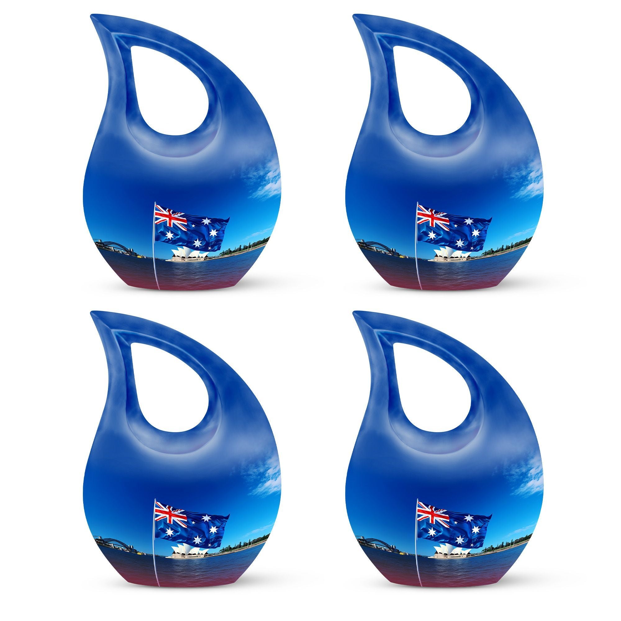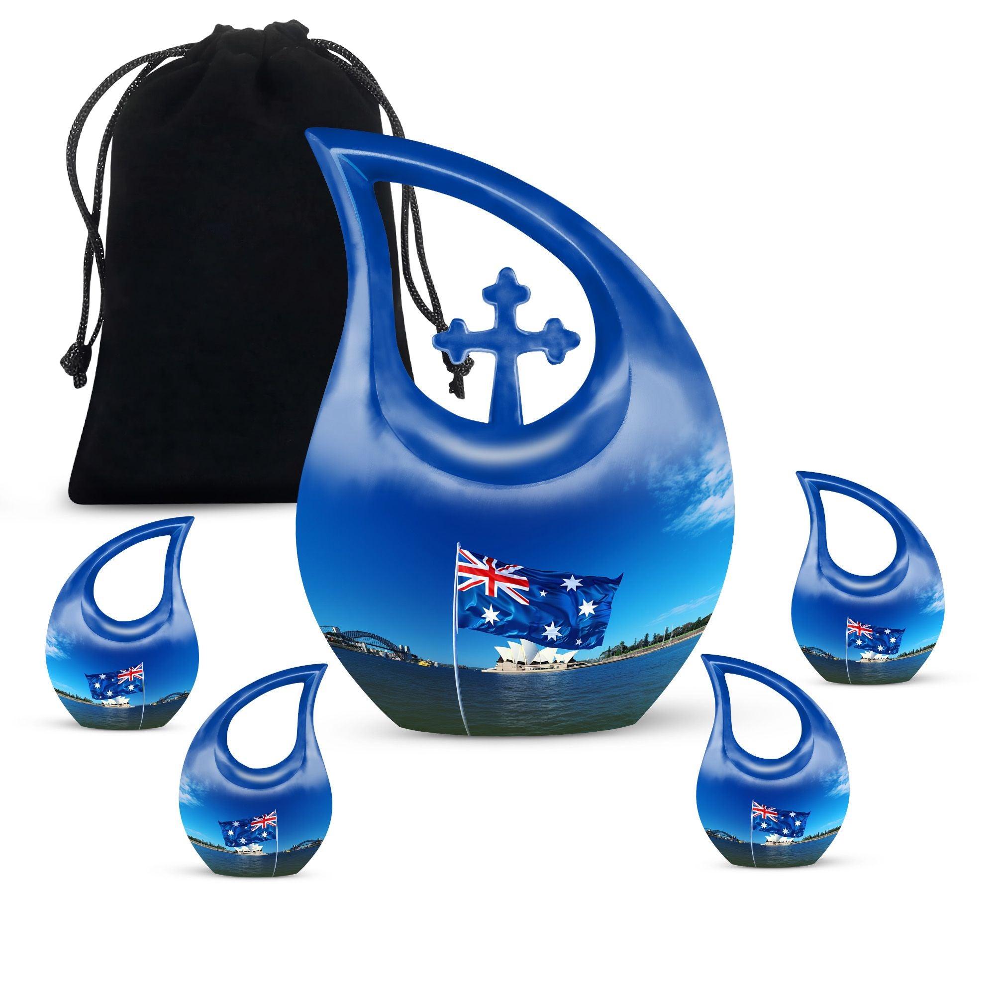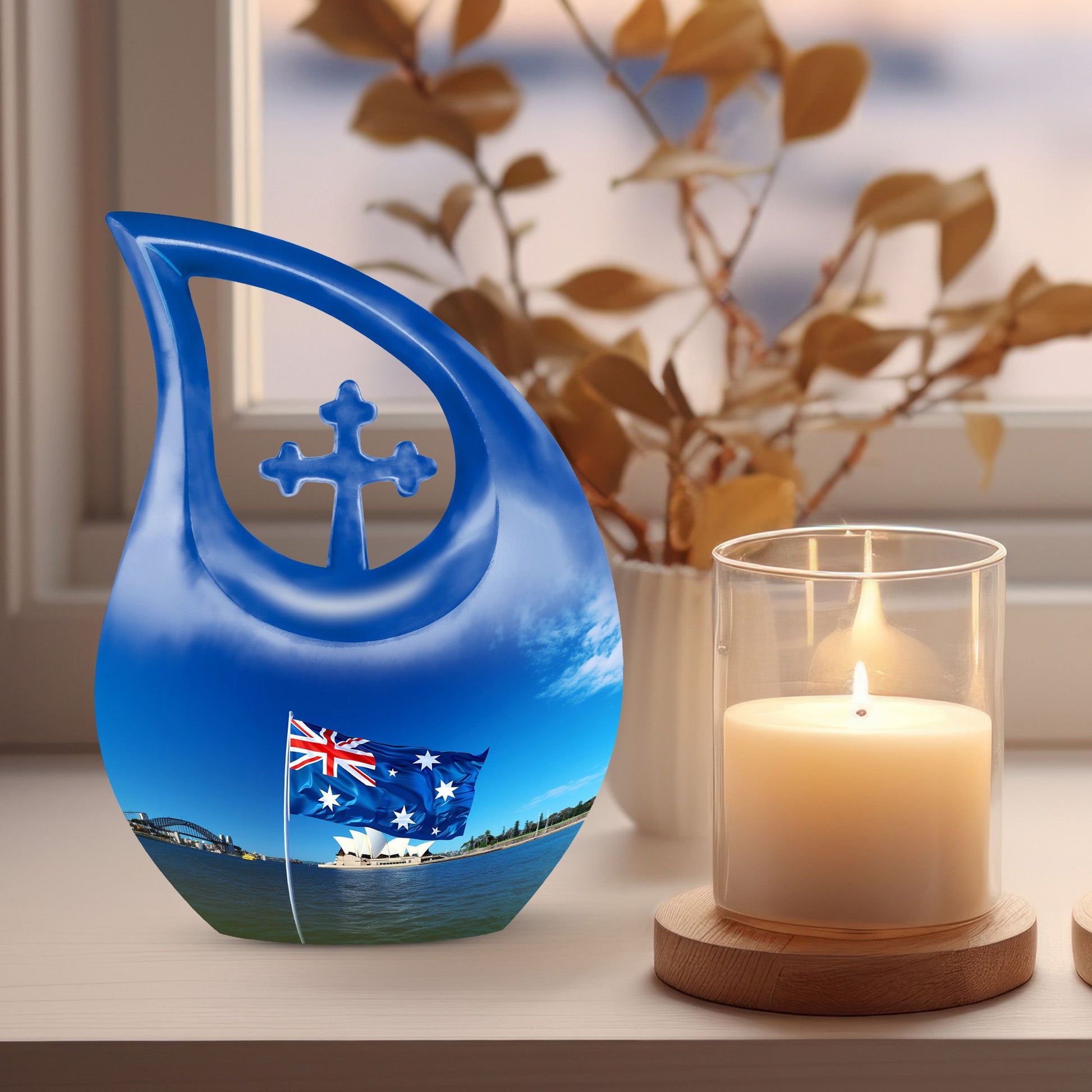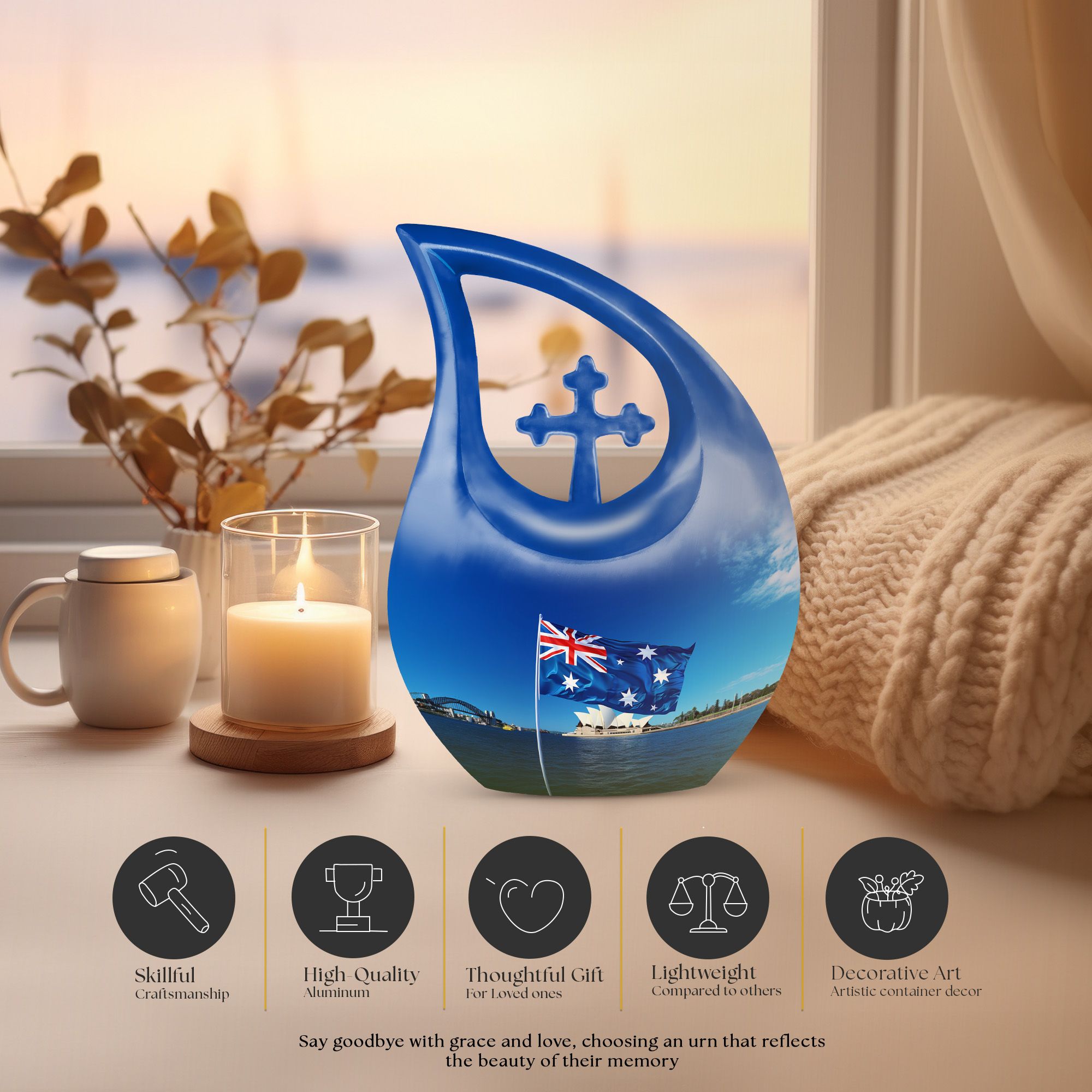 An exquisite tribute to your dearly departed loved ones, the Australian Flag Urn is a poignant, personal way to express your deep-felt reverence. Proudly showcasing the enduring 'Cross Drop' motif, this large 10-inch urn blends profound symbolism with the capacity to safely secure up to 200 cubic inches of precious ashes. For those seeking 'memorial urns' or 'mini urns for ashes,' the urn provides a lovely, intimate alternative. Cast from durable Aluminum, it weighs a respectable 3.3 pounds, ensuring stability and durability. Accented by the serene Australian Flag theme, the urn incorporates a heartfelt gesture of national pride. Enhancing the urn’s appeal is its personalization option, allowing you to engrave names, bestowing a deserving honor upon forgotten heroes. The urn is accessorized with a luxuriously soft velvet pouch, providing a discreet, dignified containment solution for the ashes. If you're pursuing options such as 'Little Urns For Ashes,' 'Urn Vaults,' 'Cheap Funeral Urns,' or 'Pretty Urns For Human Ashes,' consider this compelling choice.