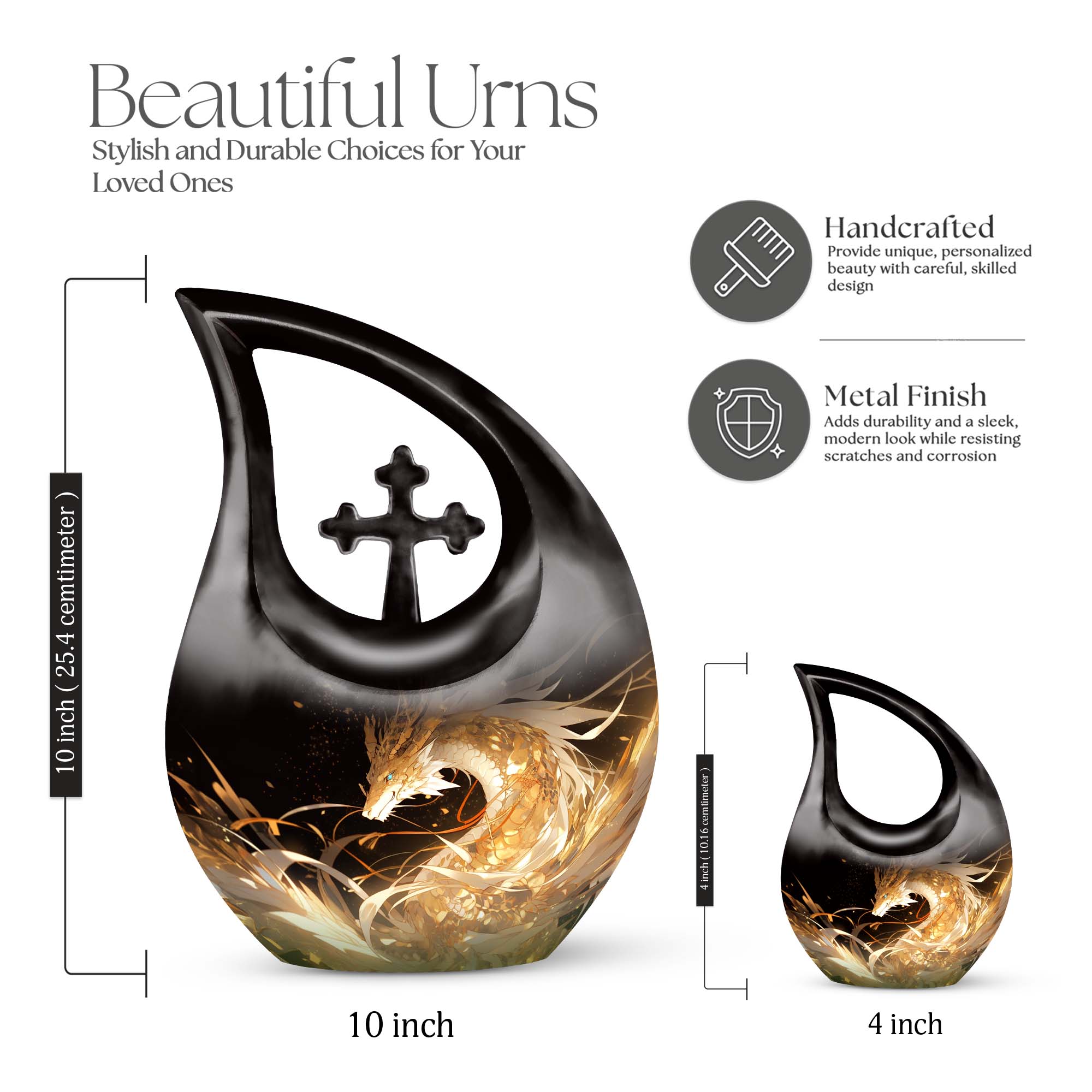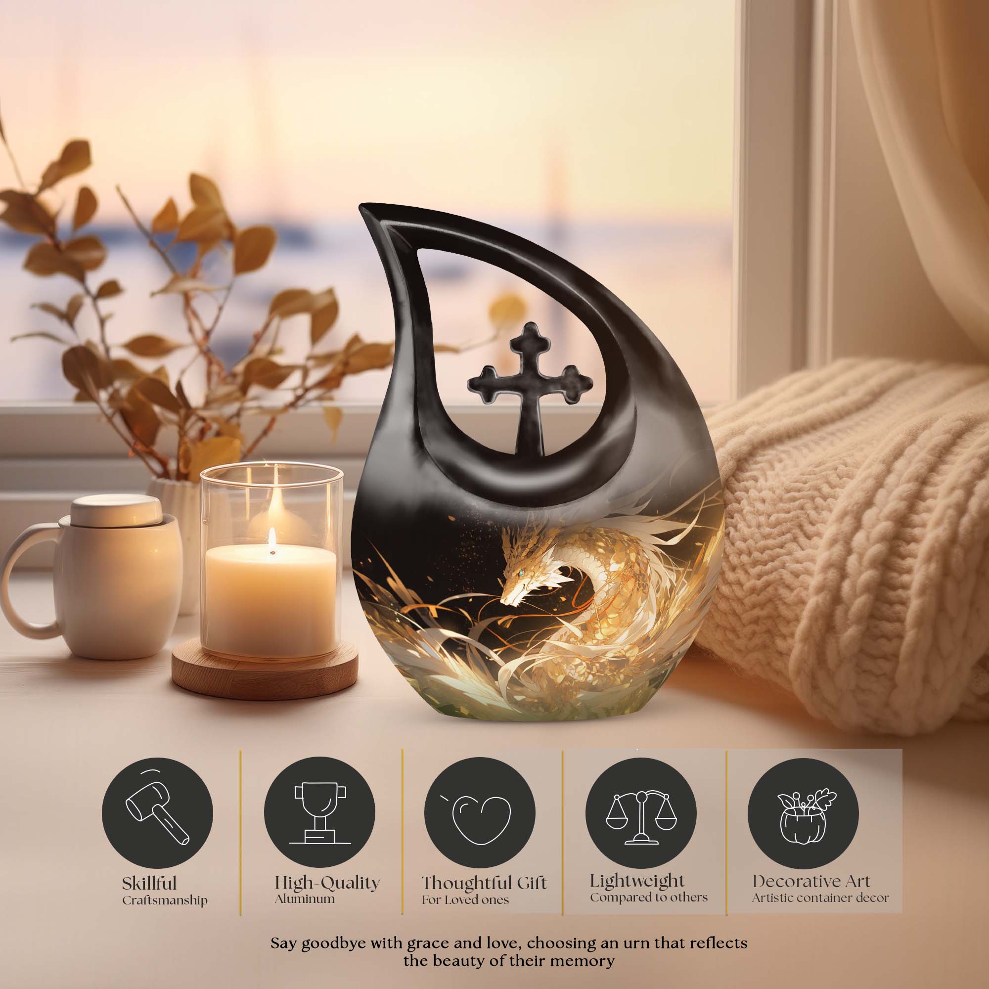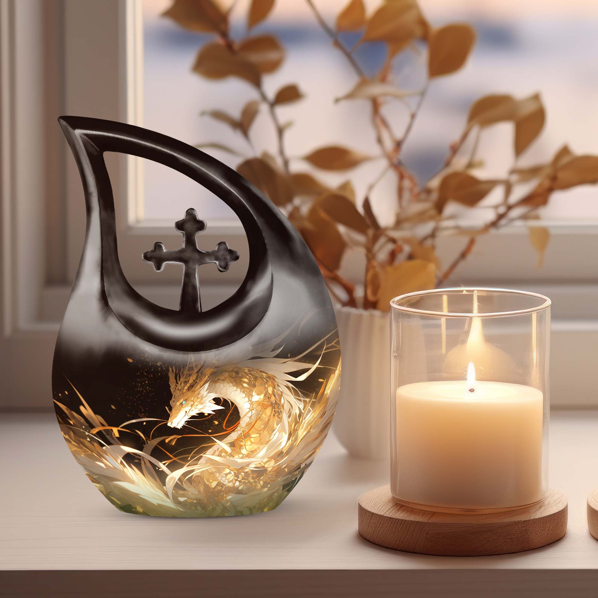 The Golden Dragon Urn offers a striking and heartfelt tribute for honoring a cherished life. With its radiant gold finish and fierce fire-dragon artwork, this urn symbolizes strength, protection, and eternal remembrance—making it a meaningful option for families seeking funeral urns for women, funeral urns for men, or a unisex memorial filled with dignity.