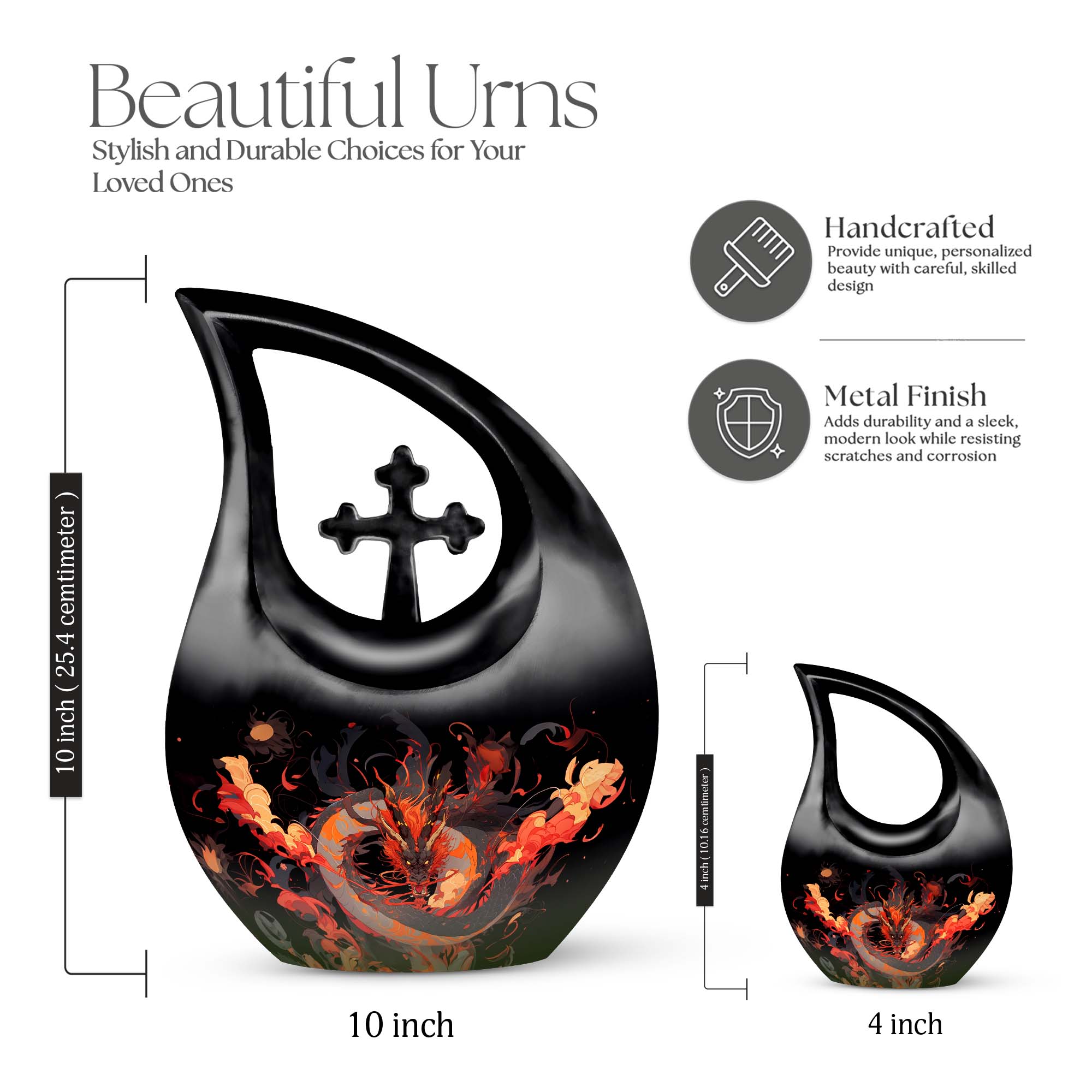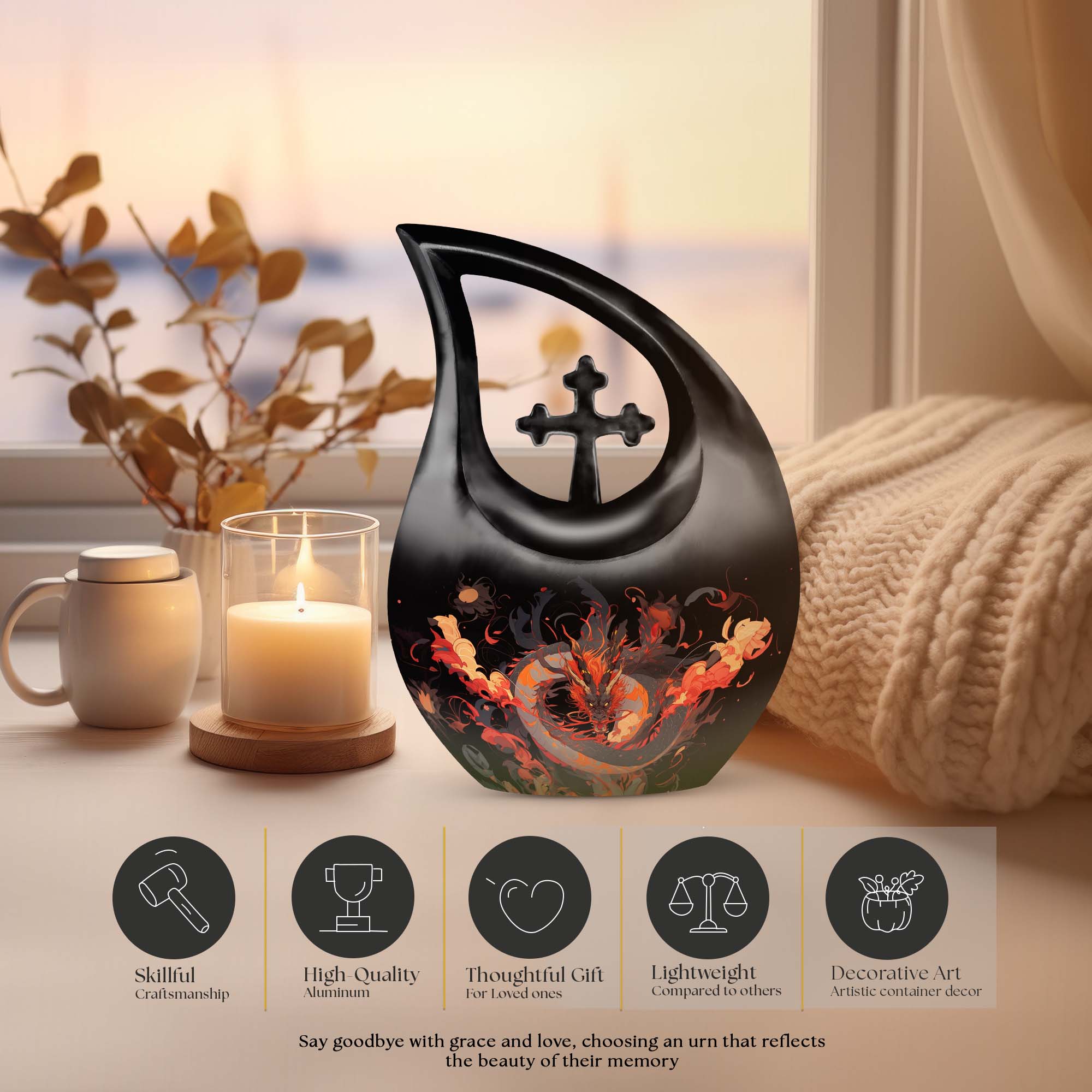 Expertly crafted from durable aluminum, this urn features a radiant fire-themed dragon motif that stands beautifully in any memorial setting. Its secure screw-top lid ensures complete protection for urns for human ashes adult male burial, urns for human ashes adult male dad, and small urns for human ashes adult female. This design supports both display and burial, making it a versatile option for families honoring a loved one with dignity and care.