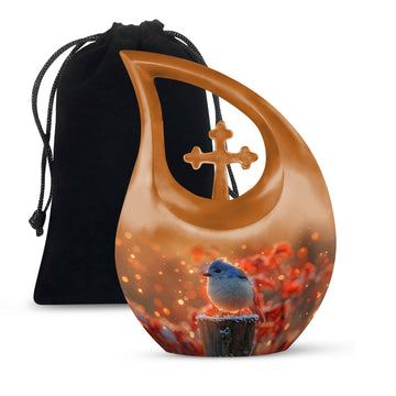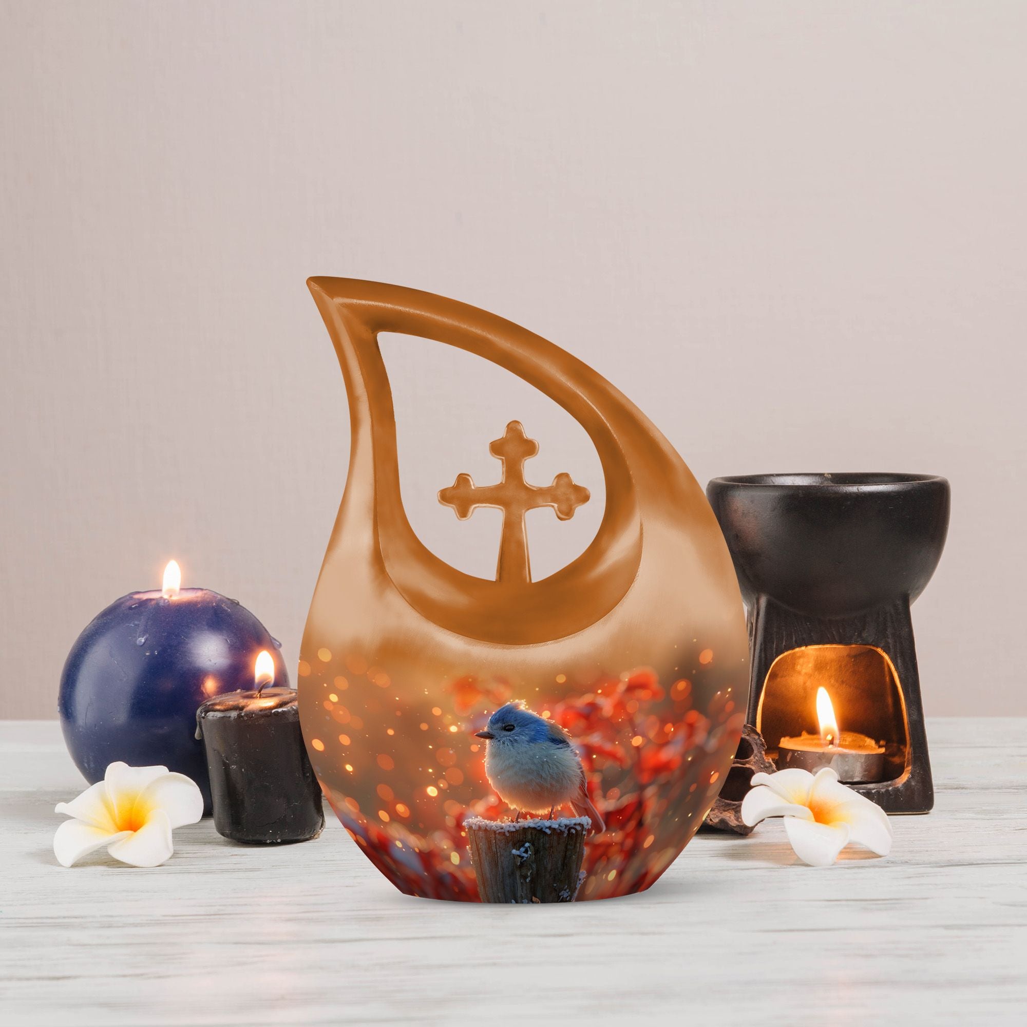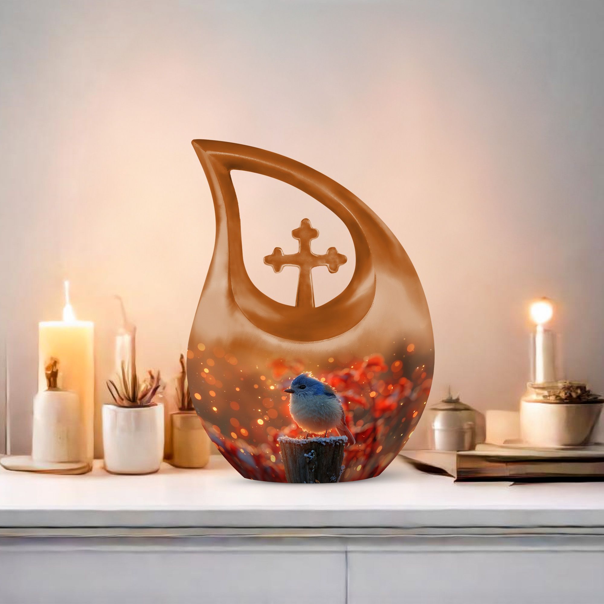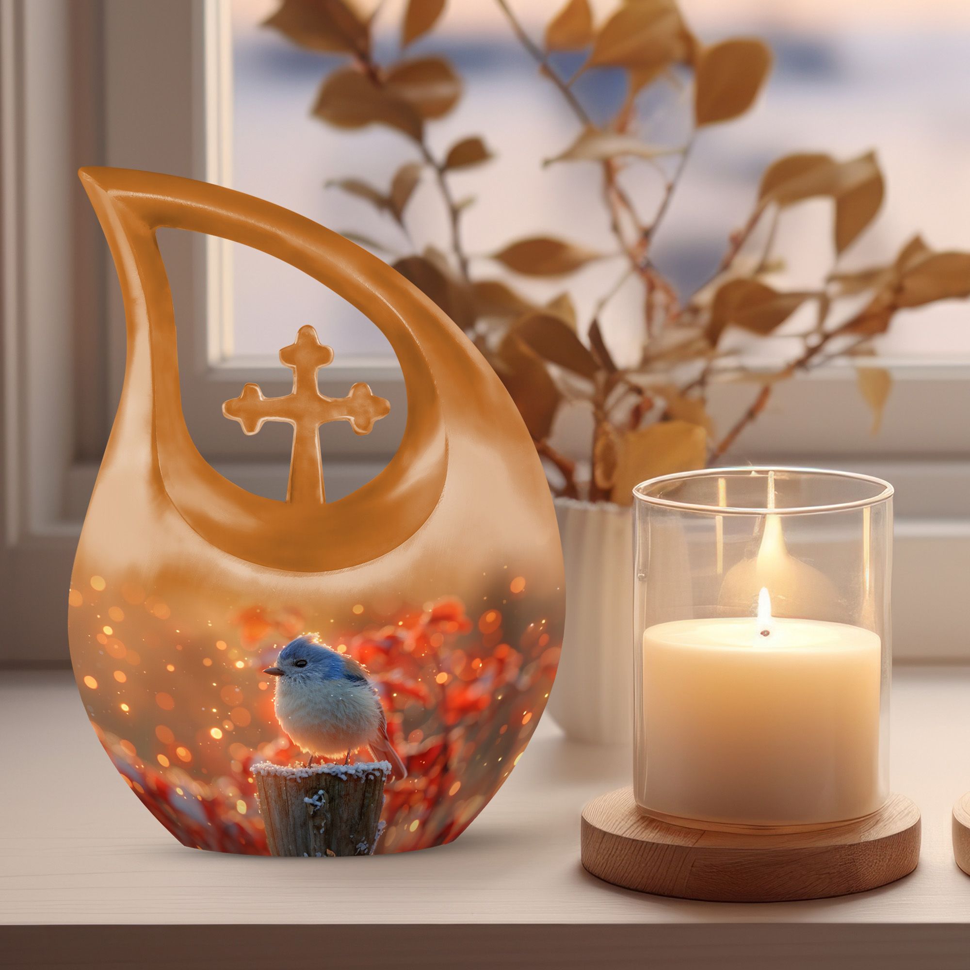 This urn serves as a compassionate option for those wanting bright, symbolic cremation urns adult women or coordinating styles with cremation urn for ashes small keepsakes. Its uplifting design offers a comforting reminder that love continues, carrying the spirit onward like a bluebird in flight.