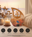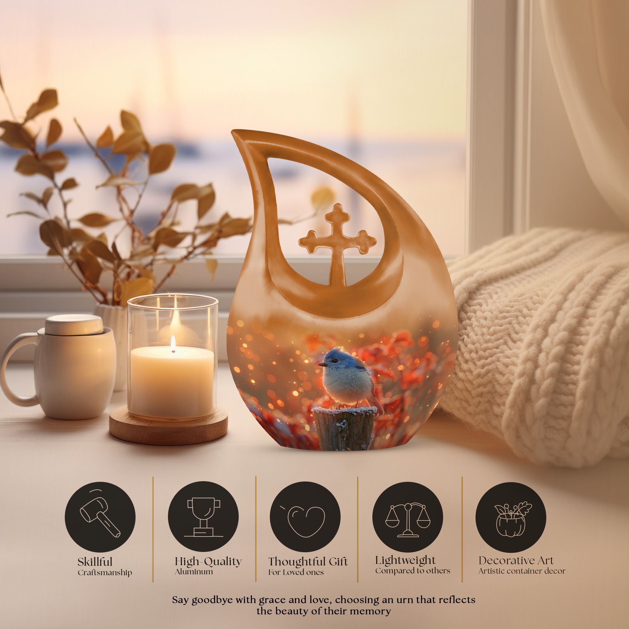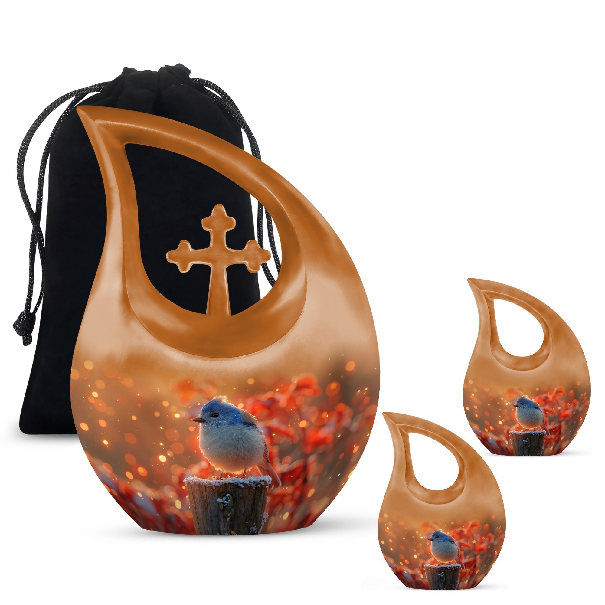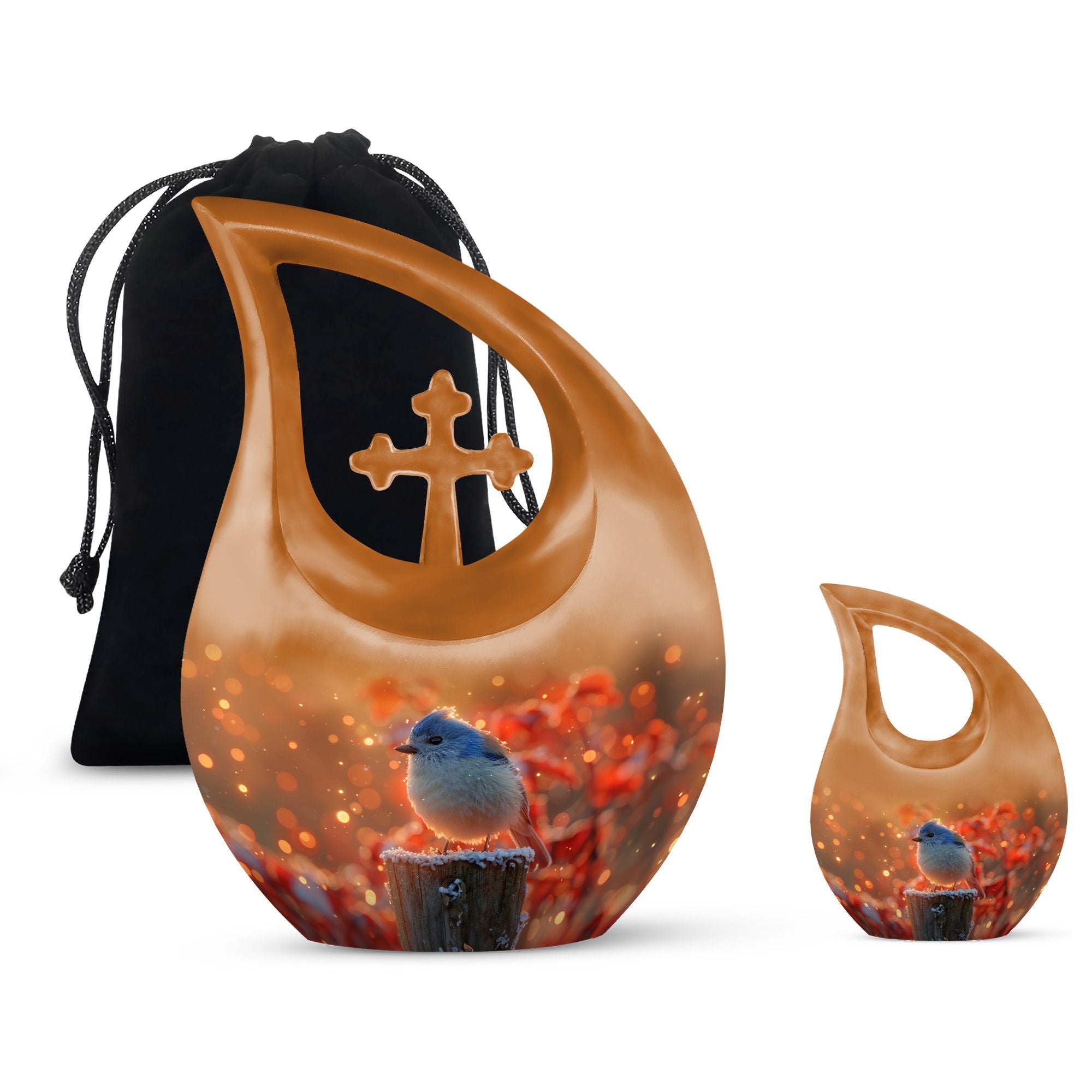 This urn serves as a compassionate option for those wanting bright, symbolic cremation urns adult women or coordinating styles with cremation urn for ashes small keepsakes. Its uplifting design offers a comforting reminder that love continues, carrying the spirit onward like a bluebird in flight.