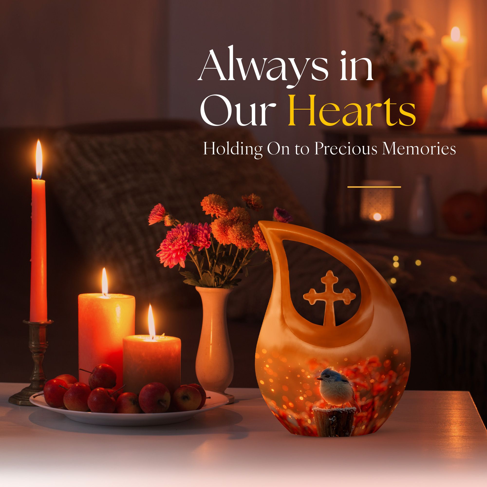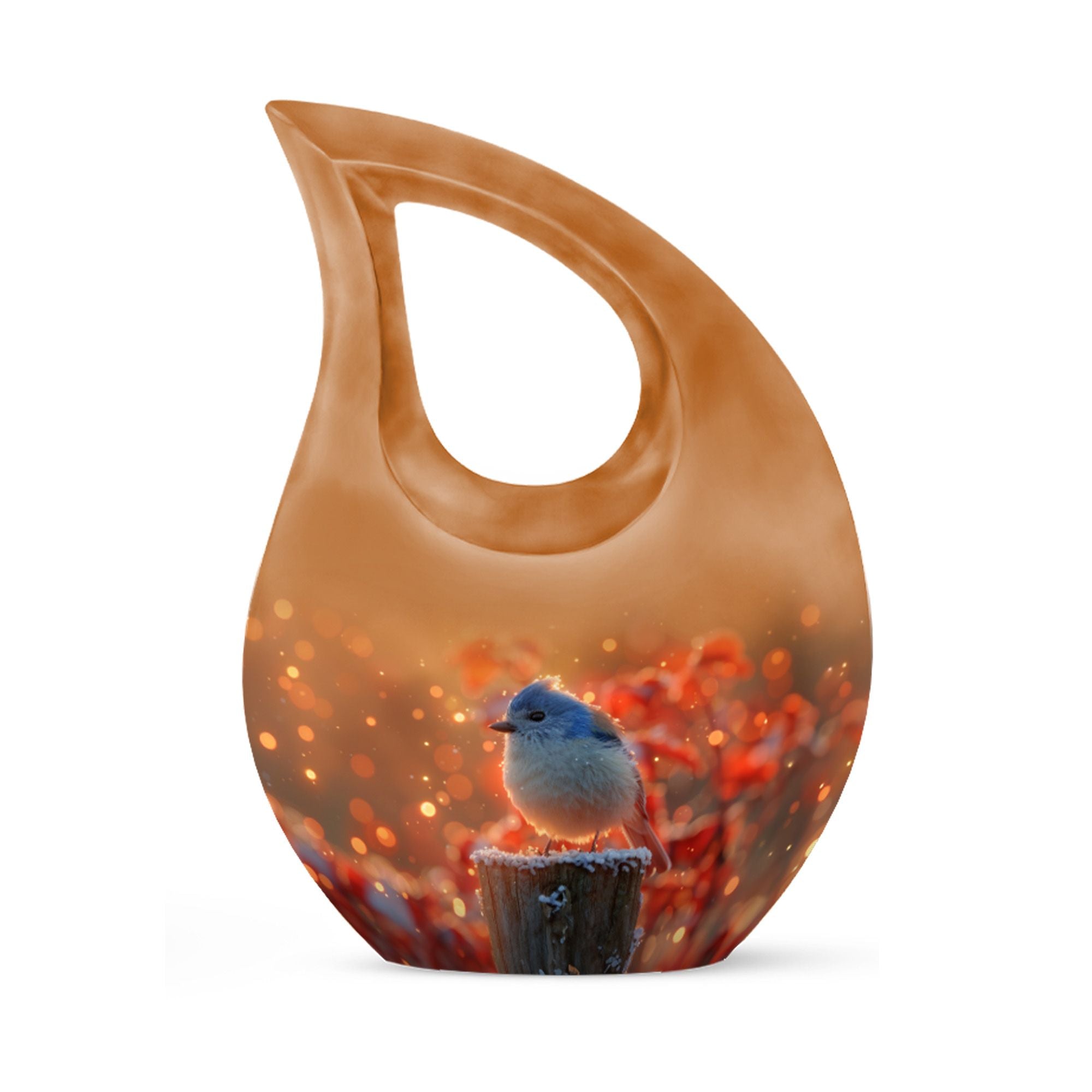 This Bluebird Themed Urn for Funeral brings comfort, warmth, and a gentle sense of hope to any memorial space. Crafted to honor a cherished life with grace, this cremation urn for humans provides a heartfelt place of rest. Its vivid orange color and peaceful bluebird motif make it a meaningful choice for families seeking a symbolic urn adult cremation or a bright, uplifting tribute.