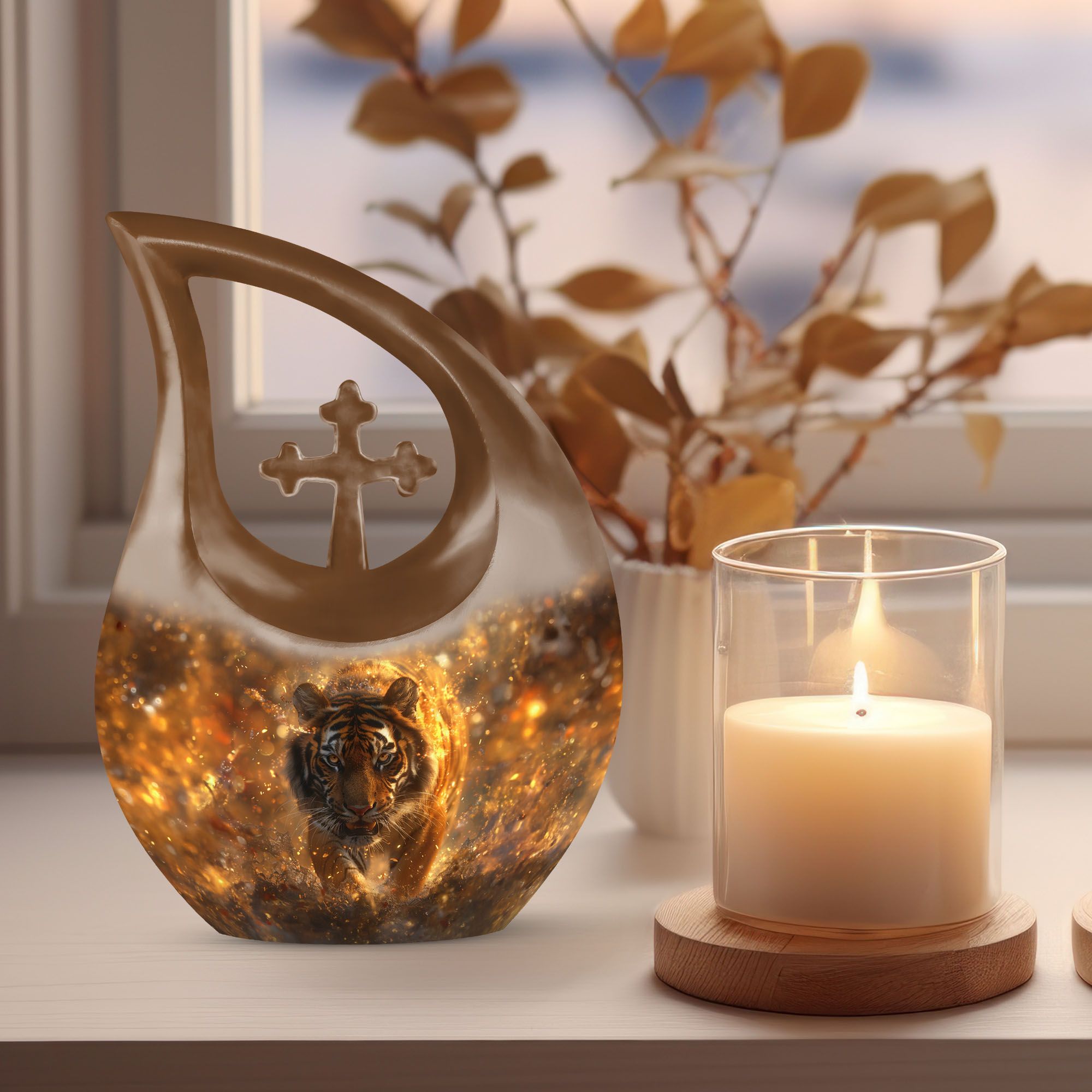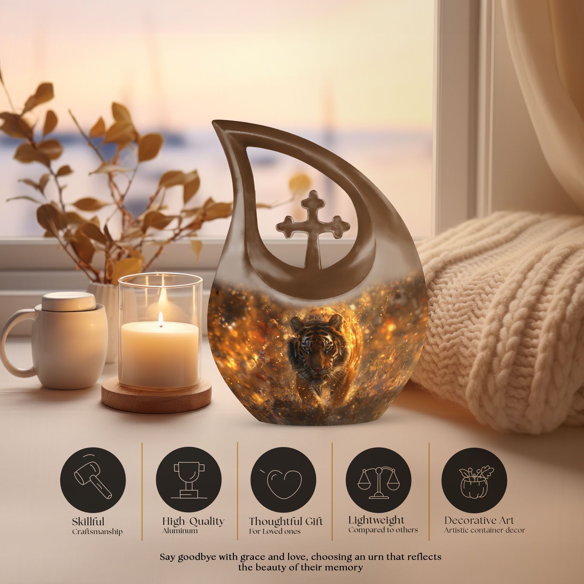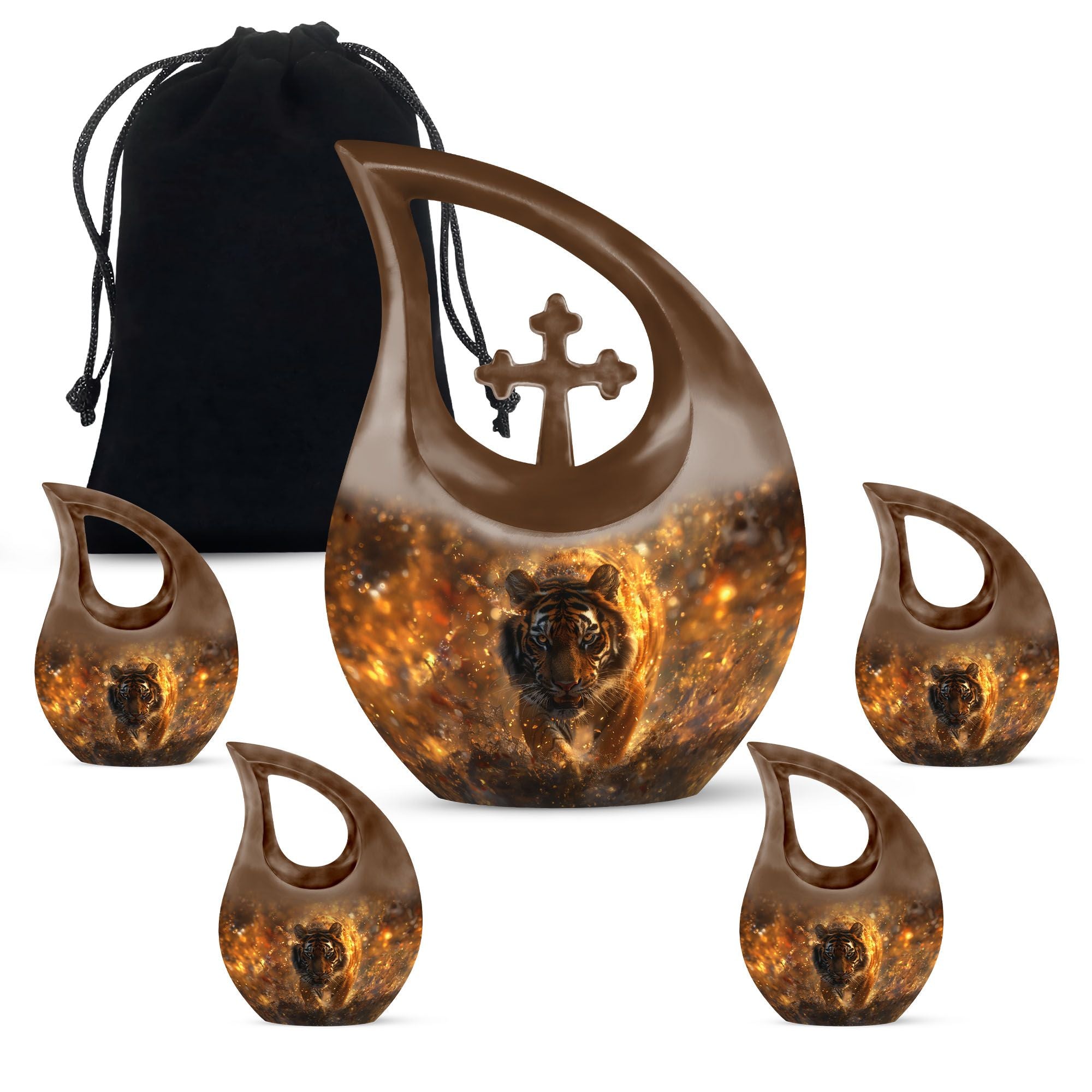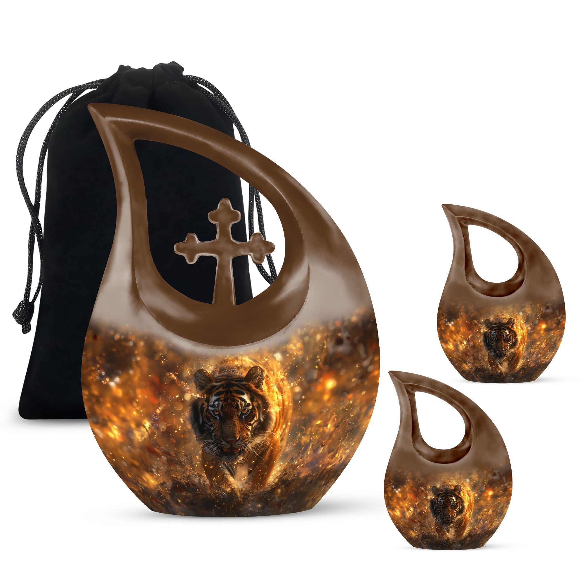 Capture the essence of a beloved one with our stunning Tiger Urn, an exquisite piece of craftsmanship made of durable aluminium. It comes in an impressive size of 10 inches and has an overall weight of 3.3 lbs, making it a noticeable tribute to your loved one. This unique cremation box boasts an admirable cross drop theme, symbolizing eternal peace. With a capacity of 200 cubic inches, it can hold ashes securely, bringing comfort during times of bereavement. Our Tiger Urn is not just beautiful, but practical too. Each purchase comes with a soft velvet pouch, ensuring safe containment of the ashes. Generously catered for personal touch, this magnificent Tiger Urn allows you to personalize it with engraved names, making each urn as unique as the person it commemorates. This precious item falls under the category of large urns and is a perfect match for adults and seniors looking for memorial urns with a dash of uniqueness. It is certainly a fitting choice for those seeking something beyond the regular cremation boxes for adults.