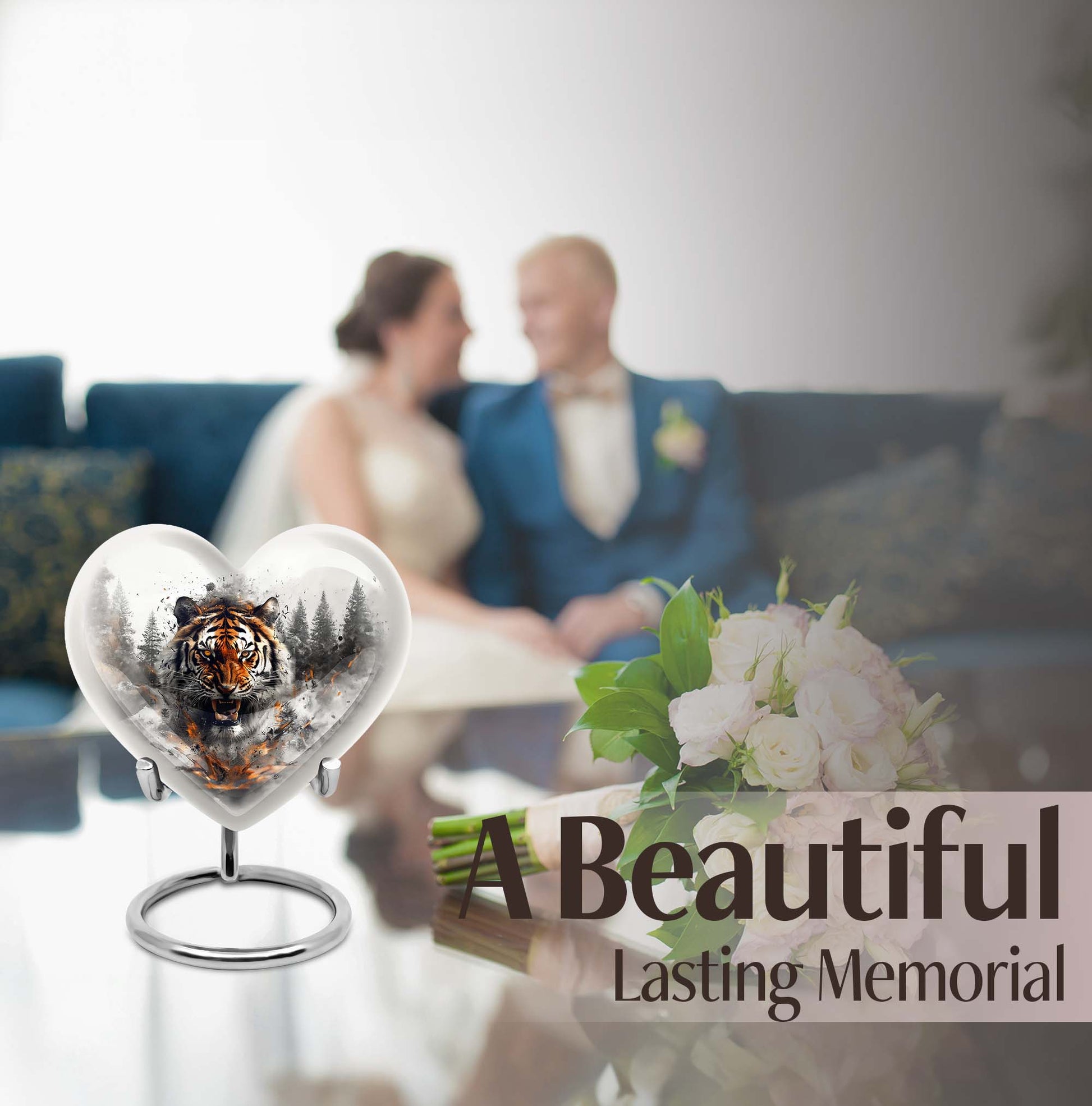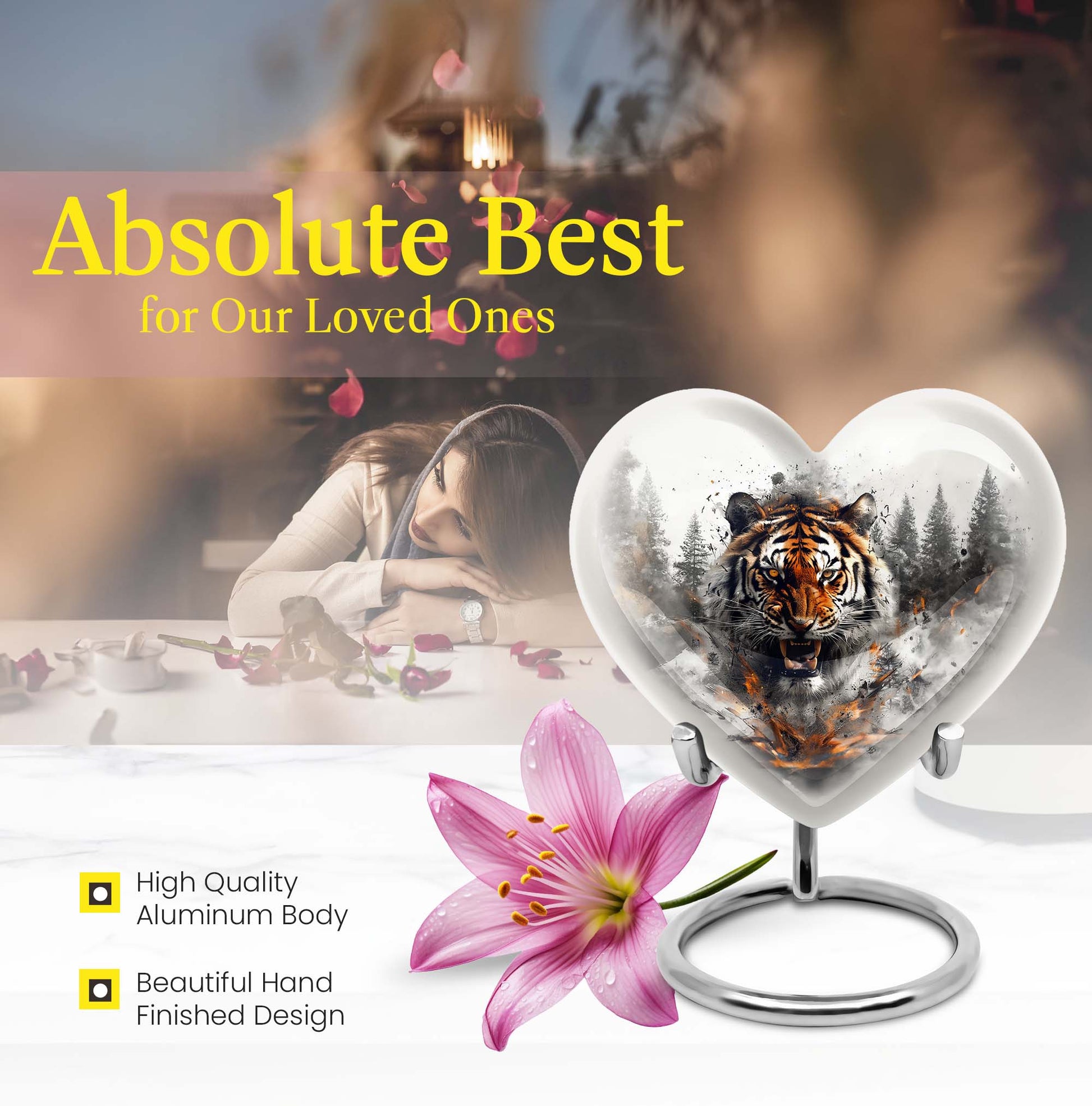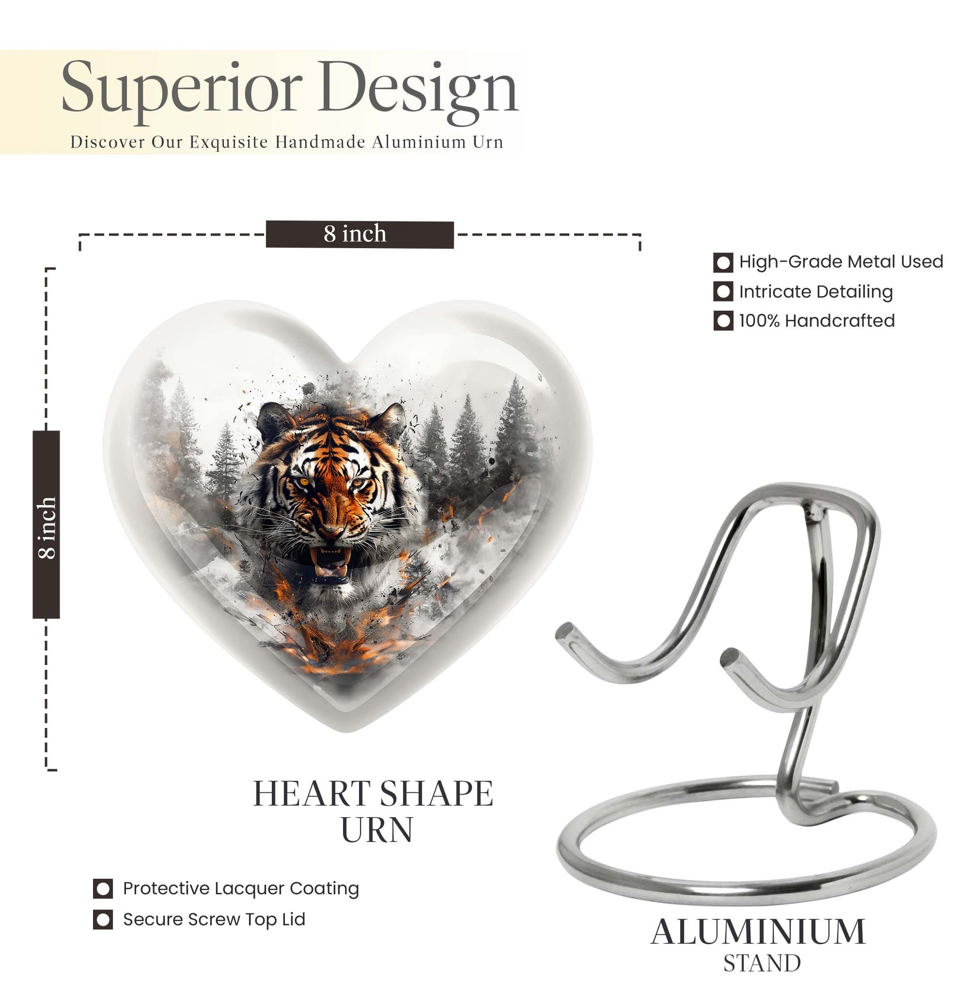 Experience the serenity and peace of this remarkable 10-Inch Tiger Urn, an elegant resting place for your loved ones. This cremation urn has a unique Heart Urn design, beautifully adorned with a floral theme, emanating a sense of tranquility and comfort. Crafted meticulously from high-grade Aluminium that is durable and sophisticated, this funeral urn has the capacity to contain 200 cubic inches of ashes, ensuring your dear one gets a fitting space. With a weight of 3.3 pounds and a height of 10 inches, this Large Urn is an appropriate size for a dignified tribute. The urn comes packed in a soft velvet pouch, providing safety and respect for the cremation ashes. Personalize it with engraved names for a thoughtful touch. This urn is ideal for adult man or female use. The Tiger Urn, one of our Innovative Modern Urns for Human Ashes, embodies our commitment to offering respectful, high-quality urns for cremation ashes.