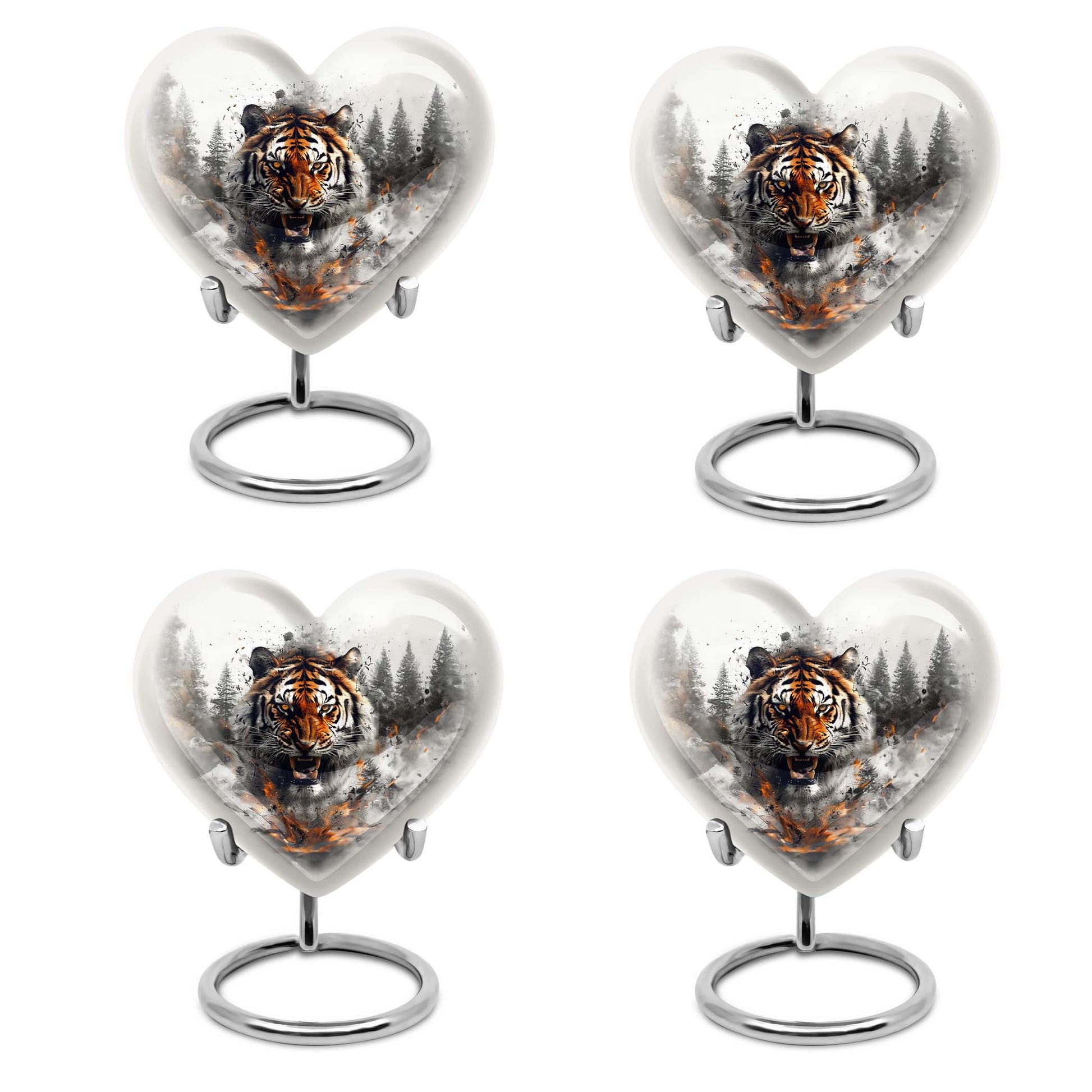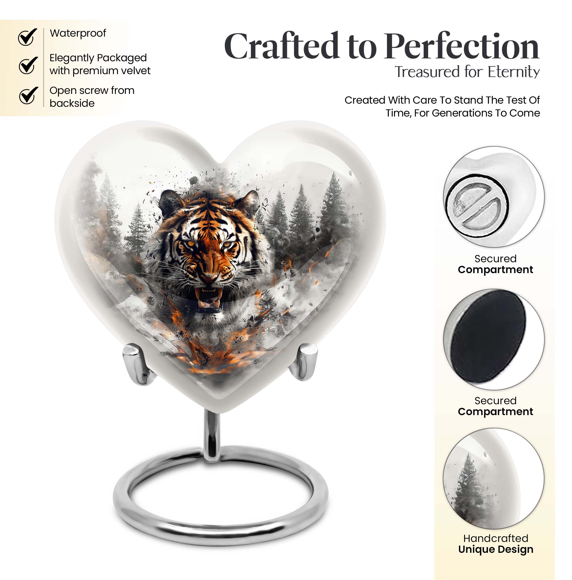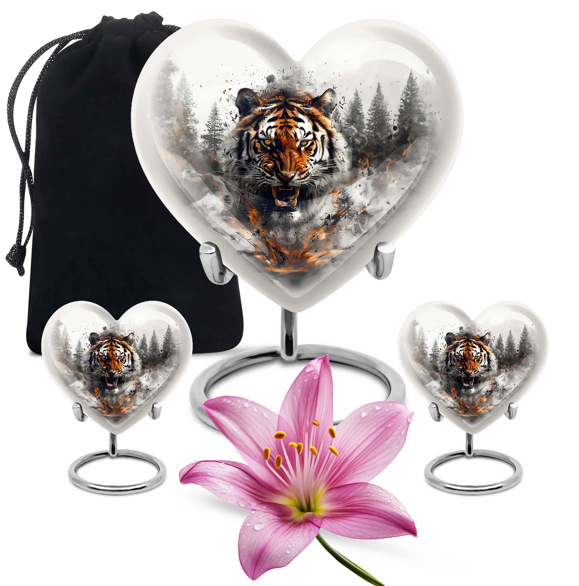 Experience the serenity and peace of this remarkable 10-Inch Tiger Urn, an elegant resting place for your loved ones. This cremation urn has a unique Heart Urn design, beautifully adorned with a floral theme, emanating a sense of tranquility and comfort. Crafted meticulously from high-grade Aluminium that is durable and sophisticated, this funeral urn has the capacity to contain 200 cubic inches of ashes, ensuring your dear one gets a fitting space. With a weight of 3.3 pounds and a height of 10 inches, this Large Urn is an appropriate size for a dignified tribute. The urn comes packed in a soft velvet pouch, providing safety and respect for the cremation ashes. Personalize it with engraved names for a thoughtful touch. This urn is ideal for adult man or female use. The Tiger Urn, one of our Innovative Modern Urns for Human Ashes, embodies our commitment to offering respectful, high-quality urns for cremation ashes.