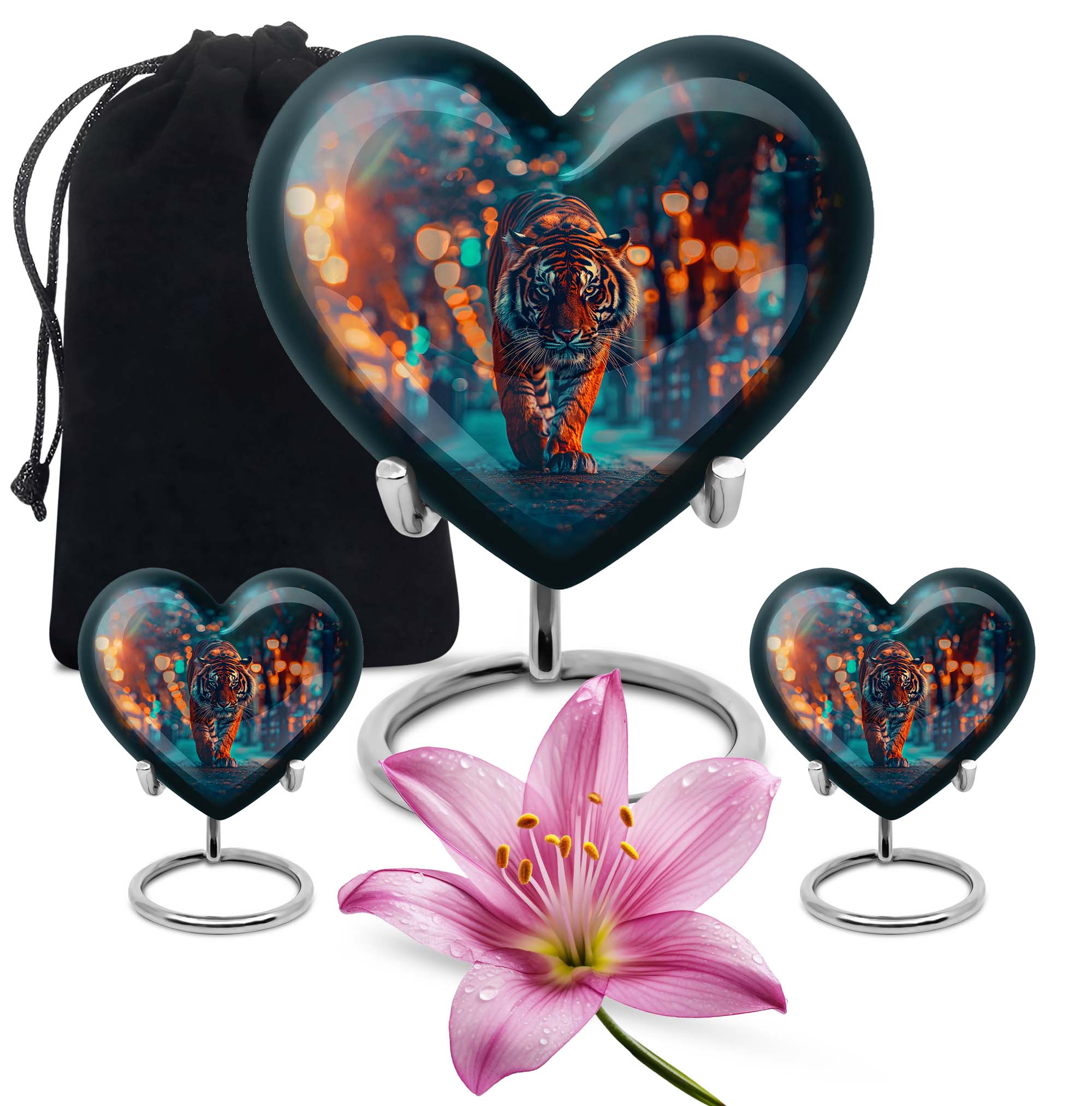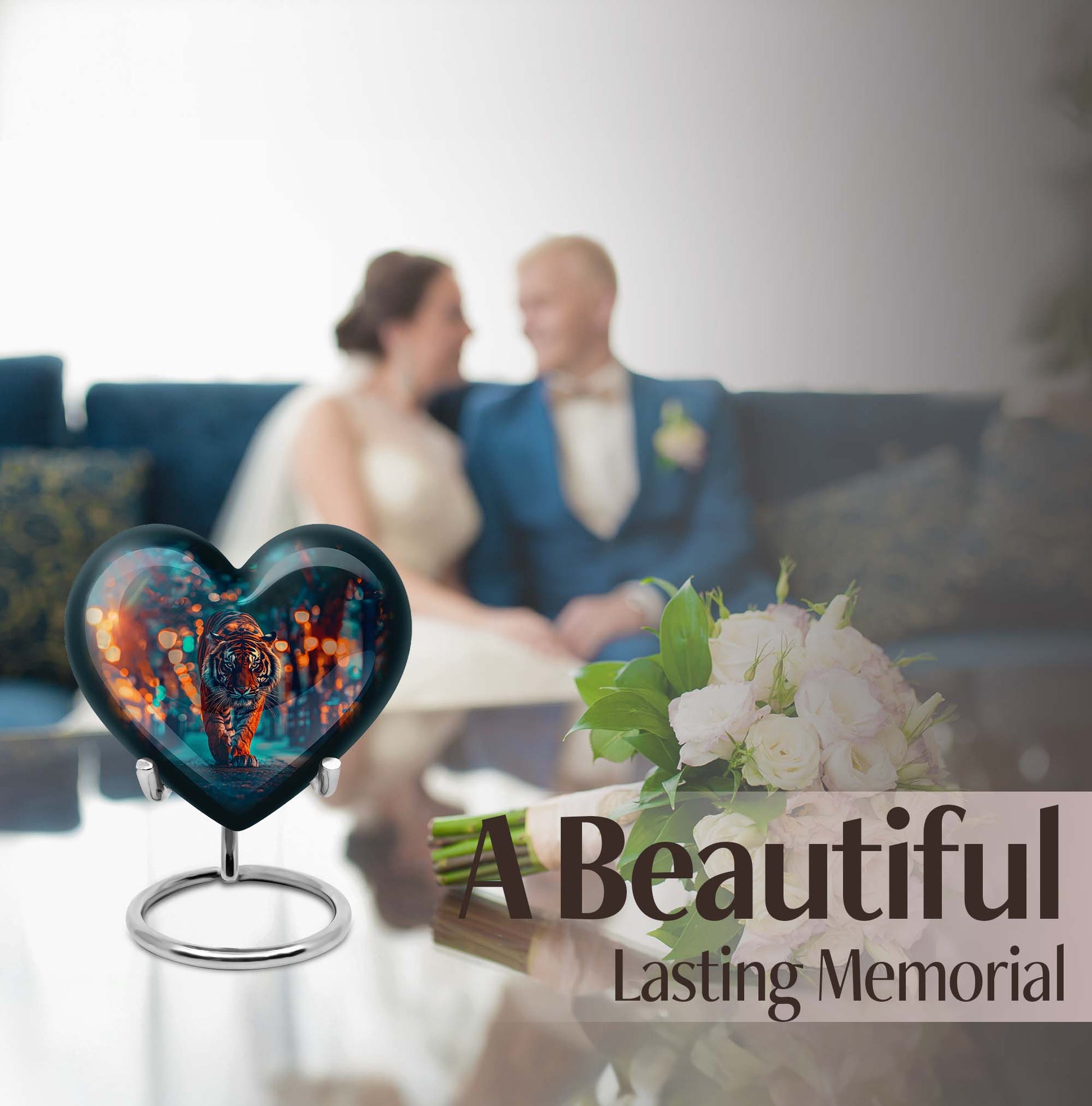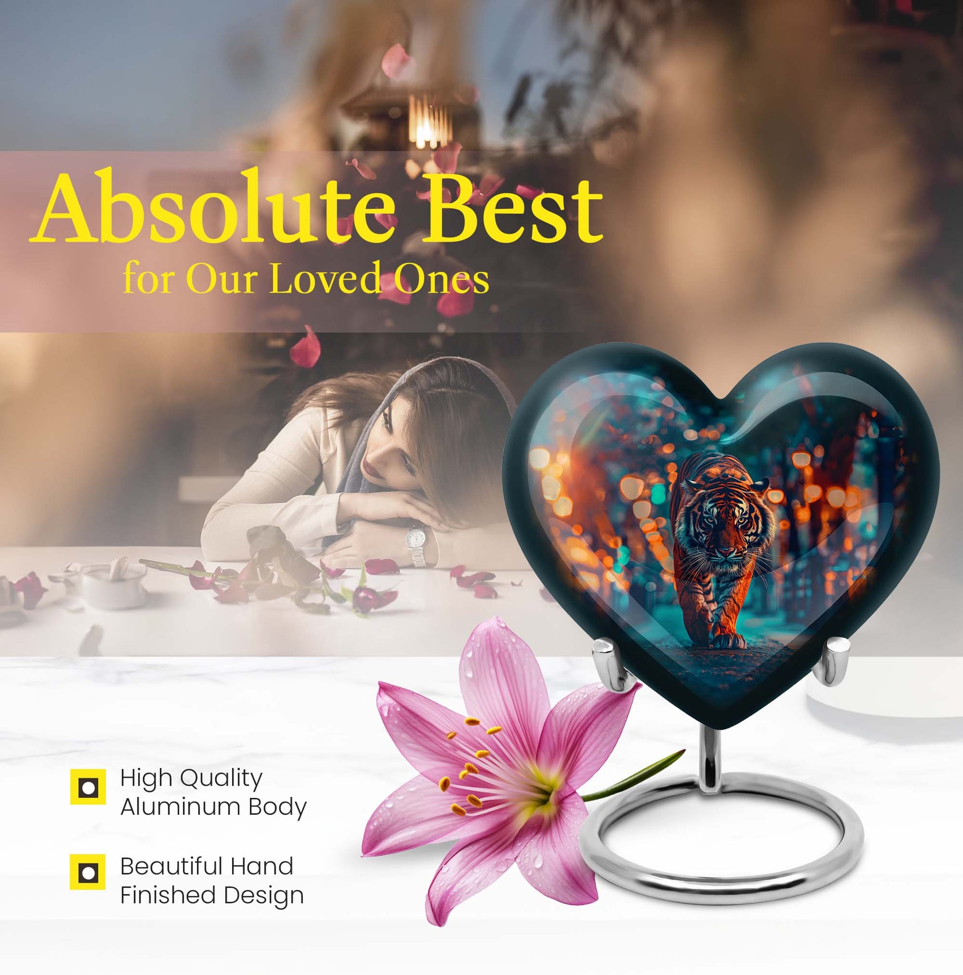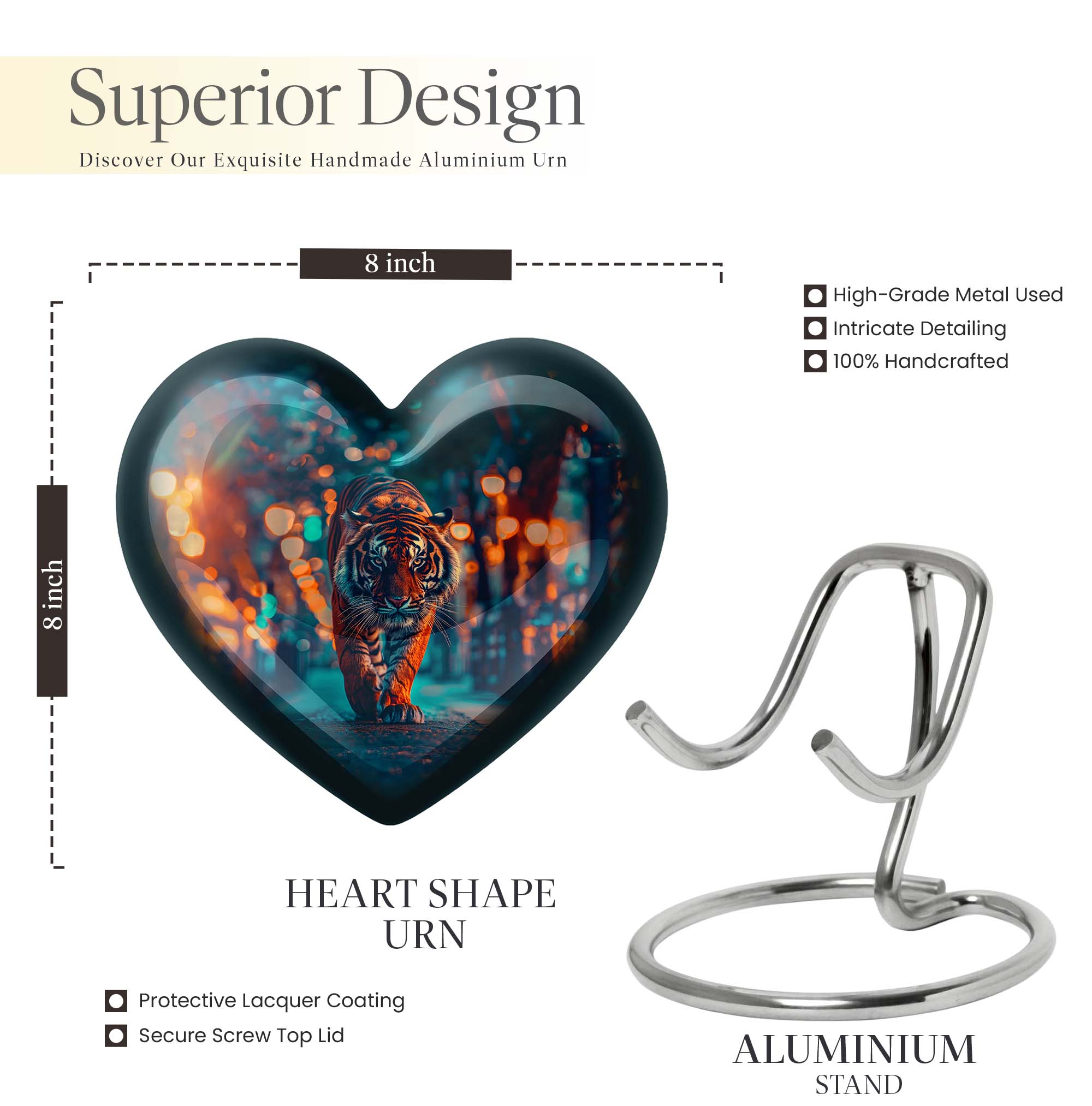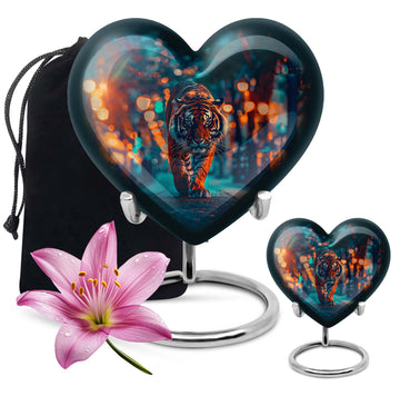 Honor those who have passed, holding their memories close to your heart, with our elegant 'Heart Urn'. Specially designed for cremation, it is a captivating combination of craftsmanship and sentiment that offers a final resting place worthy of your loved one. Fashioned from quality, robust aluminium, our large 10-Inch urn weighs 3.3 pounds and has the capacity to hold up to 200 cubic inches of cremated remains. Each tiger urn comes with a velvet pouch for containment of ashes, invoking an aura of dignity and respect. Personalization is available via engraved names, adding a touch of individuality to each tribute. Our heart urn beautifully captures the essence of the dearly departed with a floral theme, effortlessly merging aesthetics with sentiment. Perfectly suitable as a funeral urn for ashes for women, or as an urn for an adult male, it is a fitting tribute to the memories you hold dear. With its distinct theme and craftsmanship, our urn transcends the standard 'box' or 'burial' urns commonly associated with memorial supplies, commanding not just respect but admiration. Allow us to help create a lasting tribute to the life well-lived with our Heart Urn.