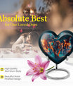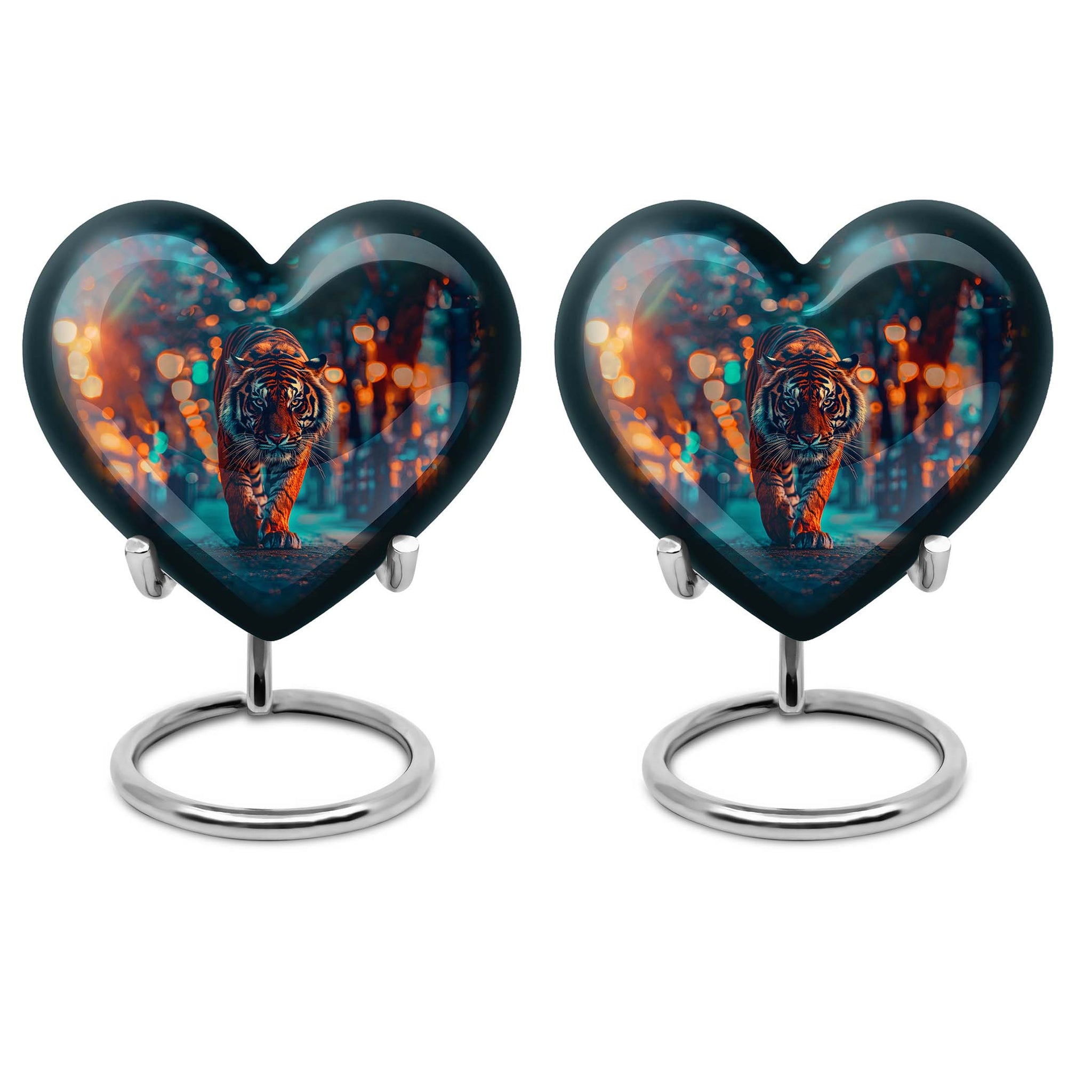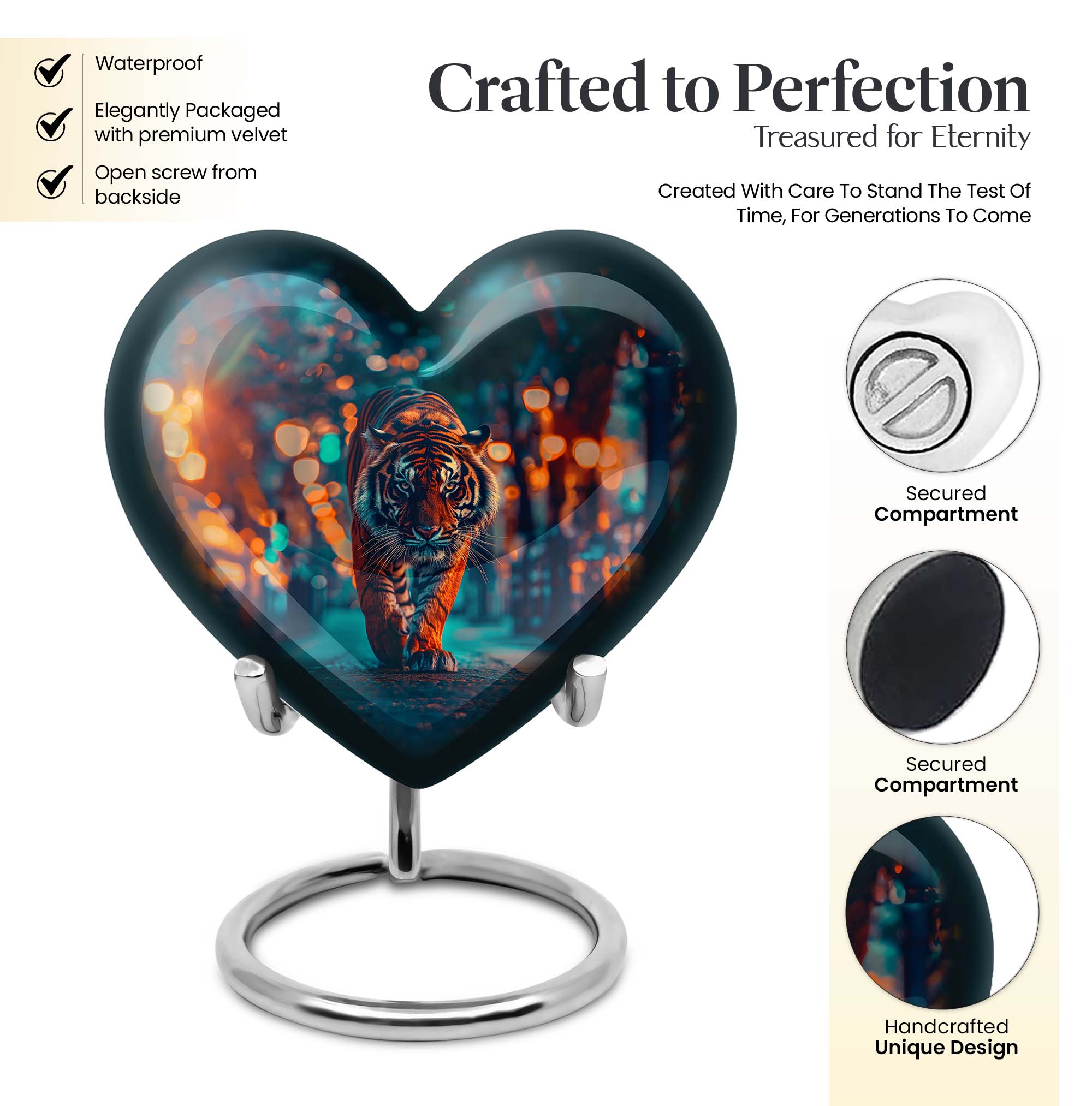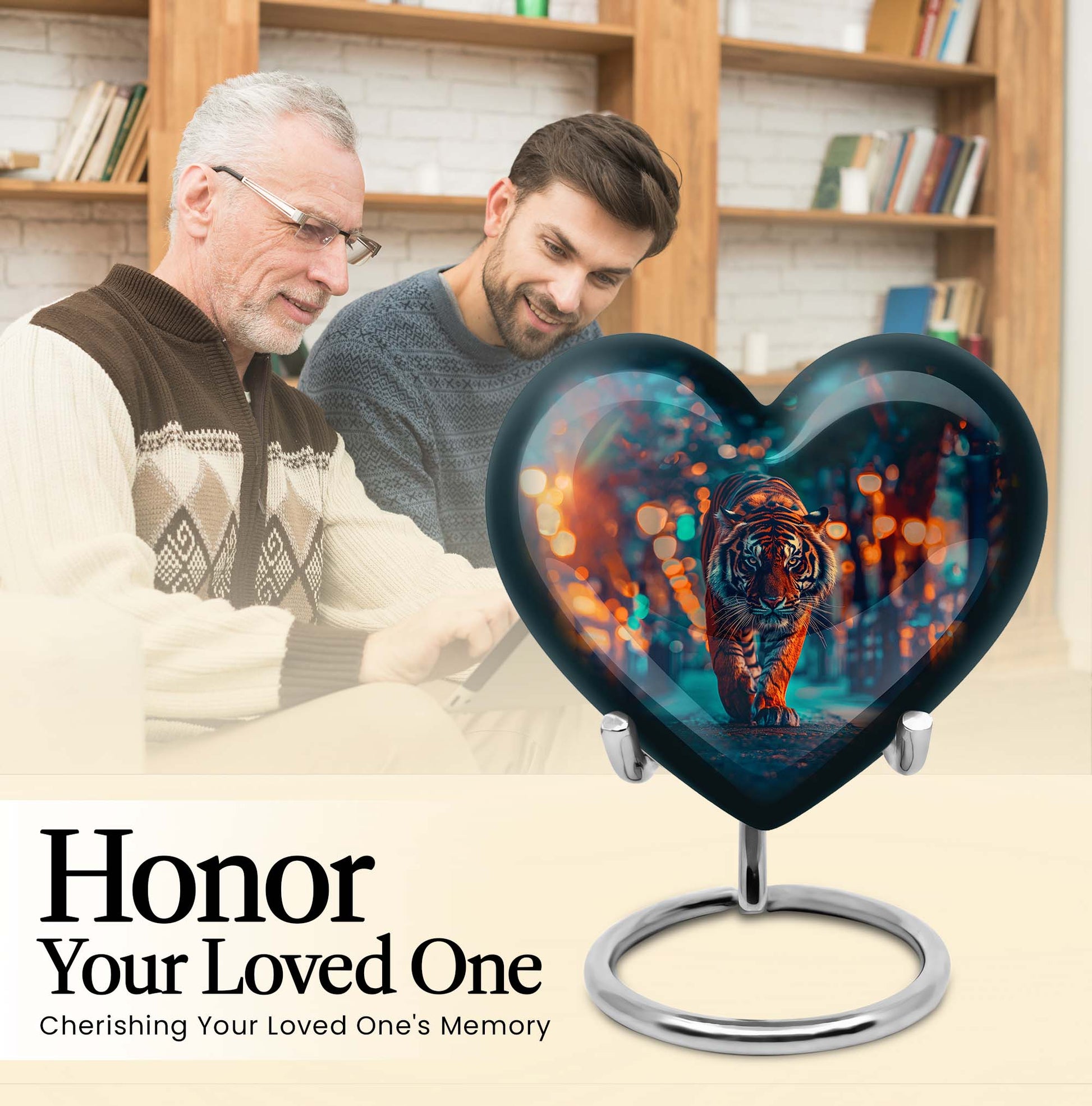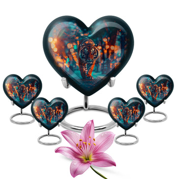Honor those who have passed, holding their memories close to your heart, with our elegant 'Heart Urn'. Specially designed for cremation, it is a captivating combination of craftsmanship and sentiment that offers a final resting place worthy of your loved one. Fashioned from quality, robust aluminium, our large 10-Inch urn weighs 3.3 pounds and has the capacity to hold up to 200 cubic inches of cremated remains. Each tiger urn comes with a velvet pouch for containment of ashes, invoking an aura of dignity and respect. Personalization is available via engraved names, adding a touch of individuality to each tribute. Our heart urn beautifully captures the essence of the dearly departed with a floral theme, effortlessly merging aesthetics with sentiment. Perfectly suitable as a funeral urn for ashes for women, or as an urn for an adult male, it is a fitting tribute to the memories you hold dear. With its distinct theme and craftsmanship, our urn transcends the standard 'box' or 'burial' urns commonly associated with memorial supplies, commanding not just respect but admiration. Allow us to help create a lasting tribute to the life well-lived with our Heart Urn.