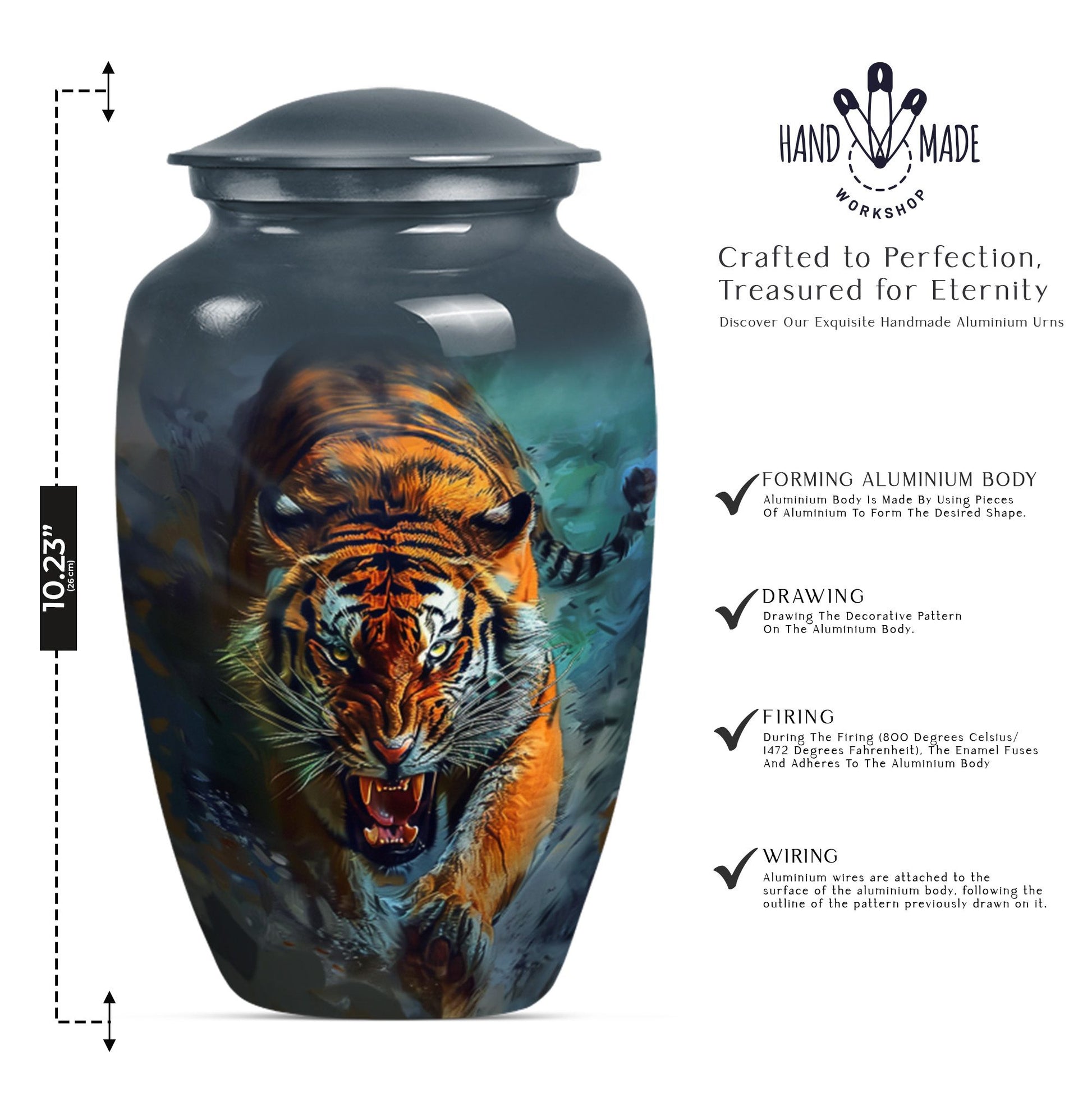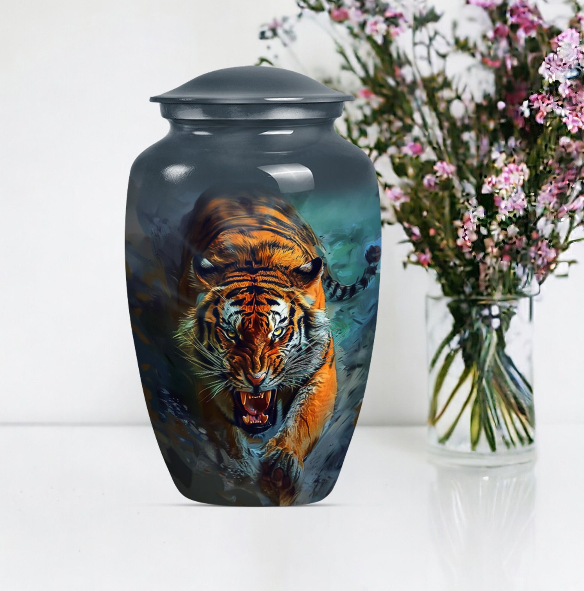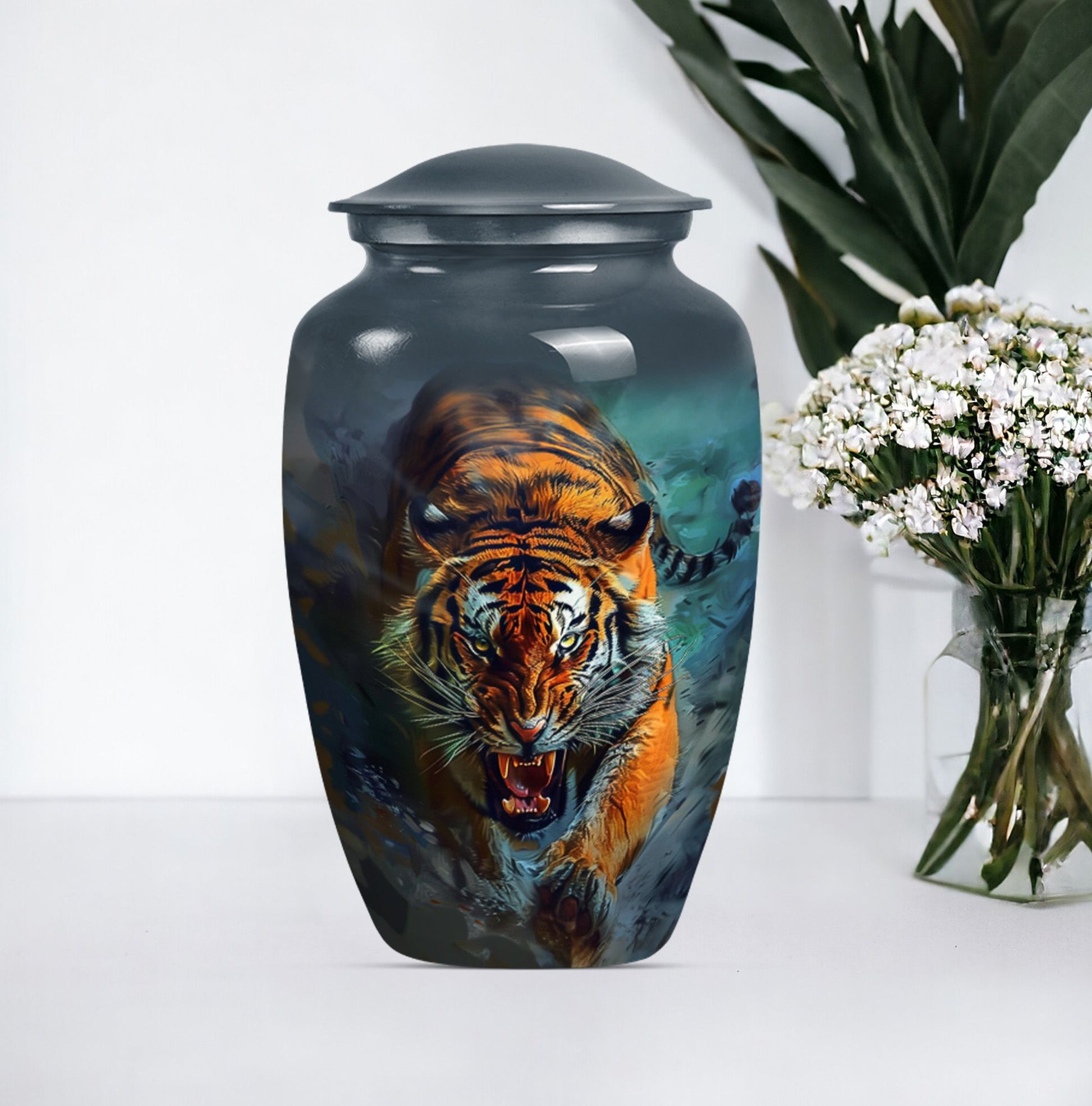 Presenting our meticulously crafted Tiger Urn, an ideal choice for memorial urns for ashes. This large, aluminium made cremation urn stands 10 inches tall, epitomizing the refined artwork with an underlying theme of Flowers. With a sturdy weight of 3.3 pounds and a remarkable capacity of 200 cubic inches, it ably accommodates the ashes, keeping them preserved. Make it unique through the personalized engraved feature, adding beloved names to it. The package comes with a velvet pouch for containment of ashes, ensuring respectful treatment of cherished memories. Our Tiger Urn signifies more than a burial accessory; rather, it's a tribute to loved ones who'll always be remembered. This lasting memento, perfect for urns for burial or funeral metal urns, is a perpetual reminder of the love and respect you carry for the departed. Let your expression of remembrance be as unique as they were, with our specialize shaped ashes urn.