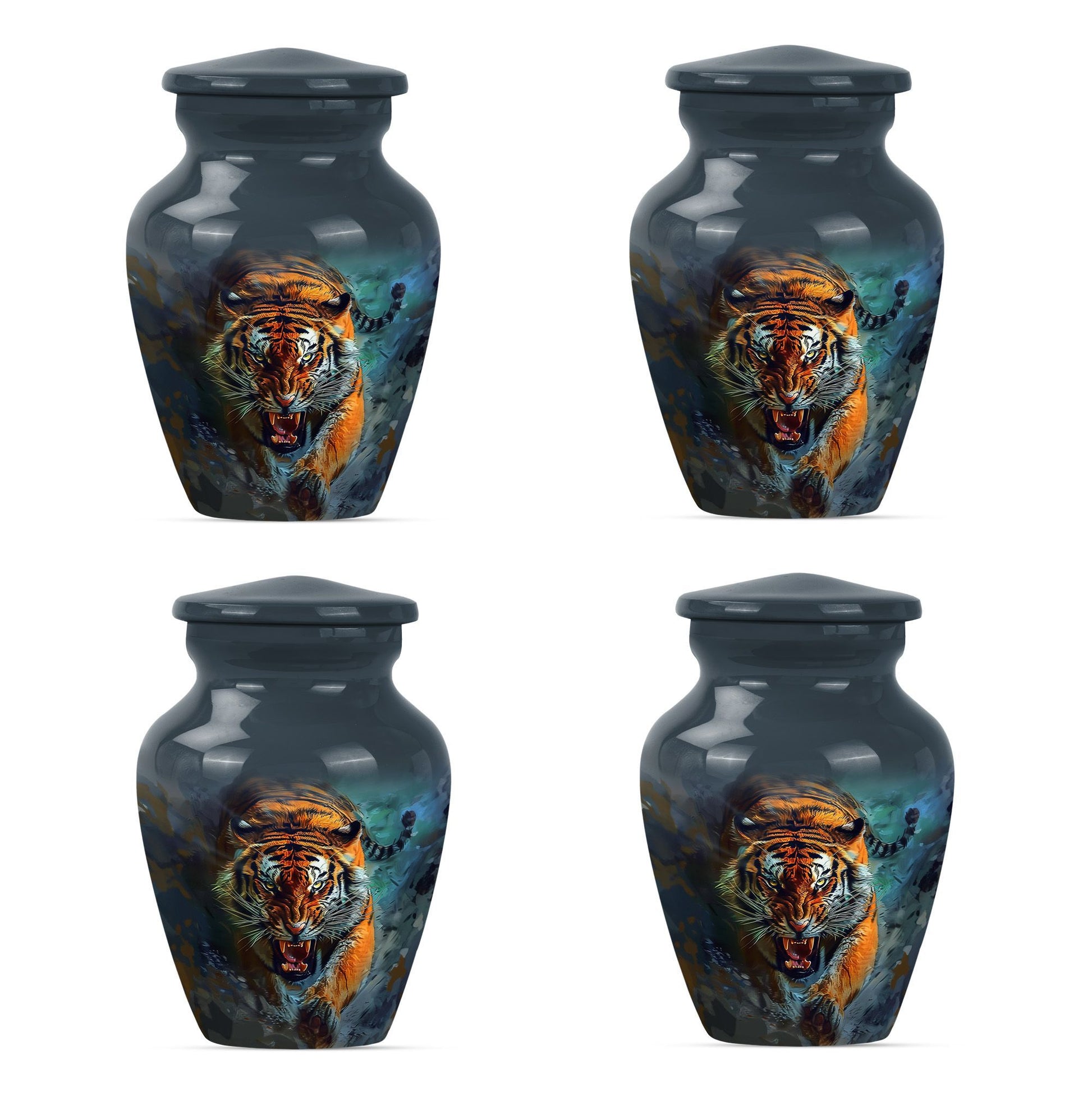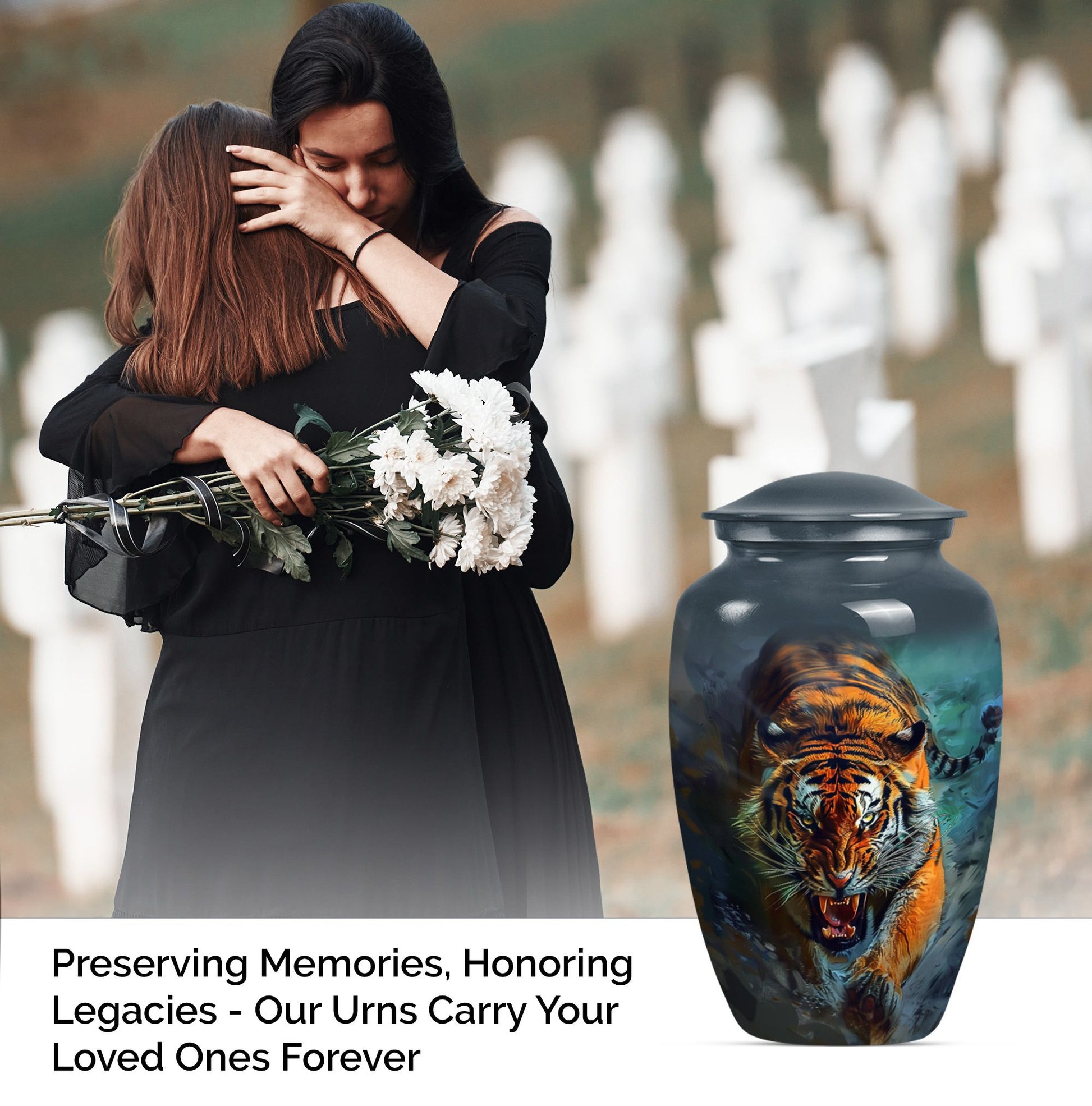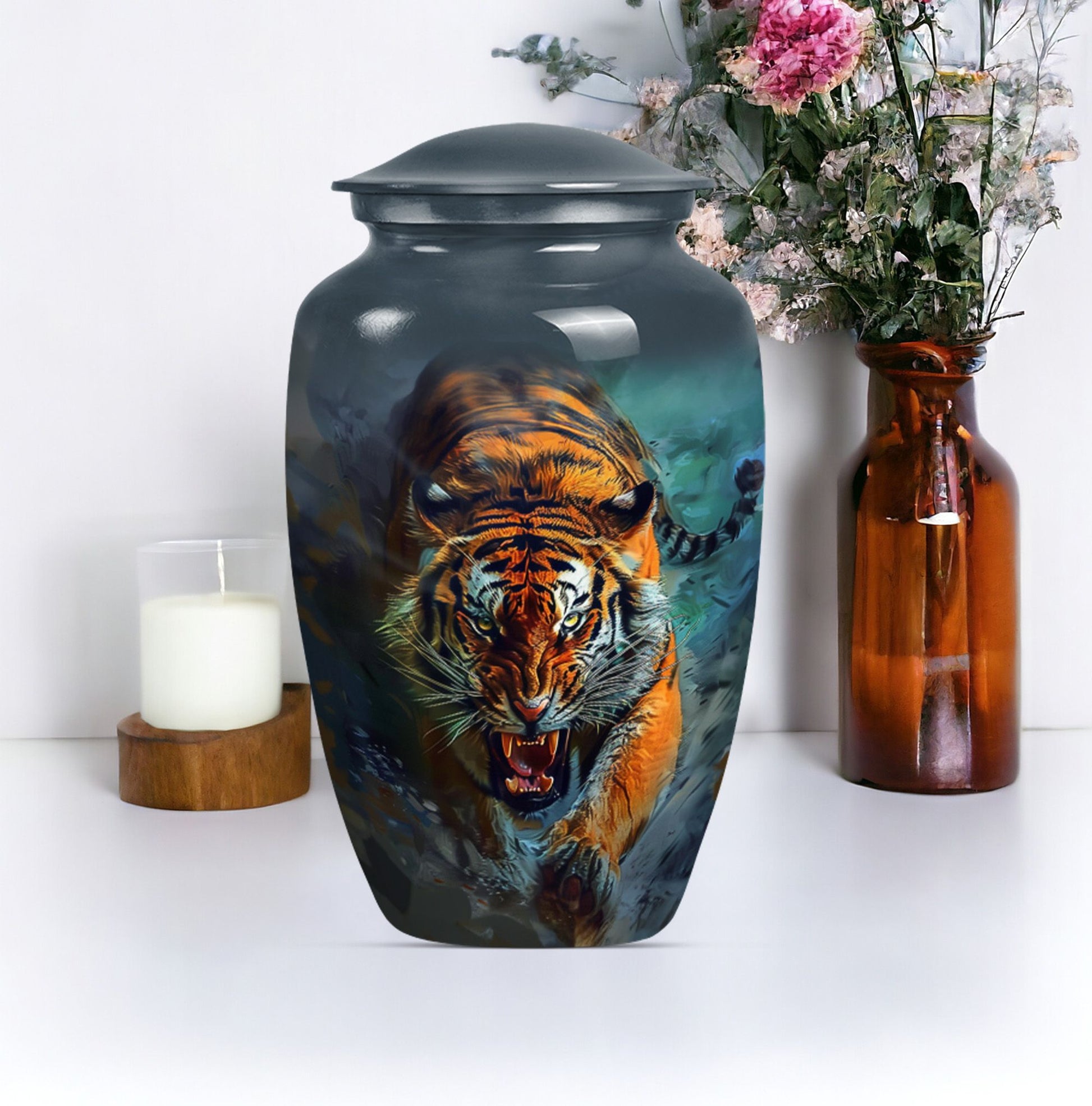 Presenting our meticulously crafted Tiger Urn, an ideal choice for memorial urns for ashes. This large, aluminium made cremation urn stands 10 inches tall, epitomizing the refined artwork with an underlying theme of Flowers. With a sturdy weight of 3.3 pounds and a remarkable capacity of 200 cubic inches, it ably accommodates the ashes, keeping them preserved. Make it unique through the personalized engraved feature, adding beloved names to it. The package comes with a velvet pouch for containment of ashes, ensuring respectful treatment of cherished memories. Our Tiger Urn signifies more than a burial accessory; rather, it's a tribute to loved ones who'll always be remembered. This lasting memento, perfect for urns for burial or funeral metal urns, is a perpetual reminder of the love and respect you carry for the departed. Let your expression of remembrance be as unique as they were, with our specialize shaped ashes urn.