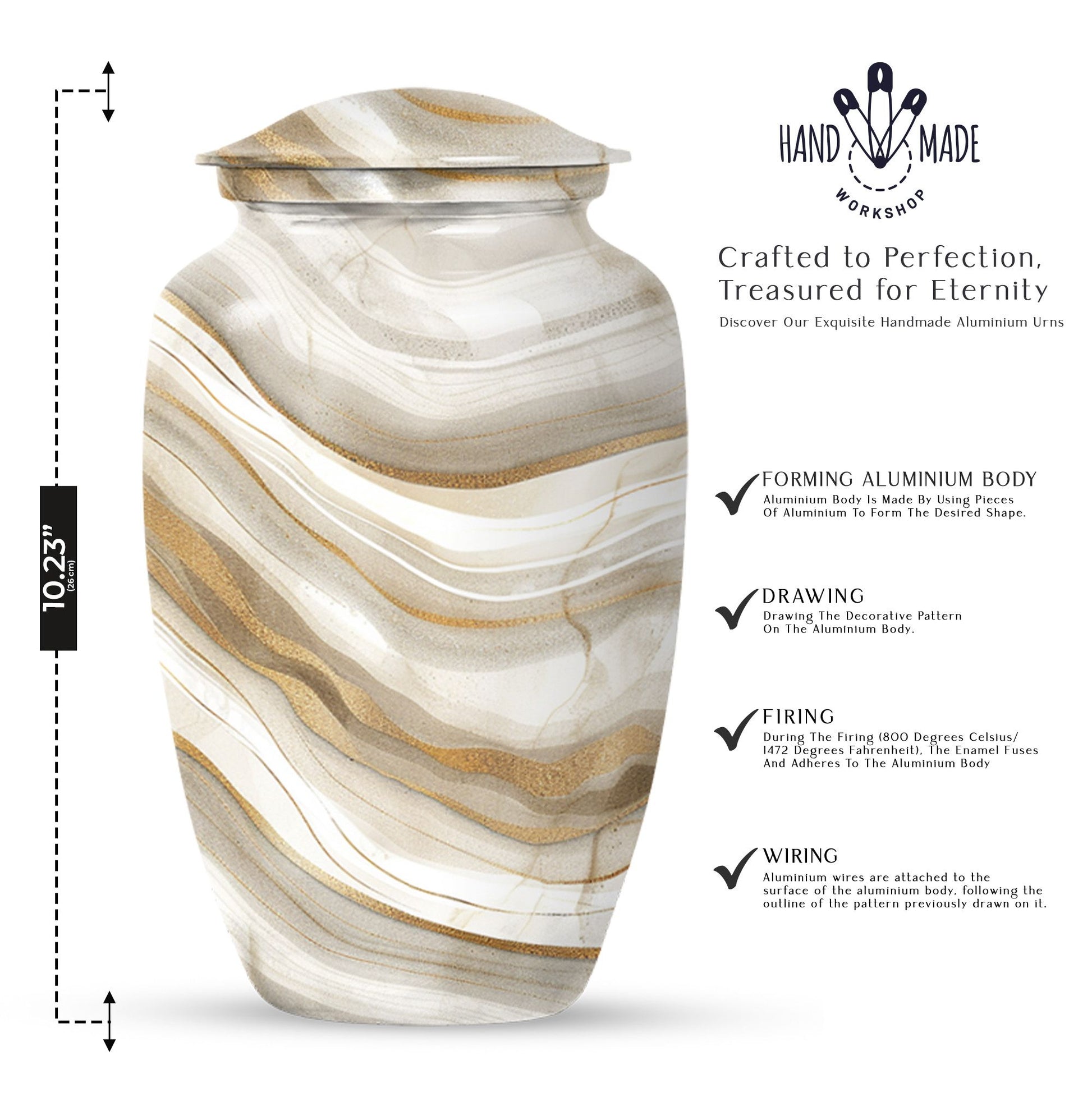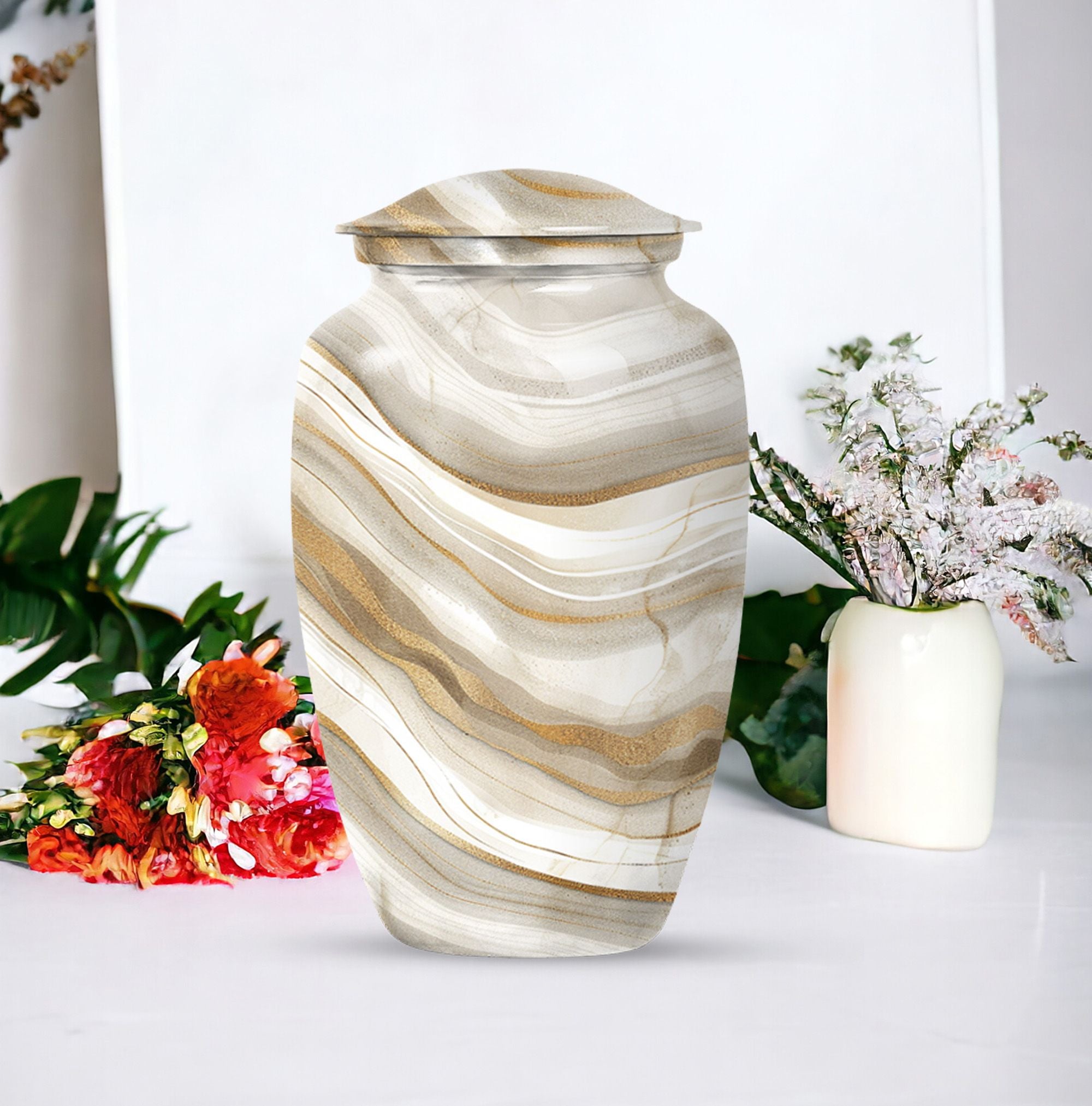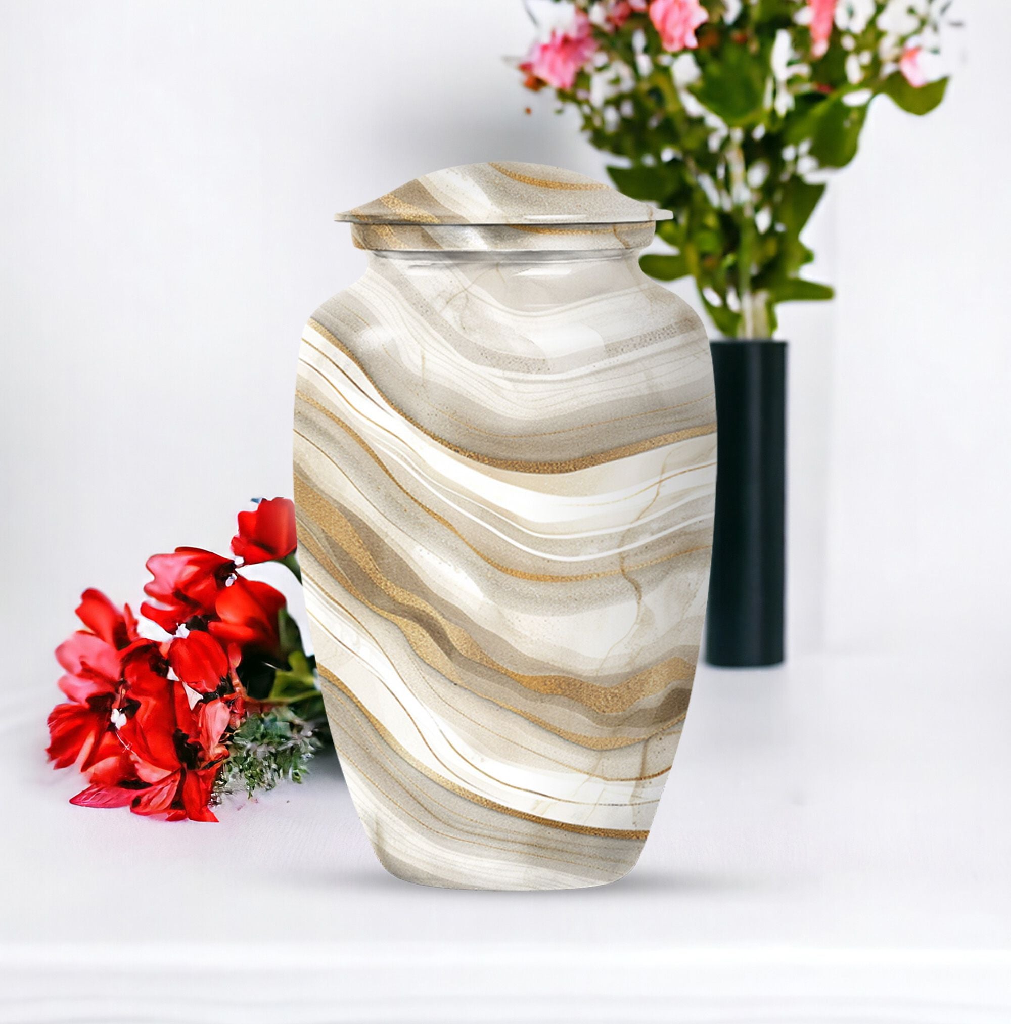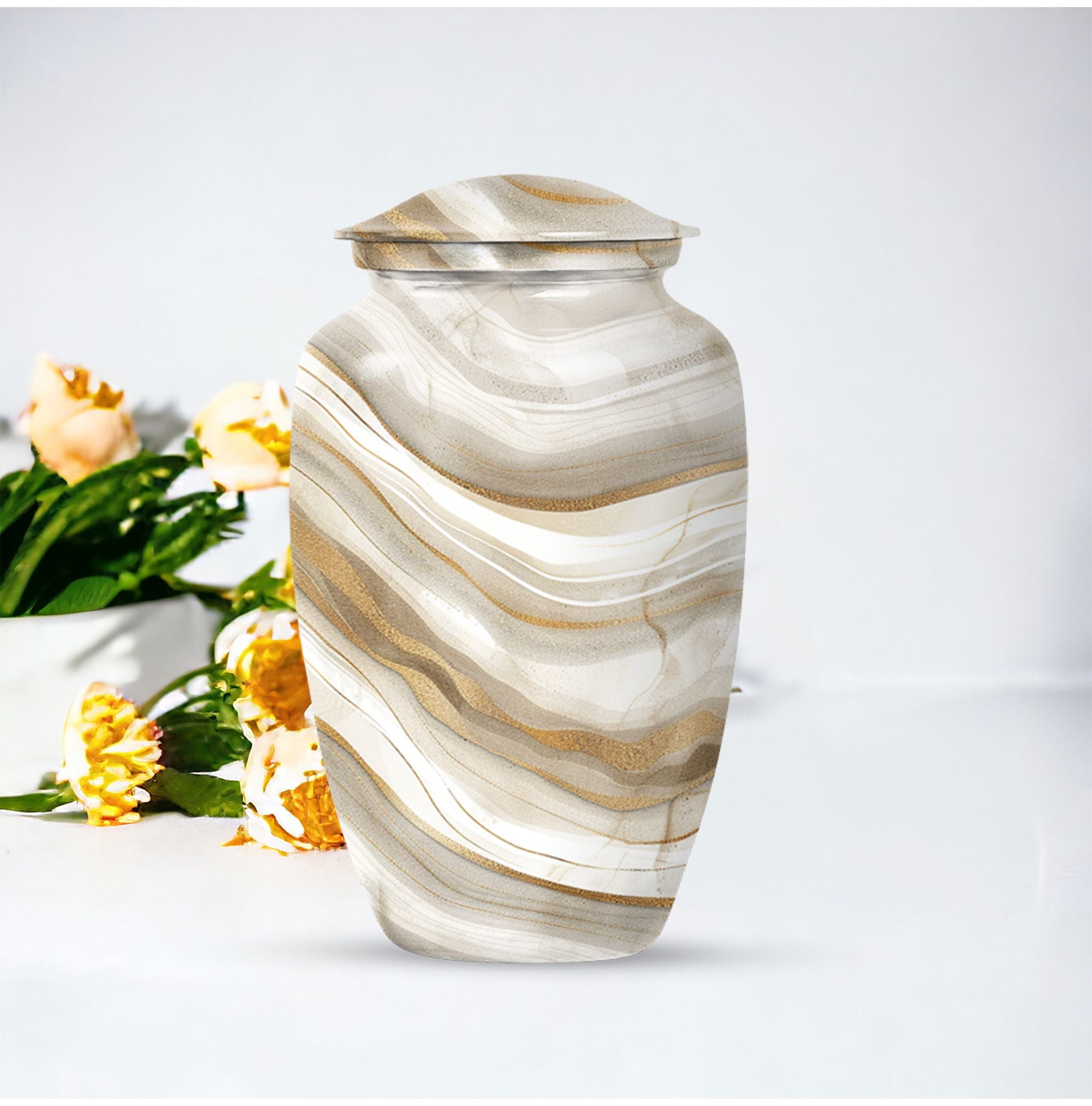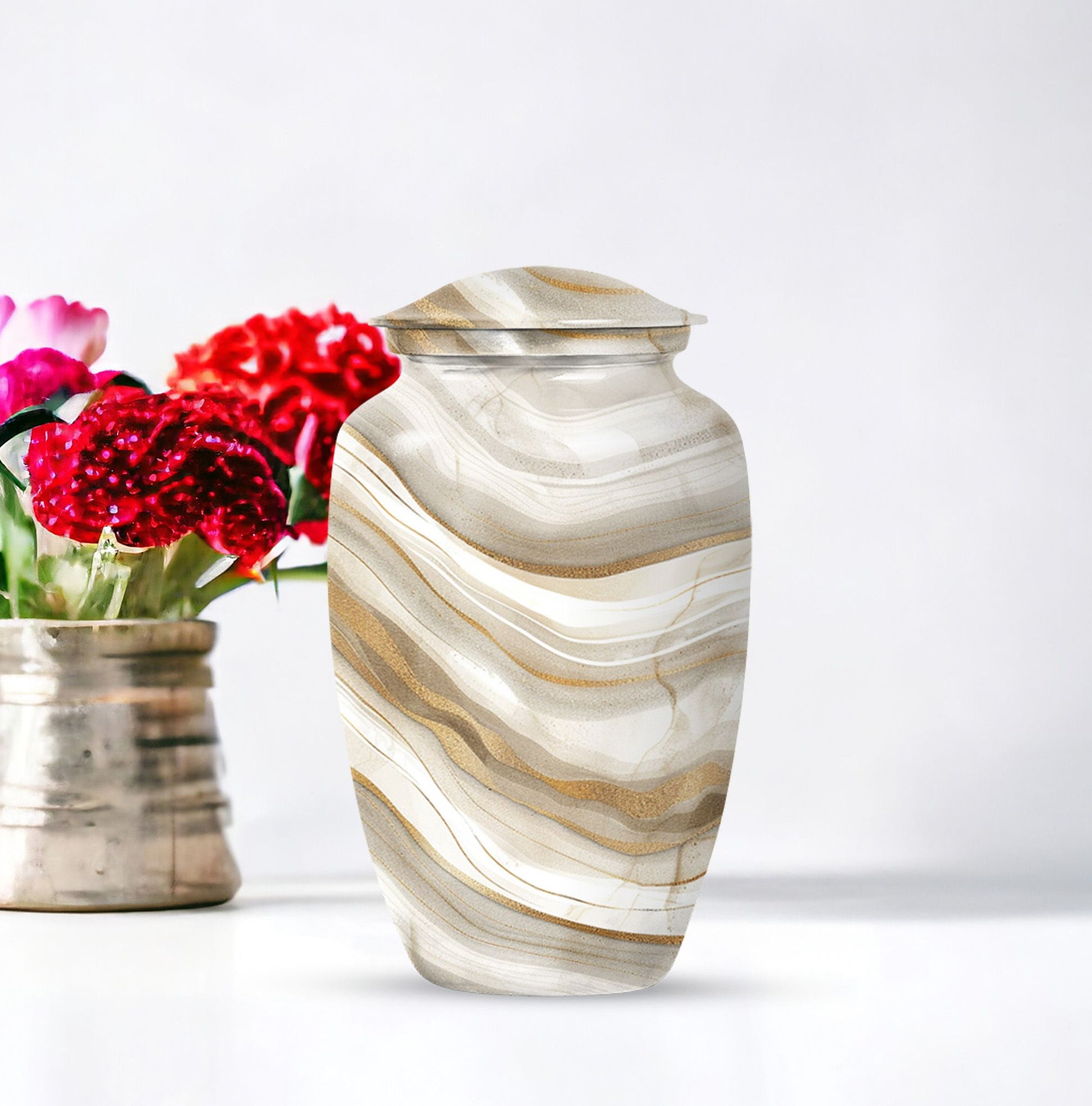 Express your reverence and honor your loved ones with this Abstract Urn, a truly unique tribute. This memorial urn for women ashes stands proud at 10 inches tall, with a robust weight of 3.3 pounds, and an ample capacity of 200 cubic inches. Every detail is meticulously crafted from top-quality Aluminium, making it both durable and timeless. The urn is not merely a container but a classic symbol of remembrance that radiates an aura of love and respect. The package comes complete with a velvet pouch, specifically designed for the containment of ashes, maintaining dignity and respect at all times. What truly sets this Large Urn apart is the opportunity for customization. Personalize this urn with engraved names, helping transform it into a unique memorial. Keywords include women urns, Urn for Ground Burial, urns for human ashes, and metal urns for adult female ashes. Cherish the memories with our Abstract Urn, a memorial urn tailored for individuals who appreciate sophistication and respect tradition.
