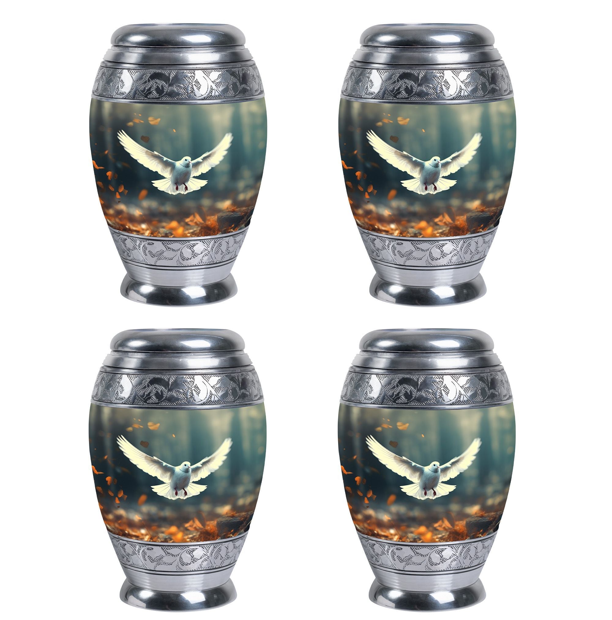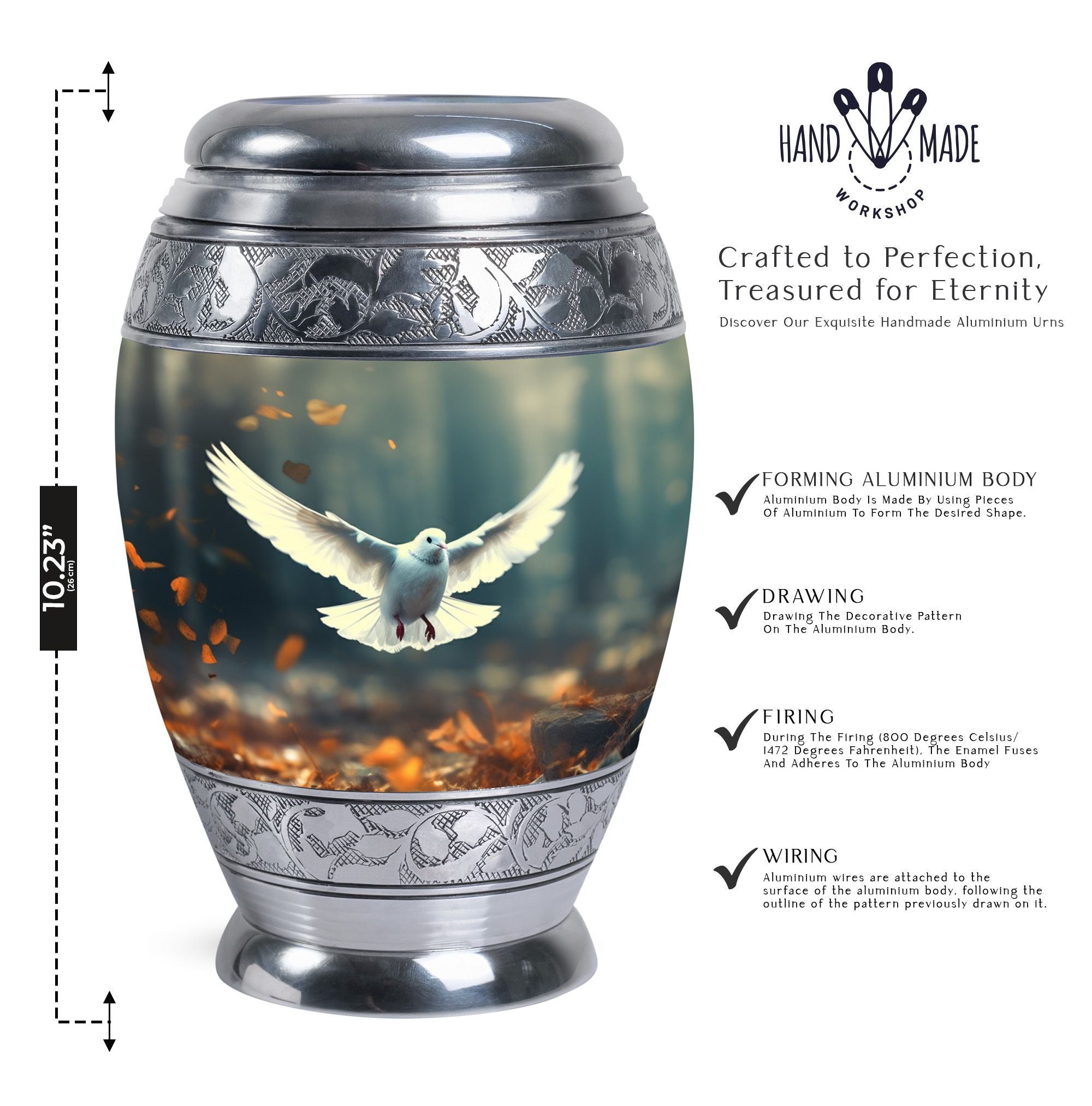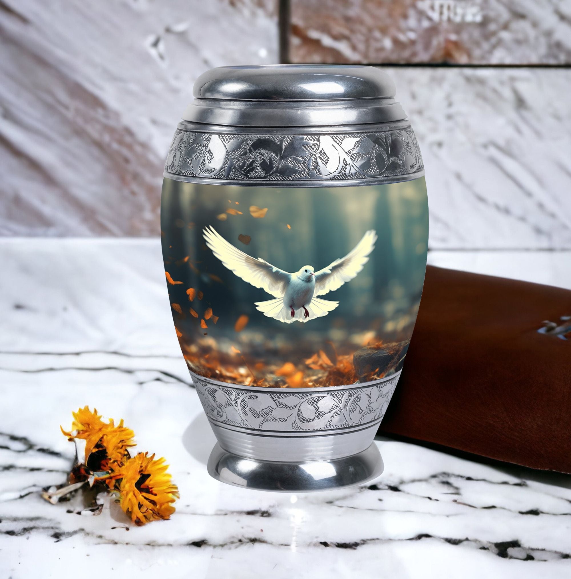 Express your appreciation and love for departed loved ones with our Large Dove Urns for Human Ashes. Crafted from durable and lightweight aluminium, these Modern Urns feature a timeless Classic Urn aesthetic that subtly complements any space. Measuring 10 inches in height and a comfortable 3-inch size, it holds up to 200 cubic inches – efficiently and carefully preserving the cherished remains. With an offering weight of 3.3 pounds, it's convenient to transport during memorial ceremonies. Each urn comes with a velvet pouch, ensuring a respectful containment of the ashes. Personalize this tribute to your loved one with engraved names, elevating this memorial gift into a deeply meaningful connection. Patently unique, these cremation urns strike the perfect balance between elegance and remembrances. Ideal for seniors and adults, the Dove Urn is not just an urn; it is a tribute to life and the memories it holds. Note: Exact 'urn design' may exclude from the product description.