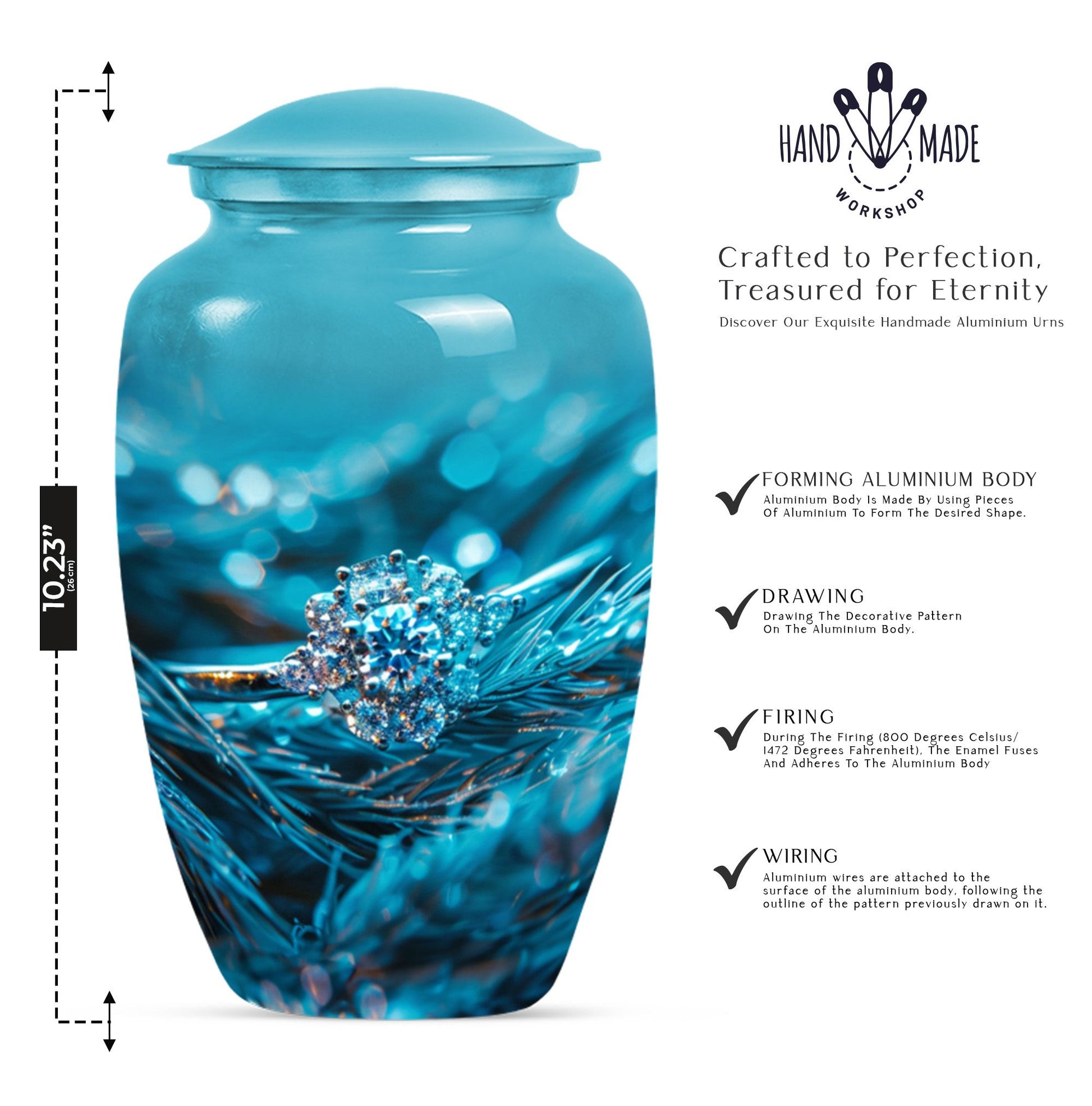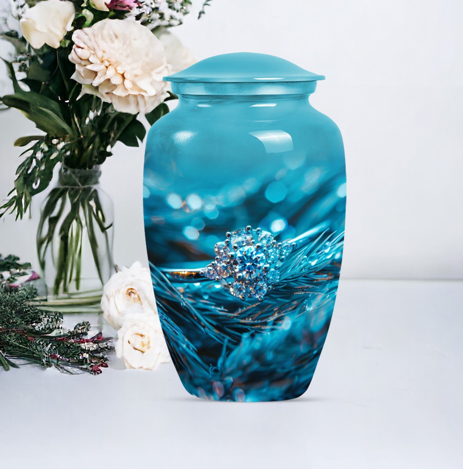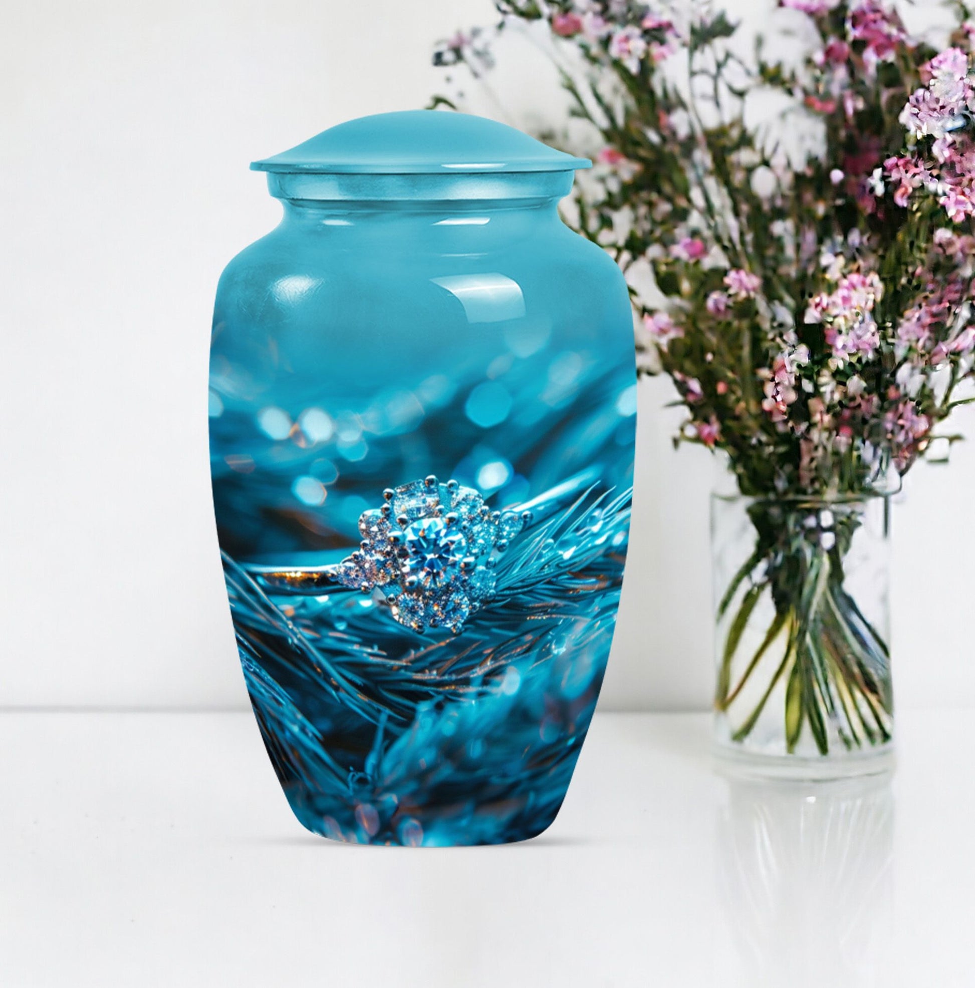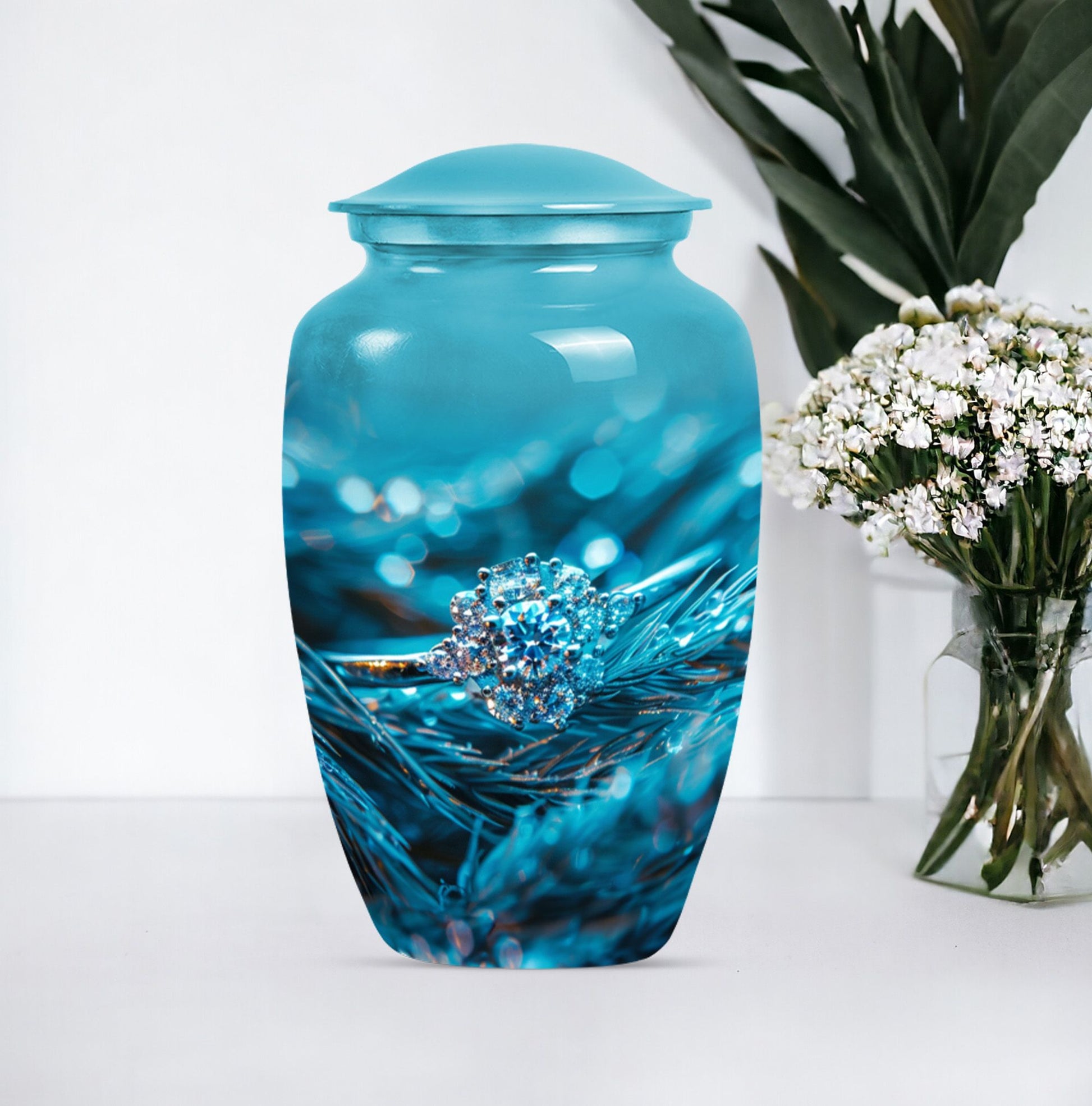Pay homage to your loved ones with this 10-inch Ring Urn, a symbol of eternal peace and remembrance. A paramount choice in the realm of memorial ash urns, this abstract-themed large urn has the capacity to hold up to 200 cubic inches of ashes, reflecting both stylish aesthetics and high utility. Crafted from robust Aluminium, its weight stands at a sturdy 3.3 pounds, ensuring durability and strength. This classic urn stands 10 inches tall, portraying a striking yet heartfelt remembrance. The package features a velvet pouch for sensitive containment of ashes, protectively encapsulating your cherished memories. Personalize this funeral urn for men's ashes and tailor it to your emotional bond, making your loss a bit more bearable. Keywords such as 'adult ashes men', 'elegant urns', and 'memorial urns' resonate with this product, destined to bring a sense of tranquillity amidst the turbulent waves of grief. Although loss is inevitable, continuing bonds of affection should not be; make this large urn your sanctuary of remembrance.