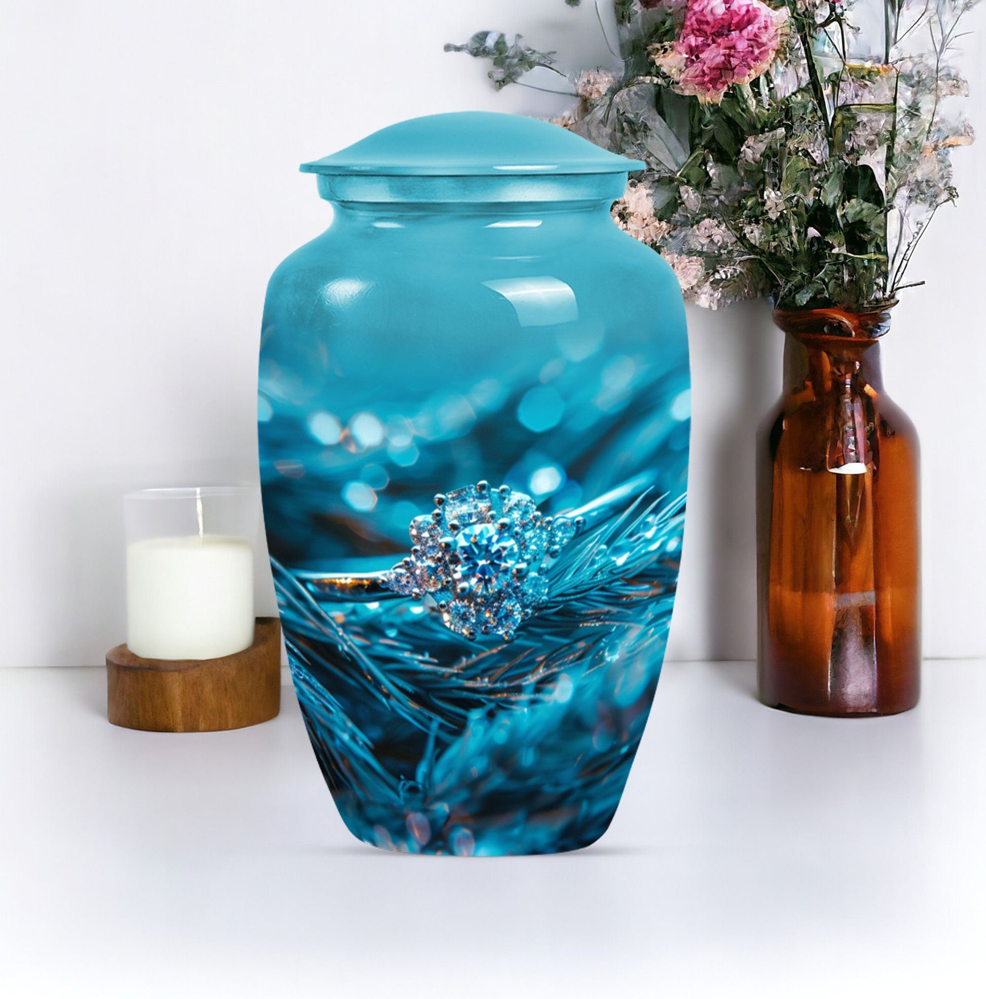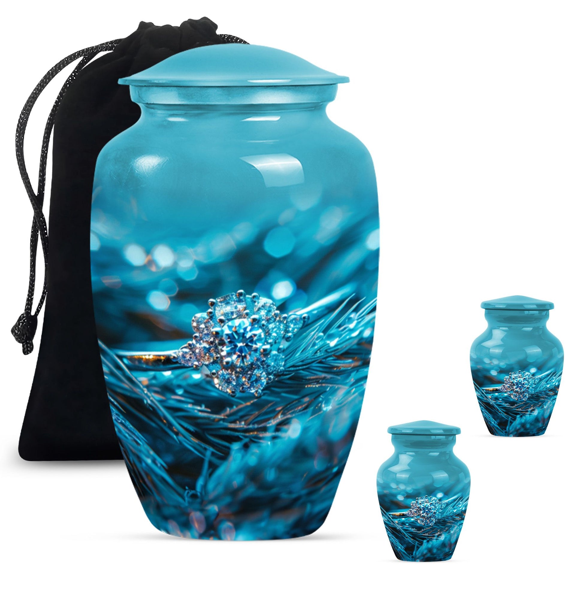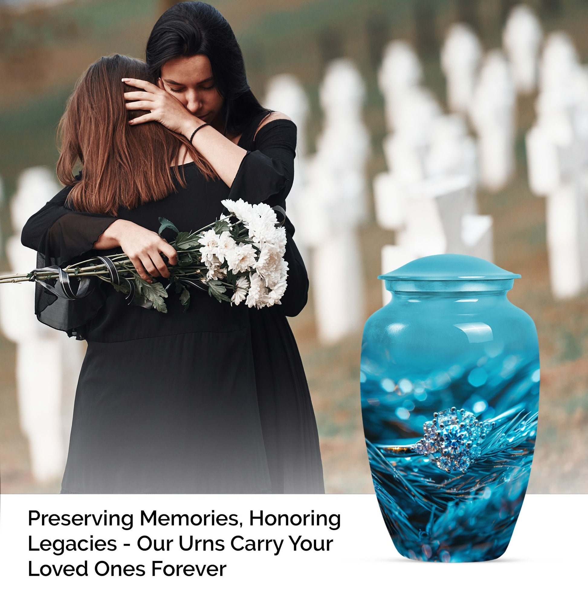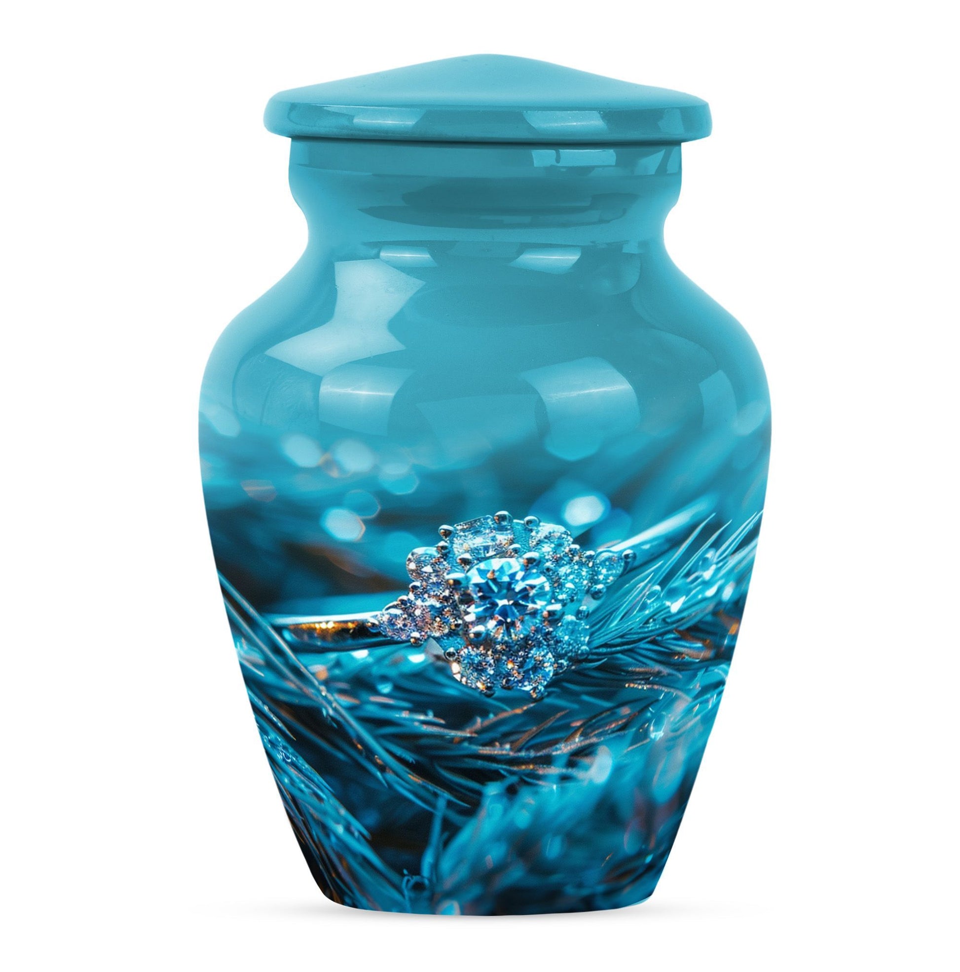 Pay homage to your loved ones with this 10-inch Ring Urn, a symbol of eternal peace and remembrance. A paramount choice in the realm of memorial ash urns, this abstract-themed large urn has the capacity to hold up to 200 cubic inches of ashes, reflecting both stylish aesthetics and high utility. Crafted from robust Aluminium, its weight stands at a sturdy 3.3 pounds, ensuring durability and strength. This classic urn stands 10 inches tall, portraying a striking yet heartfelt remembrance. The package features a velvet pouch for sensitive containment of ashes, protectively encapsulating your cherished memories. Personalize this funeral urn for men's ashes and tailor it to your emotional bond, making your loss a bit more bearable. Keywords such as 'adult ashes men', 'elegant urns', and 'memorial urns' resonate with this product, destined to bring a sense of tranquillity amidst the turbulent waves of grief. Although loss is inevitable, continuing bonds of affection should not be; make this large urn your sanctuary of remembrance.