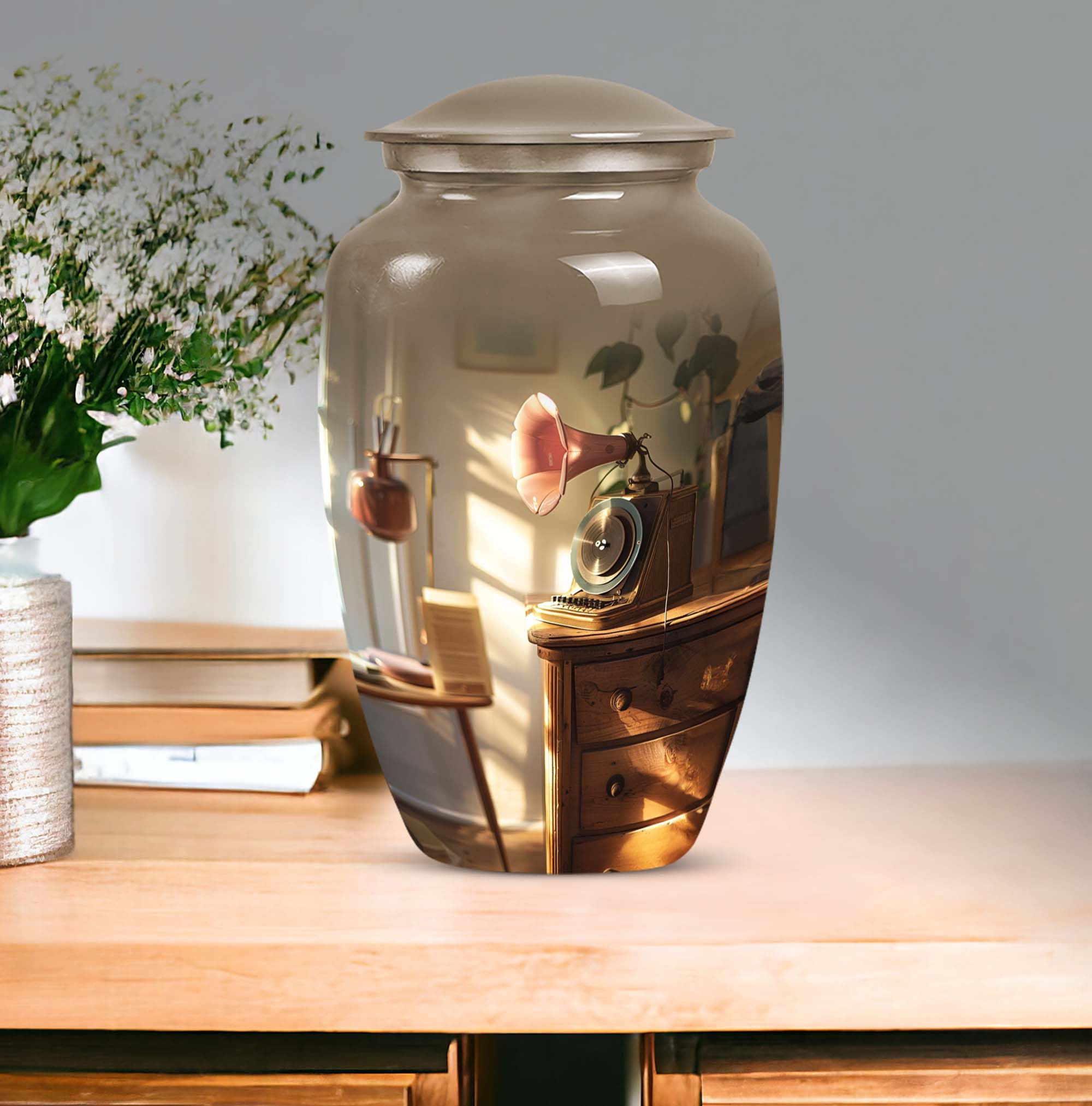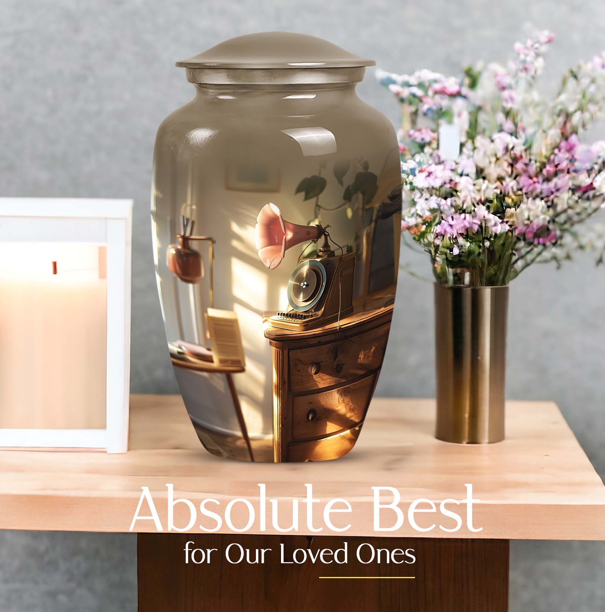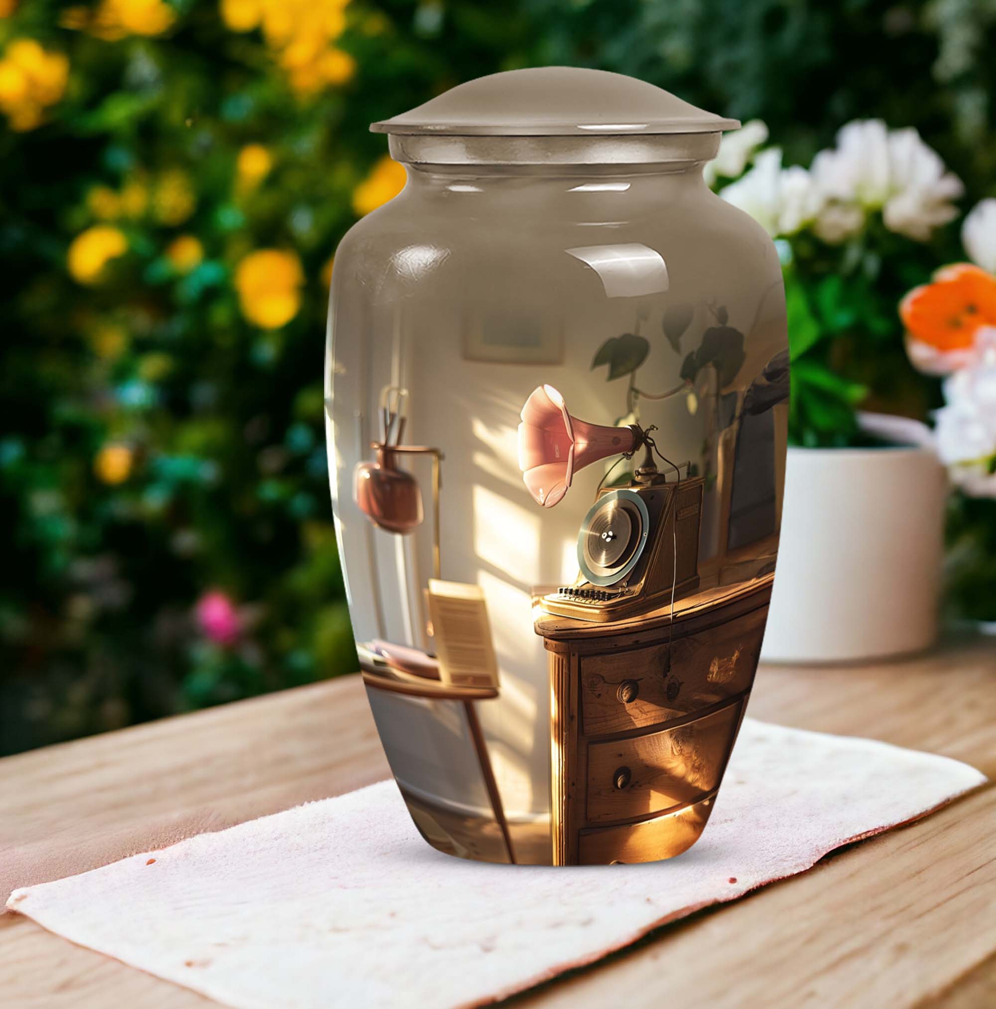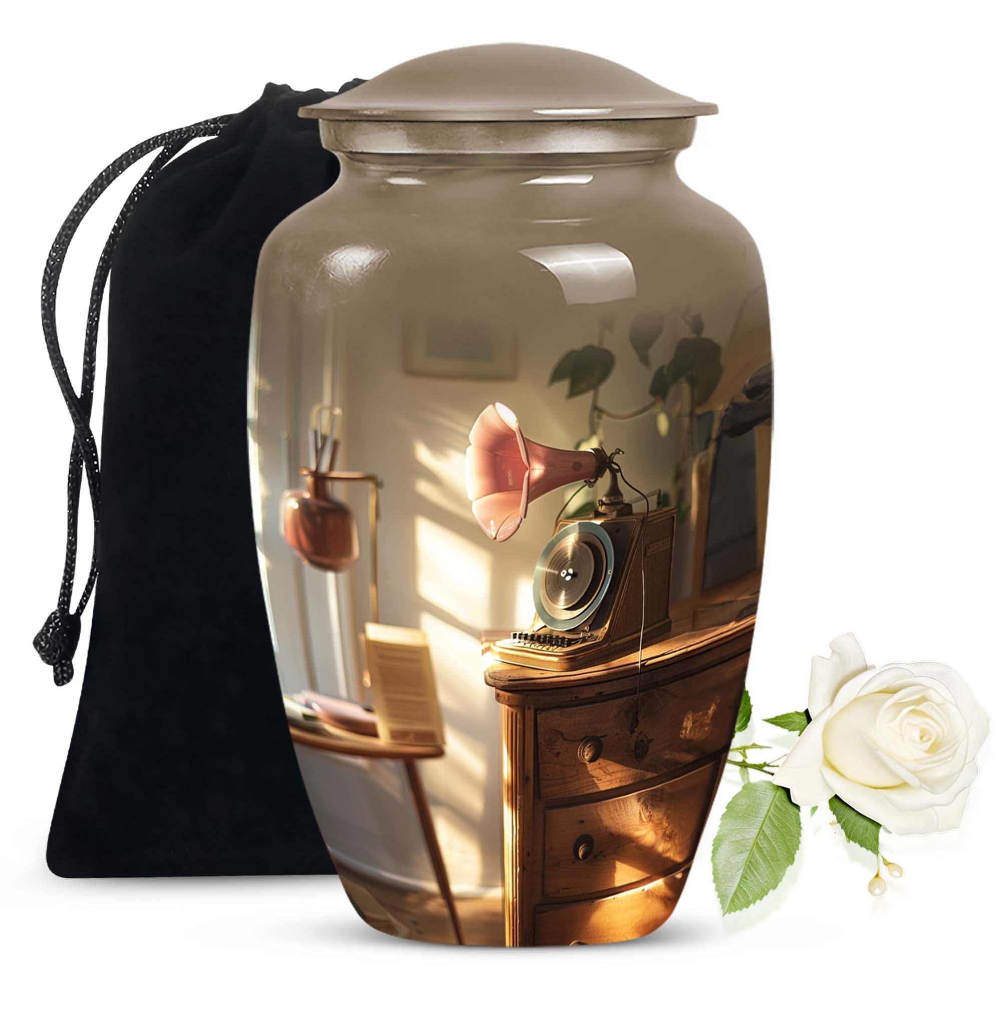 Immerse yourself in honoring departed loved ones with this Gramophone Urn, a sublime symbol of timeless affection. Crafted from durable aluminium, this 10-inch funeral urn for mom is both large and lightweight, weighing in at only 3.3 pounds. Its impressive 200 cubic inch capacity ensures a solumn sanctuary for ashes, just like the eternal bond you shared. The classic urn styling seamlessly blends traditional dignity with a unique gramophone theme, symbolizing continuity amidst change. The package includes a plush velvet pouch, providing an added layer of safe containment for ashes. Further elevate the urn's meaning by personalizing it with engraved names, a tribute as distinct as your love. Ideal for those seeking cremation urns, this beautiful piece transcends mere memorial adult urn or human urn ash adult designations. If you're looking for unique, custom cremation urns with poignant symbolism, add this Gramophone Urn to your list of considerations. Precious sentiments deserve a fitting vessel, and this urn is a testament to enduring love.