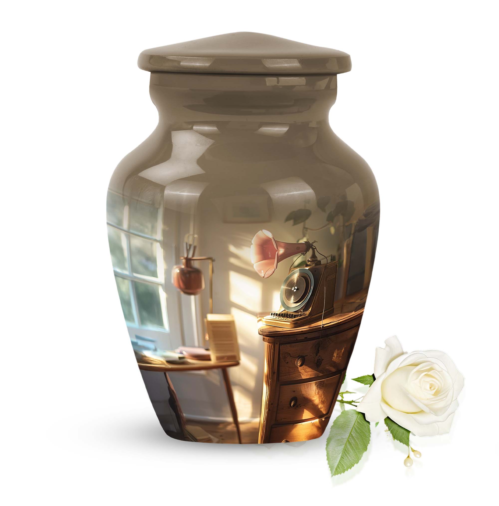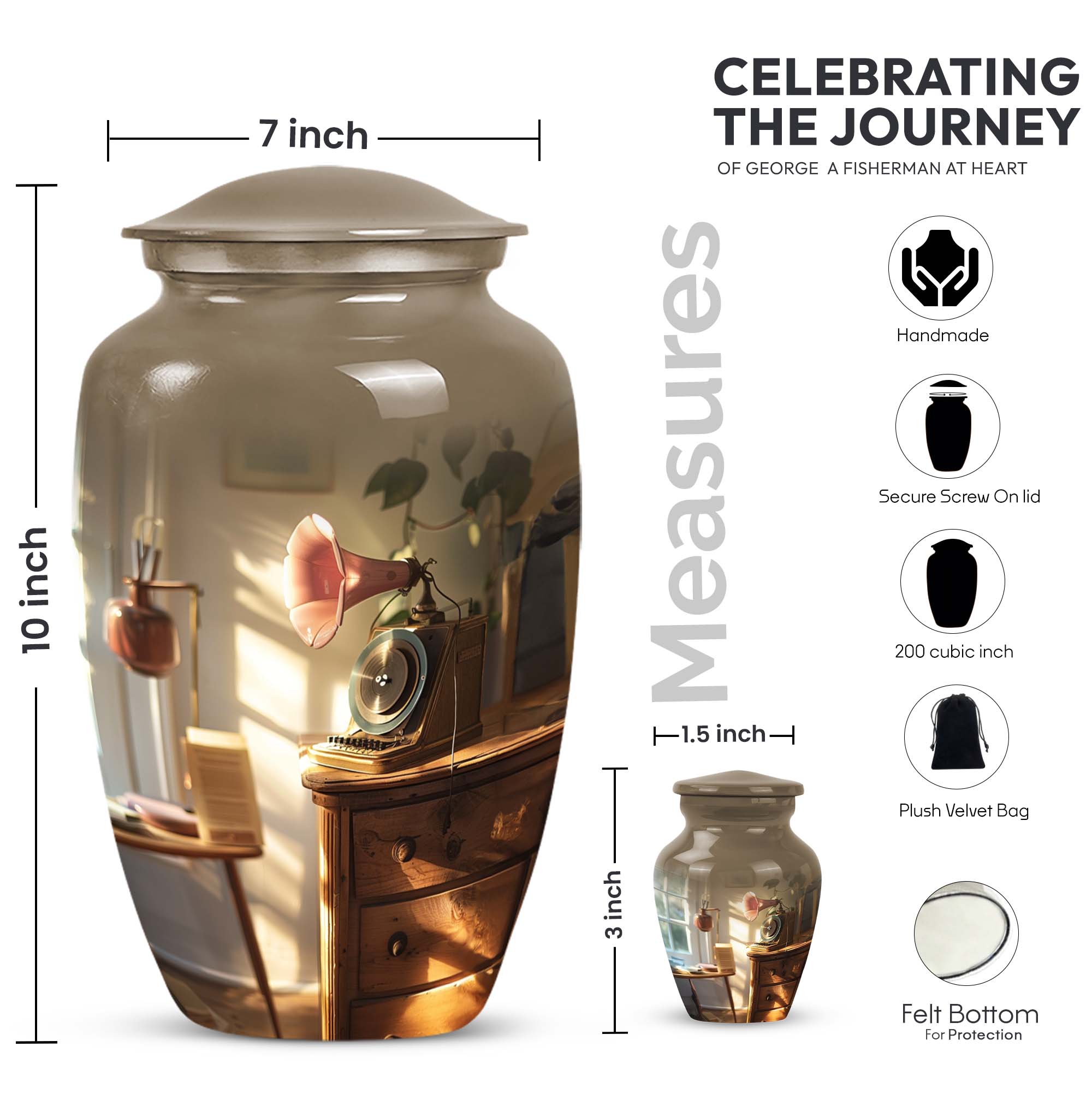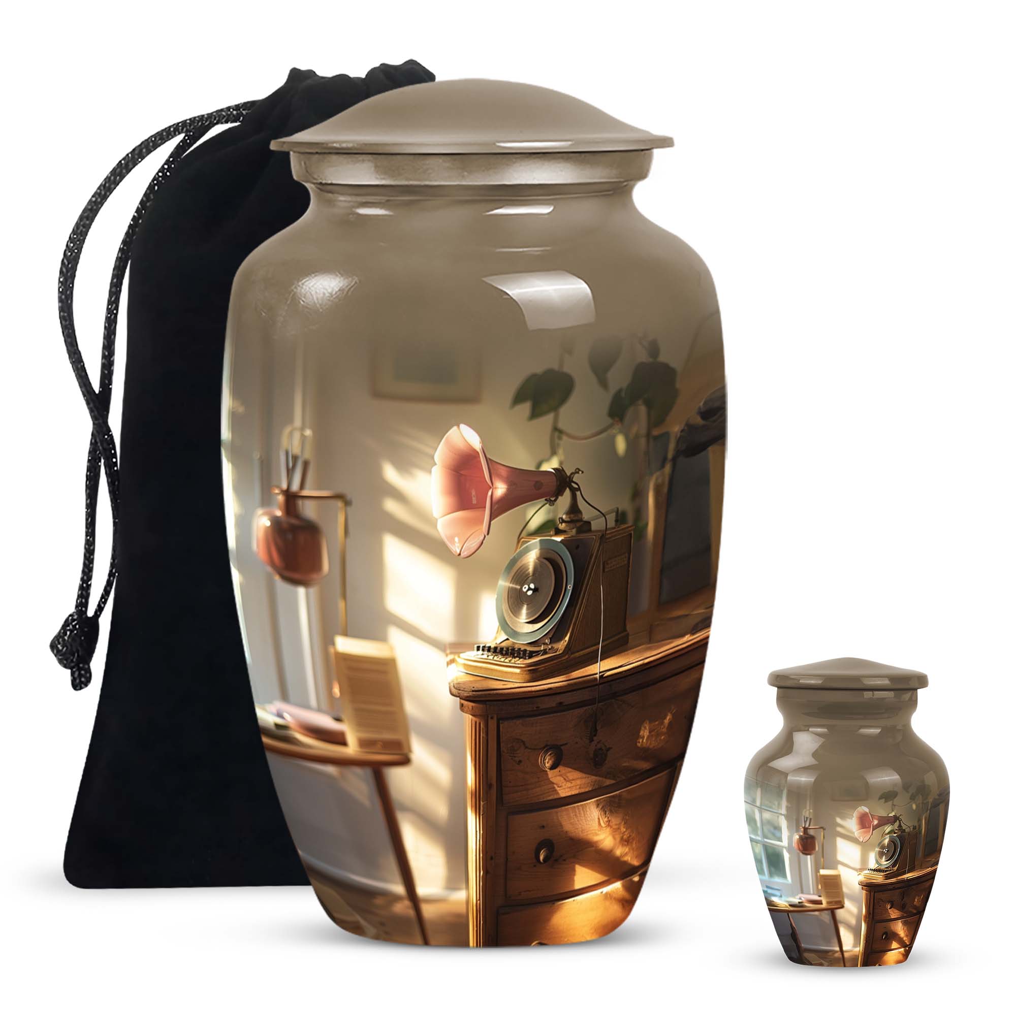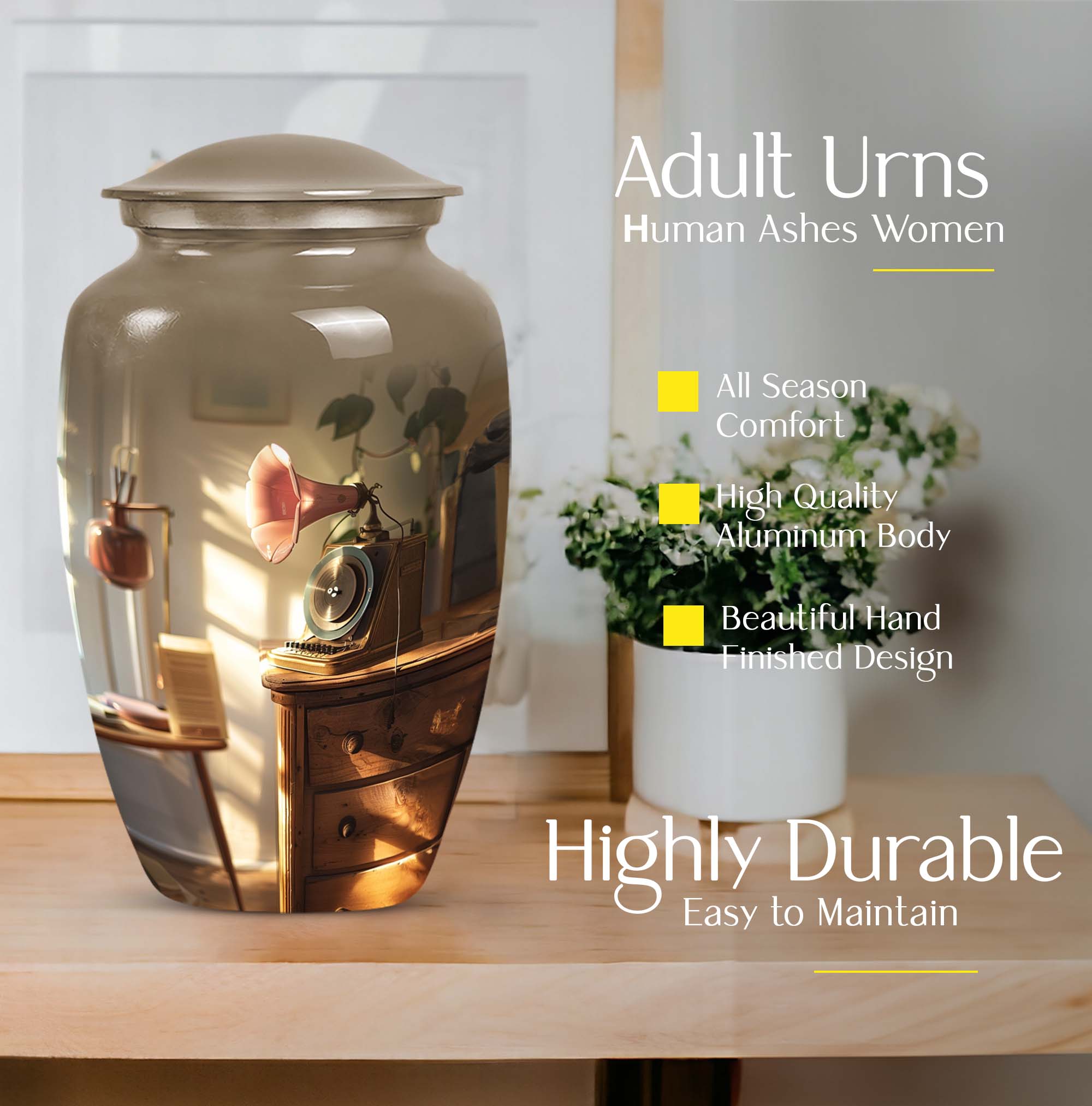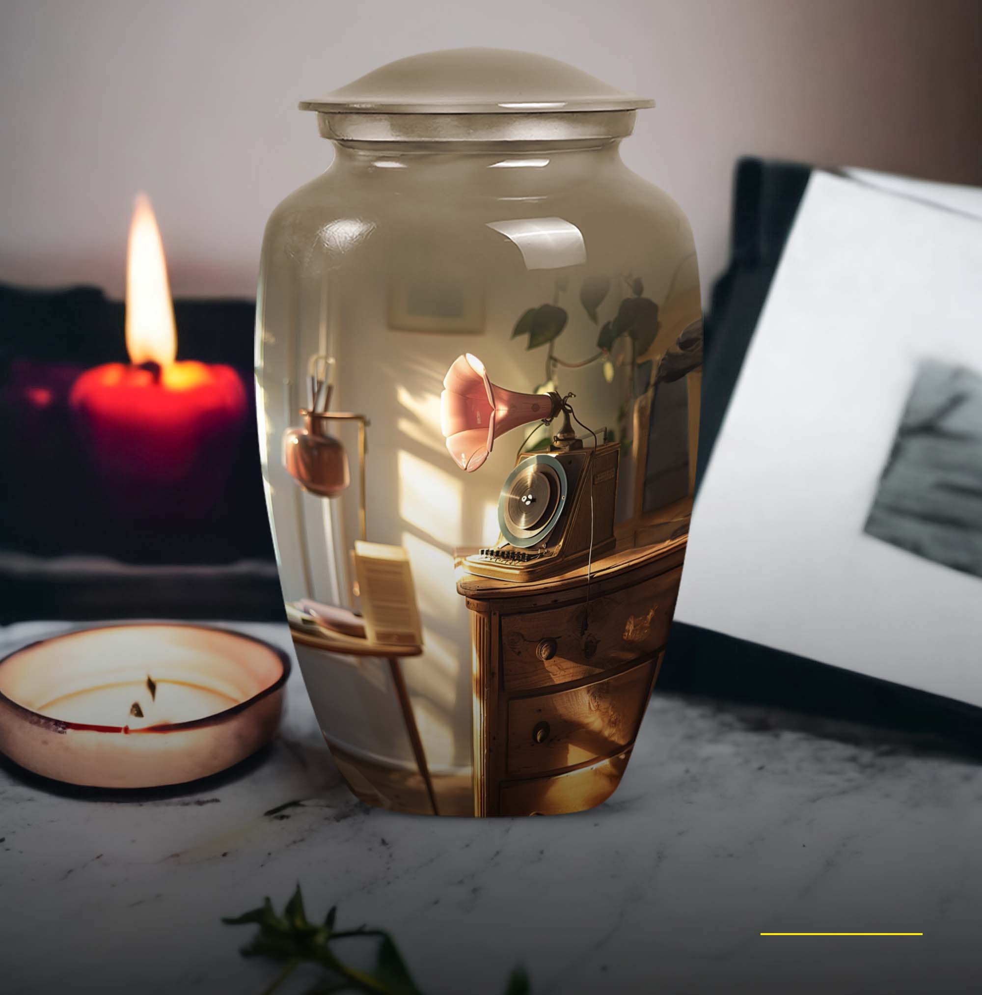 Immerse yourself in honoring departed loved ones with this Gramophone Urn, a sublime symbol of timeless affection. Crafted from durable aluminium, this 10-inch funeral urn for mom is both large and lightweight, weighing in at only 3.3 pounds. Its impressive 200 cubic inch capacity ensures a solumn sanctuary for ashes, just like the eternal bond you shared. The classic urn styling seamlessly blends traditional dignity with a unique gramophone theme, symbolizing continuity amidst change. The package includes a plush velvet pouch, providing an added layer of safe containment for ashes. Further elevate the urn's meaning by personalizing it with engraved names, a tribute as distinct as your love. Ideal for those seeking cremation urns, this beautiful piece transcends mere memorial adult urn or human urn ash adult designations. If you're looking for unique, custom cremation urns with poignant symbolism, add this Gramophone Urn to your list of considerations. Precious sentiments deserve a fitting vessel, and this urn is a testament to enduring love.