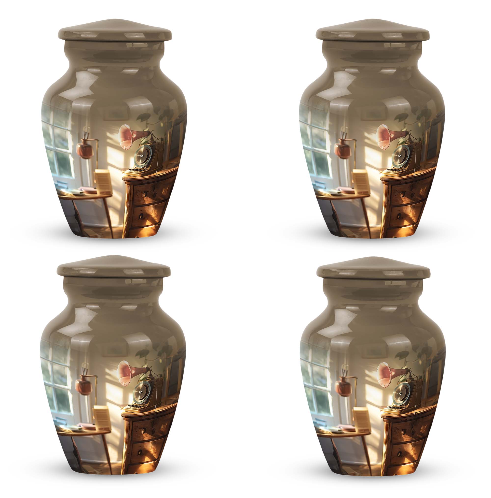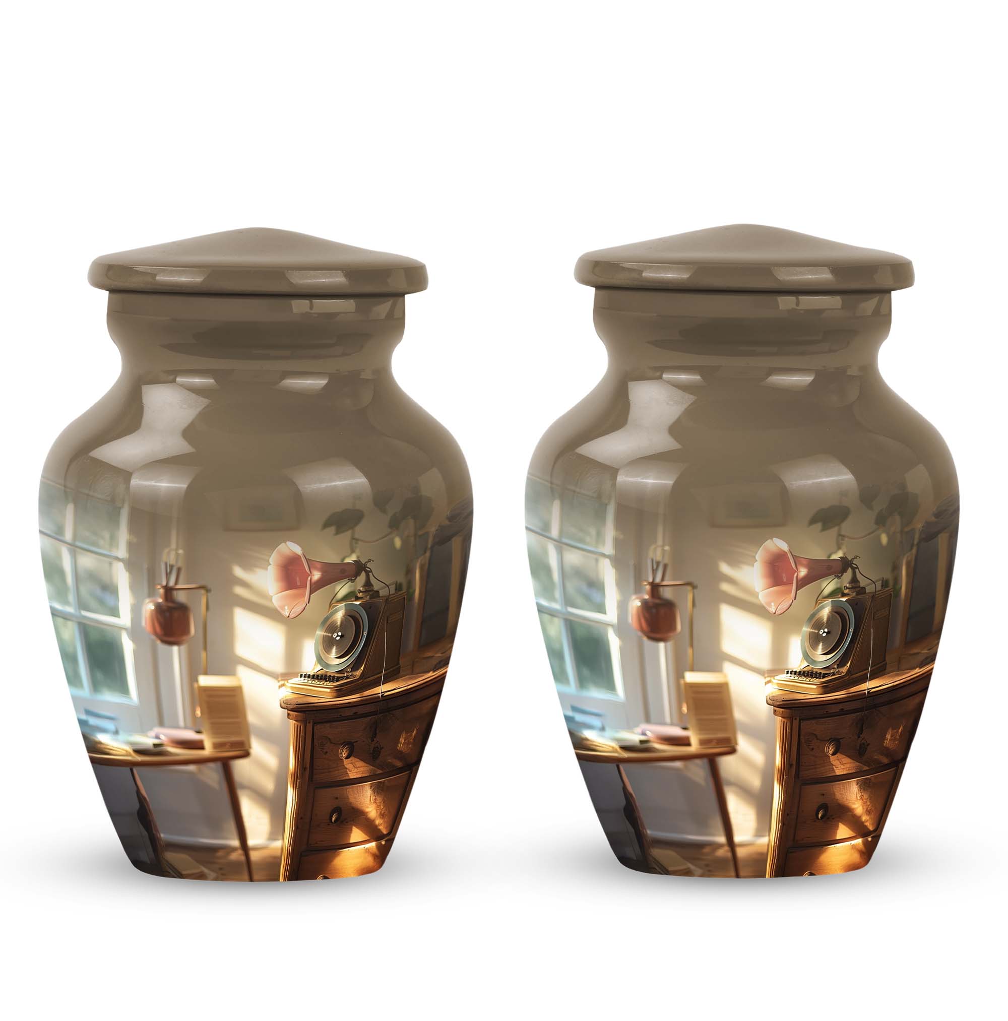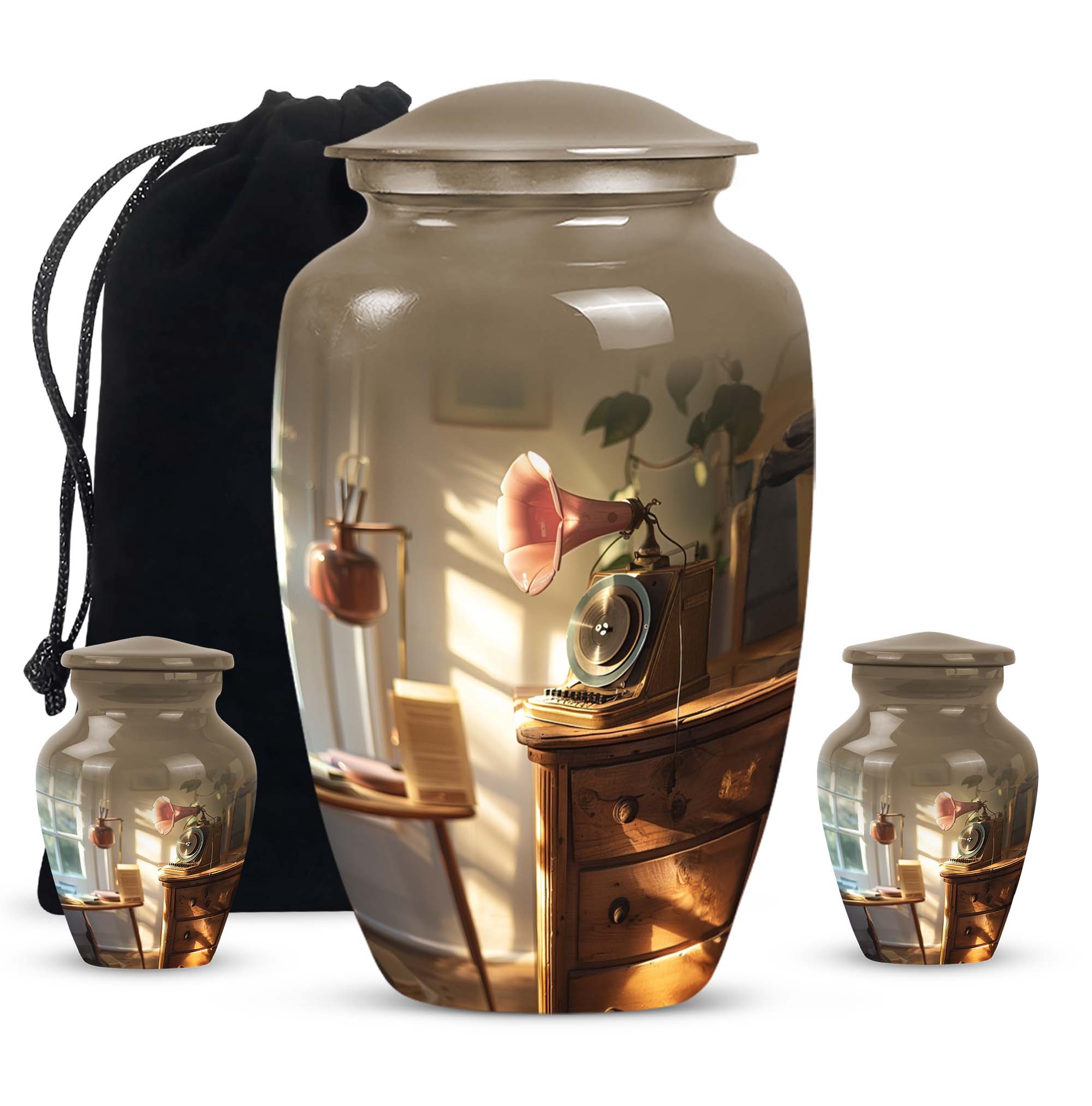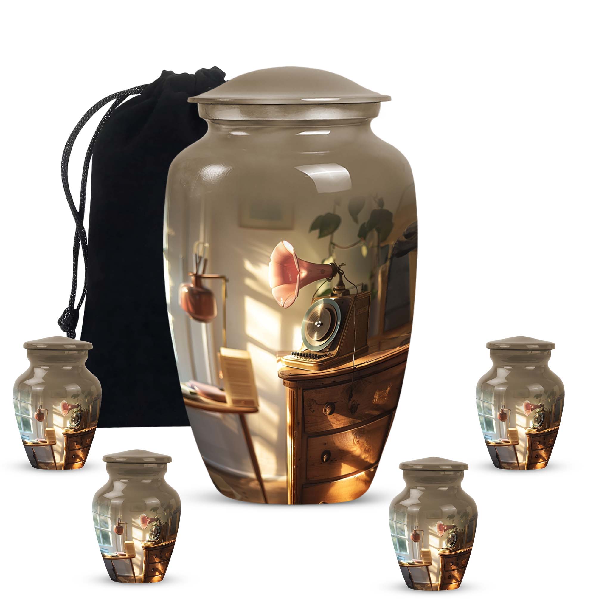 Immerse yourself in honoring departed loved ones with this Gramophone Urn, a sublime symbol of timeless affection. Crafted from durable aluminium, this 10-inch funeral urn for mom is both large and lightweight, weighing in at only 3.3 pounds. Its impressive 200 cubic inch capacity ensures a solumn sanctuary for ashes, just like the eternal bond you shared. The classic urn styling seamlessly blends traditional dignity with a unique gramophone theme, symbolizing continuity amidst change. The package includes a plush velvet pouch, providing an added layer of safe containment for ashes. Further elevate the urn's meaning by personalizing it with engraved names, a tribute as distinct as your love. Ideal for those seeking cremation urns, this beautiful piece transcends mere memorial adult urn or human urn ash adult designations. If you're looking for unique, custom cremation urns with poignant symbolism, add this Gramophone Urn to your list of considerations. Precious sentiments deserve a fitting vessel, and this urn is a testament to enduring love.