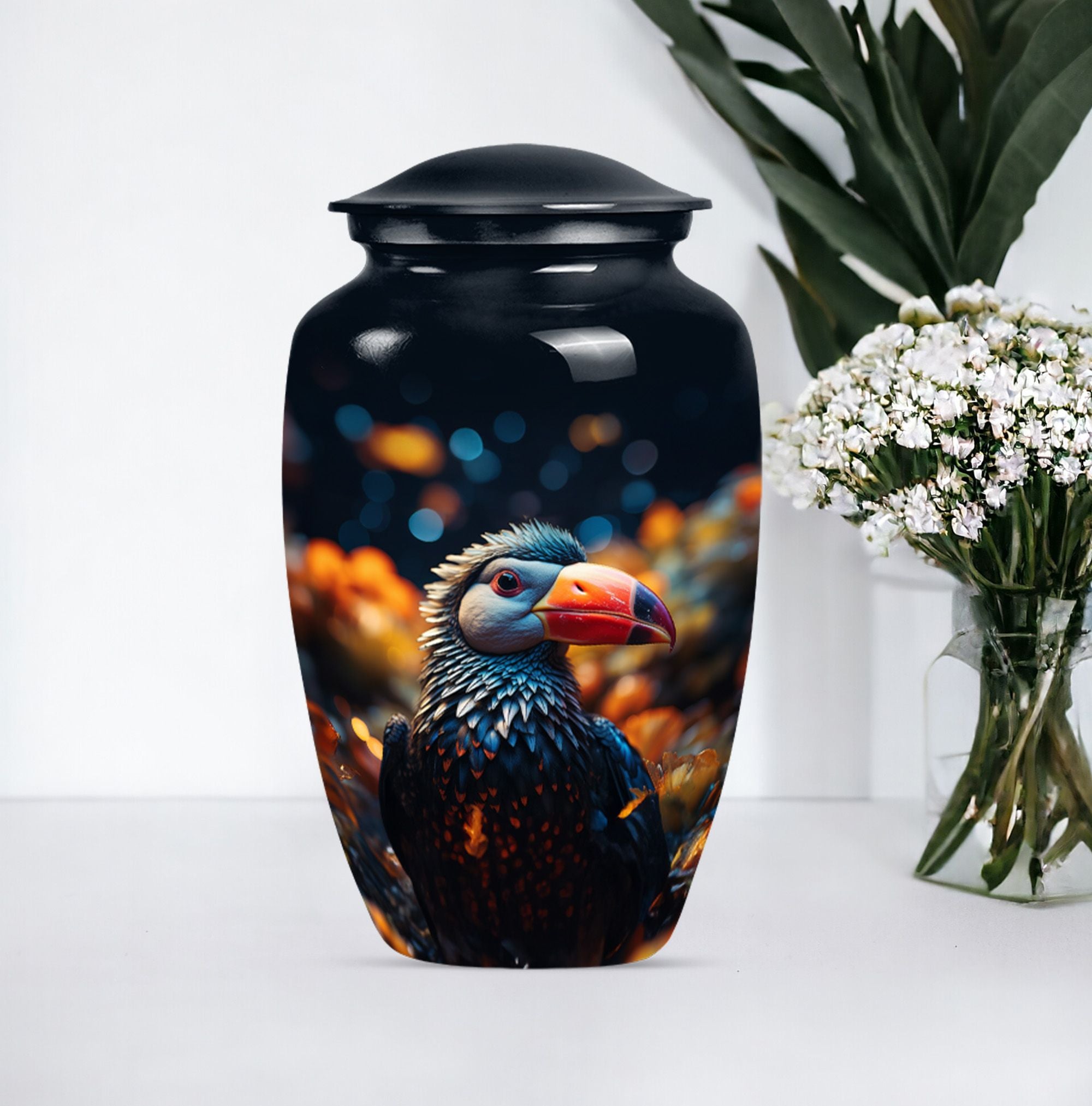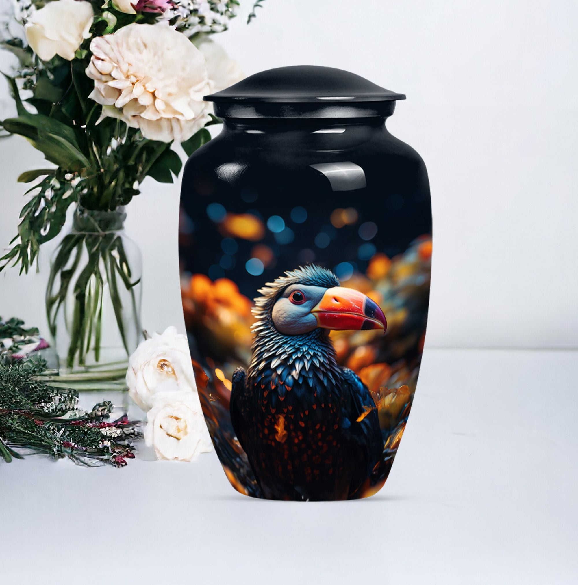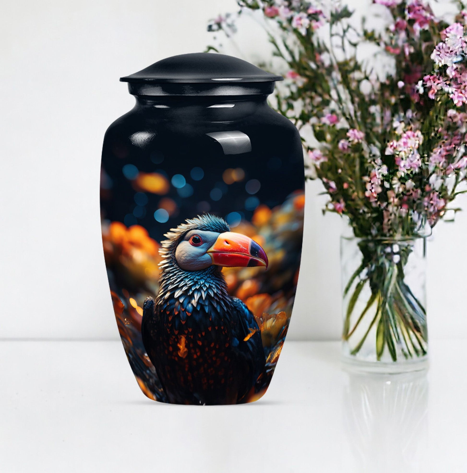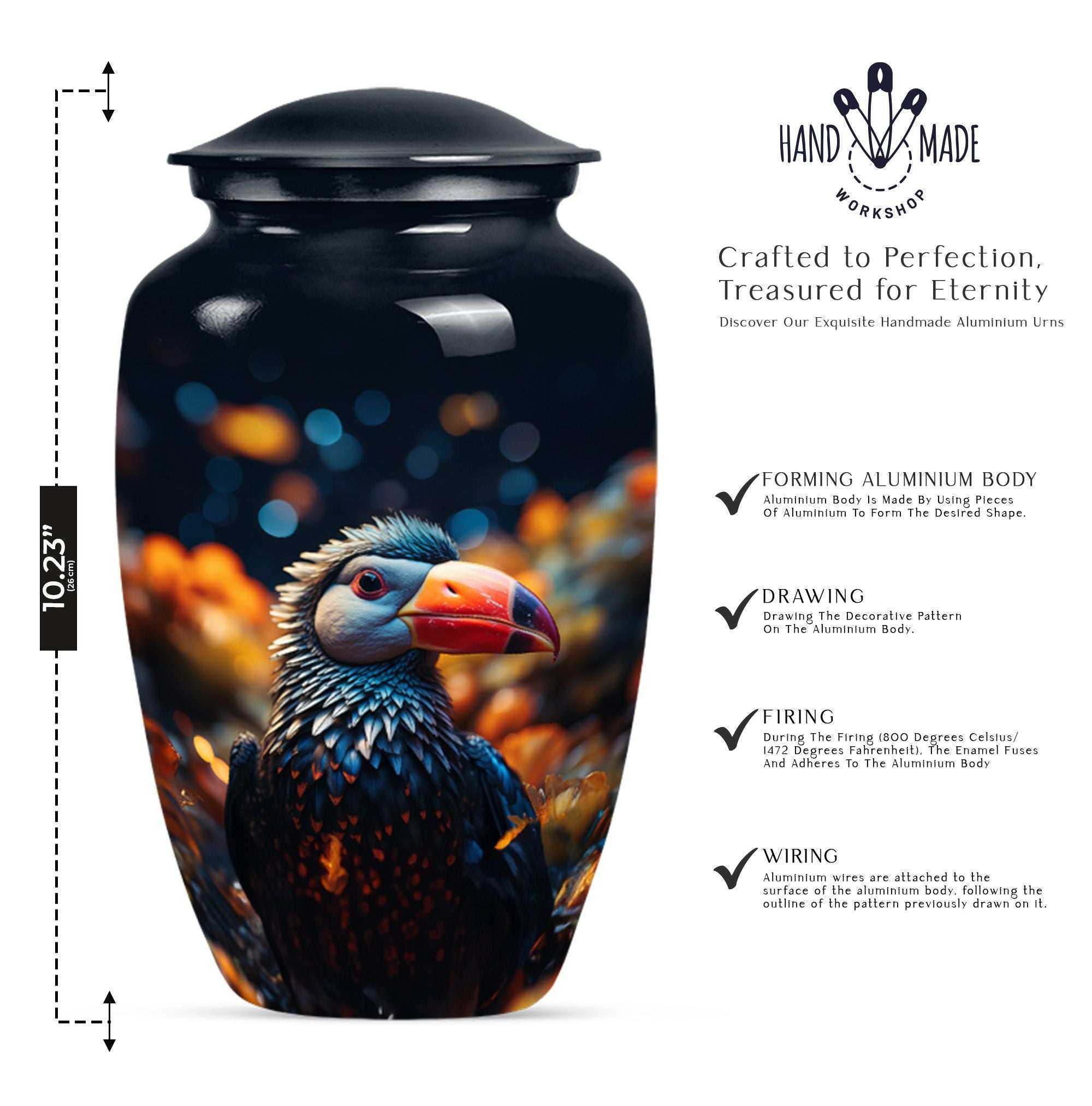 Treasure the memories of your loved ones with our tactfully crafted Toucans Urn, a pronounced choice for 'funeral urns for mom'. The meticulously built 10-inch 'classic urn' is devised to secure your cherished memories while offering an engaging abstract theme. Made from durable aluminium, this urn weighs 3.3 pounds and stands 10 inches high, accommodating up to 200 cubic inches. Our large urn is not limited to mere functionality but also carries an aesthetic appeal suitable for 'memorial urns'. Each urn comes with a complimentary velvet pouch, adding an extra layer of protection for the containment of ashes. To make it truly special and unique, we offer personalization, where names can be intricately engraved. This 'unique urn for ashes' is a perfect fit for those perusing 'metal urns for burial in ground', further catering to searches for 'urns for female' and 'personalized memorial urns'. Elevate your memorial sentiment with our Toucans Urn that combines timeless design, quality and charm.