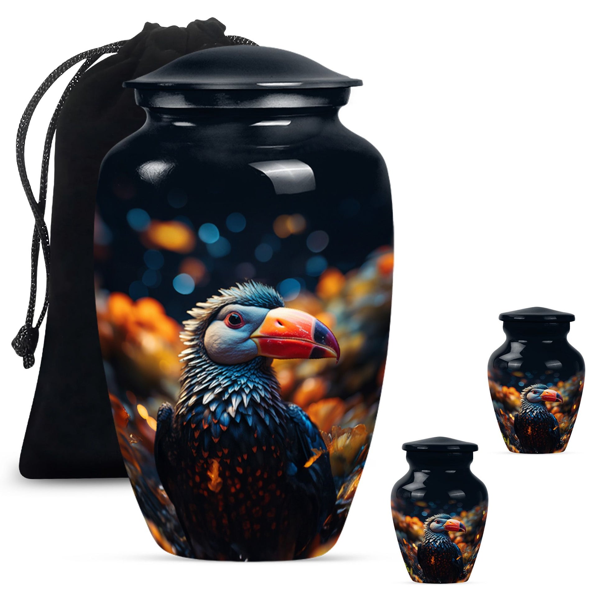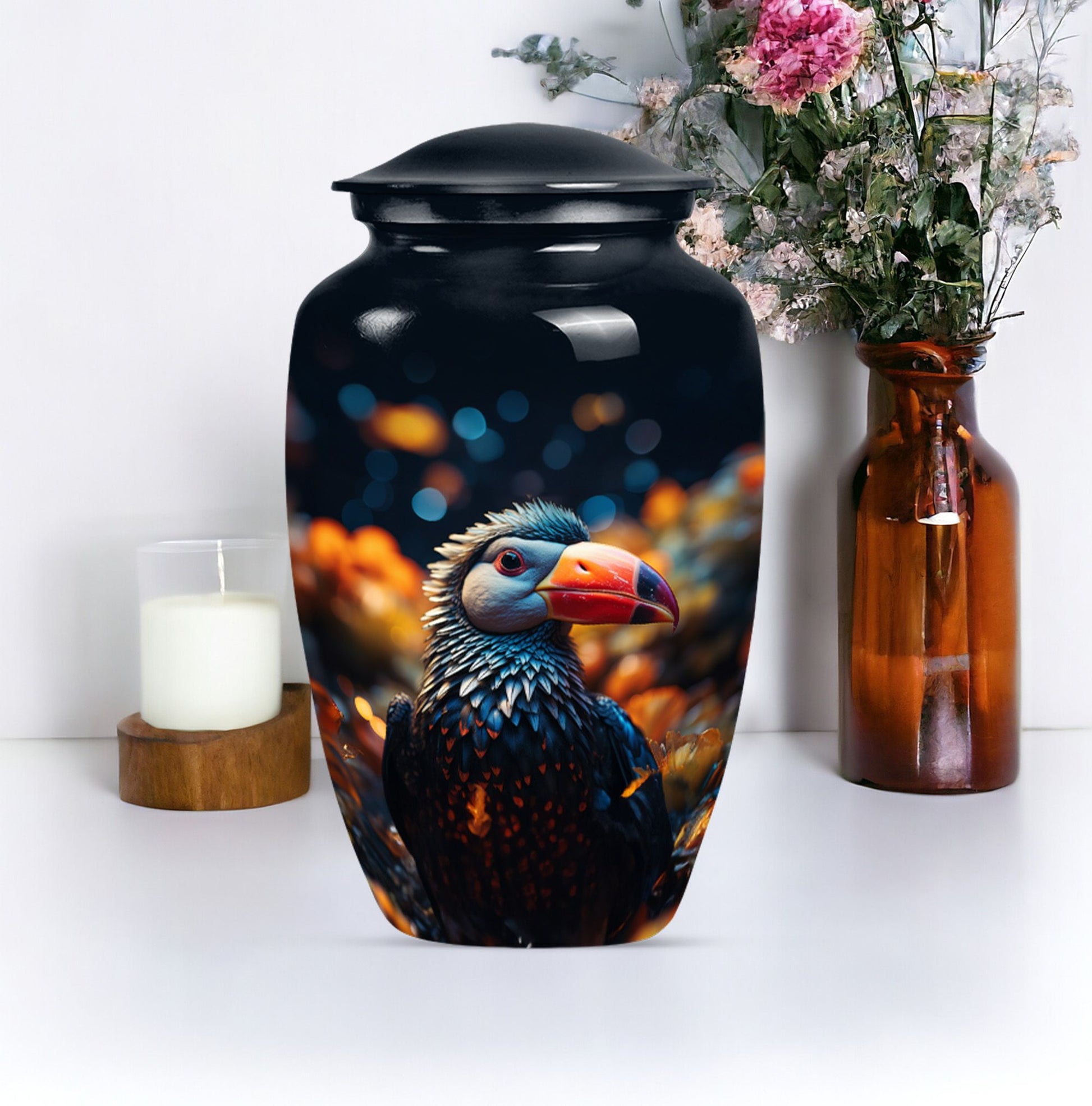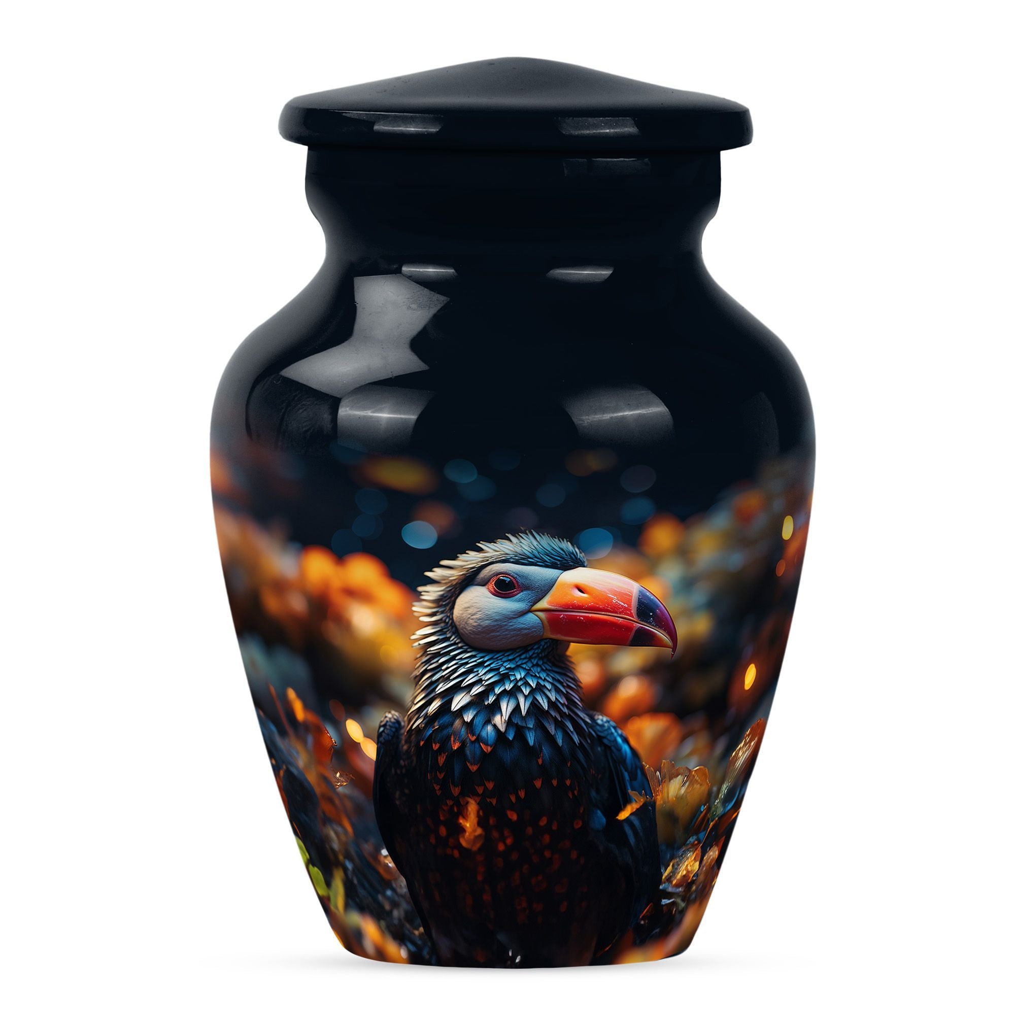 Treasure the memories of your loved ones with our tactfully crafted Toucans Urn, a pronounced choice for 'funeral urns for mom'. The meticulously built 10-inch 'classic urn' is devised to secure your cherished memories while offering an engaging abstract theme. Made from durable aluminium, this urn weighs 3.3 pounds and stands 10 inches high, accommodating up to 200 cubic inches. Our large urn is not limited to mere functionality but also carries an aesthetic appeal suitable for 'memorial urns'. Each urn comes with a complimentary velvet pouch, adding an extra layer of protection for the containment of ashes. To make it truly special and unique, we offer personalization, where names can be intricately engraved. This 'unique urn for ashes' is a perfect fit for those perusing 'metal urns for burial in ground', further catering to searches for 'urns for female' and 'personalized memorial urns'. Elevate your memorial sentiment with our Toucans Urn that combines timeless design, quality and charm.