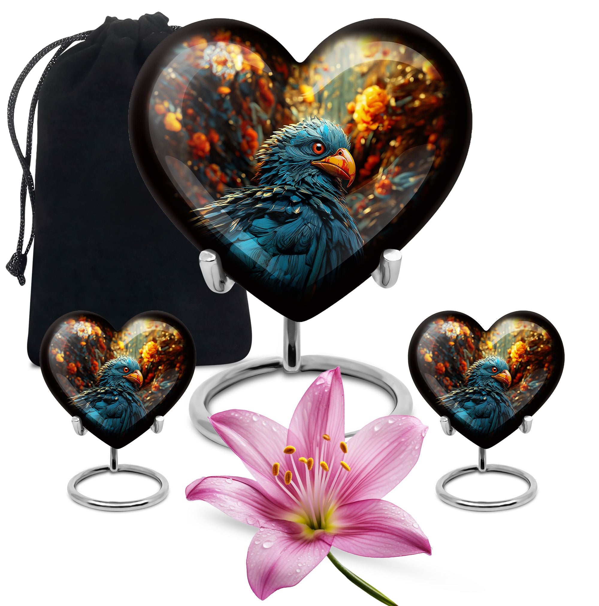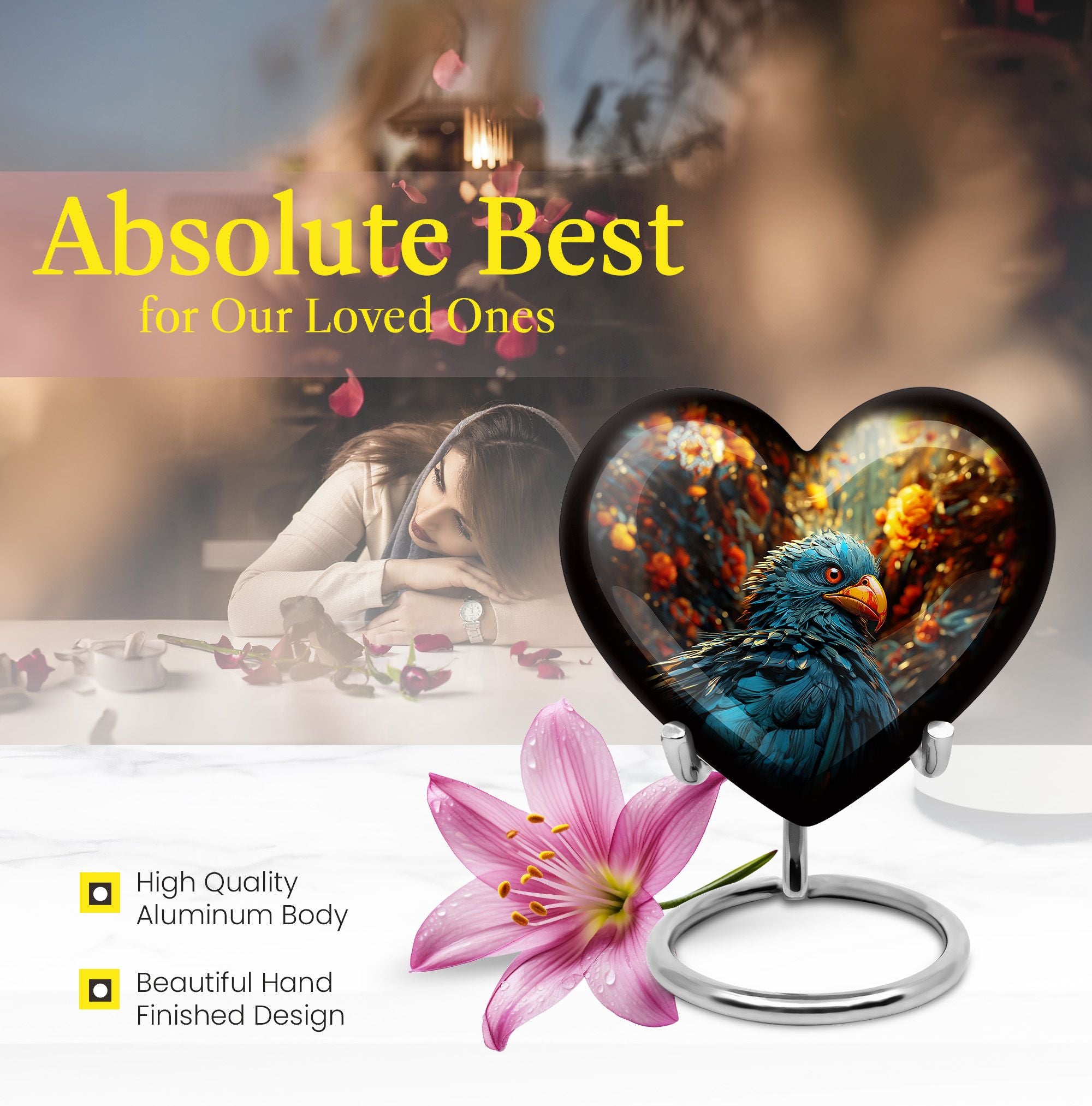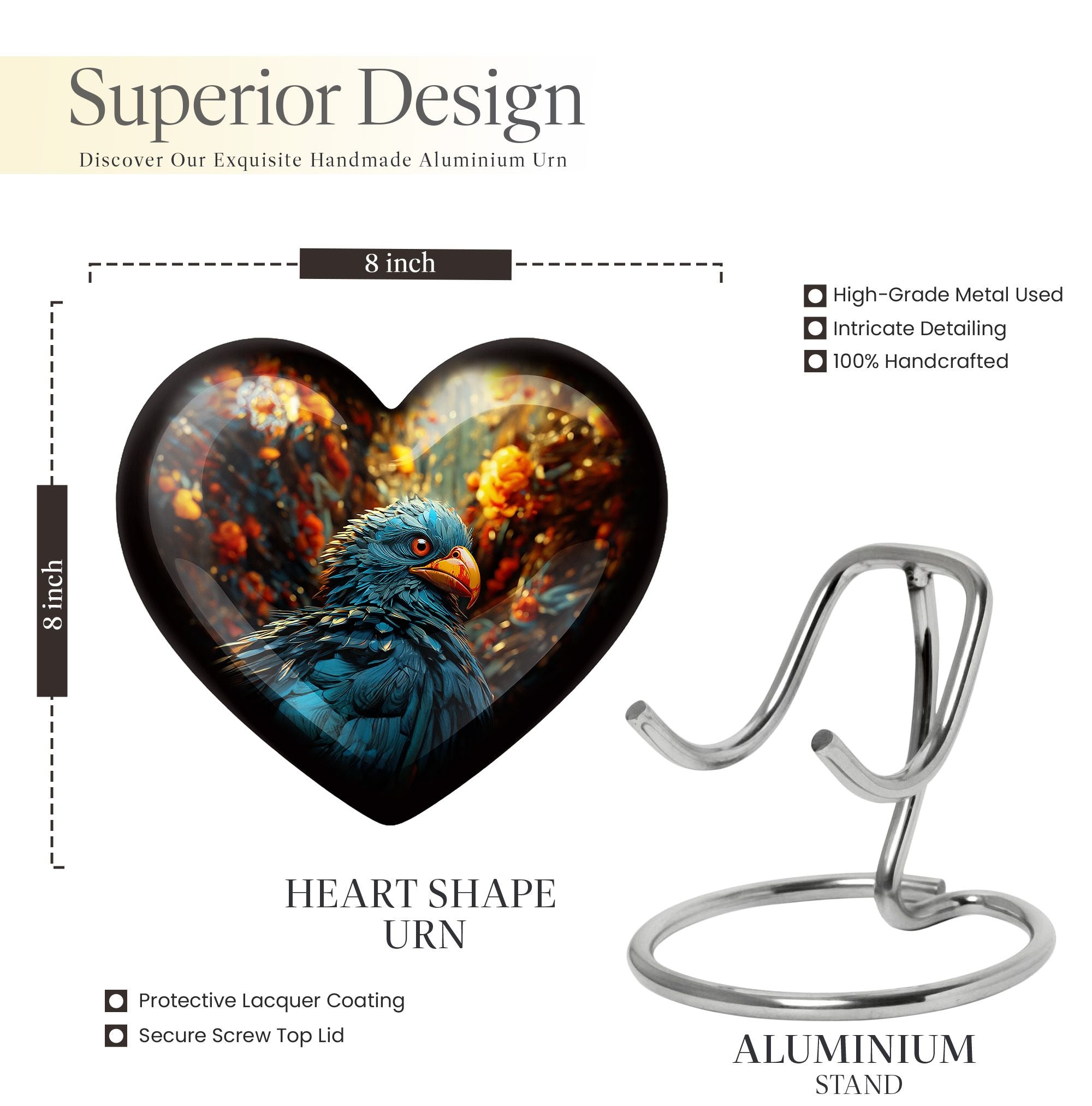 Honor your loved ones with our uniquely crafted Toucans Heart Urn. This large urn, standing at a height of 10 inches, offers a capacity of 200 cubic inches, making it an apt choice to keep the precious ashes of your loved ones. It is made from quality Aluminium, ensuring robustness and longevity. Each urn weighs 3.3 pounds, embodying sturdiness and reliability. Its abstract theme lends it a distinctive look and feel, conveying a sense of tasteful artistry. A velvet pouch in the package adds a discreet layer of coverage for the ashes. Customize your urn with engraved names, making it deeply personal and memorable. Ideal for adults and seniors looking for memorial urns for ashes, funeral metal urn, and cremation urn. A fitting tribute and a beacon for remembrance, 'urns for burial' and 'shaped ashes urn' define its purpose.