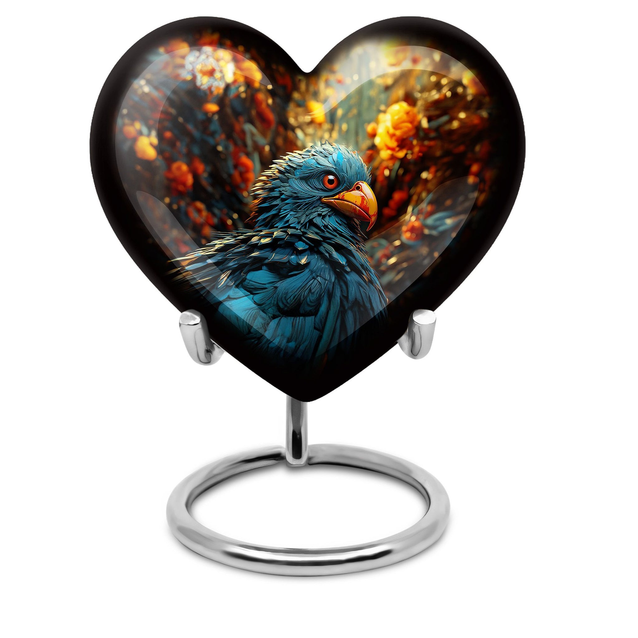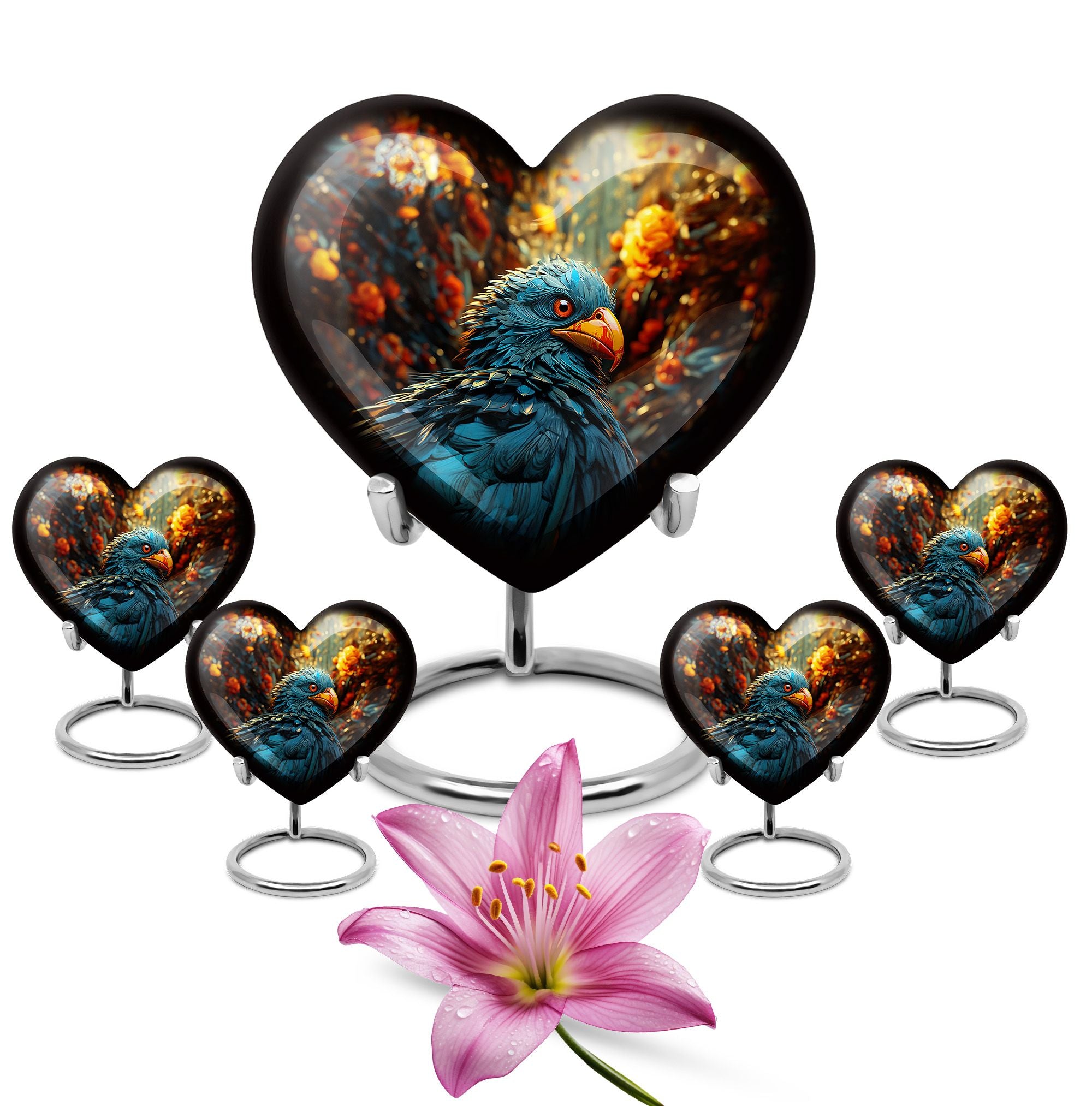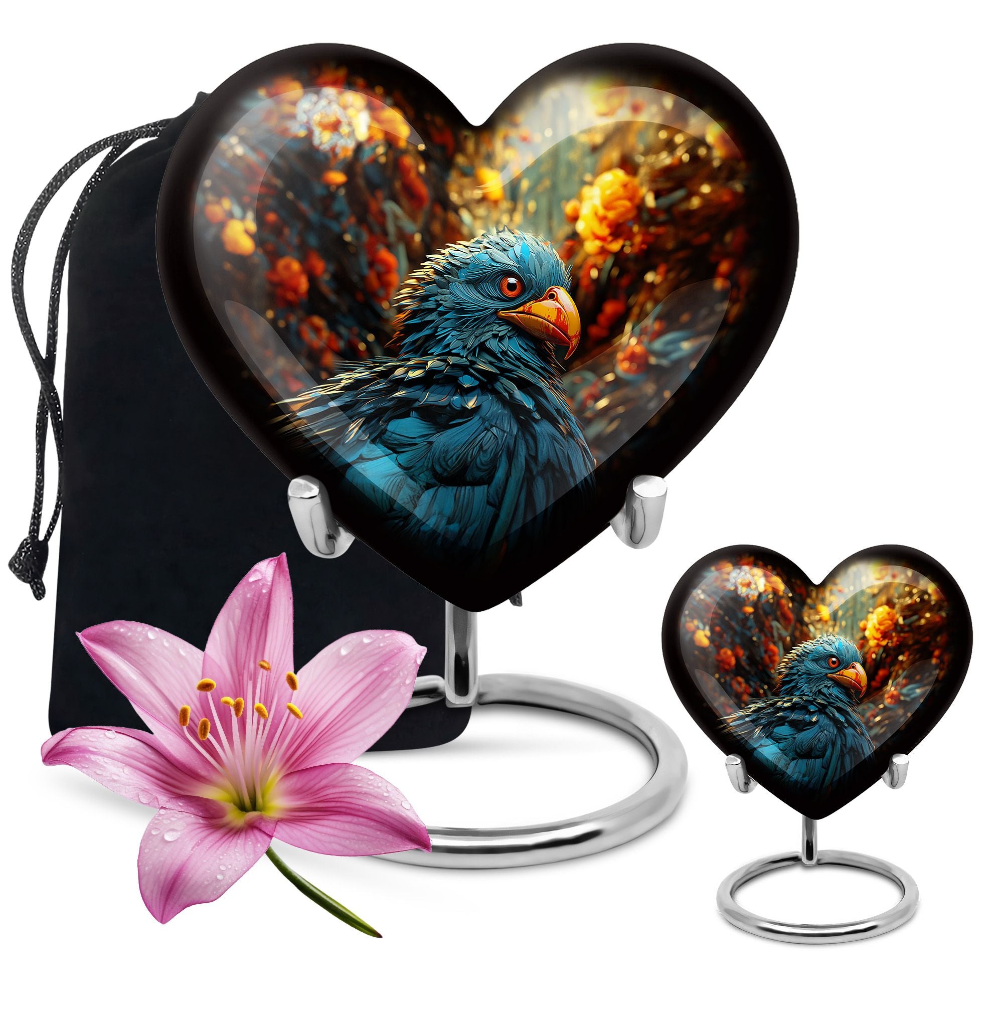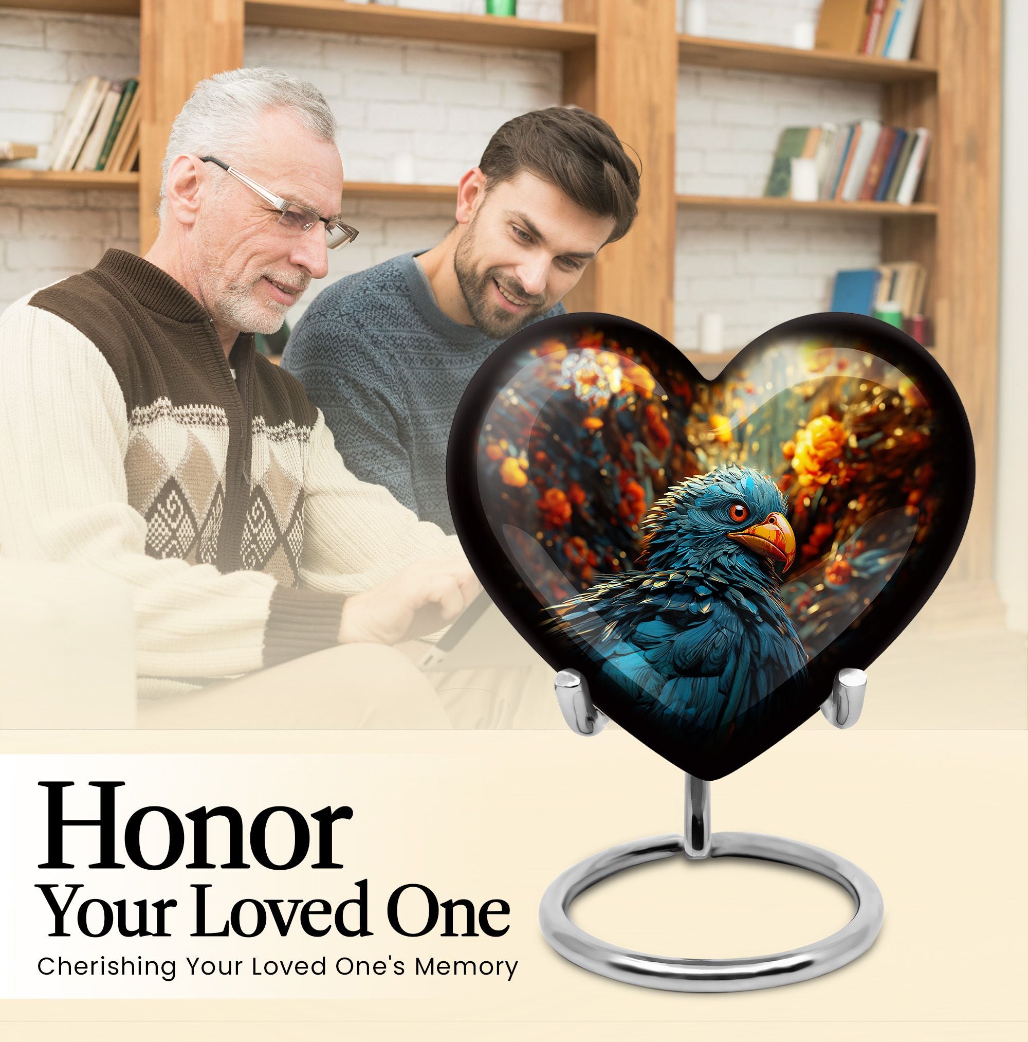 Honor your loved ones with our uniquely crafted Toucans Heart Urn. This large urn, standing at a height of 10 inches, offers a capacity of 200 cubic inches, making it an apt choice to keep the precious ashes of your loved ones. It is made from quality Aluminium, ensuring robustness and longevity. Each urn weighs 3.3 pounds, embodying sturdiness and reliability. Its abstract theme lends it a distinctive look and feel, conveying a sense of tasteful artistry. A velvet pouch in the package adds a discreet layer of coverage for the ashes. Customize your urn with engraved names, making it deeply personal and memorable. Ideal for adults and seniors looking for memorial urns for ashes, funeral metal urn, and cremation urn. A fitting tribute and a beacon for remembrance, 'urns for burial' and 'shaped ashes urn' define its purpose.