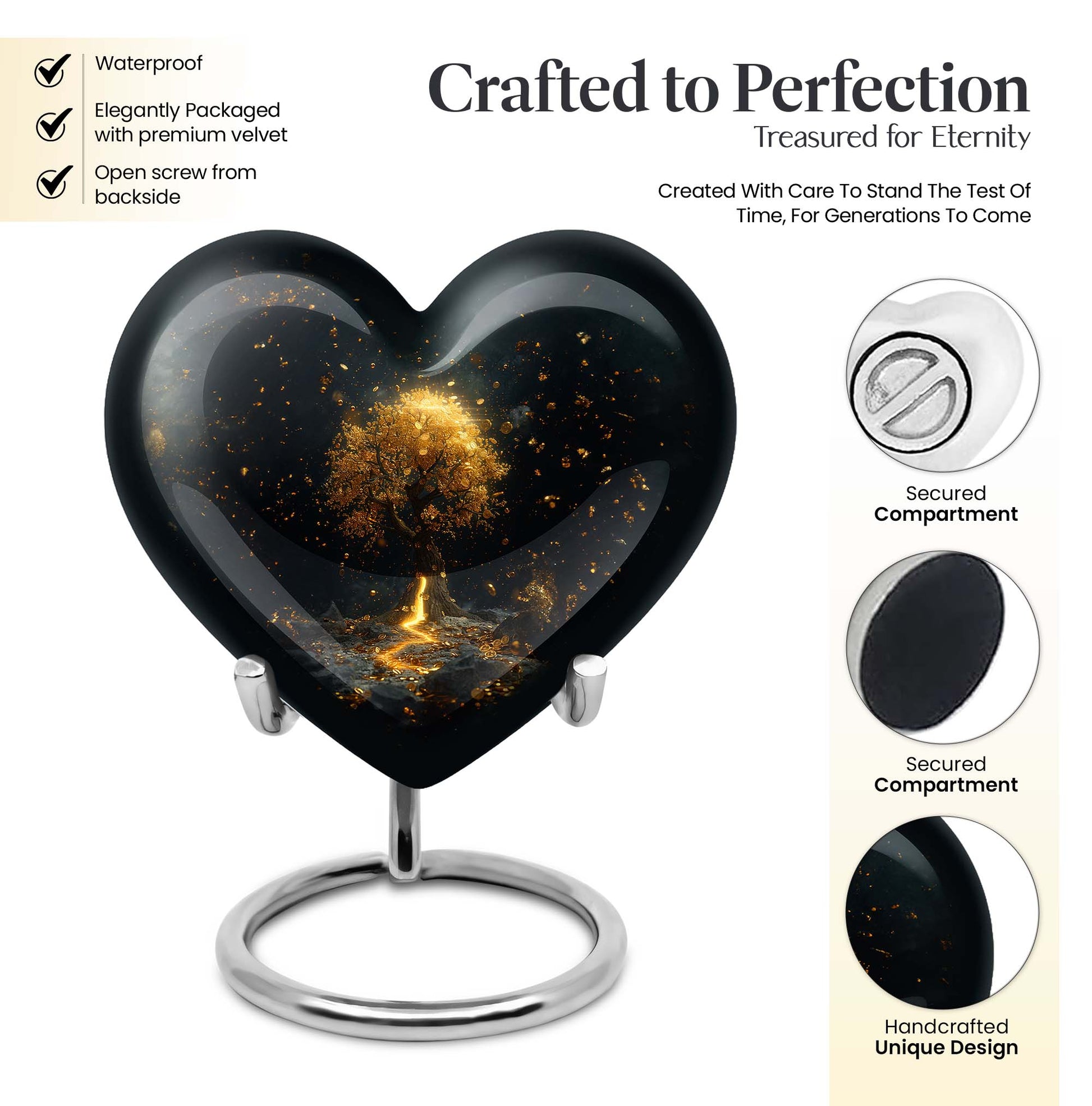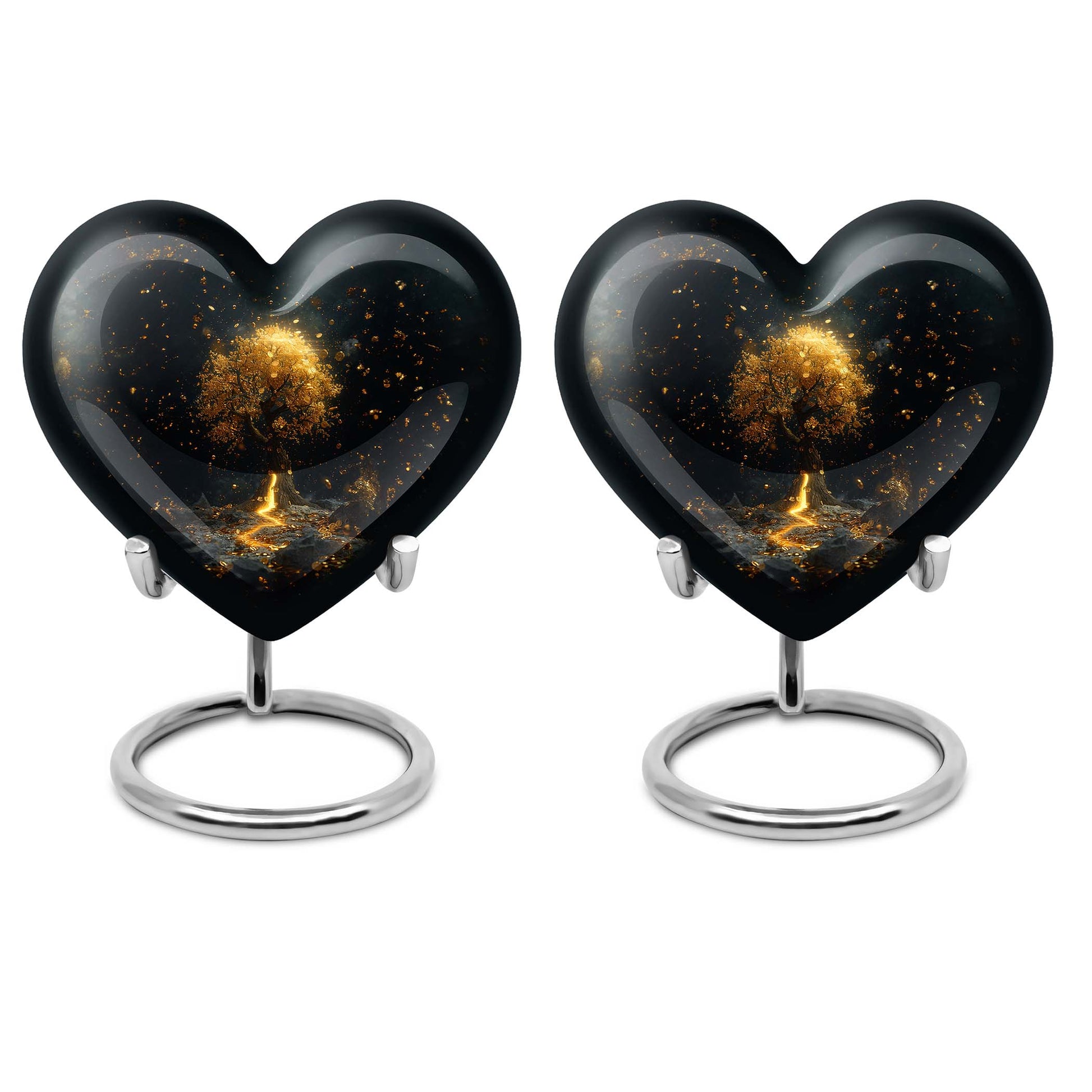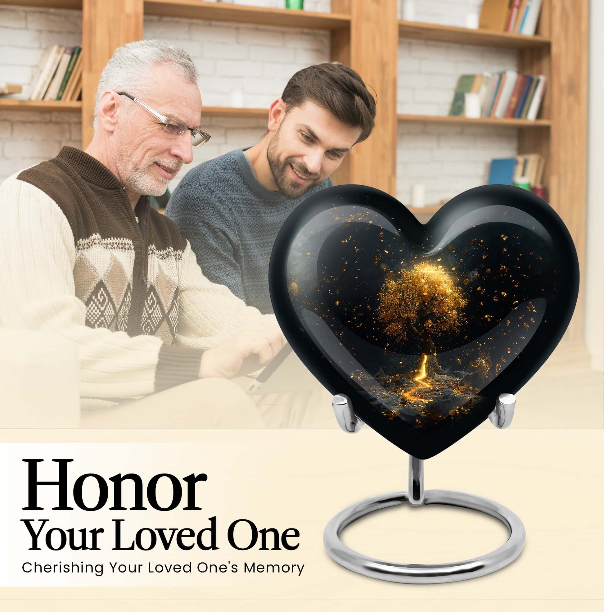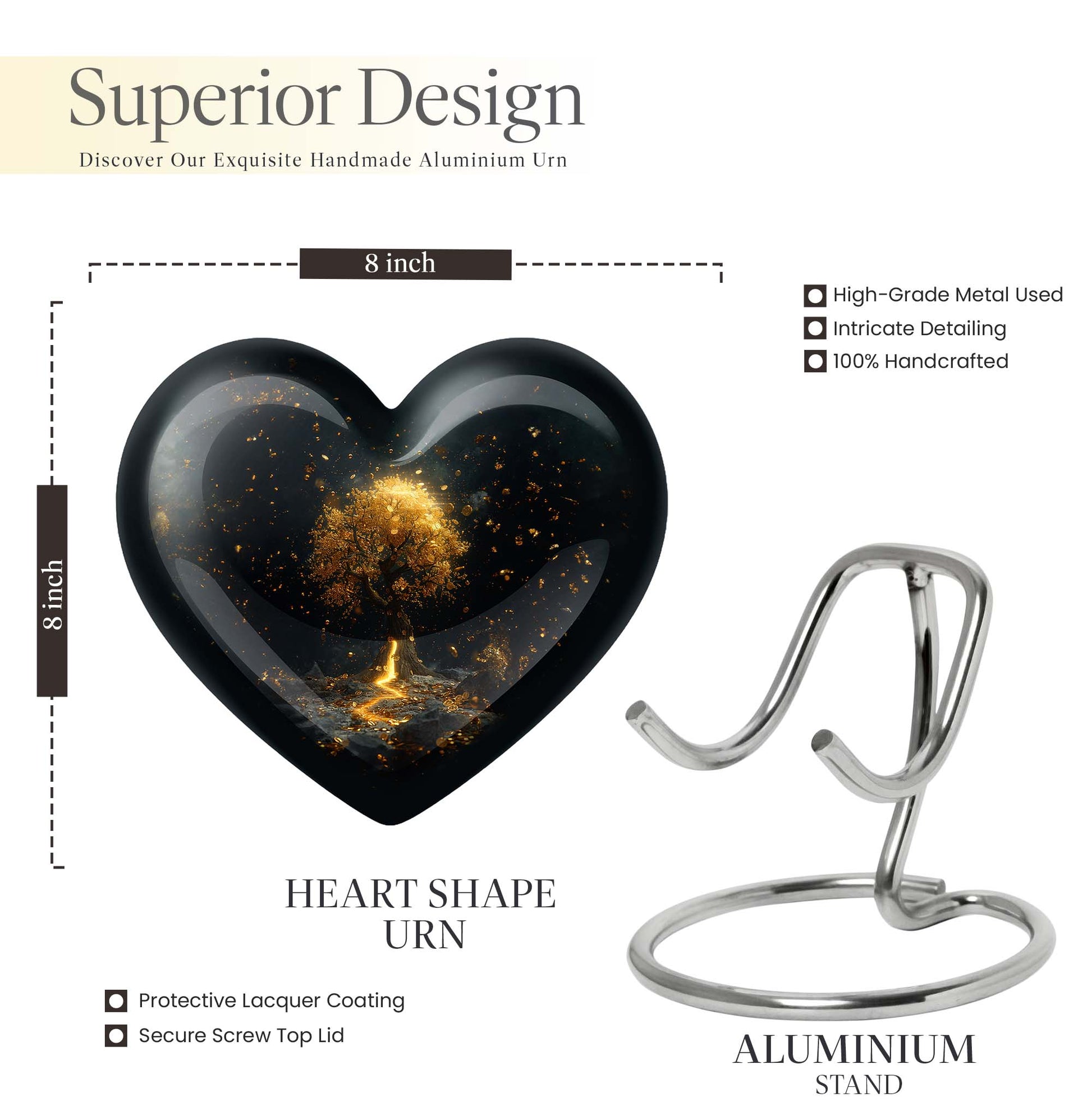 Honor your departed loved one's memory in a meaningful way with the Abstract 10-inch 'Heart Urn' - a symbol of the circle of life and the eternal nature of love. Crafted from robust, high-quality aluminium, our large 'tree of life urn' weighs a substantial 3.3 pounds and stands 10 inches tall. With a capacity of 200 cubic inches, it comfortably holds the ashes of an adult. Its unique 'heart urn' design provides a sense of warmth and comfort during the toughest of times. Personalize this burial ashes urn with engraved names, truly making it a one-of-a-kind tribute. The urn is accompanied by a soft velvet pouch, providing a secure and respectable containment for the ashes. Search phrases that relate to this product encompass 'cremation urns for adult ashes', 'funeral urns', and 'urns for cremation ashes'. This urn embodies the perfect balance between aesthetics and functionality, offering a long-lasting, memorable resting place for your beloved.
