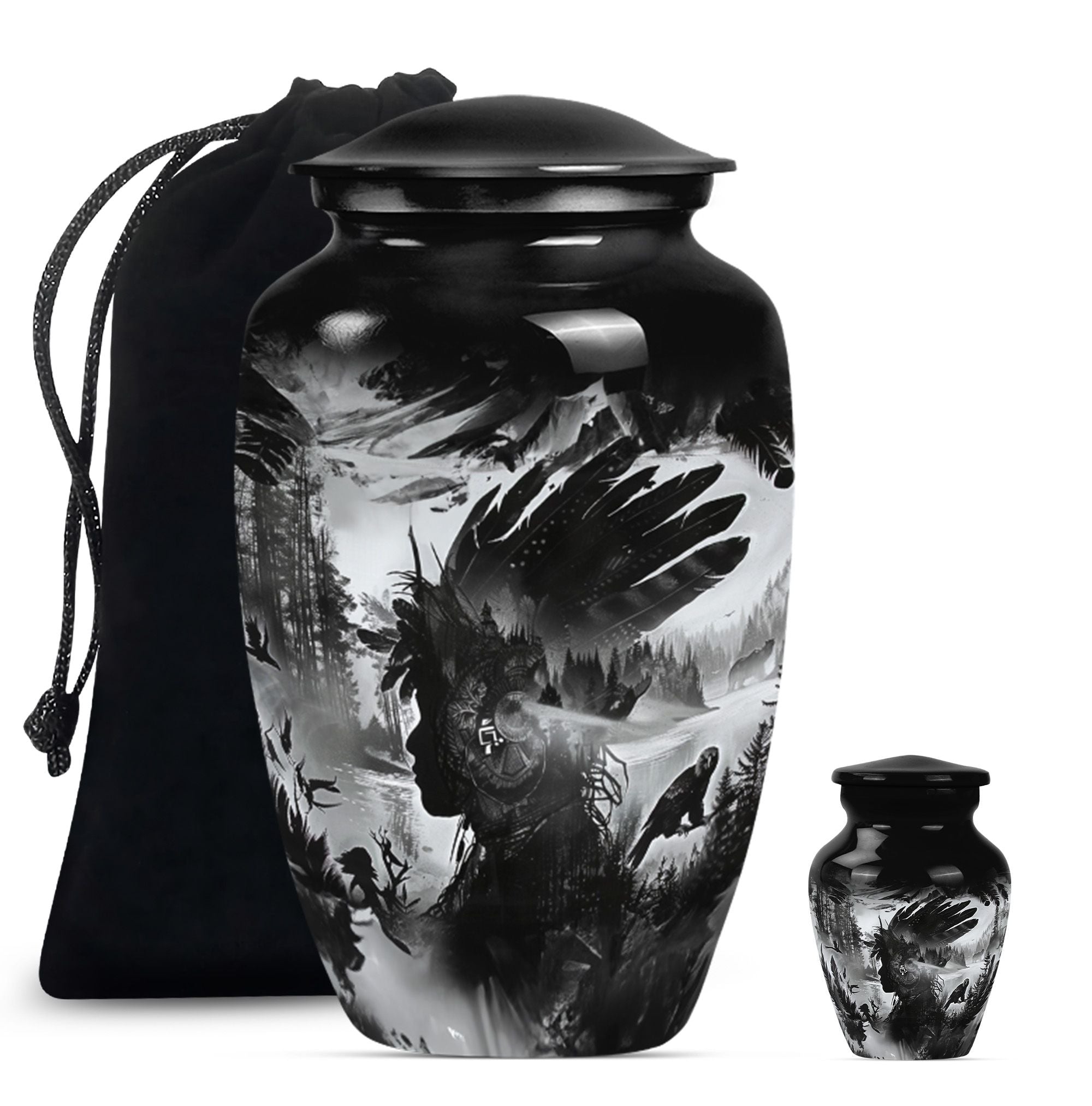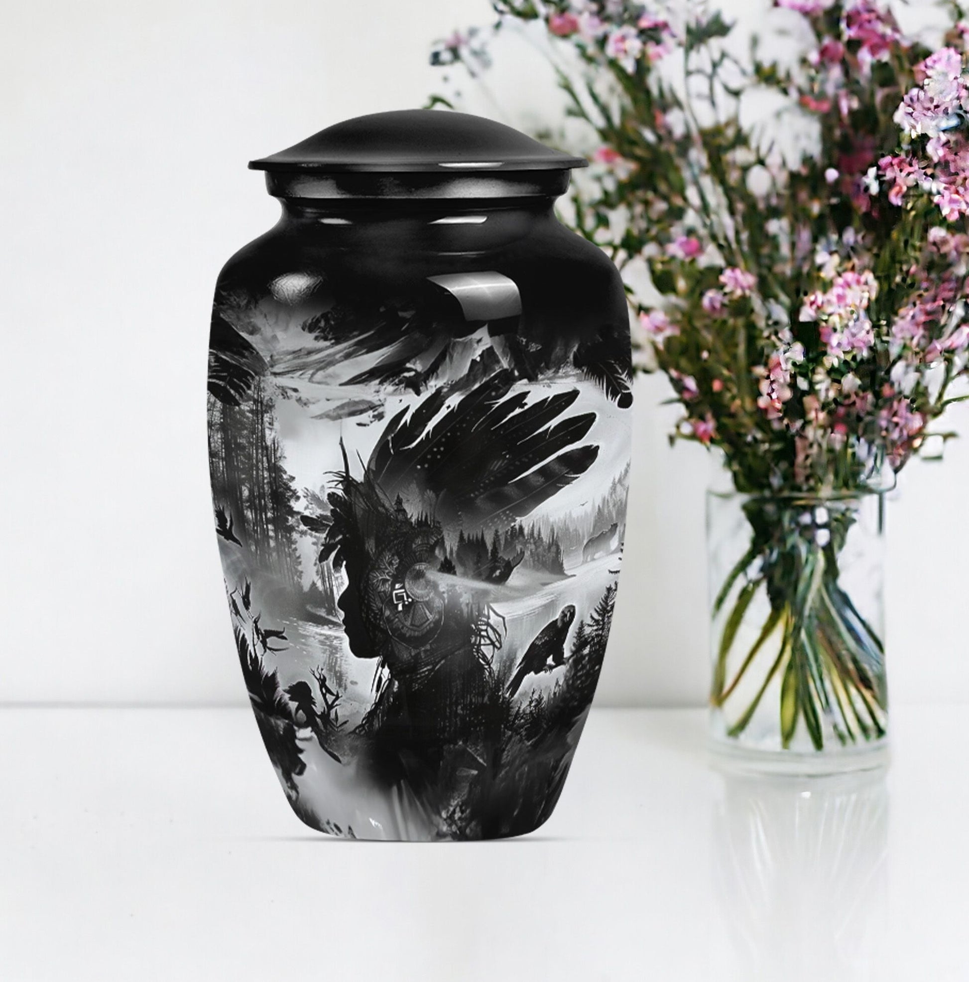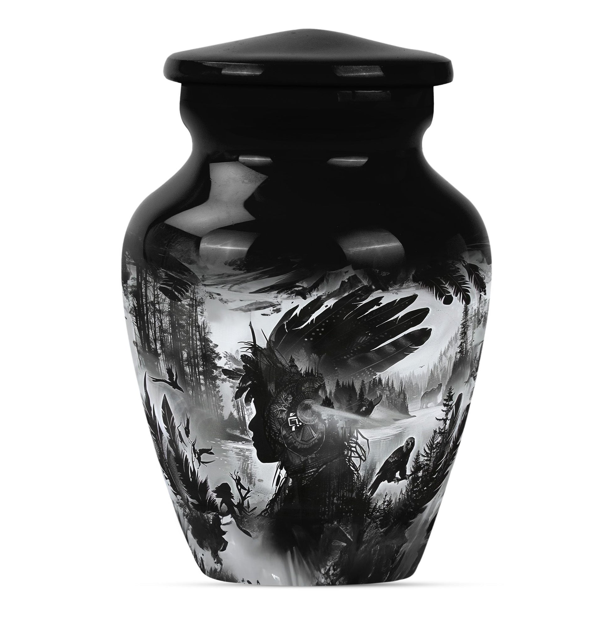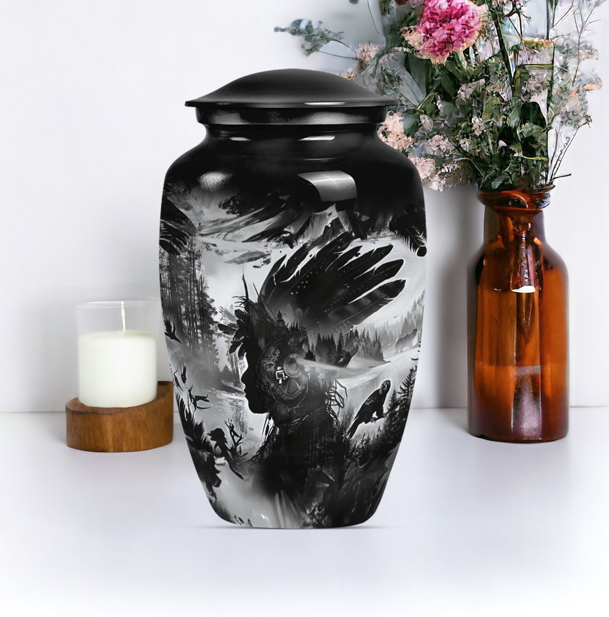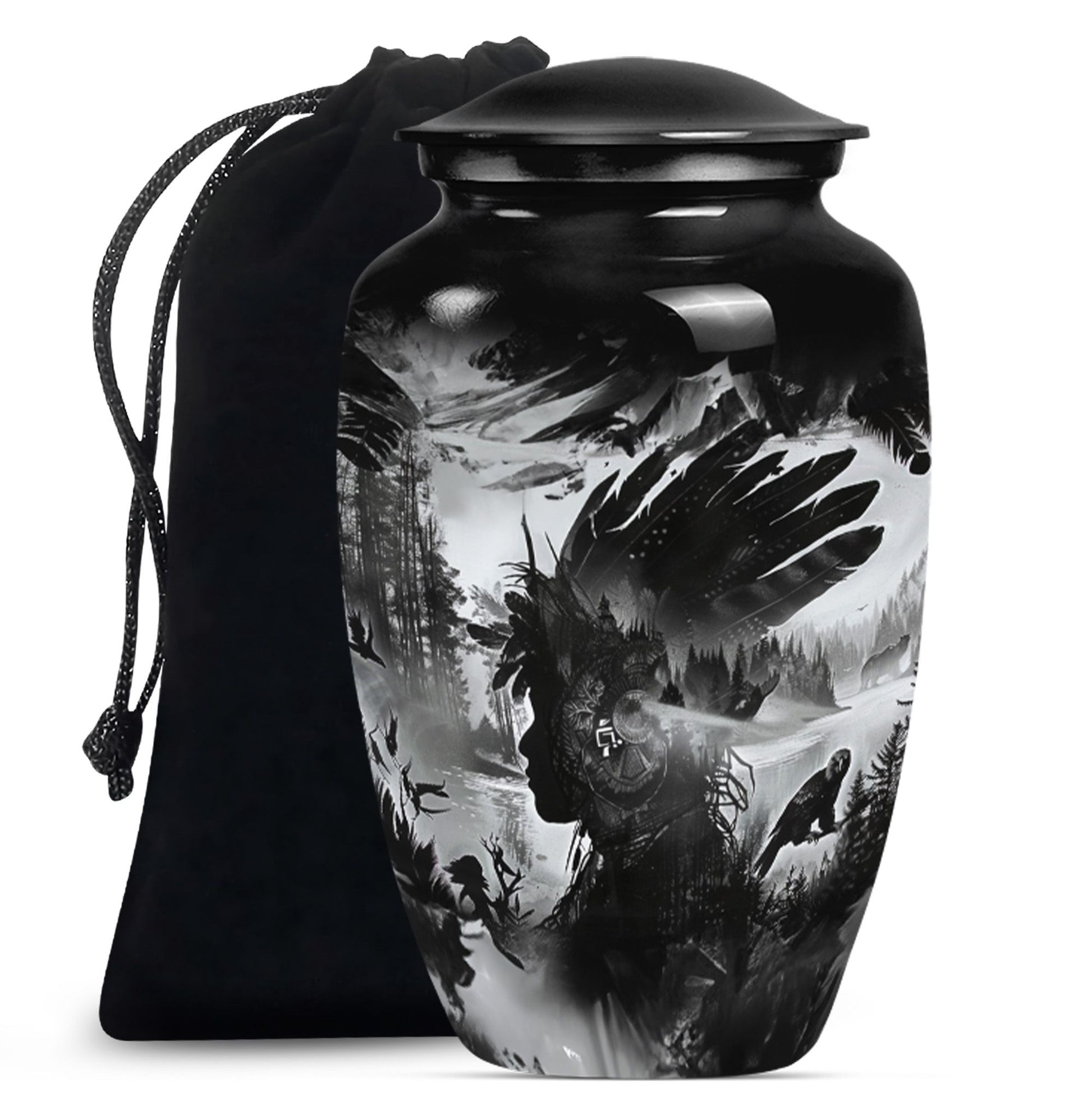 Our Tribe Man Urn is a sophisticated and resilient memorial piece, thoughtfully crafted from premium aluminium. Perfect for seniors and adults who require the security of long-lasting cremation urns for human ashes, this urn boasts an ample capacity of 200 cubic inches. Its dimensions stand at an imposing 10 inches height, and it weighs a sturdy 3.3 pounds, giving it a commanding presence in any remembrance space. The design infuses the raw power of the Wolf Howling theme, engendering a symbol of strength and resilience. Each Classic Urn is large enough to house the ashes of an adult male or female. The 10-inch urn comes with a velvet pouch for the containment and protection of the ashes. It offers an added layer of personalization by allowing for engraving names. Whether both for burial medium size urns or as a striking funeral piece for human ashes, our Tribe Man Urn is an enthralling tribute to loved ones lost. It embodies the essence of memorial urns and stands head and shoulders above regular, adult size urns.