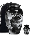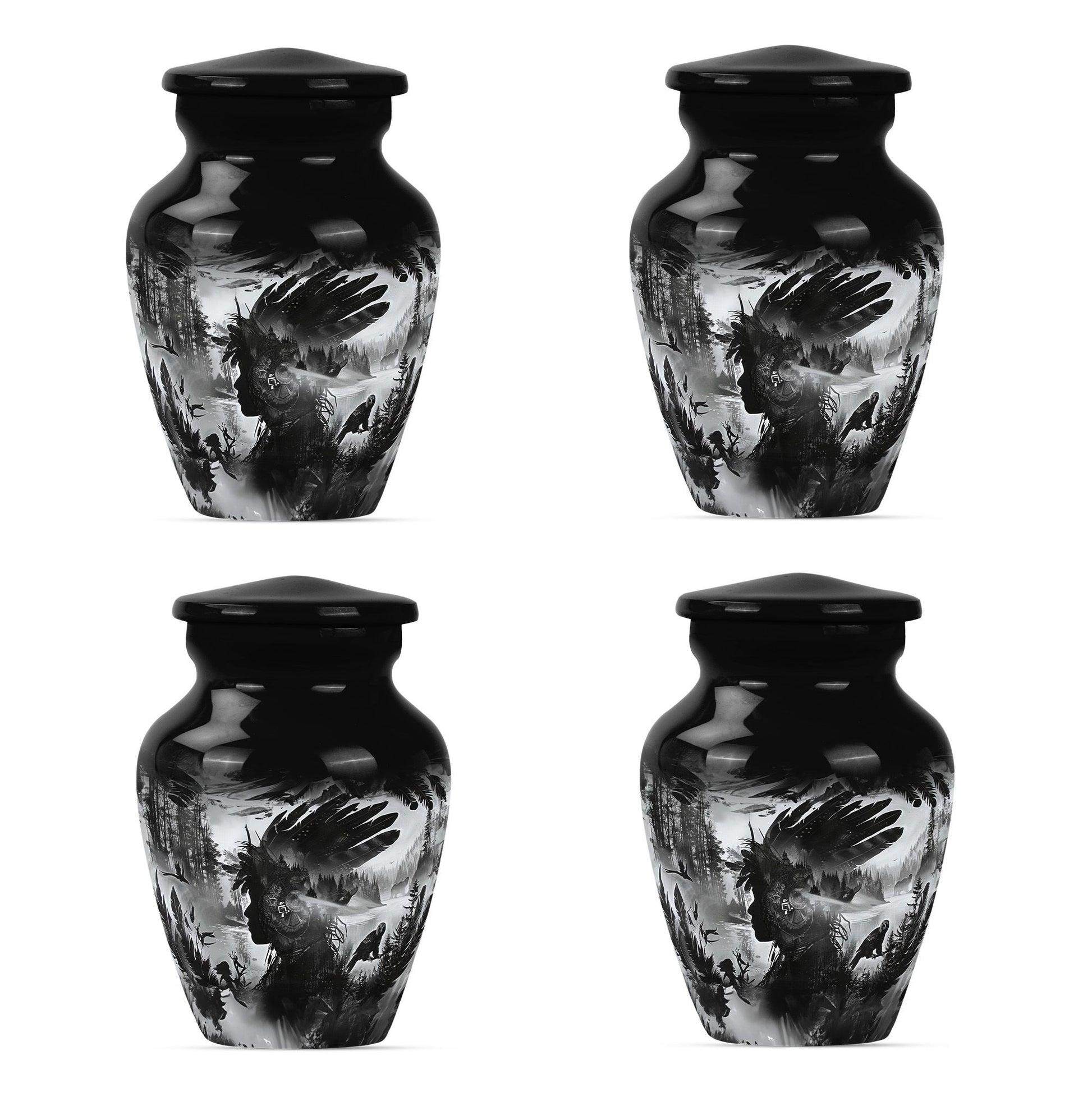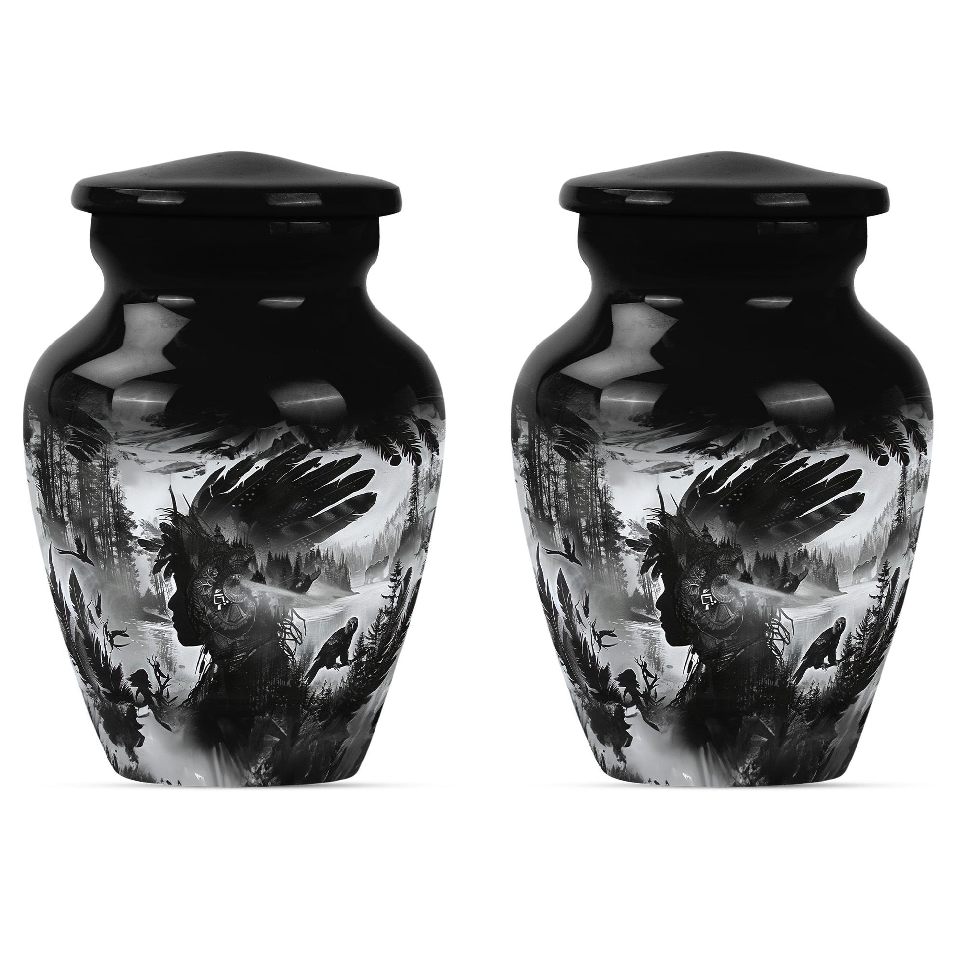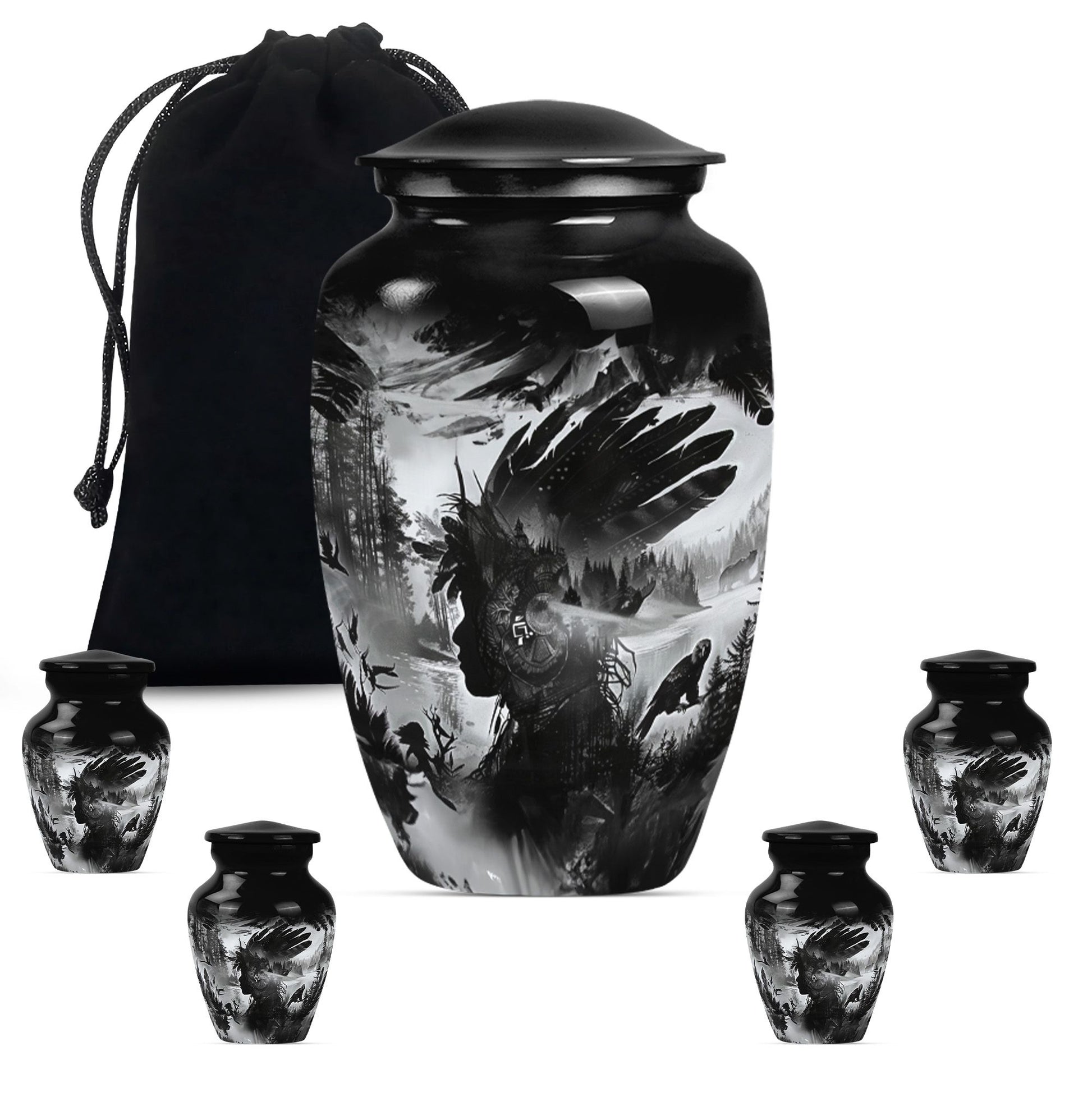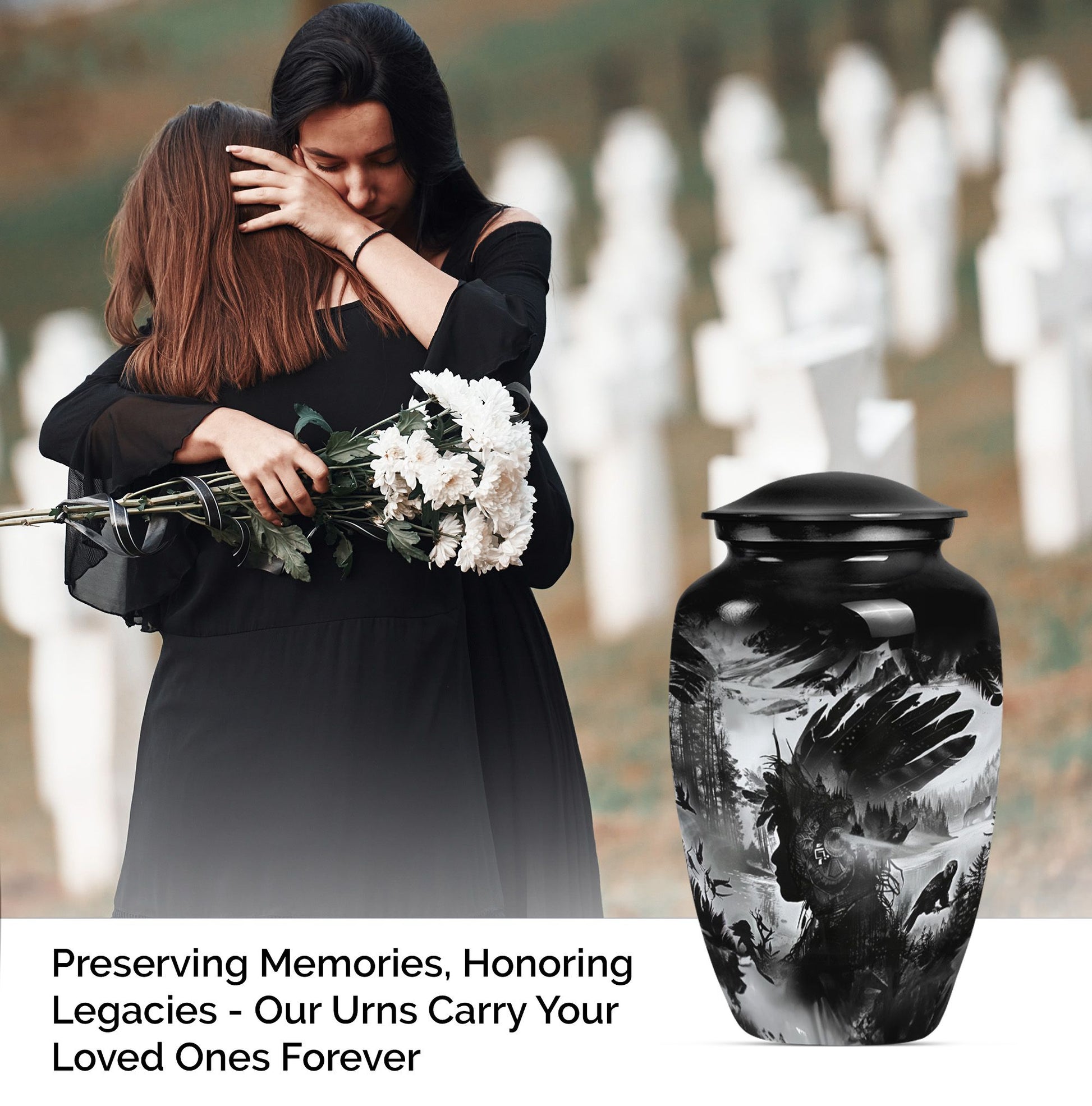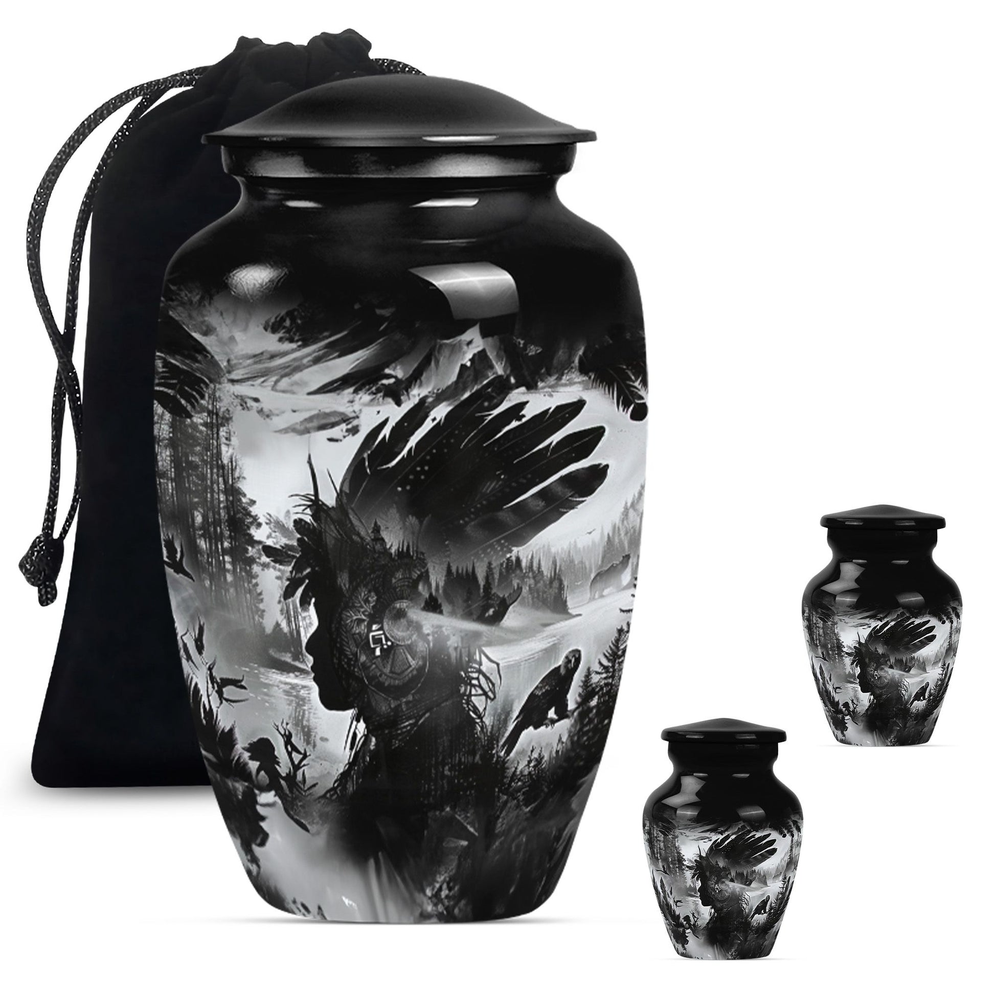 Our Tribe Man Urn is a sophisticated and resilient memorial piece, thoughtfully crafted from premium aluminium. Perfect for seniors and adults who require the security of long-lasting cremation urns for human ashes, this urn boasts an ample capacity of 200 cubic inches. Its dimensions stand at an imposing 10 inches height, and it weighs a sturdy 3.3 pounds, giving it a commanding presence in any remembrance space. The design infuses the raw power of the Wolf Howling theme, engendering a symbol of strength and resilience. Each Classic Urn is large enough to house the ashes of an adult male or female. The 10-inch urn comes with a velvet pouch for the containment and protection of the ashes. It offers an added layer of personalization by allowing for engraving names. Whether both for burial medium size urns or as a striking funeral piece for human ashes, our Tribe Man Urn is an enthralling tribute to loved ones lost. It embodies the essence of memorial urns and stands head and shoulders above regular, adult size urns.