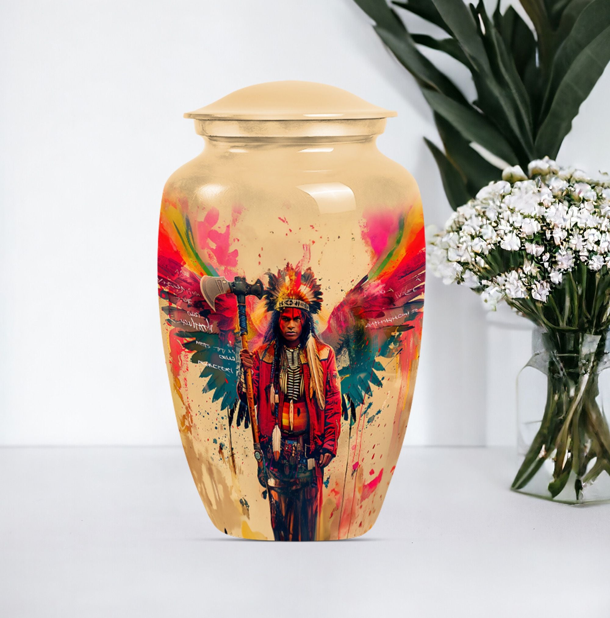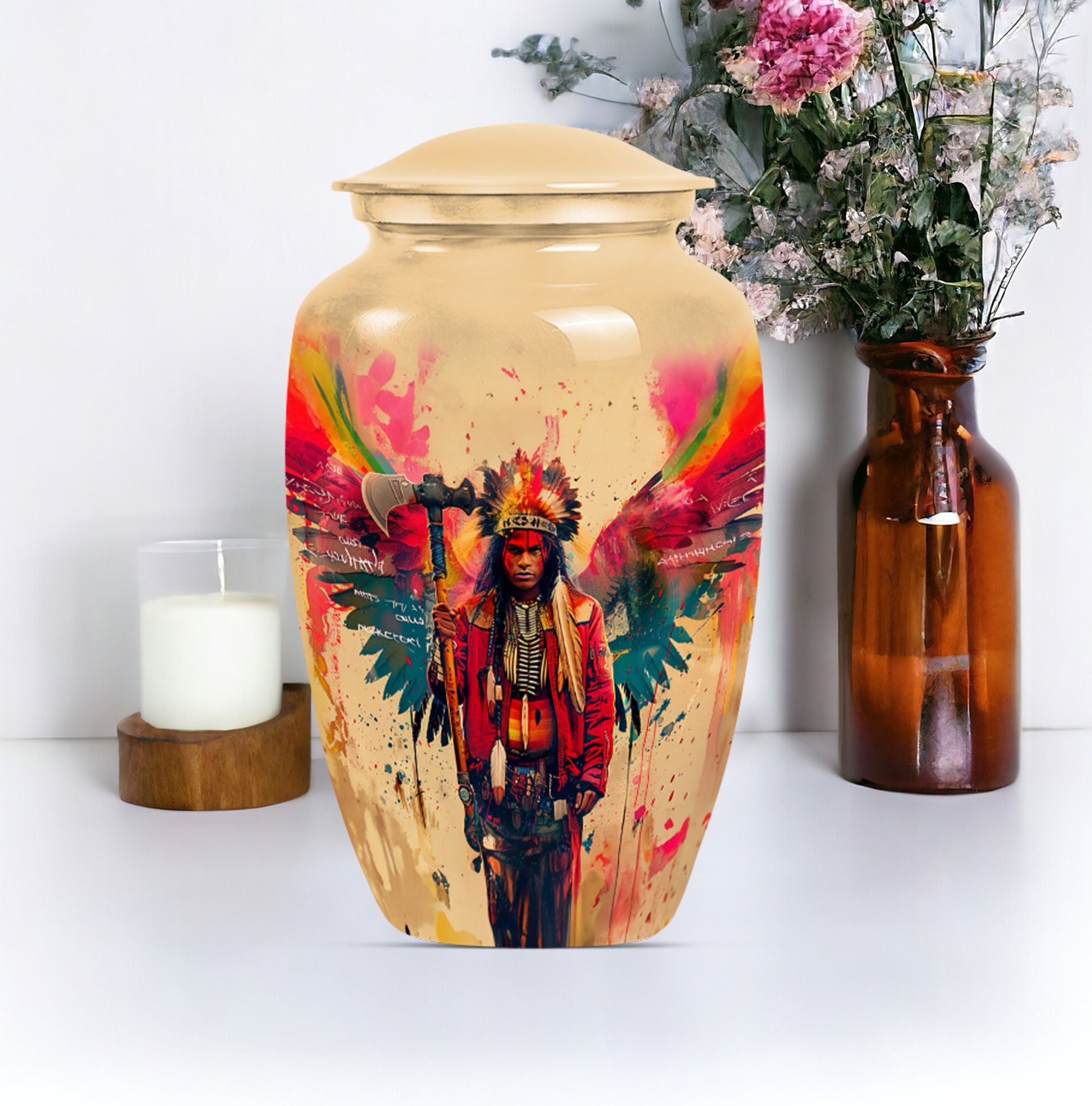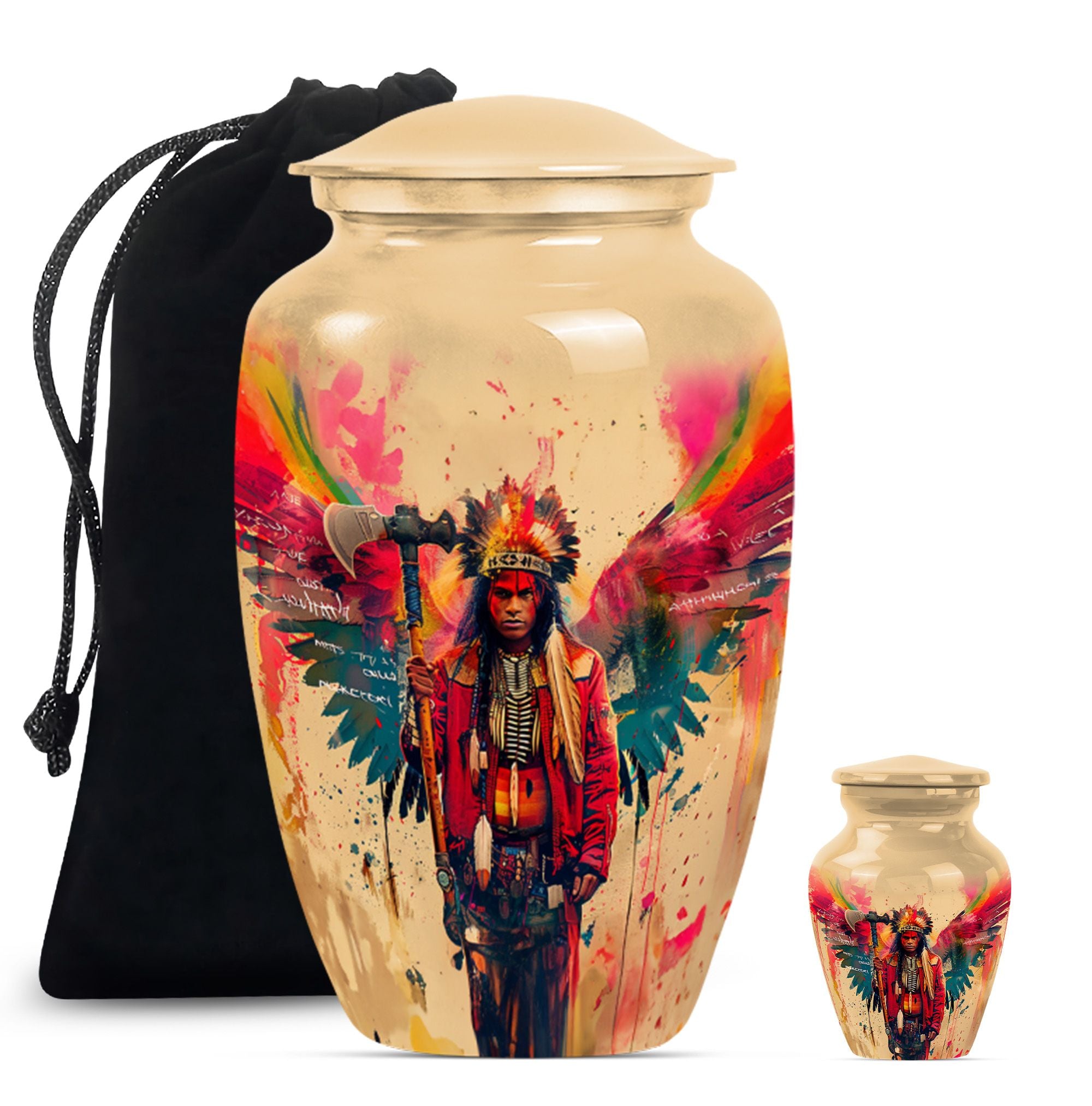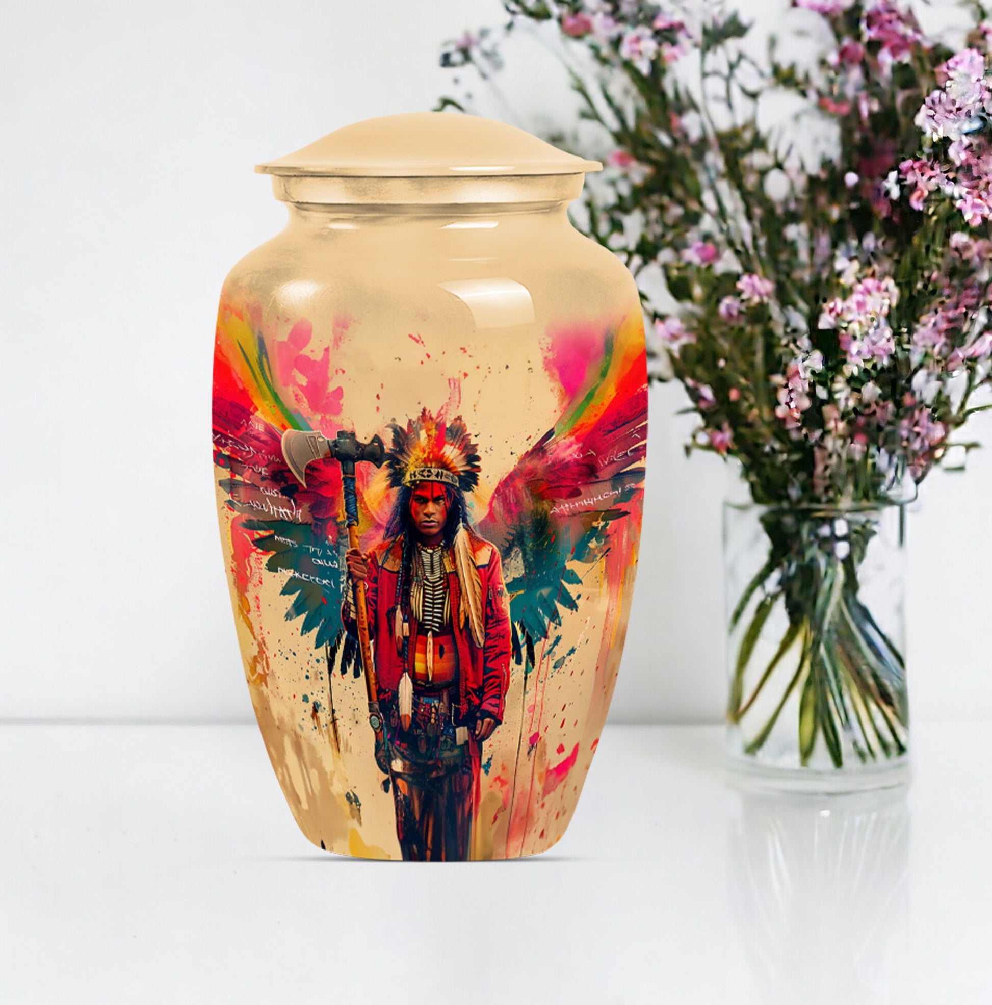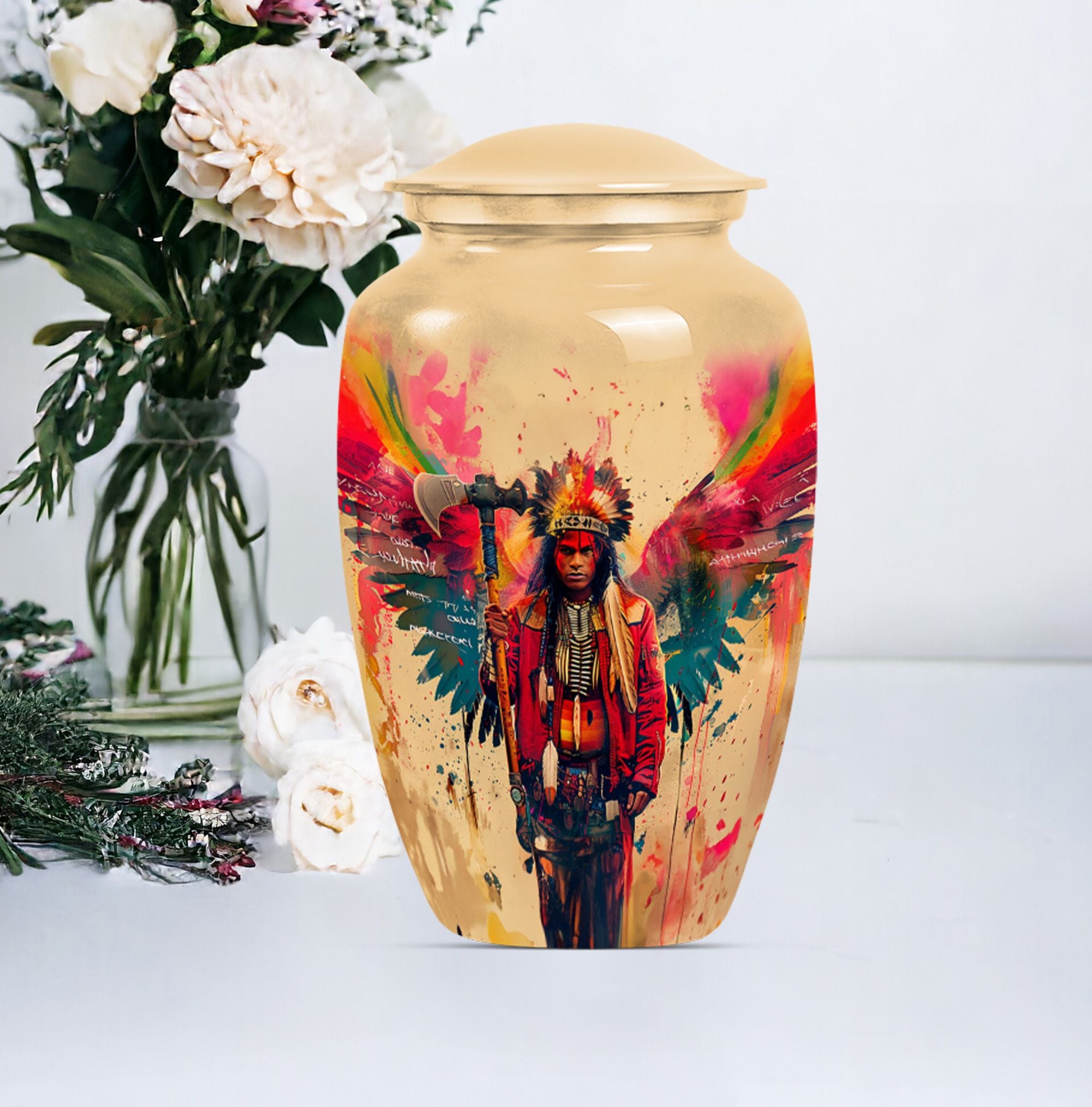 Perpetuate the memory of your departed loved one with our Tribe Man Urn. This large urn features an alluring Wolf Howling theme, to evoke the spirit of nature and freedom. Constructed with the highest quality aluminium, the urn stands 10 inches in height -- perfect for display in your home or a ceremonial venue. Designed to hold up to 200 cubic inches of ashes, this product strikes the right balance between aesthetic charm and functional value. The urn's weight is 3.3 pounds -- solid and sturdy but not overly weighty -- making it easy to handle during memorial ceremonies. To add a personal touch, we offer the option to personalize this tribute piece with engraved names. Each purchase also includes a velvet pouch for tasteful and discreet containment of the ashes. Not your typical memorial item, this urn is a unique addition to our Memorial Ceremony Supplies category. Key search terms for this product include 'tribe man urn', 'funeral urn for men's ashes', 'adult ashes men', 'elegant urns', and 'memorial urns'.