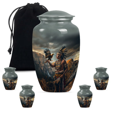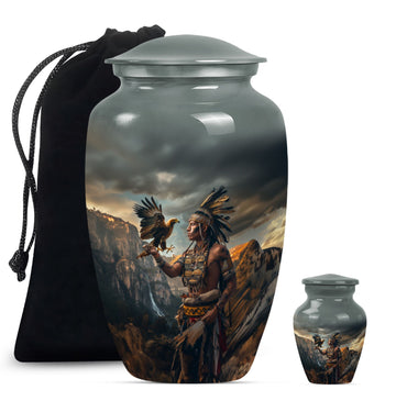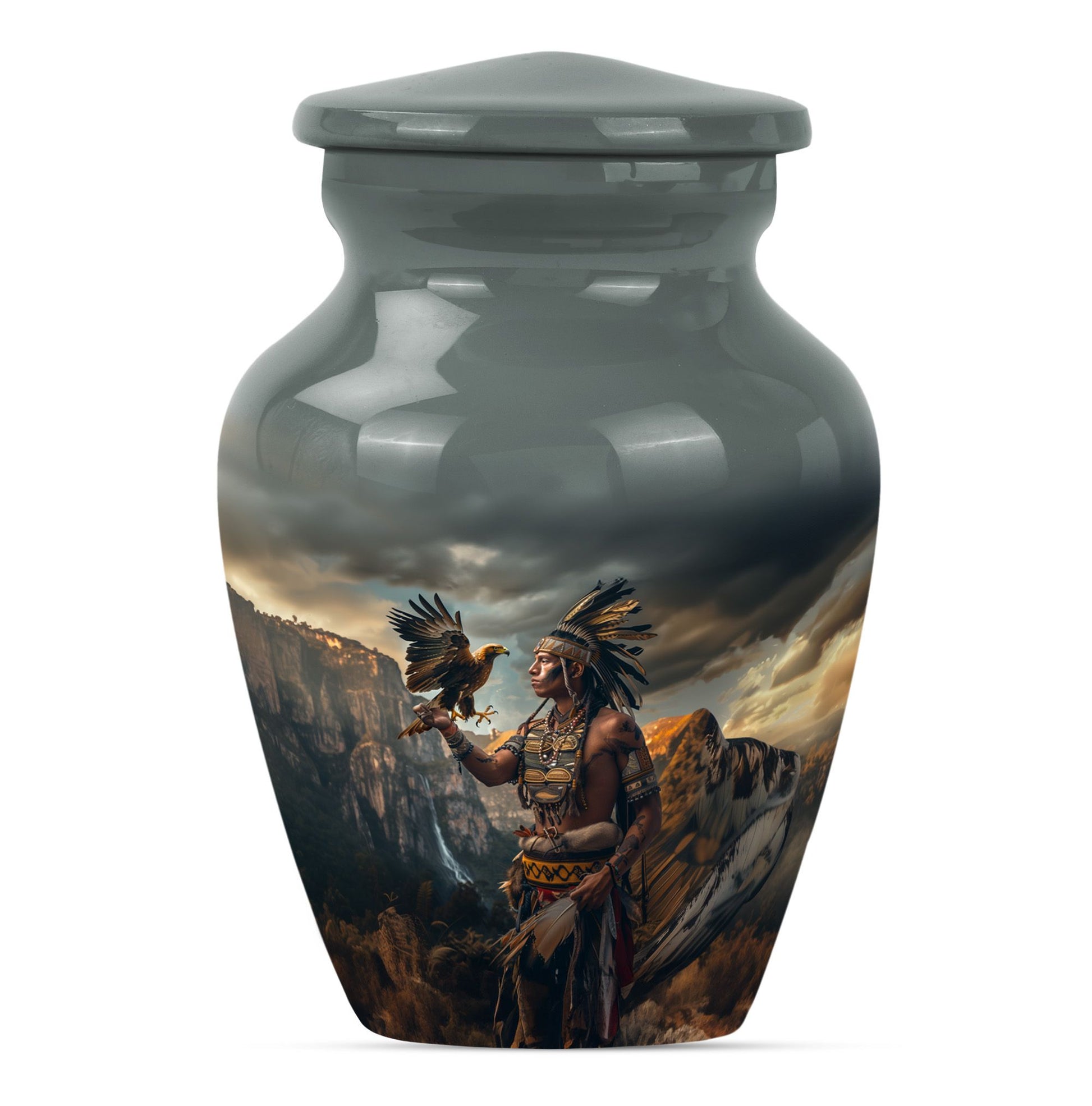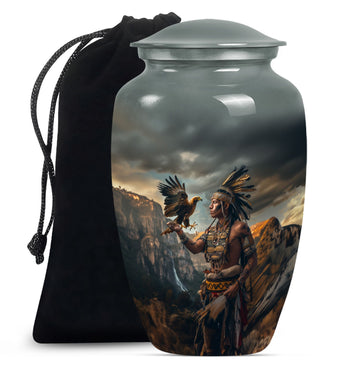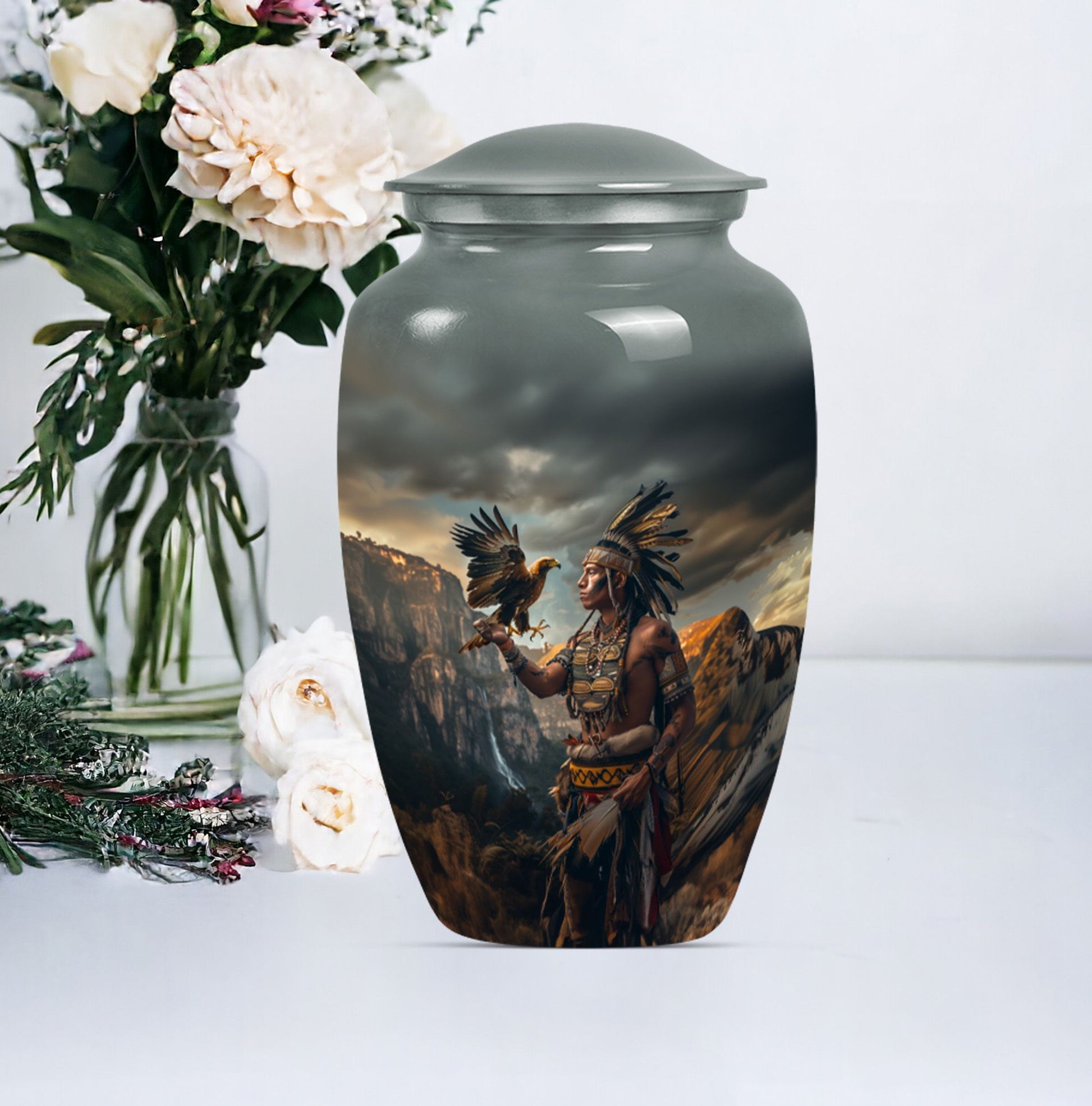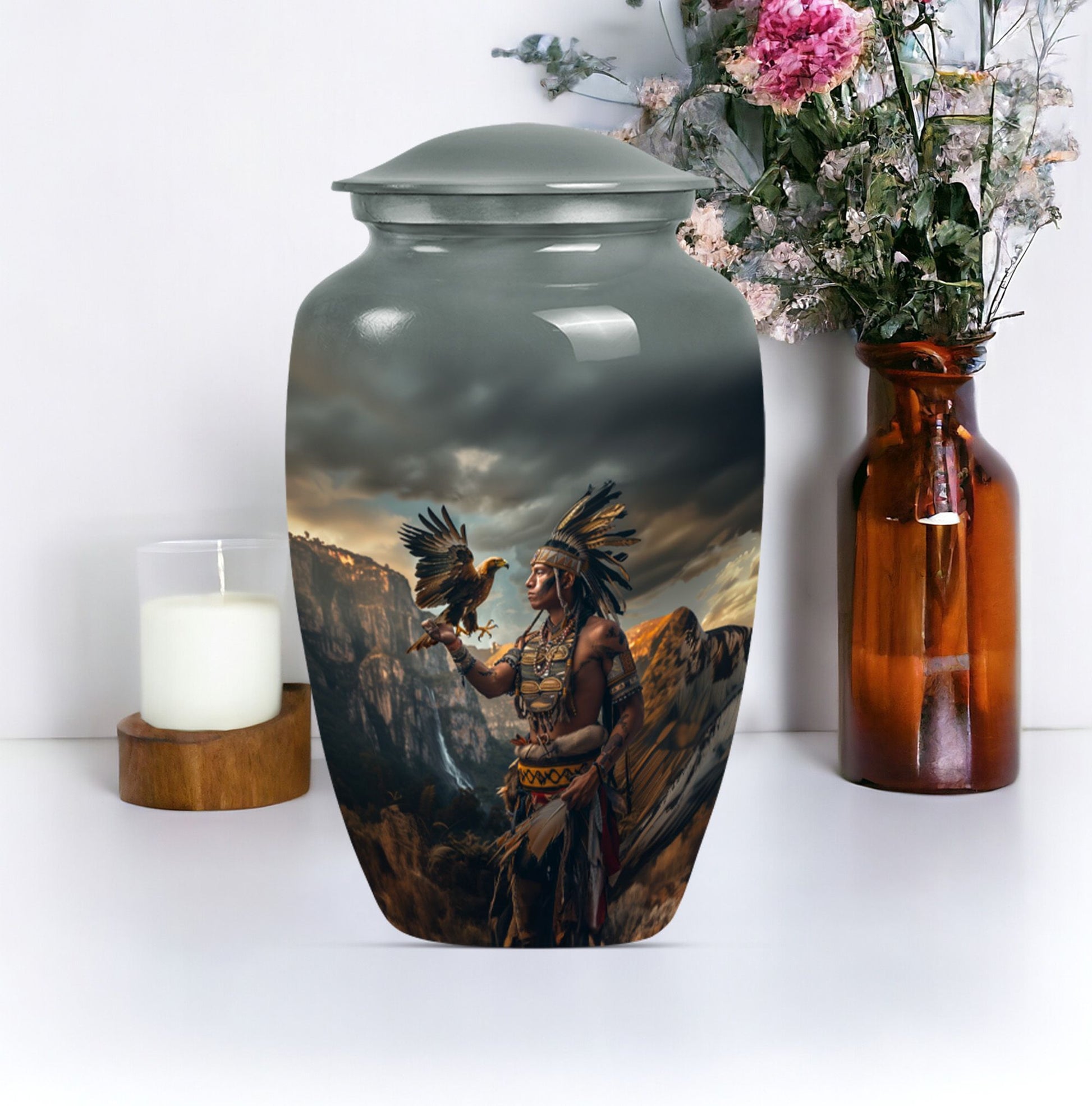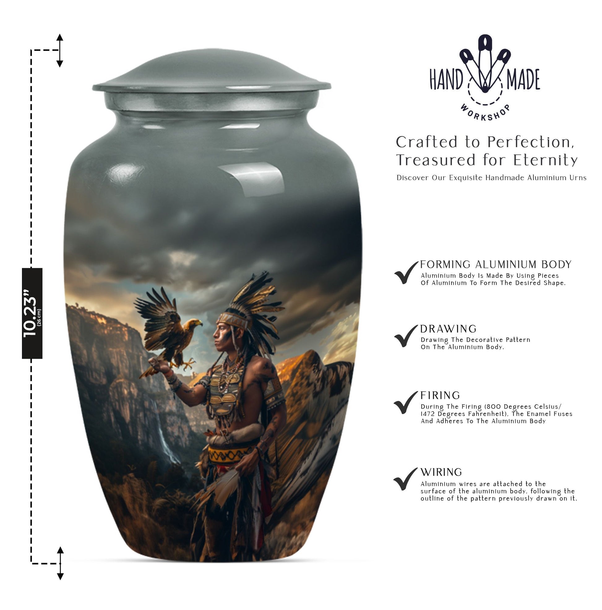 Your search for an elegant and lasting tribute to your loved one ends here with our premium tribe Man Urn. This large urn which stands at a height of 10 inches exudes an aura of class with its theme of 'Wolf Howling'; a symbol revered in many cultures symbolizing strength, unity, and respect for family. Handcrafted from durable aluminium, this cremation urn for dad is weighty yet well-balanced at 3.3 pounds, boasting a capacity of 200 cubic inches. Each urn is also afforded a personal touch with the option to engrave names, ensuring that each piece is truly unique. The urn comes nestled inside a plush velvet pouch, safeguarding the ashes during transit or when showcased. Offering not only a vessel but a memorial, the high-quality tribe Man Urn redefines affordability and pays an honorable homage. Looking beyond traditional burial urns for adult men ashes, choose this unparalleled piece resonating strength and unity, and treasuring the powerful spirit of your loved one.