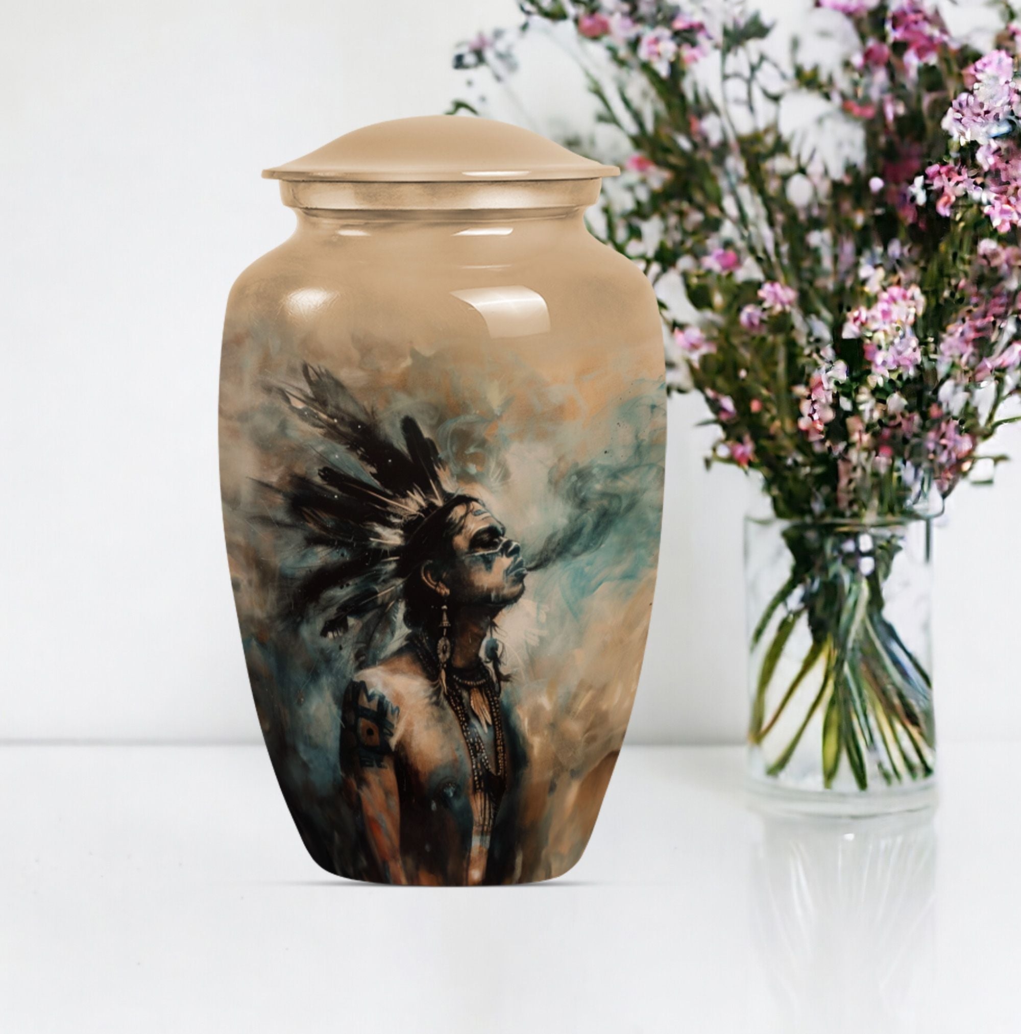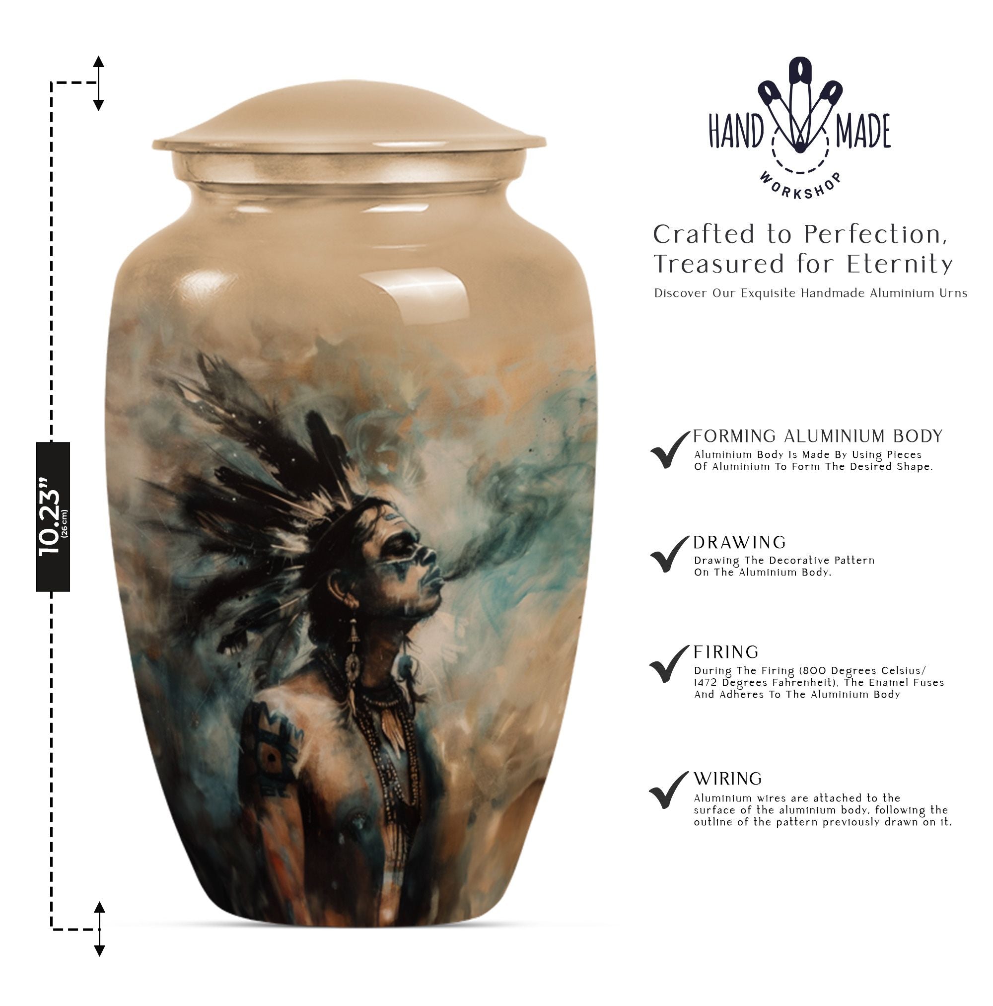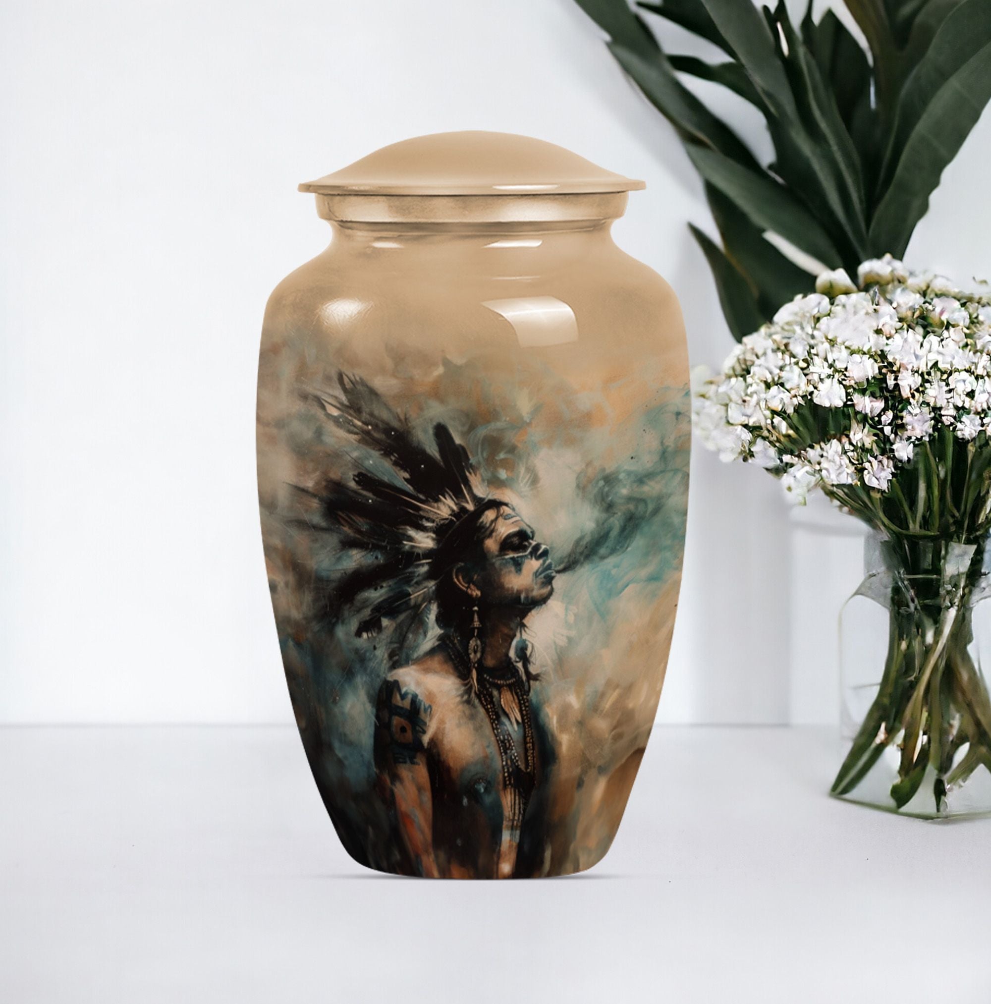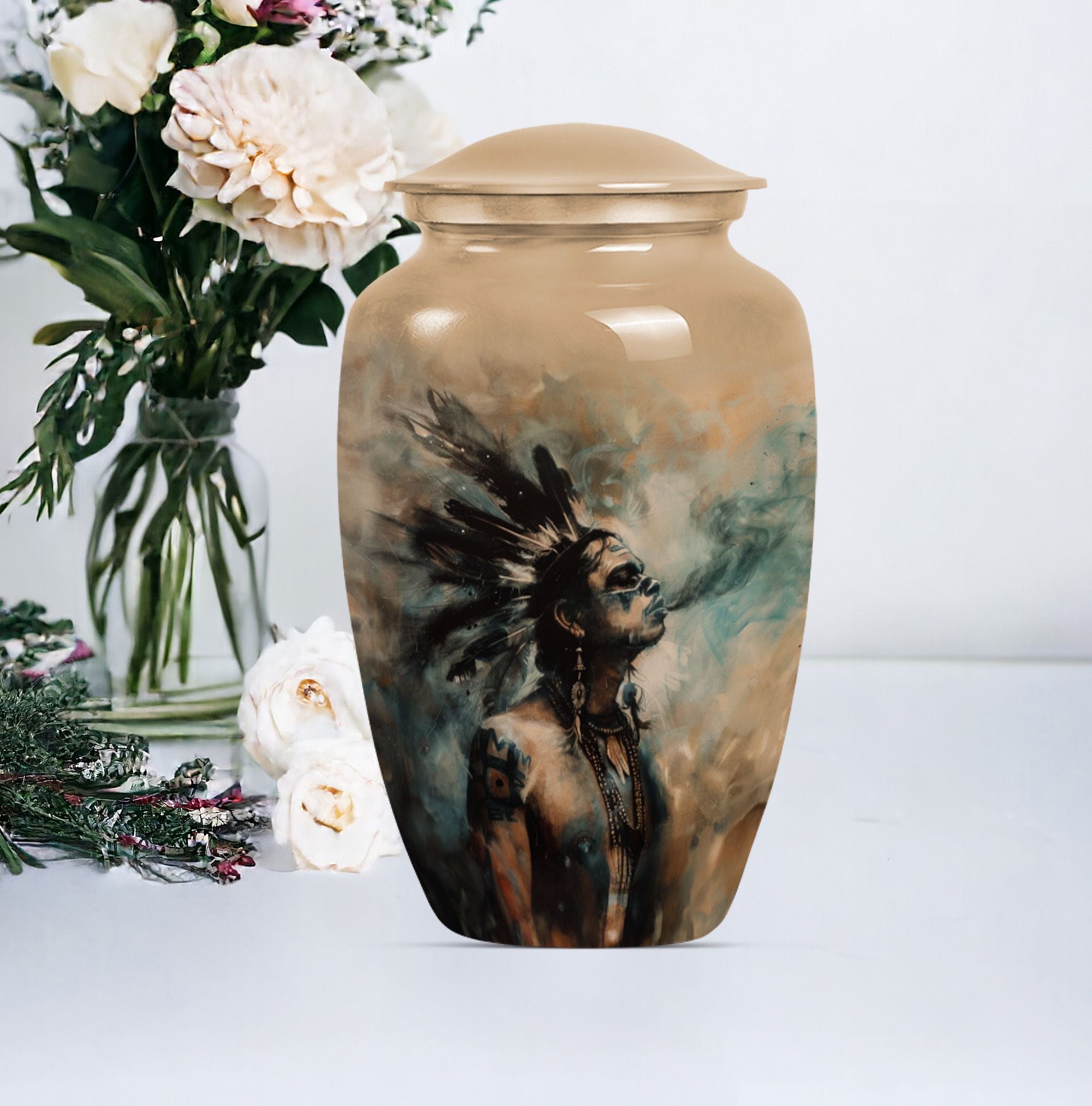 Celebrate the life of a special person in a distinctive way with our Tribe Man Urn - an exquisite tribute designed to hold the ashes of the dearly departed. Handcrafted from robust aluminium, this large urn weighs 3.3 pounds, standing tall at 10 inches - ample space for a capacity of up to 200 cubic inches. The gorgeous Wolf Howling theme brings an extra layer of sentiment and reverence, ensuring the urn stands as a beautiful testament in your home. We also include a velvet pouch in the package to contain the ashes with utmost respect and dignity. Our burial funeral cremation urn can be personalized by engraving names, making your memorial even more special. This unique piece doubles as a decorative urn for your home, honouring your loved one's life while blending seamlessly with your decor. While designed mainly for human ashes, this large urn is versatile and may be used as an ash urn for man, woman, or any adult. Uncommon and distinct, our tribe Man urn is a meaningful choice to consider among memorial urns for a beloved elder.