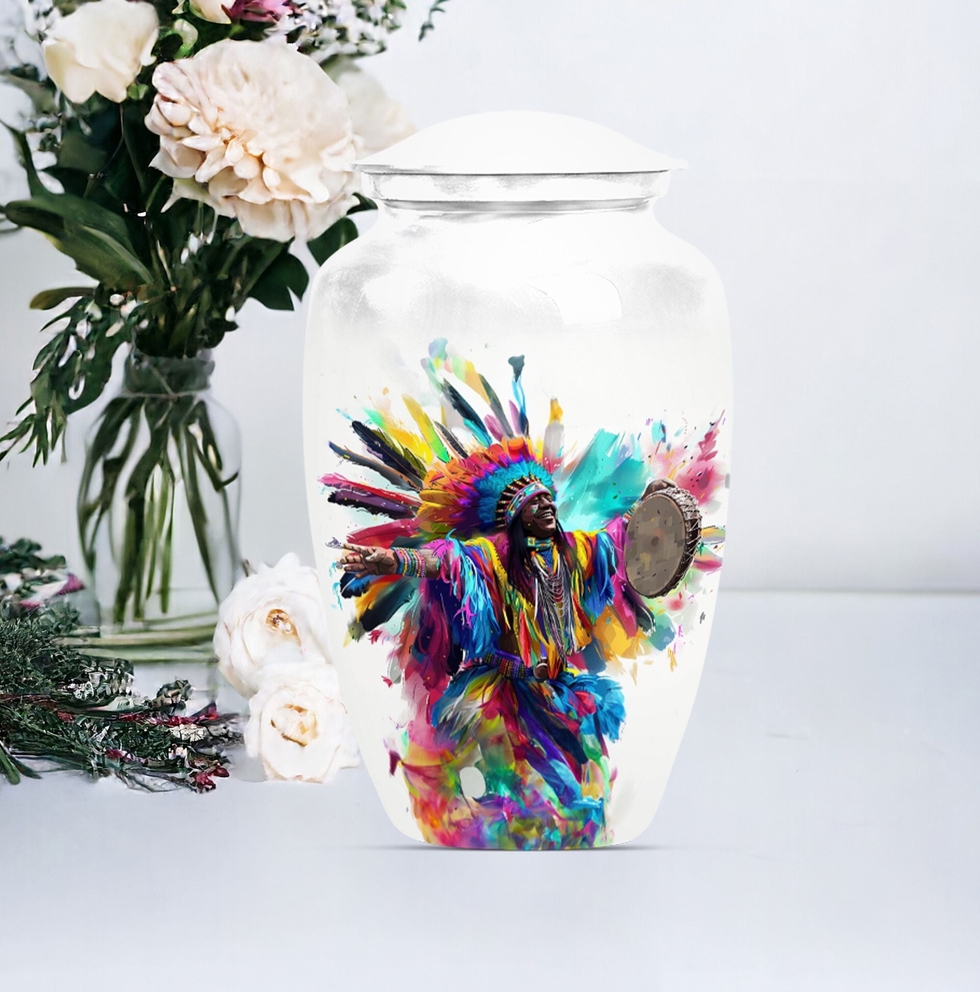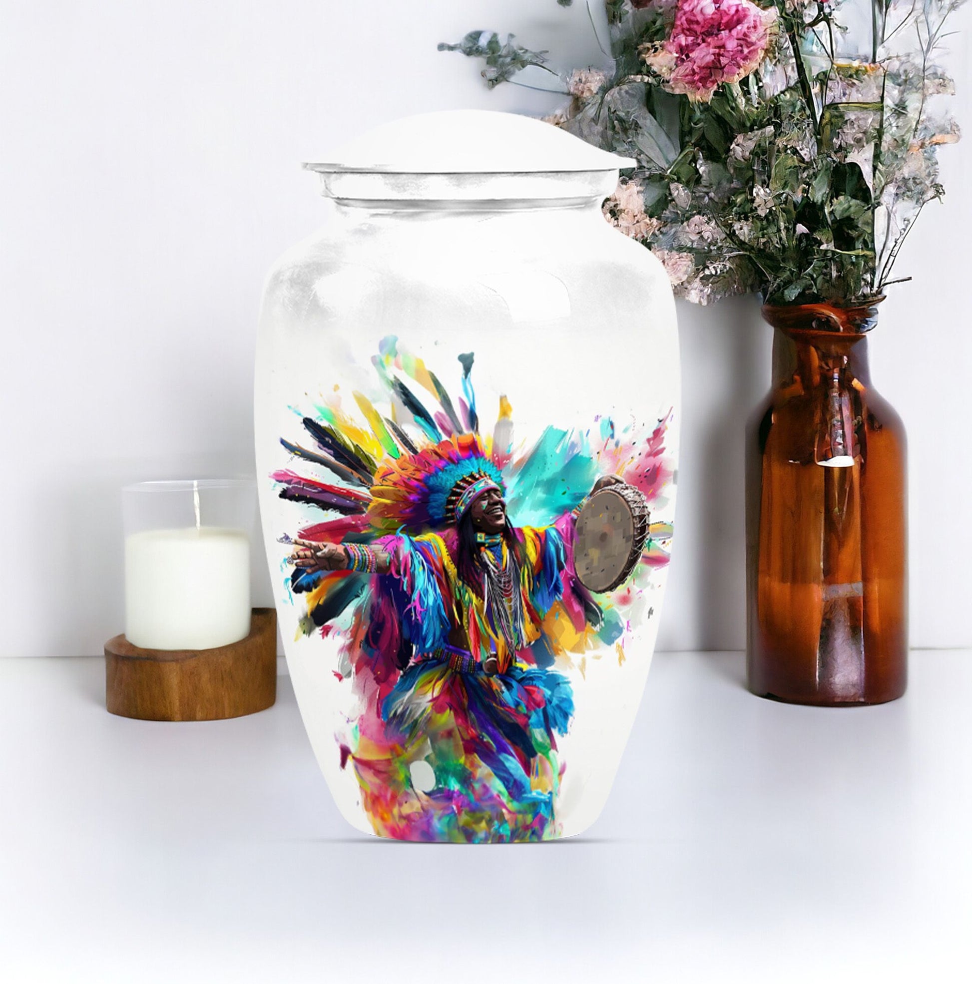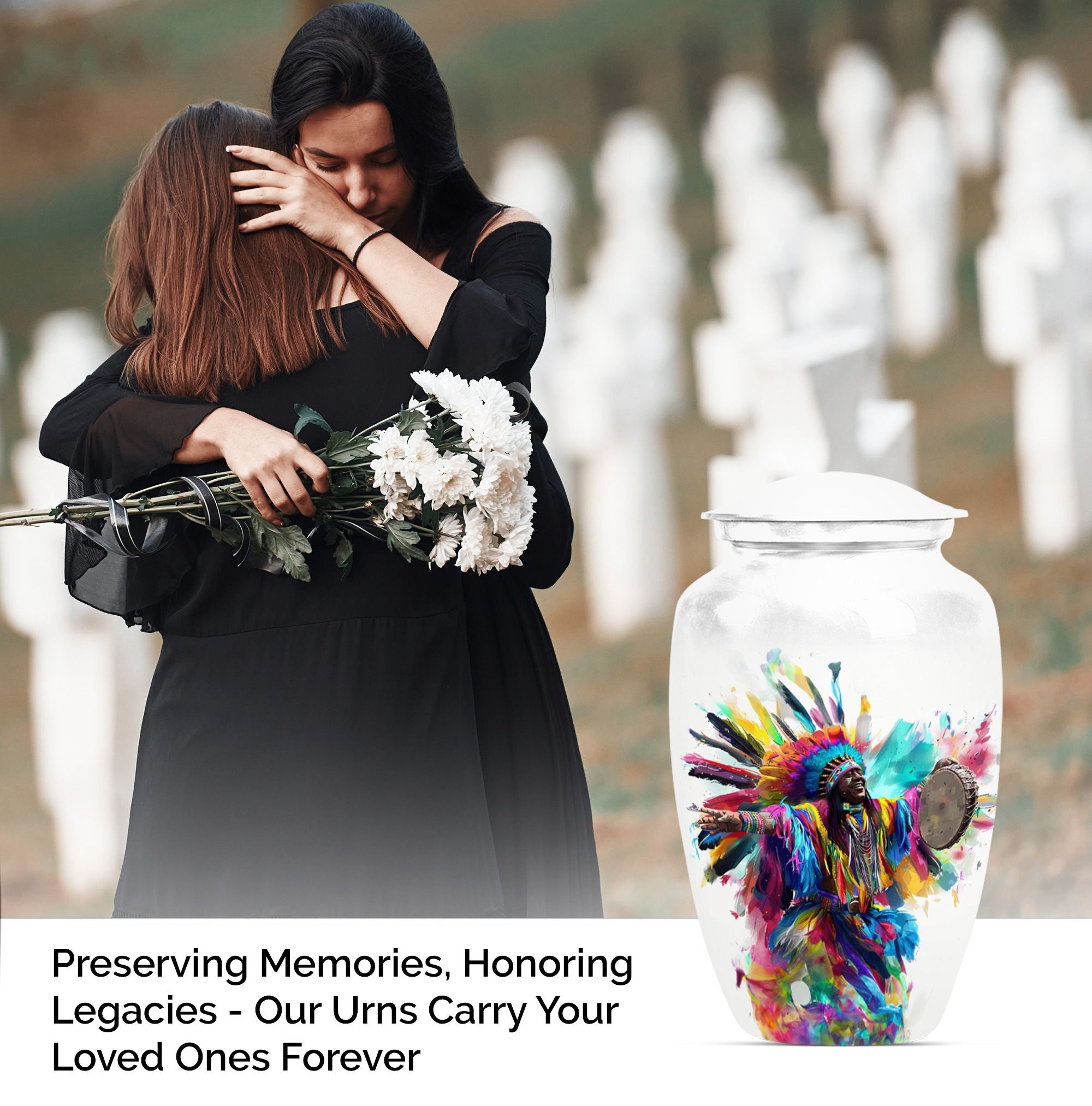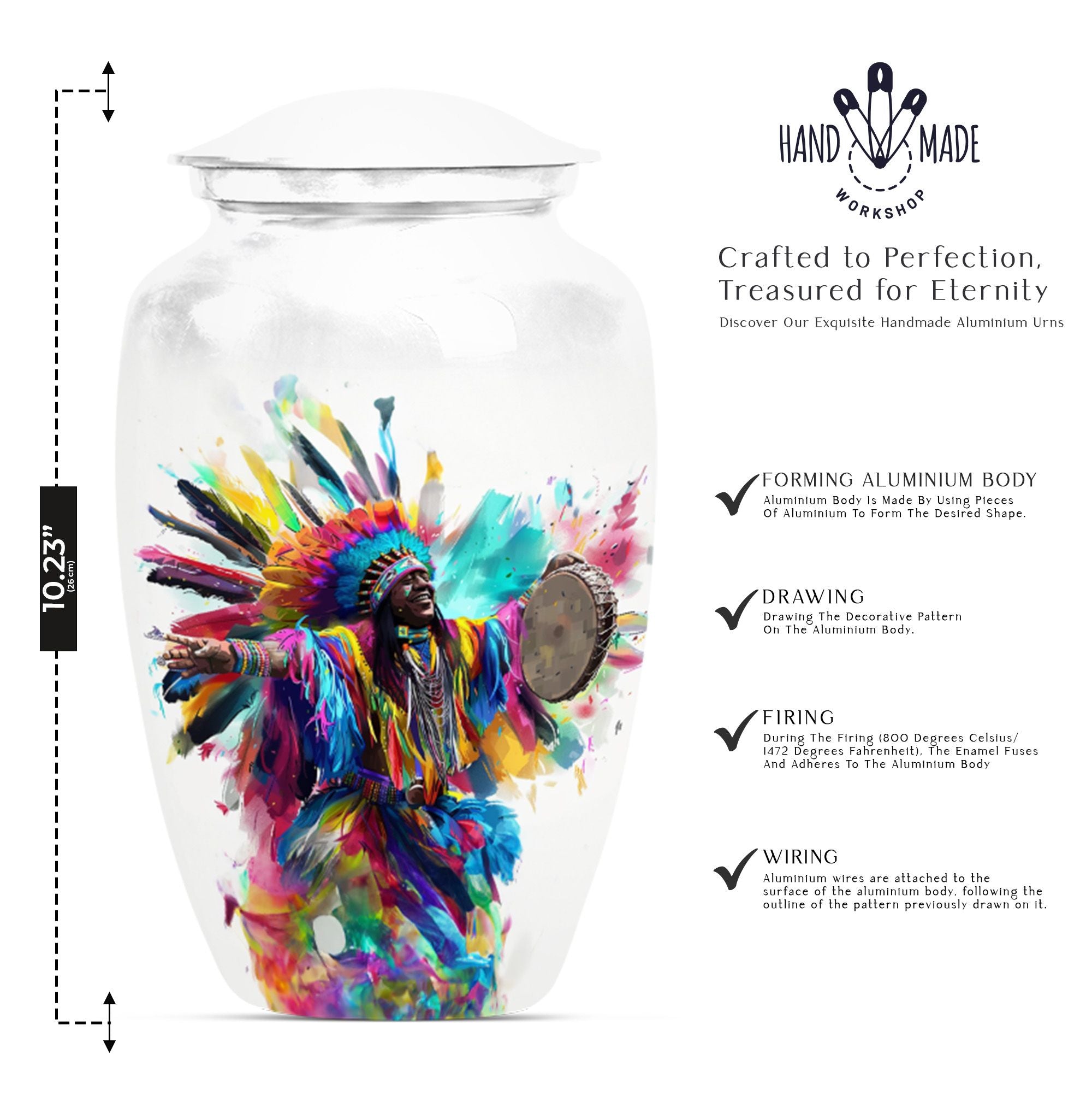 Discover our tribe Man Urn, a singular memorial urn designed specifically for male adults, standing at a robust 10 inches tall. Crafted out of high-quality, durable aluminium, this large urn is not only sturdy but also hefty at 3.3 pounds. Its 200 cubic inch capacity makes it an ideal choice for those seeking urns for ashes, large enough to fit the ashes of your loved one comfortably. Unique to its category, its aesthetic is adorned with a bewitching Wolf Howling theme that adds a touch of personal touch and connection with the departed. We also offer the opportunity to personalize this urn with engraved names, making it all the more special. Additionally, each purchase comes with a velvet pouch for complementary containment of ashes, ensuring a respectful and secure storage. This meticulous detailing marks it distinct from standard female urns or companion urns for two adults. Note, this distinctive urn design does not include the intended 'Classic Urn' design. Dive into our selection of memorial urns, every piece asserting a tangible sense of memory, respect and love.