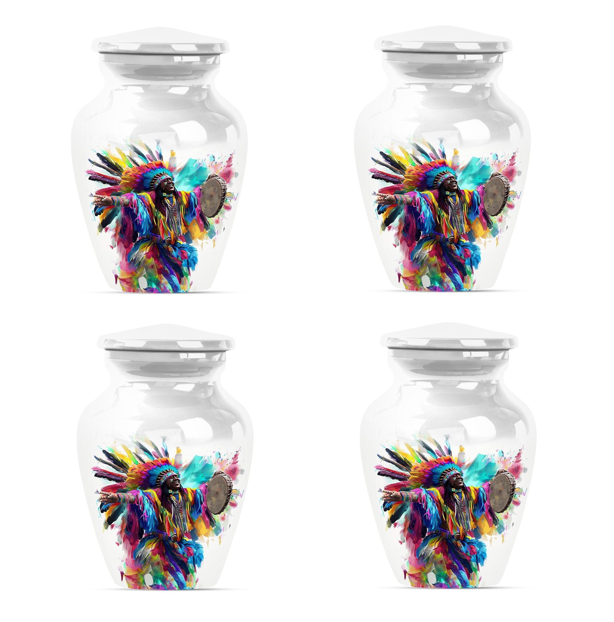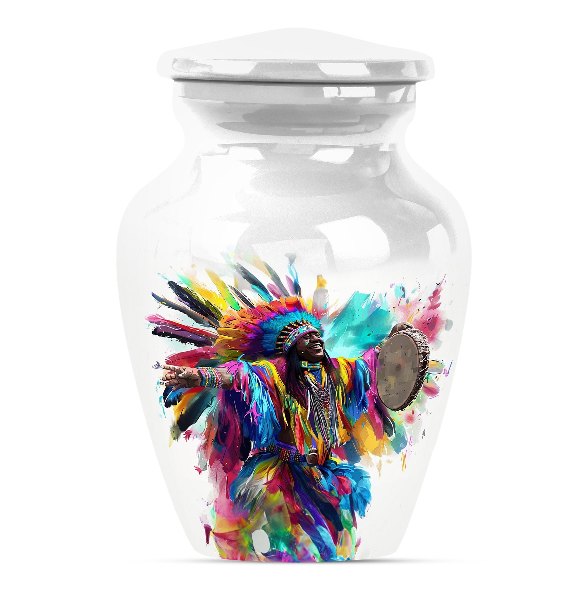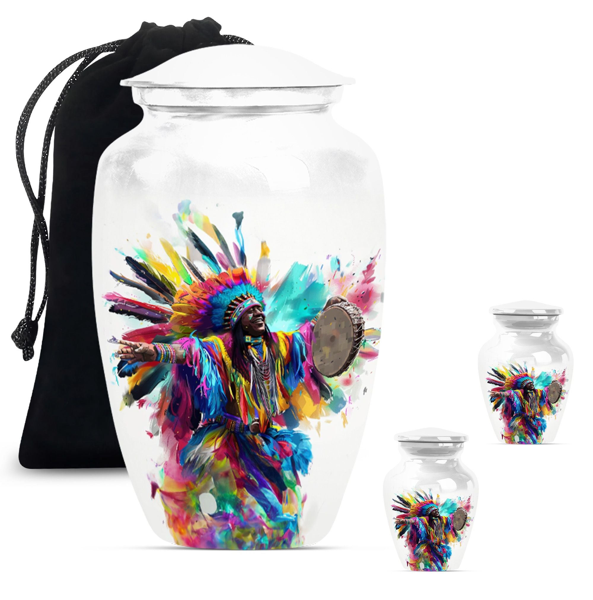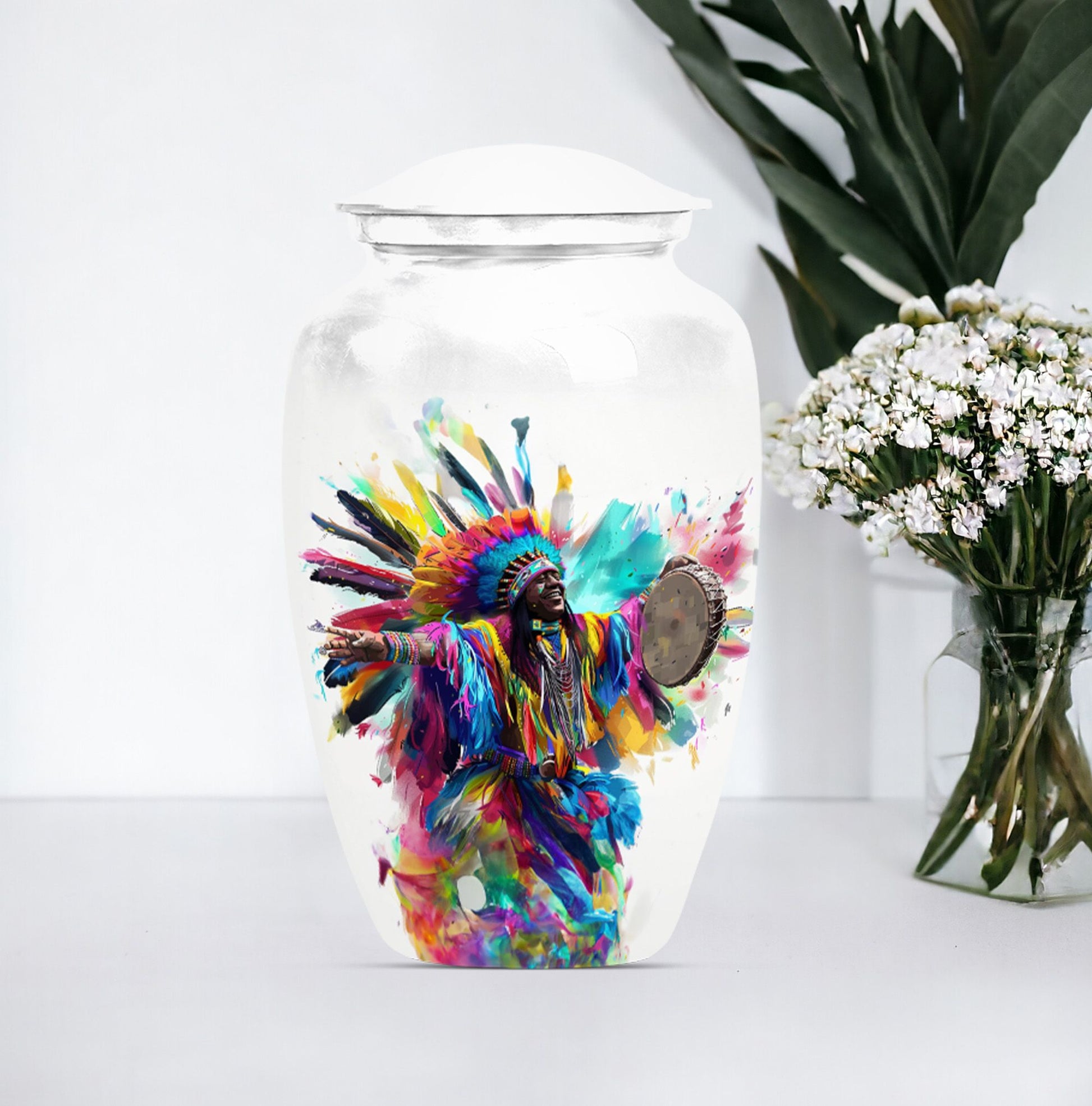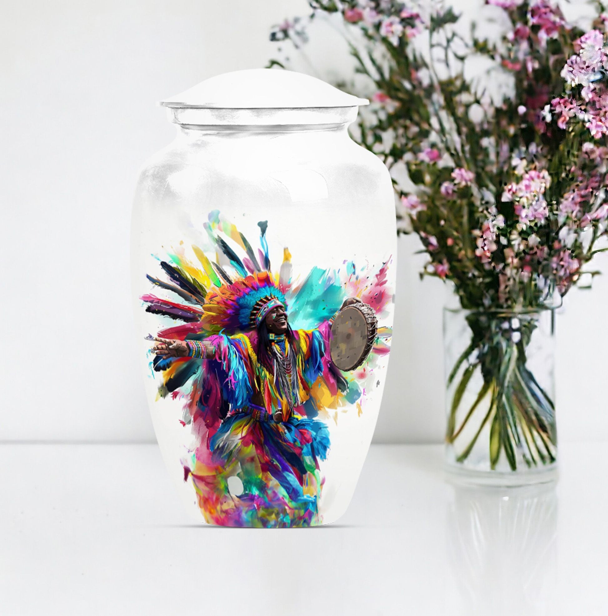 Discover our tribe Man Urn, a singular memorial urn designed specifically for male adults, standing at a robust 10 inches tall. Crafted out of high-quality, durable aluminium, this large urn is not only sturdy but also hefty at 3.3 pounds. Its 200 cubic inch capacity makes it an ideal choice for those seeking urns for ashes, large enough to fit the ashes of your loved one comfortably. Unique to its category, its aesthetic is adorned with a bewitching Wolf Howling theme that adds a touch of personal touch and connection with the departed. We also offer the opportunity to personalize this urn with engraved names, making it all the more special. Additionally, each purchase comes with a velvet pouch for complementary containment of ashes, ensuring a respectful and secure storage. This meticulous detailing marks it distinct from standard female urns or companion urns for two adults. Note, this distinctive urn design does not include the intended 'Classic Urn' design. Dive into our selection of memorial urns, every piece asserting a tangible sense of memory, respect and love.