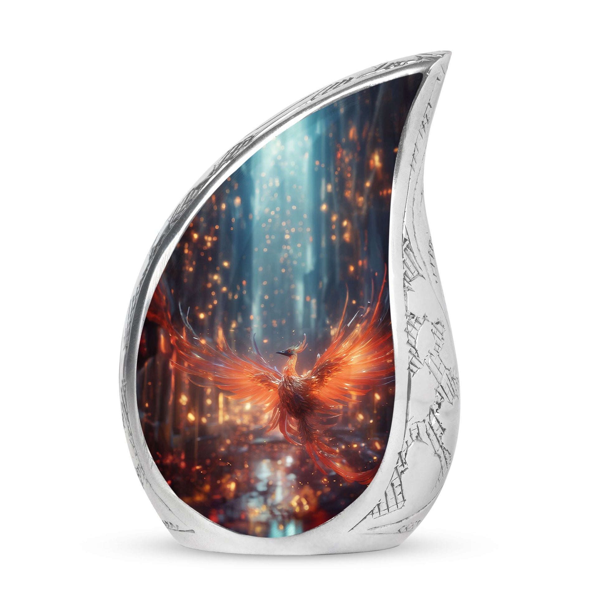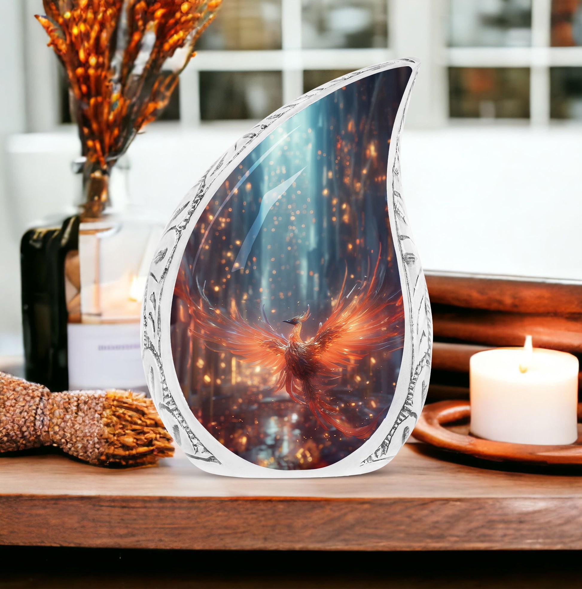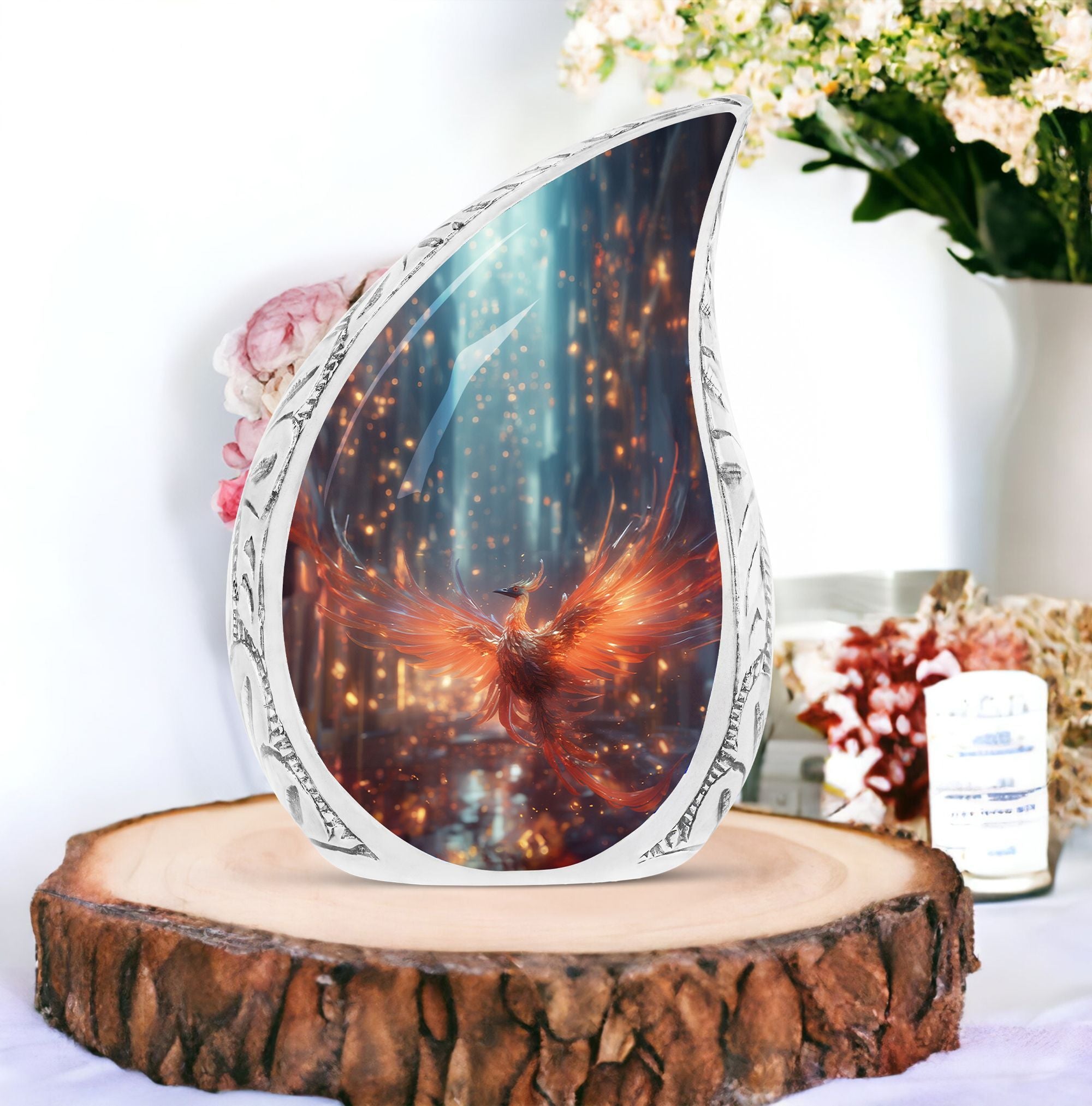 Celebrate the memory of a loved one with the Fire Red Phoenix Urns for Human Ashes. These large urns, crafted to hold up to 200 cubic inches, are designed with elegance and reverence. The urn stands at 10 inches in height and weighs 3.3 pounds, illustrating its strong and sturdy aluminium body. Each urn comes with a special velvet pouch, ensuring secure and respectful containment of your loved one's ashes. Going beyond just cremation urns, these memorial urns are also tailored to include personalized engraved names, adding a touch of uniqueness and personal sentiments. Sized at 3 inches, these urns respond to the necessity of maintaining the presence and warmth of the departed within your home. These superior urns not only serve as a resting place but represent a tribute to their life. Featuring exceptional quality, these customized urns for ashes facilitate a meaningful celebration of life, serving as a perfect option for human urns or as an urn container.
