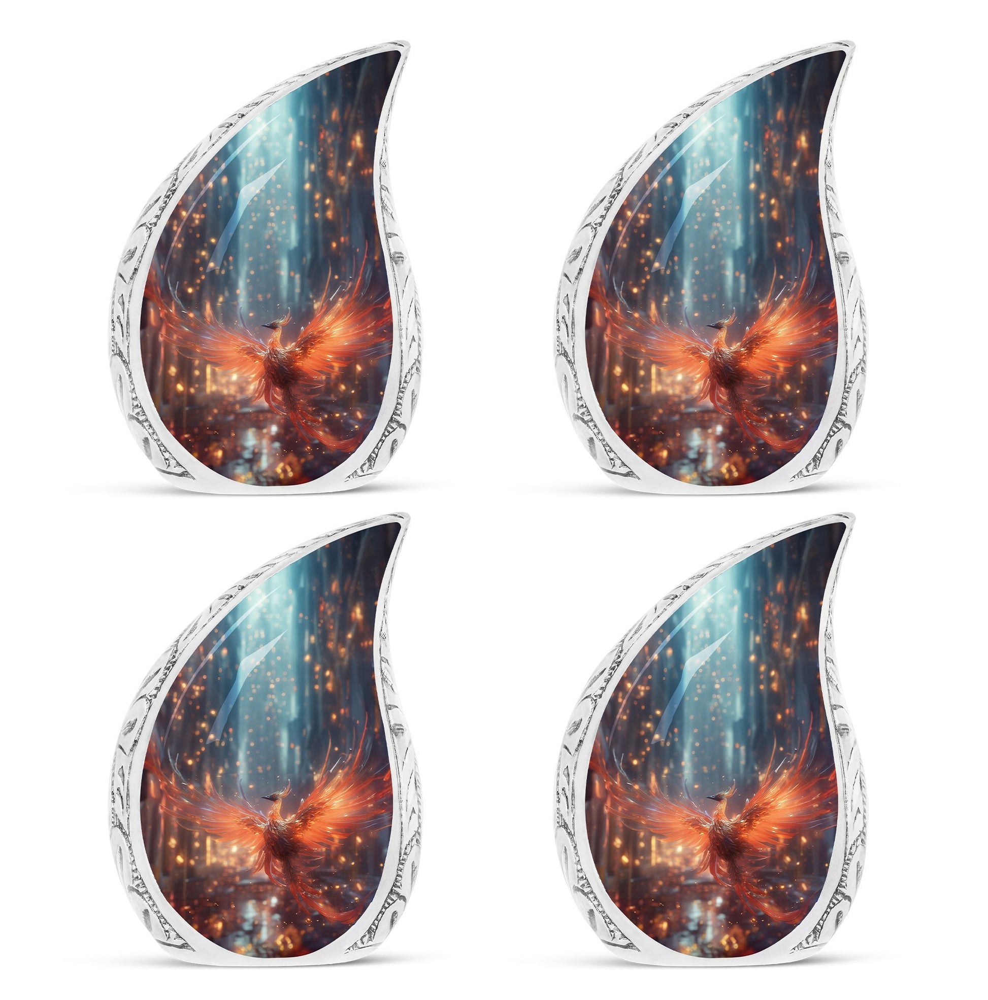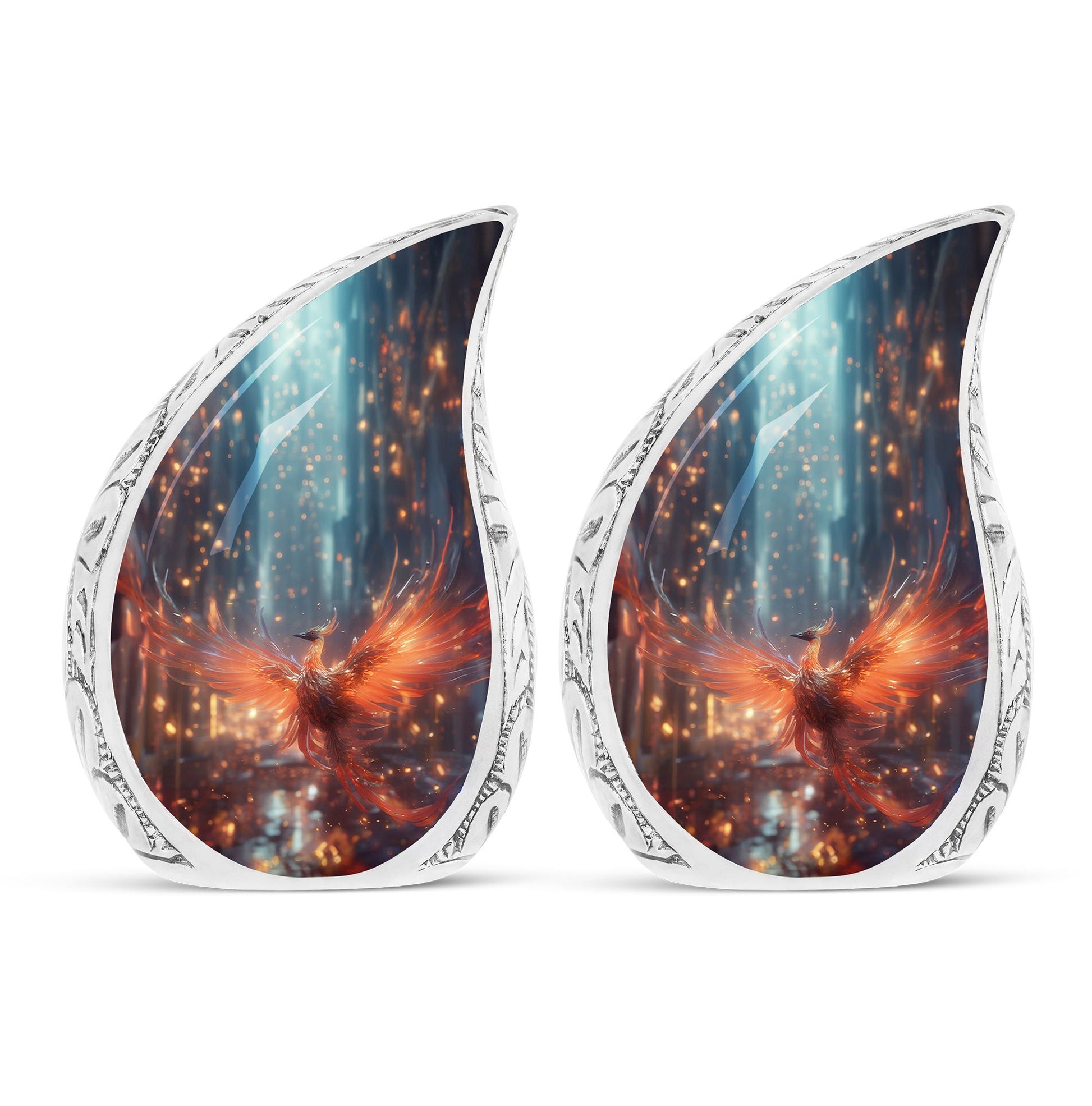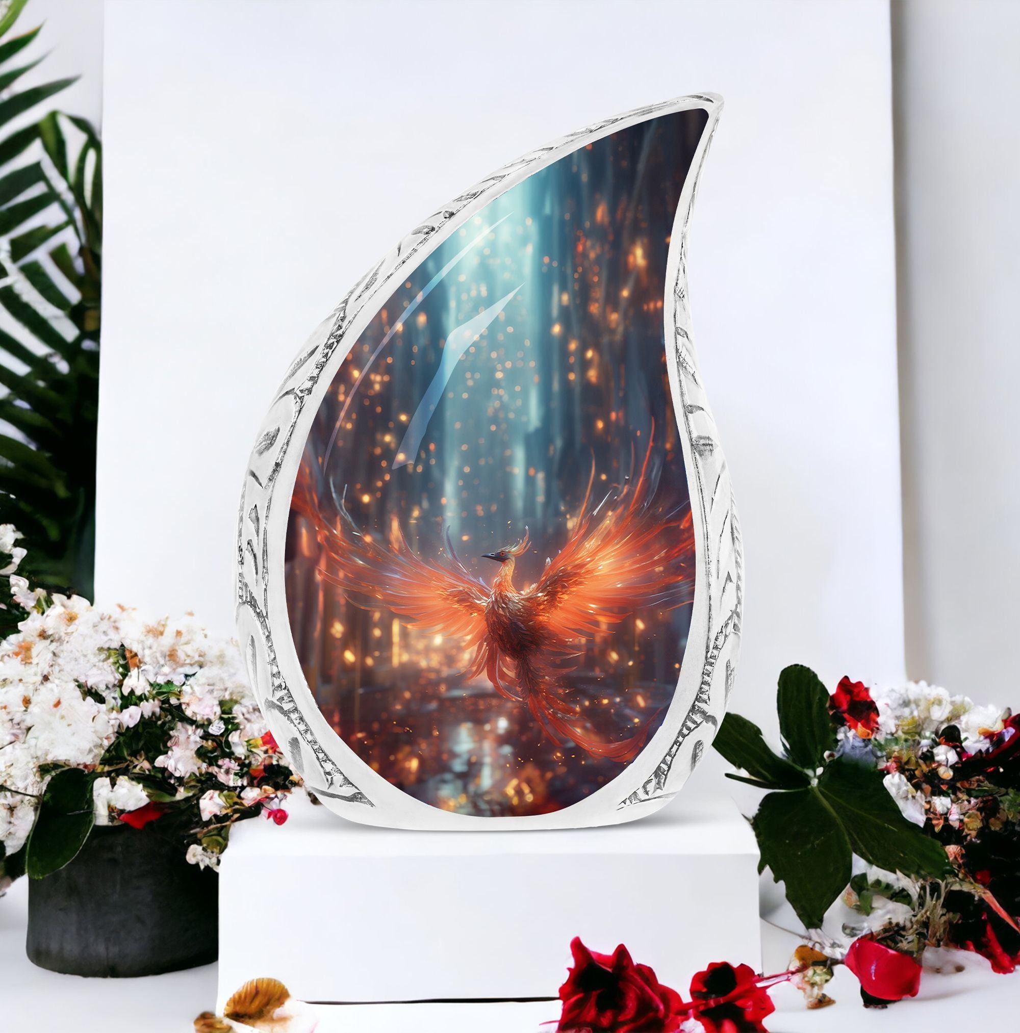 Celebrate the memory of a loved one with the Fire Red Phoenix Urns for Human Ashes. These large urns, crafted to hold up to 200 cubic inches, are designed with elegance and reverence. The urn stands at 10 inches in height and weighs 3.3 pounds, illustrating its strong and sturdy aluminium body. Each urn comes with a special velvet pouch, ensuring secure and respectful containment of your loved one's ashes. Going beyond just cremation urns, these memorial urns are also tailored to include personalized engraved names, adding a touch of uniqueness and personal sentiments. Sized at 3 inches, these urns respond to the necessity of maintaining the presence and warmth of the departed within your home. These superior urns not only serve as a resting place but represent a tribute to their life. Featuring exceptional quality, these customized urns for ashes facilitate a meaningful celebration of life, serving as a perfect option for human urns or as an urn container.