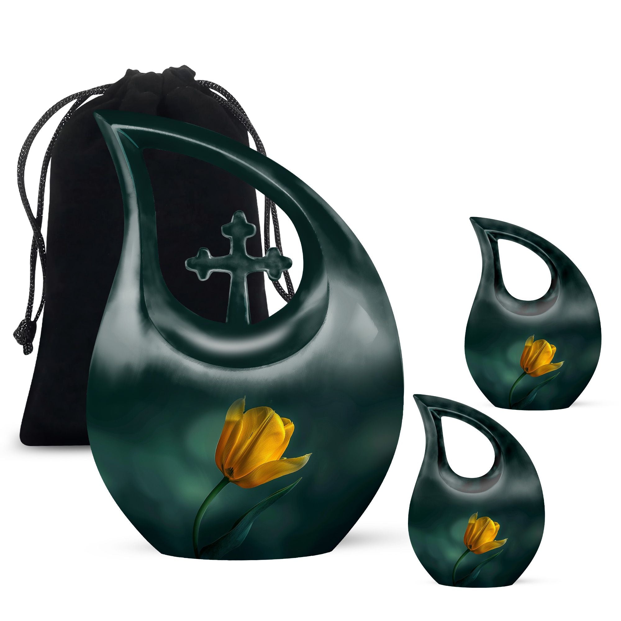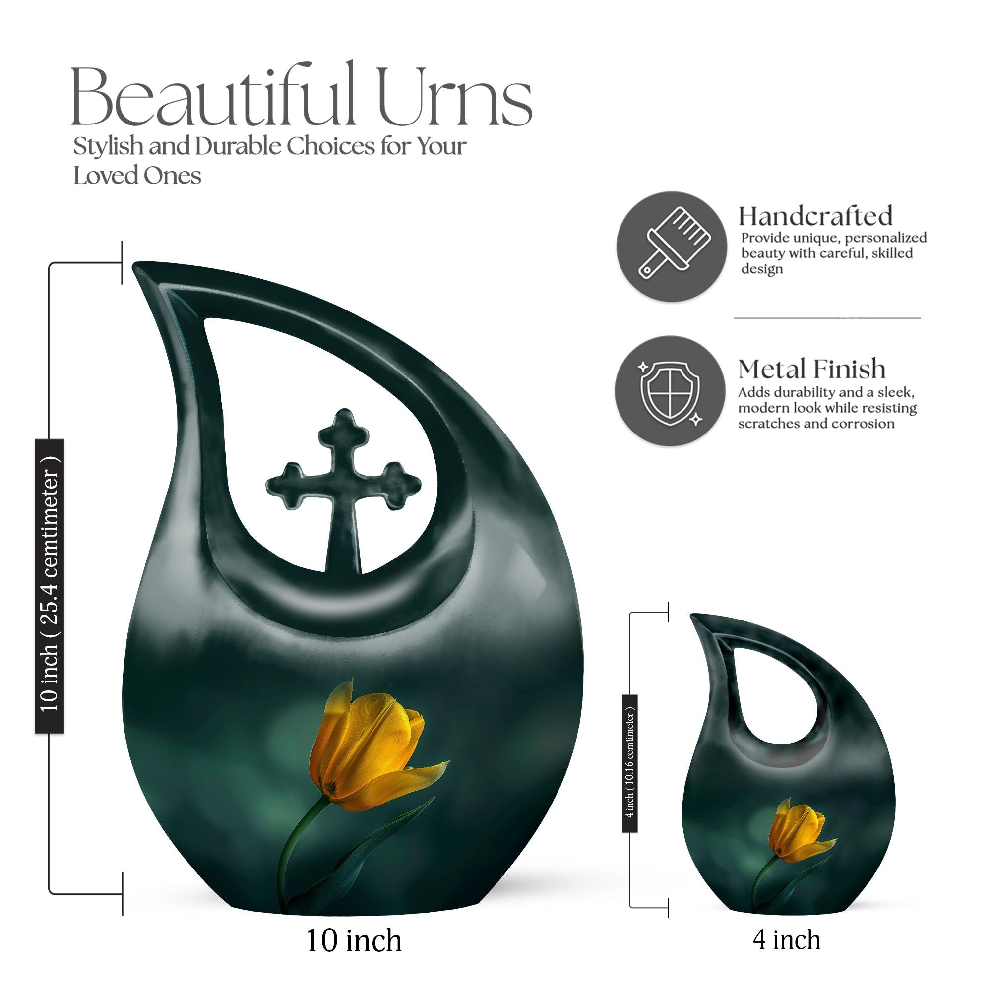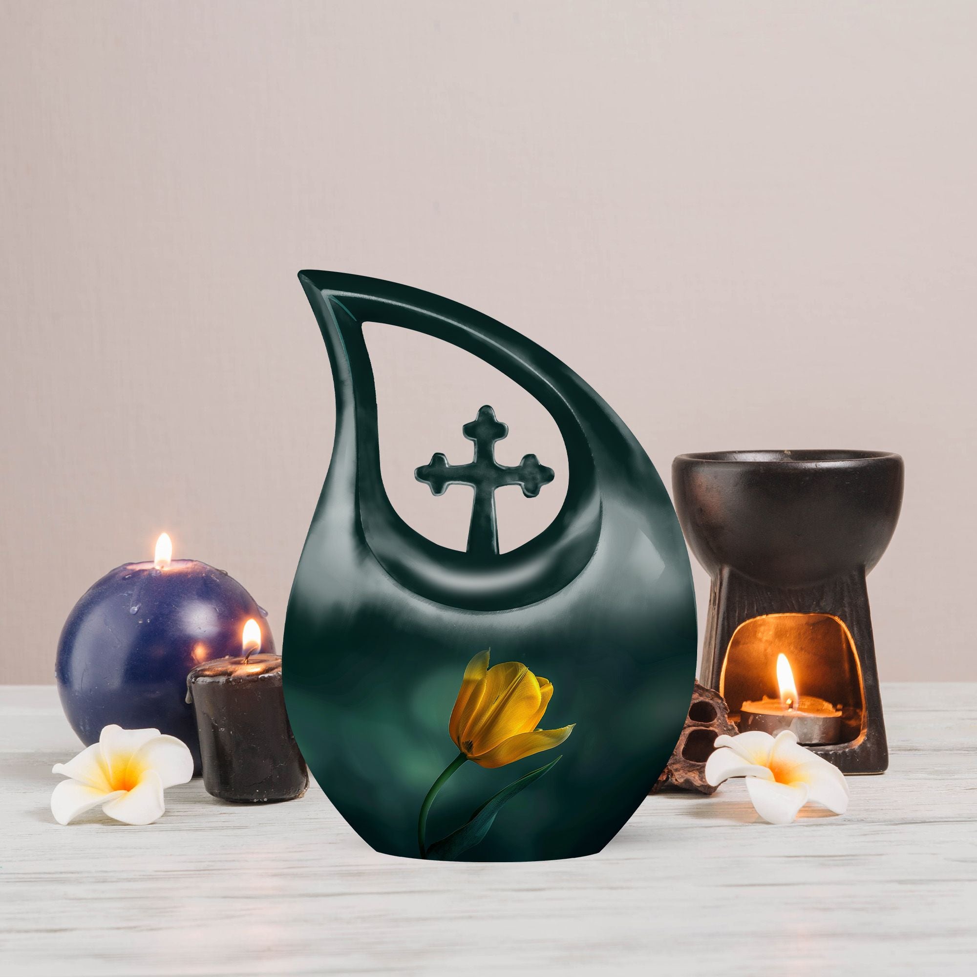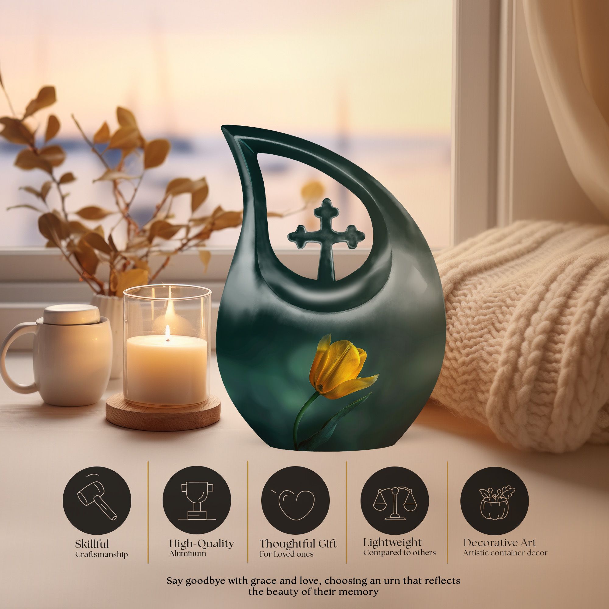 Beautifully handcrafted from premium aluminum, this cremation urn for men and women features a rich dark green background that highlights the delicate yellow tulip design. Its smooth finish and secure screw-top lid ensure your loved one’s ashes remain safely preserved. Ideal as an urn for men & women, it serves as a dignified centerpiece for display, burial, or remembrance.