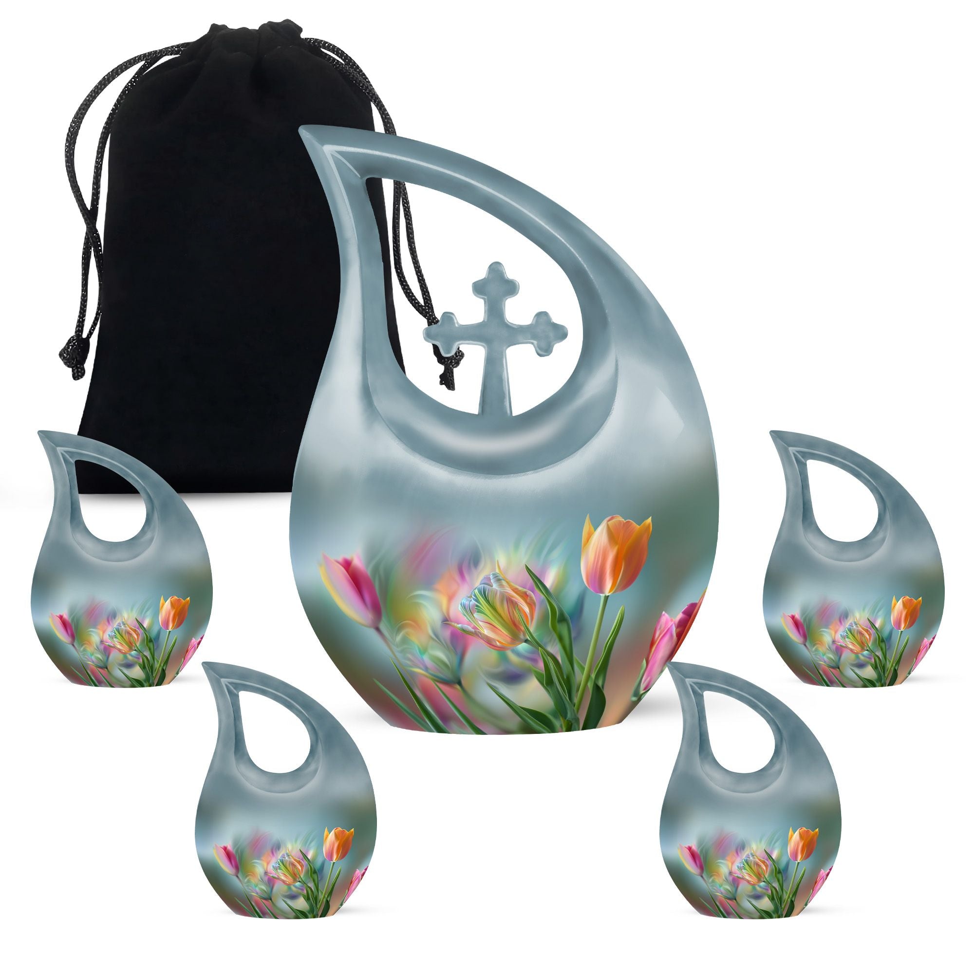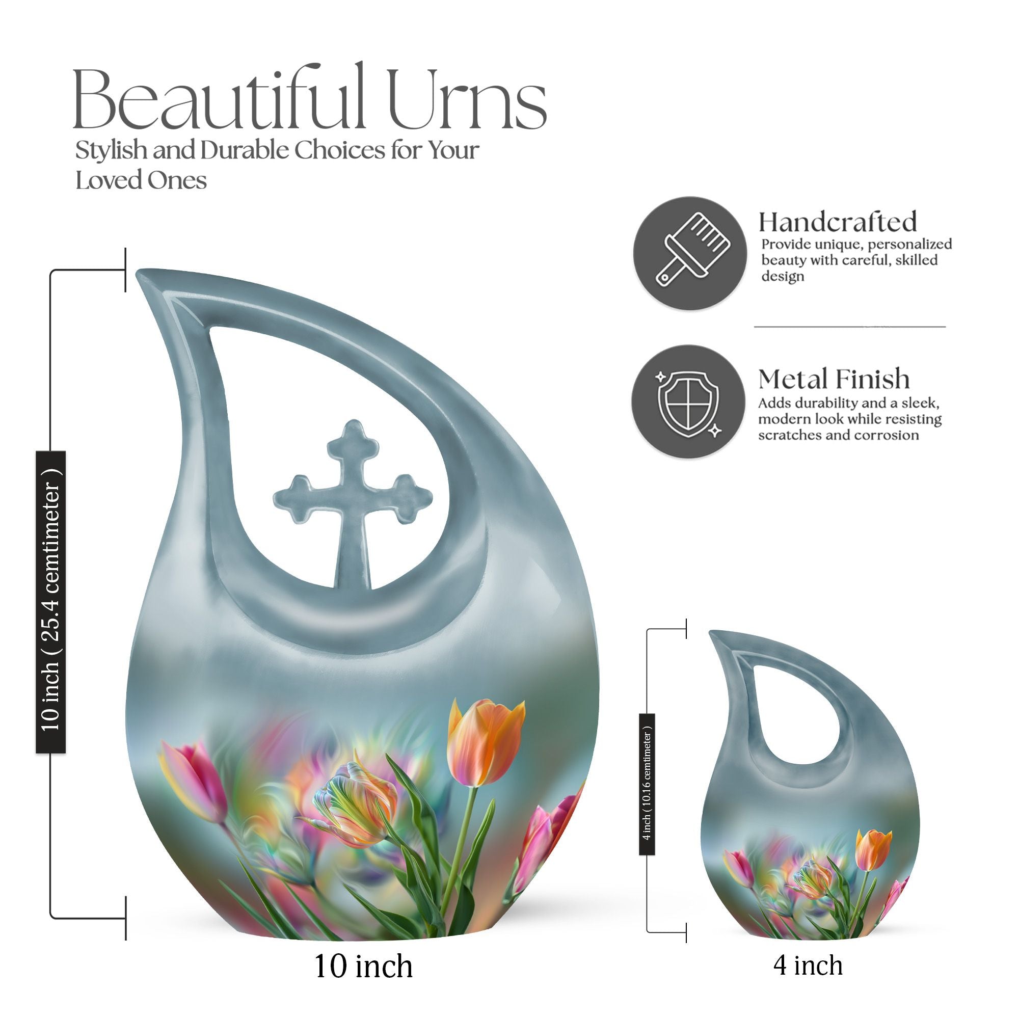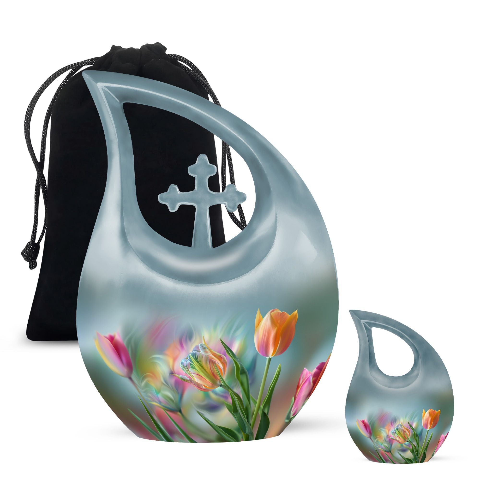 Crafted from durable aluminum, this urn features soft pastel tulip artwork representing grace, renewal, and everlasting love. The secure screw-top lid keeps ashes protected, making it suitable for those looking for a cremation urn small, small cremation urns for ashes, or coordinated cremation ashes keepsakes. Its full-size 200-cu-in capacity works beautifully whether you need cremation urns for ashes for men, urns for cremation ashes small as companions, or additional cremation keepsakes urns for shared remembrance.