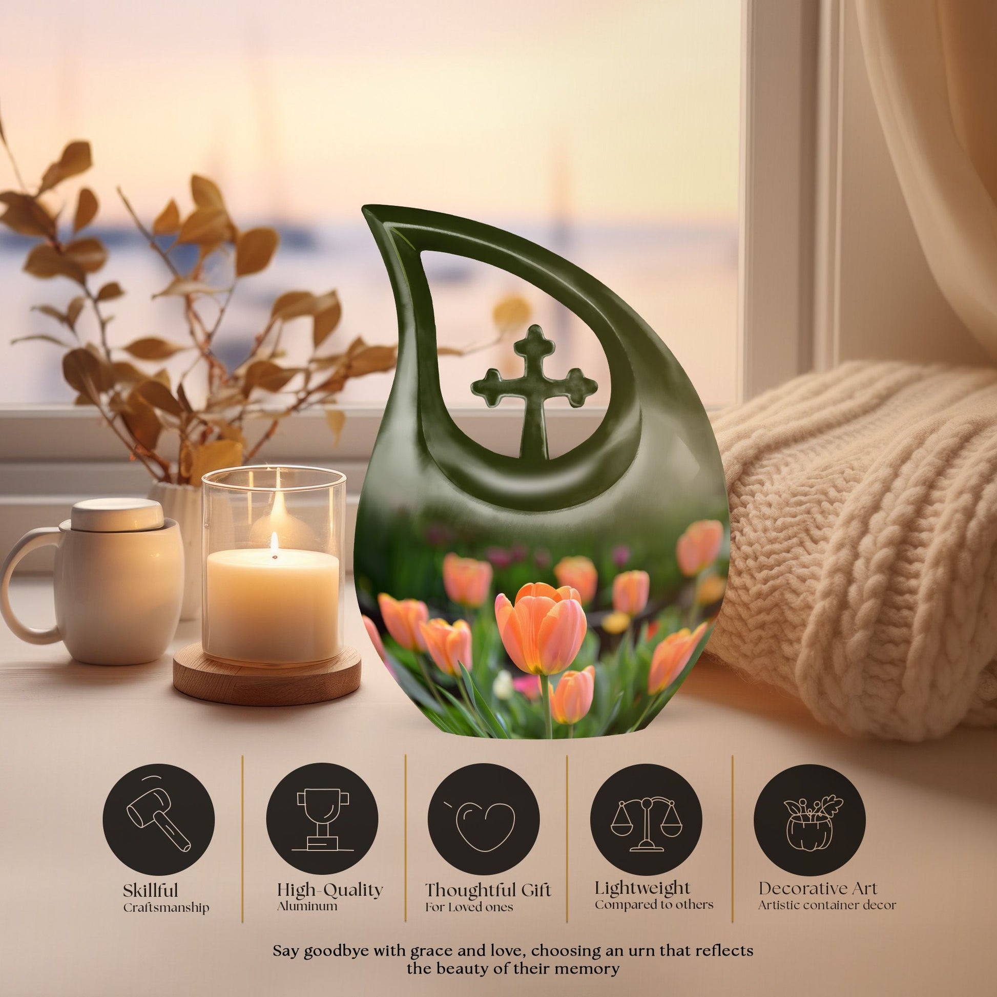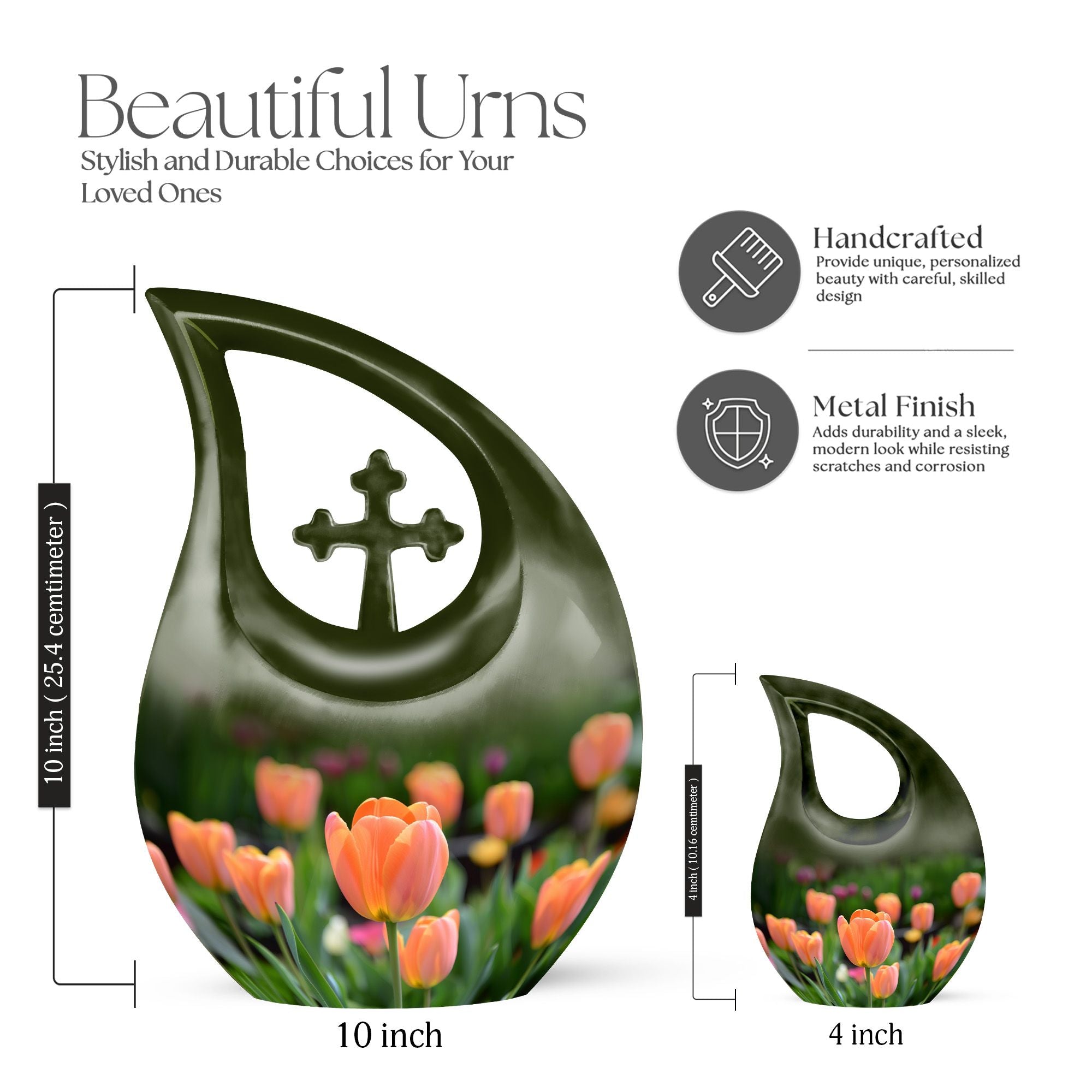 Expertly handcrafted, this urn adult cremation piece is made from durable aluminum and polished to a smooth satin sheen. Its vibrant orange tulip motif stands as a symbol of hope and devotion. The secure screw-top lid ensures ashes remain protected, making it ideal for home memorials or as a cremation urn for adult ash during burial or scattering ceremonies. Families seeking cremation urns for adult ashes small or matching keepsakes will find this urn both beautiful and enduring.