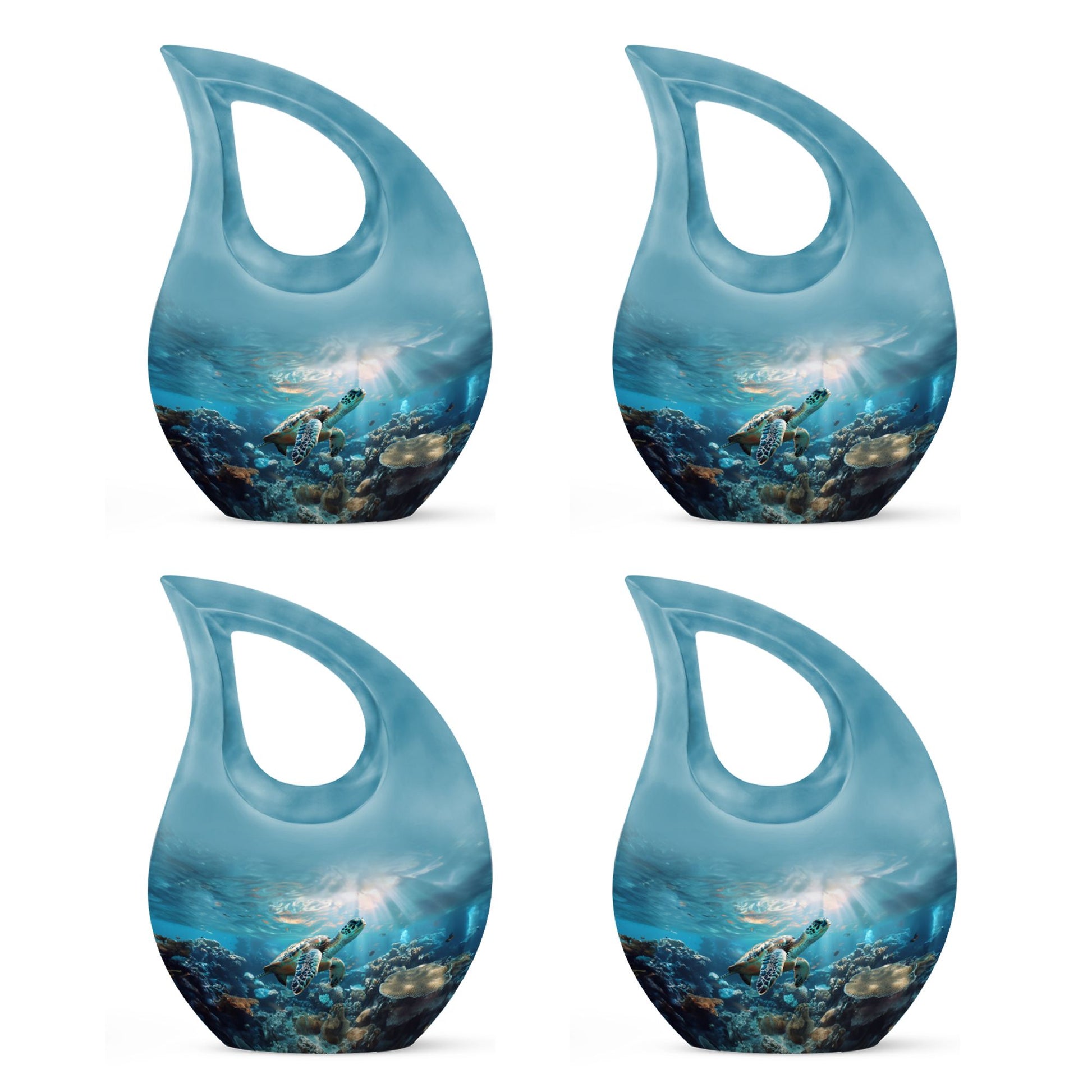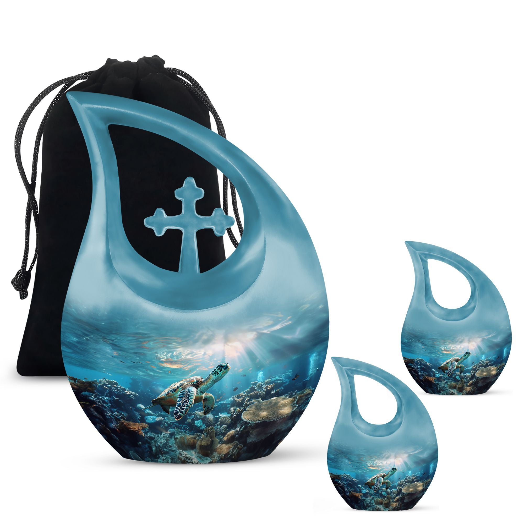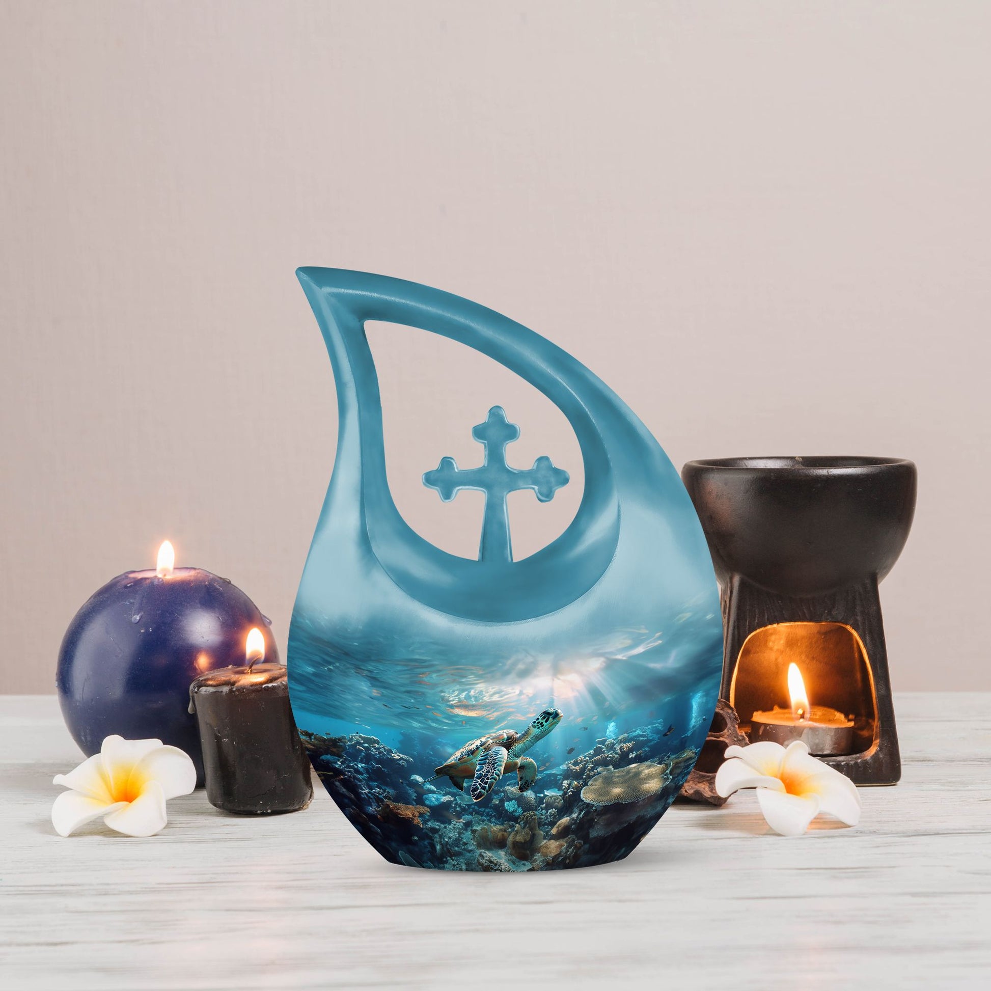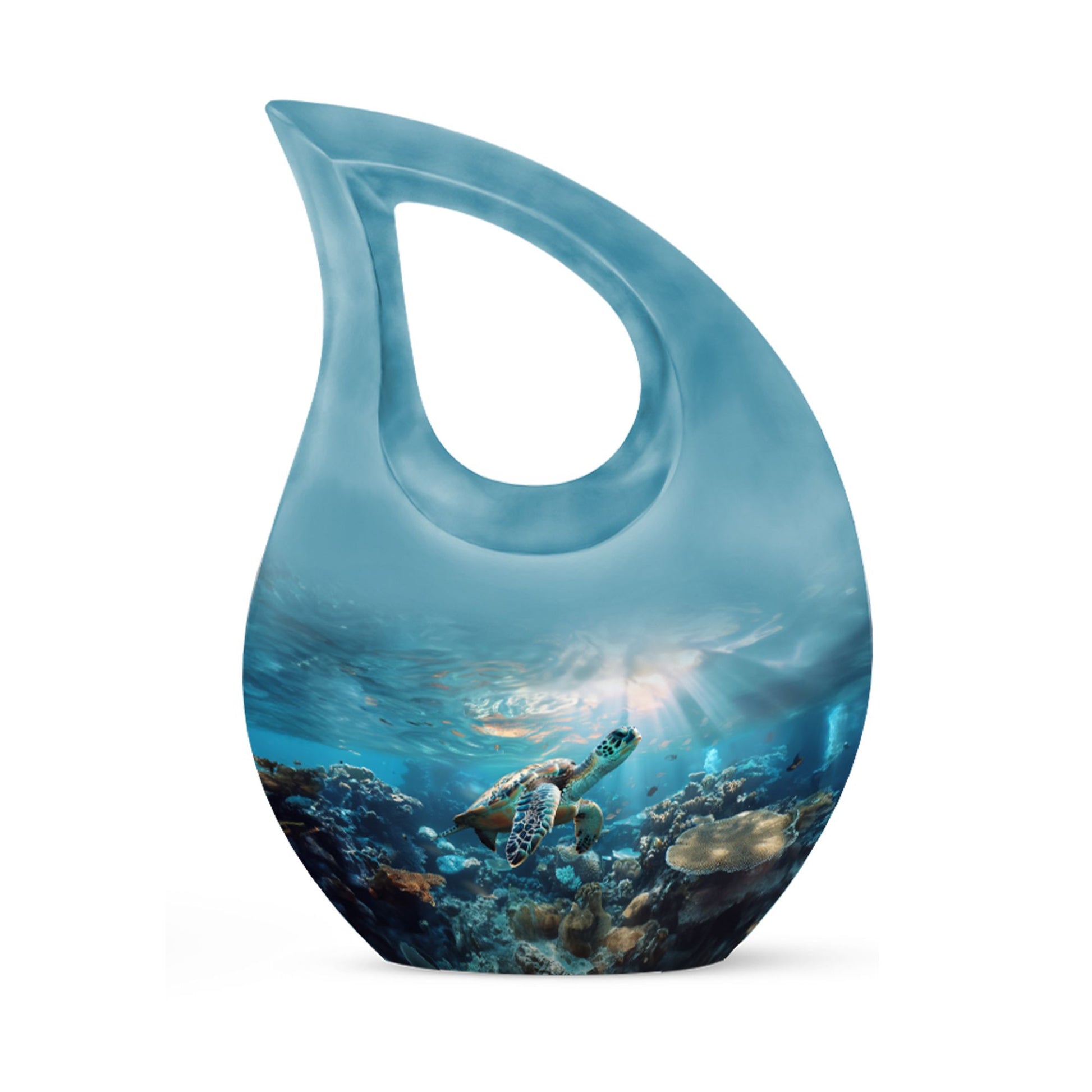 Celebrate a soul who found peace in the sea with the Ocean Spirit Sea Turtle Urn, a stunning tribute that captures the calm, beauty, and freedom of ocean life. This elegant Cremation Urn For Adult Ashes features a detailed sea turtle gliding through a coral reef under golden rays of sunlight — a powerful symbol of endurance, protection, and a life well-lived.