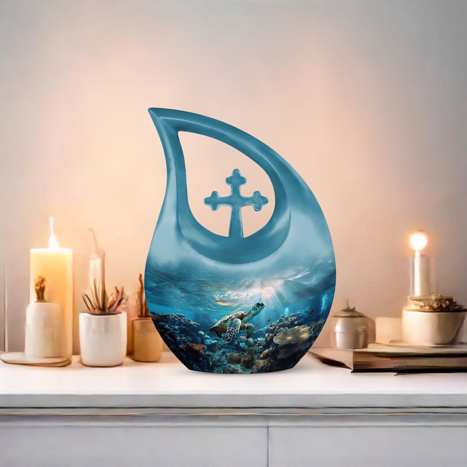 The flame-teardrop silhouette, topped with a spiritual cross cutout, blends nature and faith seamlessly. Whether you're commemorating a woman or man who loved the beach, diving, snorkeling, or simply felt a deep connection to water, this urn is a lasting reminder of their spirit's eternal swim through peaceful seas.